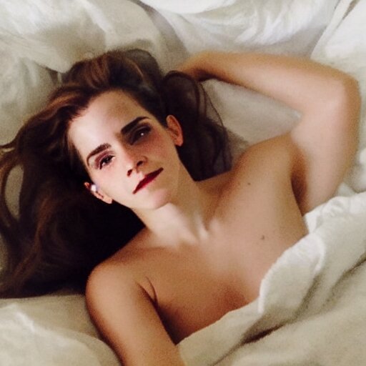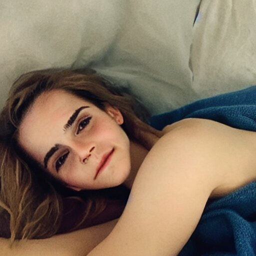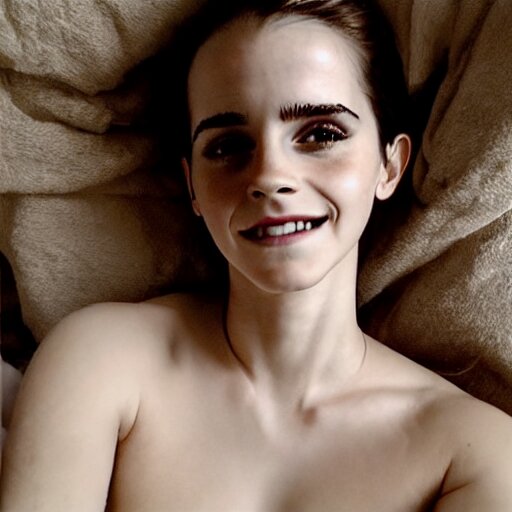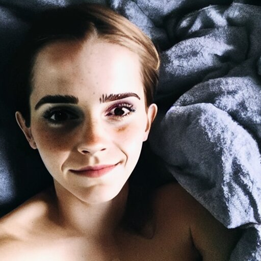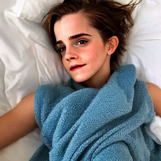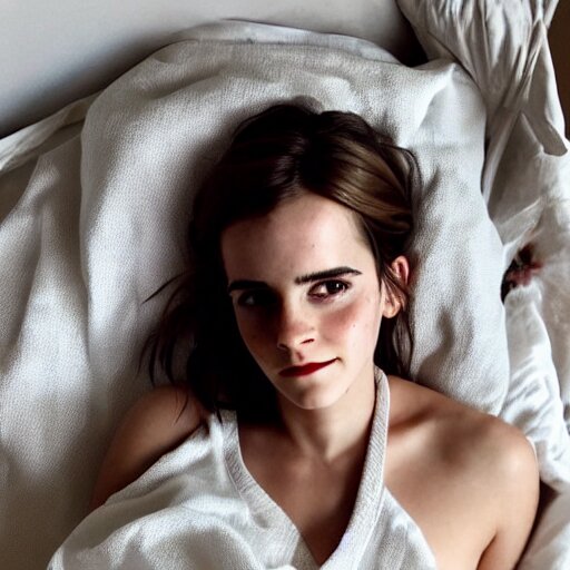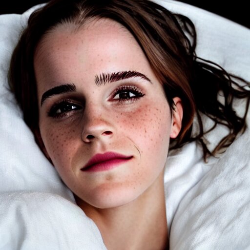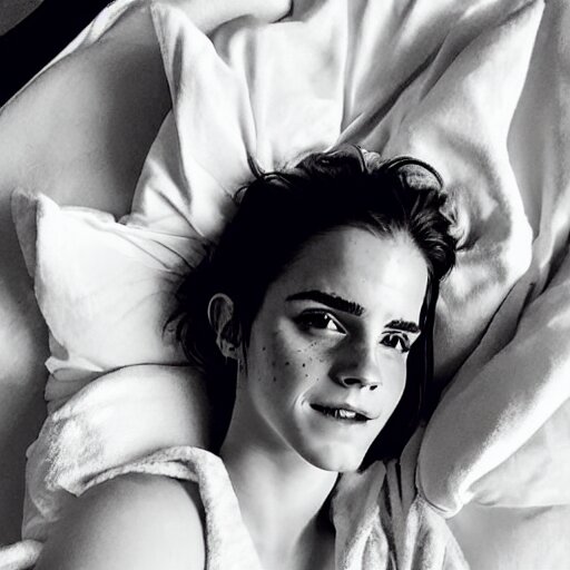 Emma watson in bed, comfy, with a little white blanket, bare shoulders, freckles, no makeup, no filter, natural skin, messy hair, sleepy, smiling sheepishly