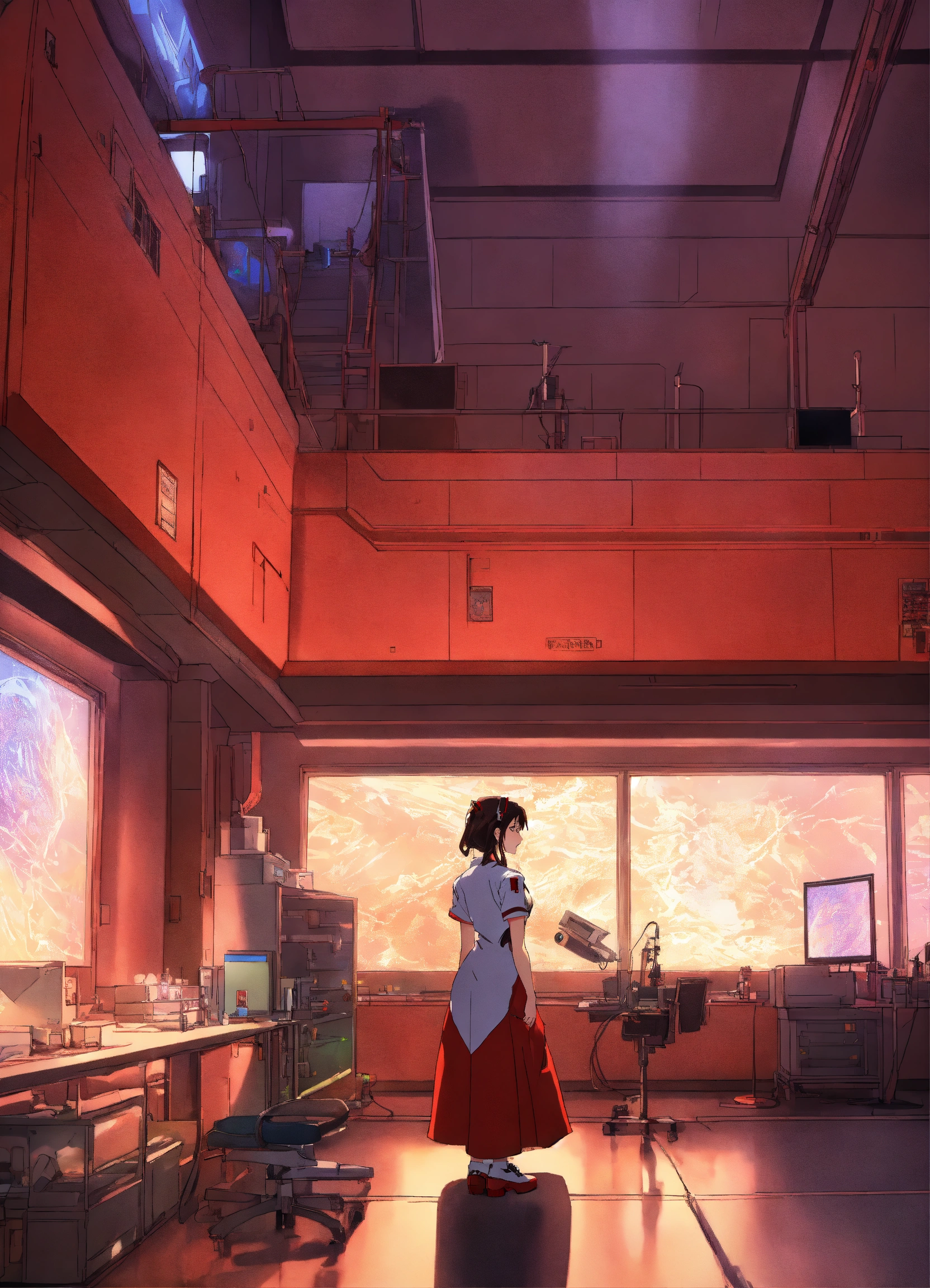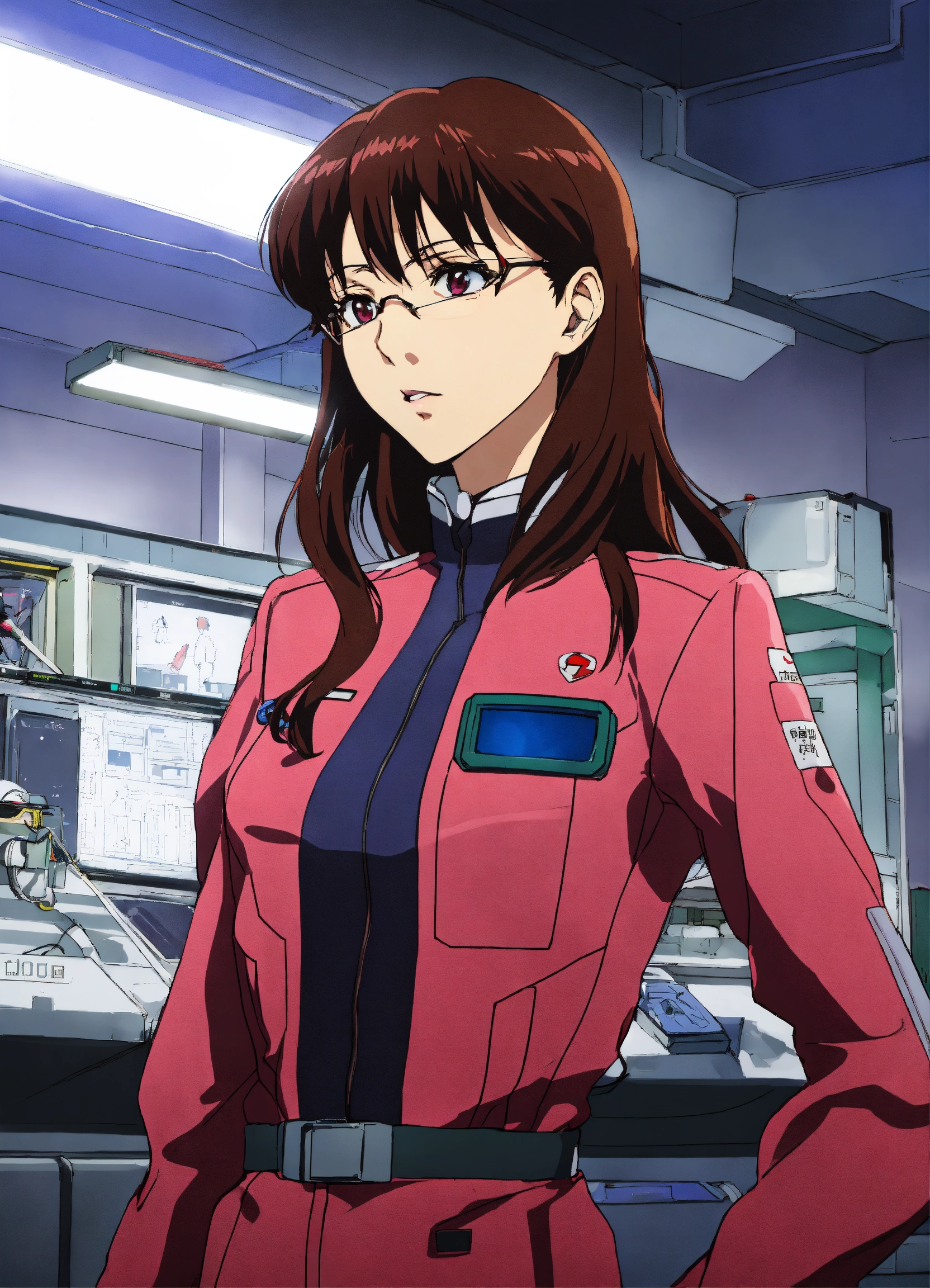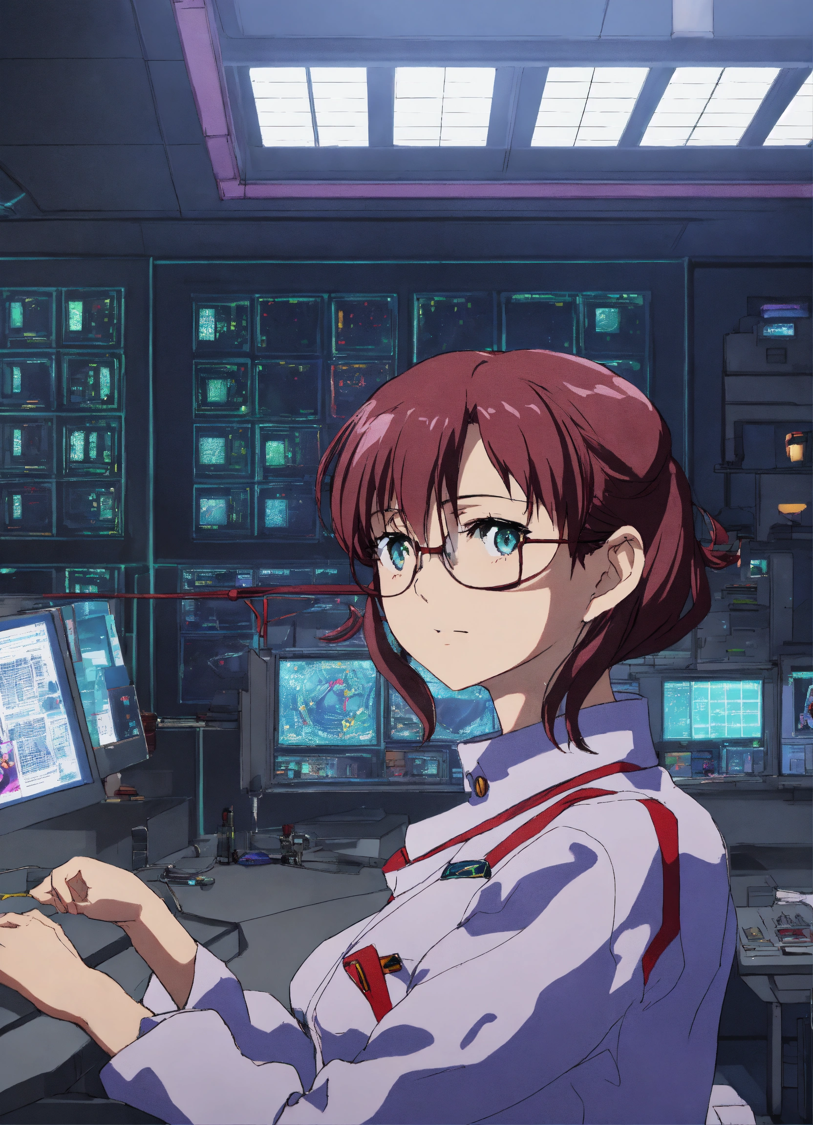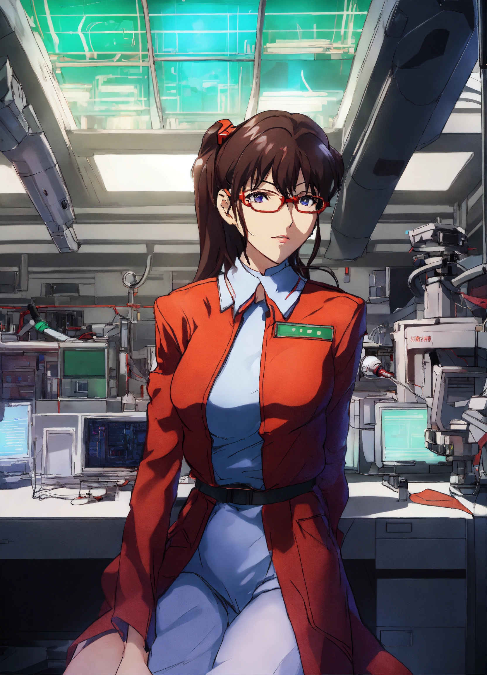 Portrait of mari makinami illustrious from neon genesis evangelion, inside the nerv lab with lots of scientists, detailed scene, stunning details, anime, detailed environment, ray tracing, 8k