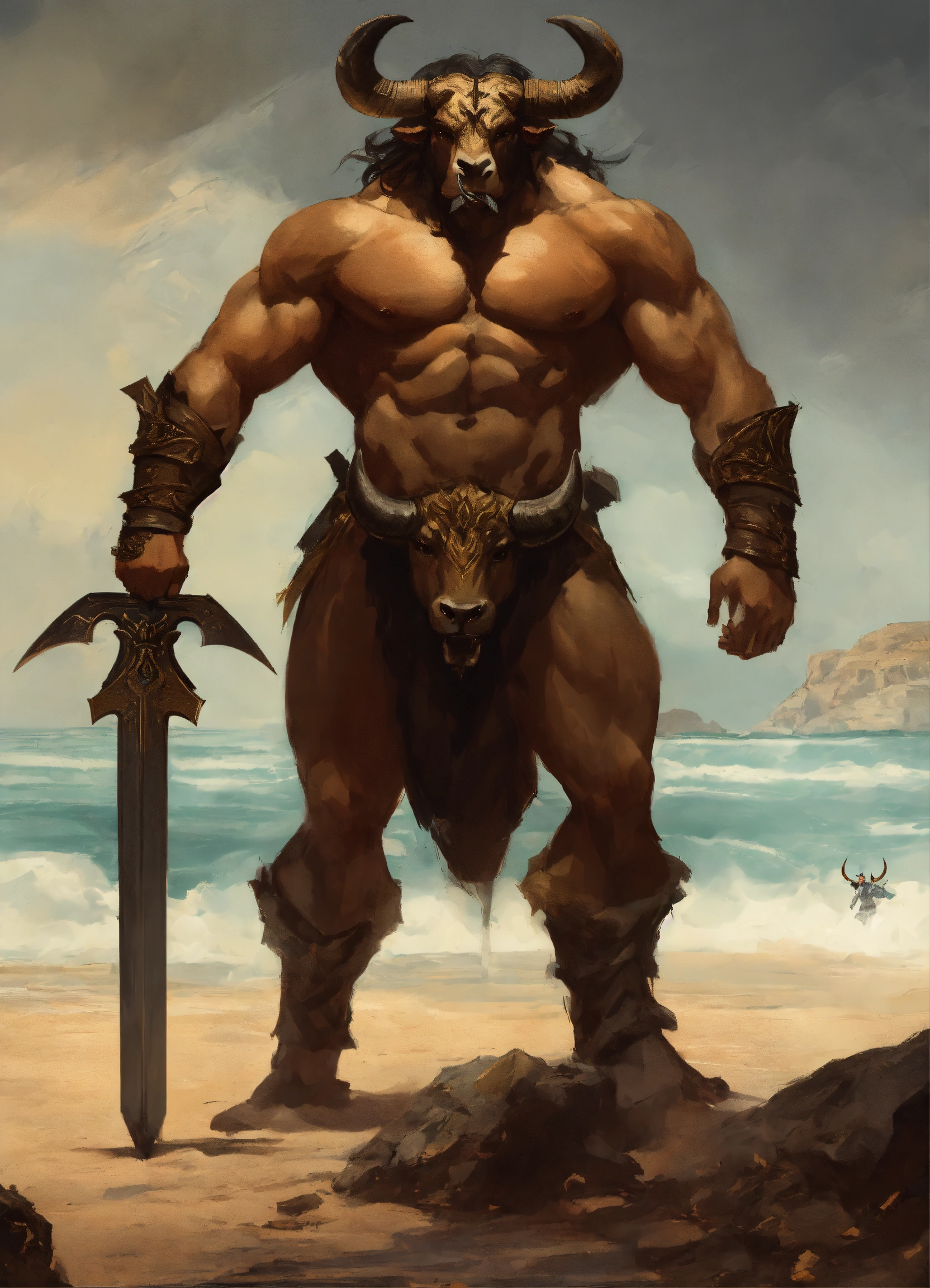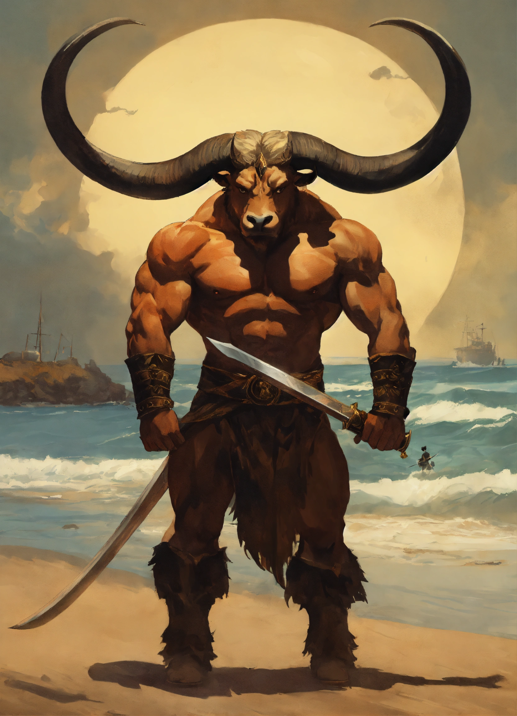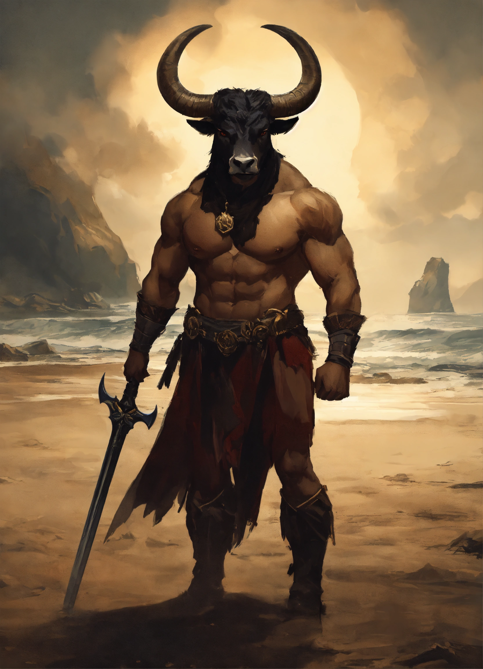 A minotaur - above massive shoulders, the head of a raging bull. wide dull eyes stare out over a long muzzle and a pair of wickedly curved horns shoot outward from his temples to stand erect above his flat topped skull. standing on the beach with great black swords in his hands.