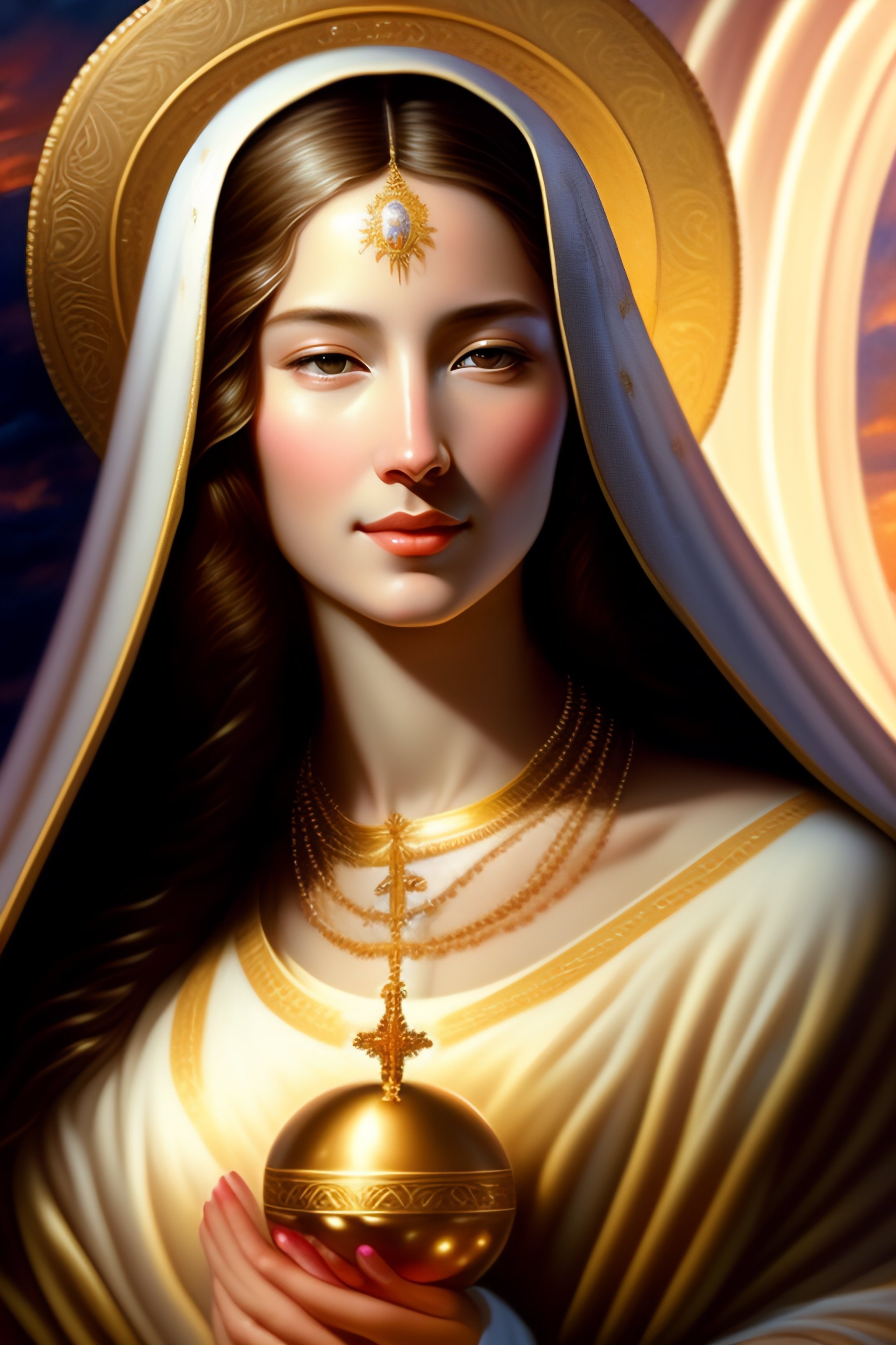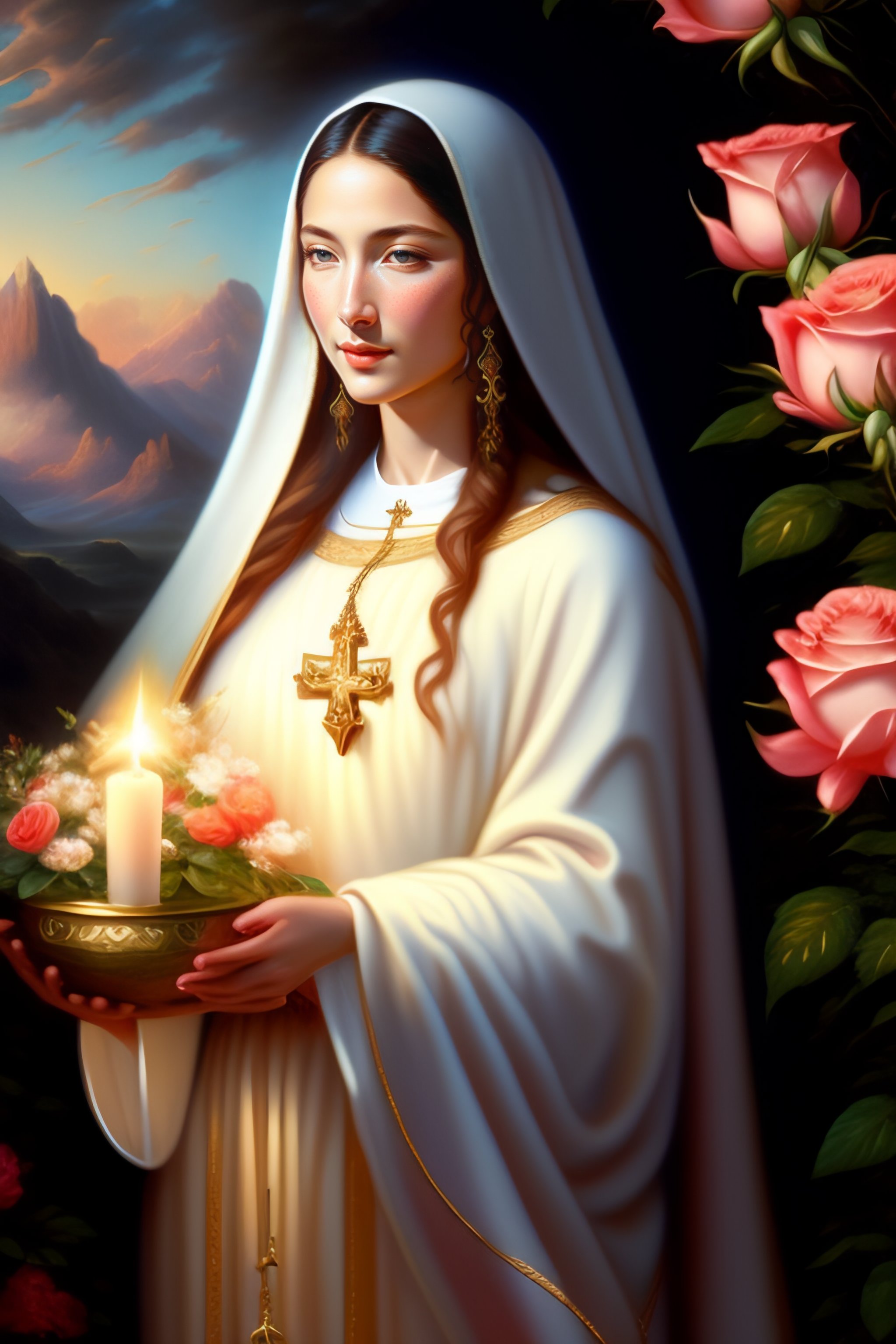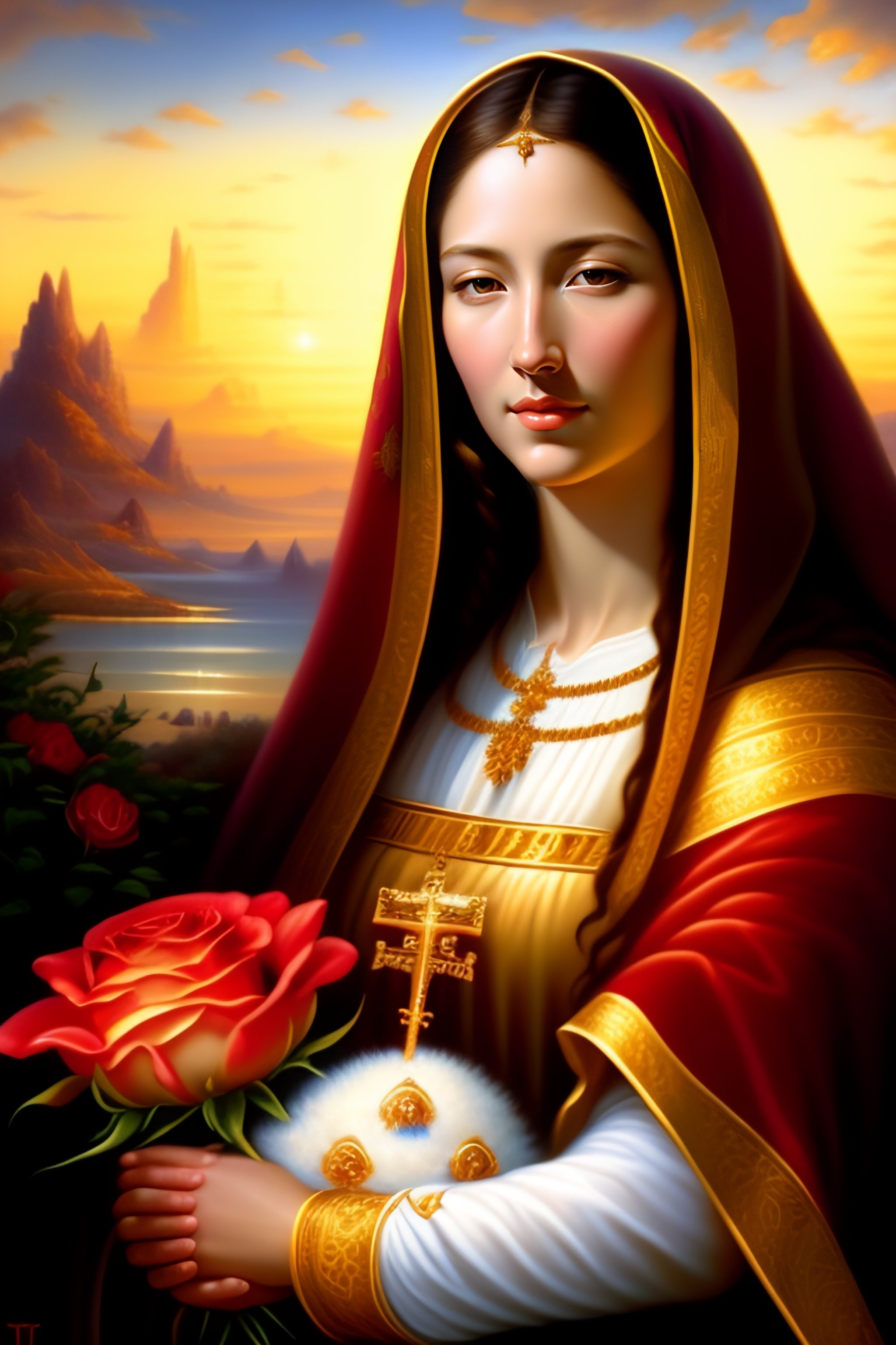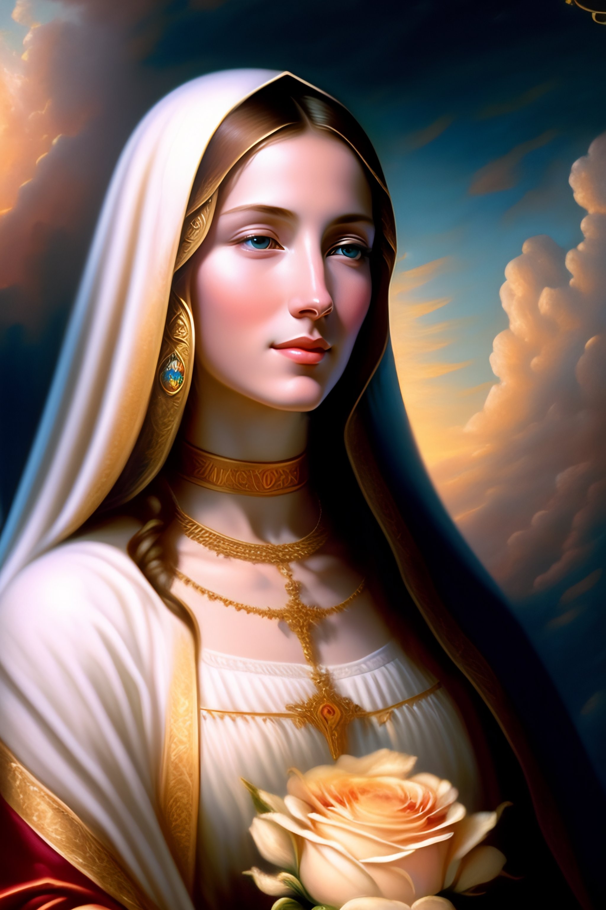 An oil painting by ross tran and thomas kincade, virgin mary mother of jesus, with roses in hands, angelical background, beautiful eyes, with rosary, immaculate conception, according to the bible, holy ghost, full body, 16k, perfect hands, skye, with clouds, realistic, catholic style, background with landscape