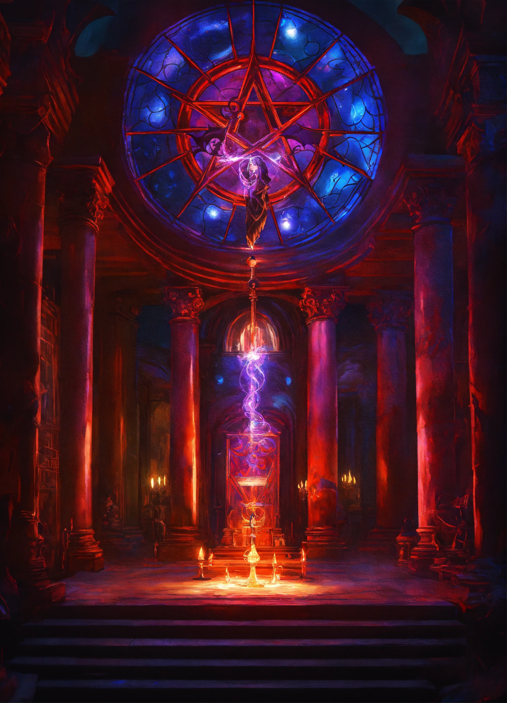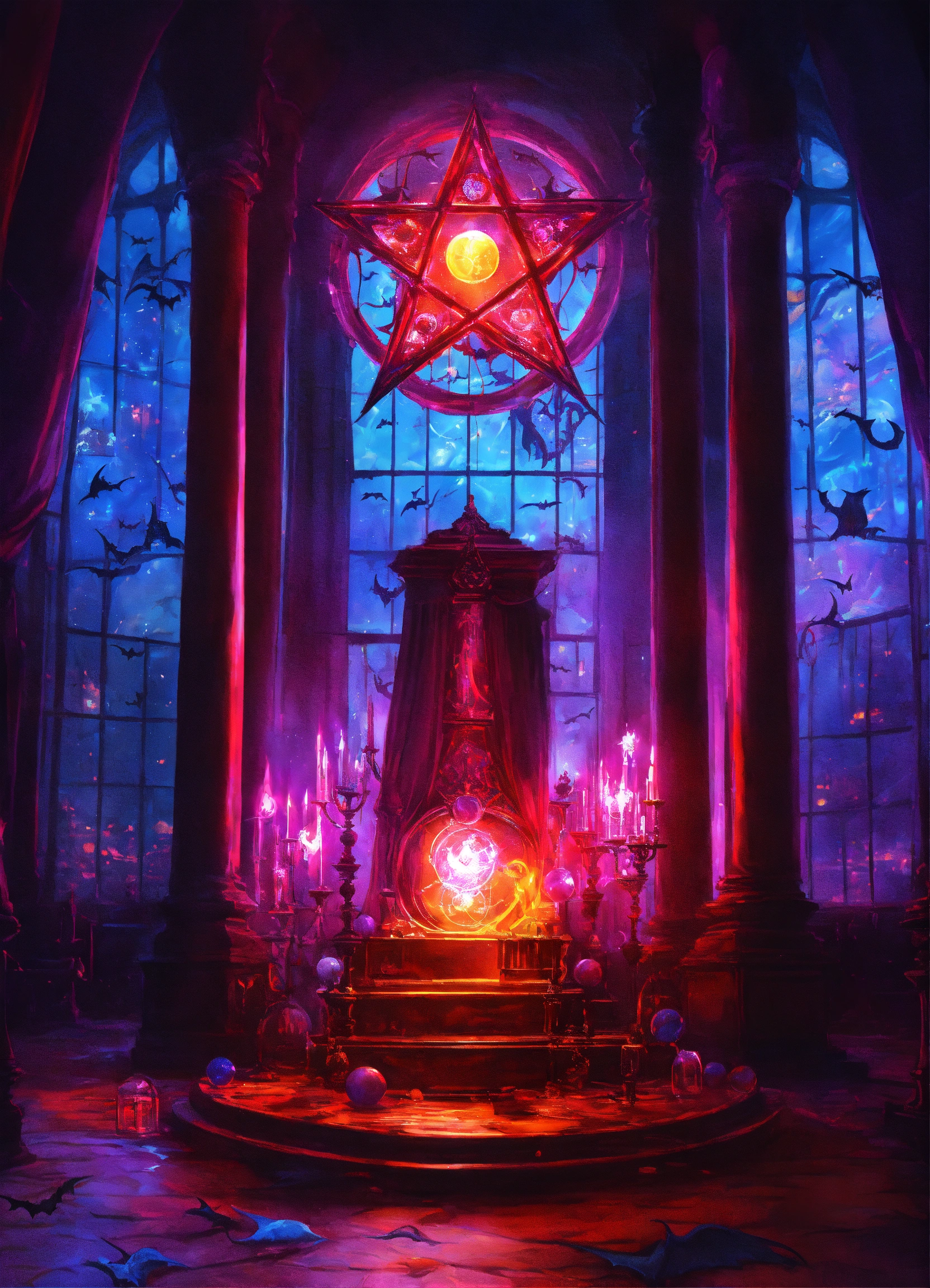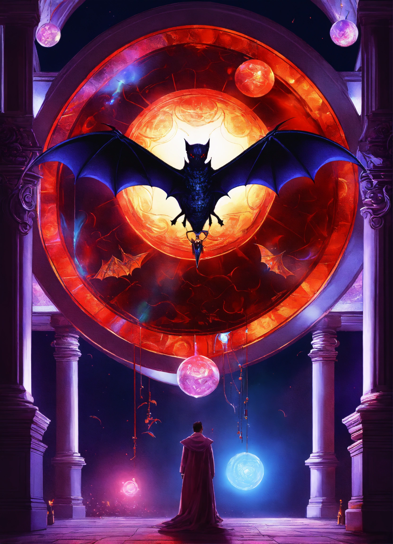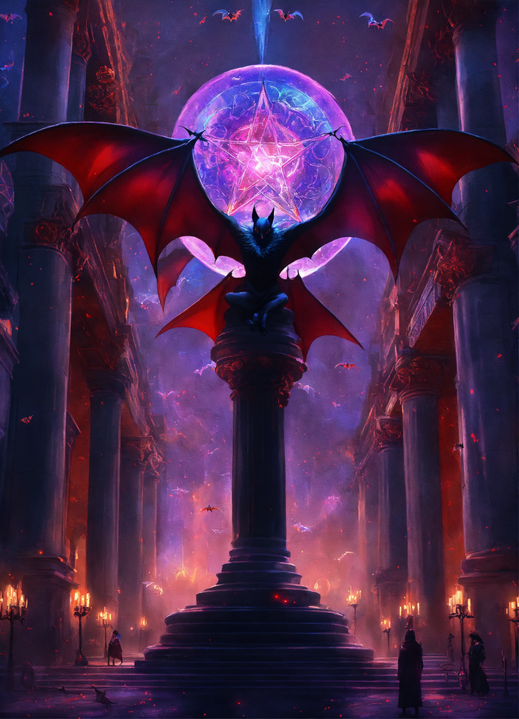 All glassblowing superrealism style urban vampire style only one vampire, very big pentacle in the center, strong light beam in spiral around multicolored lights rubis stone many bats flying astral realm interdimensional palace columns some flying little bats outdoor red purple blue glow feeling
