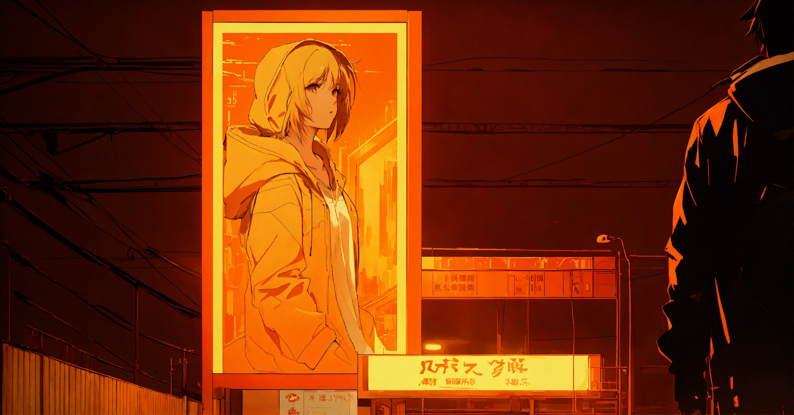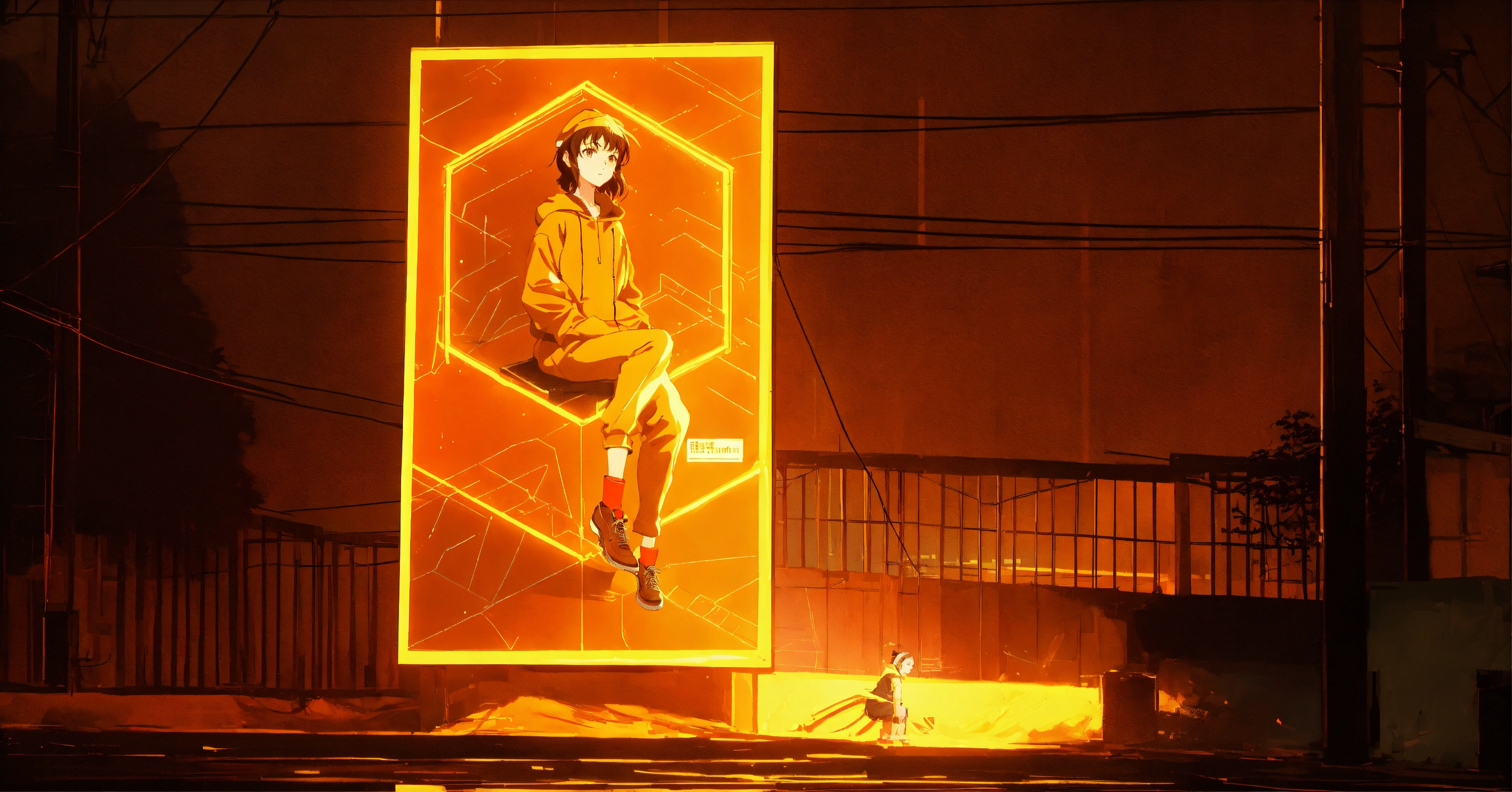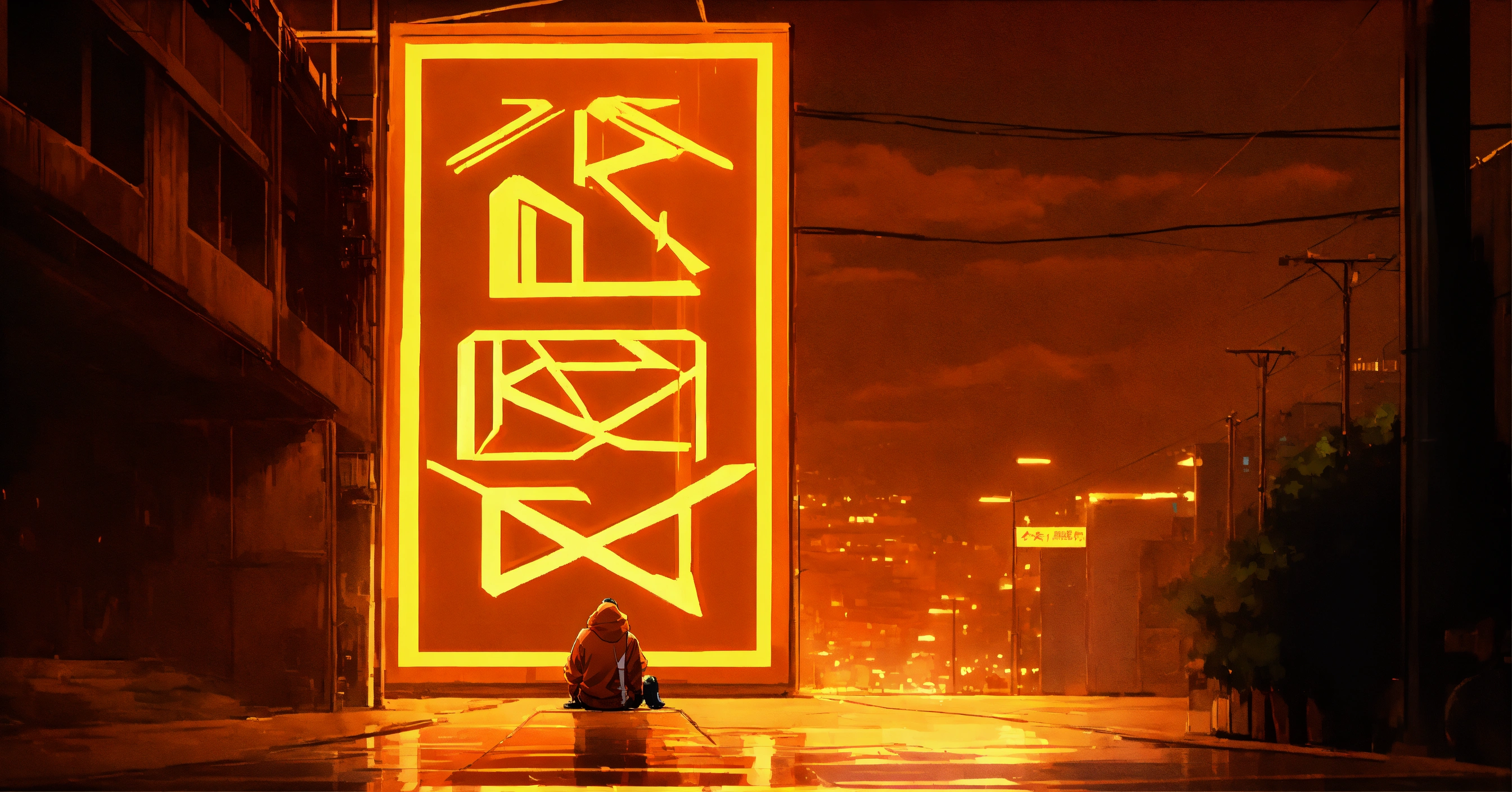 Image as graphiti, as a tall billboard with guweiz style and in makoto shinkai style, anime, hd, retro vibe wide zoom, 80mm, with person sitting on it in an orange hoodie