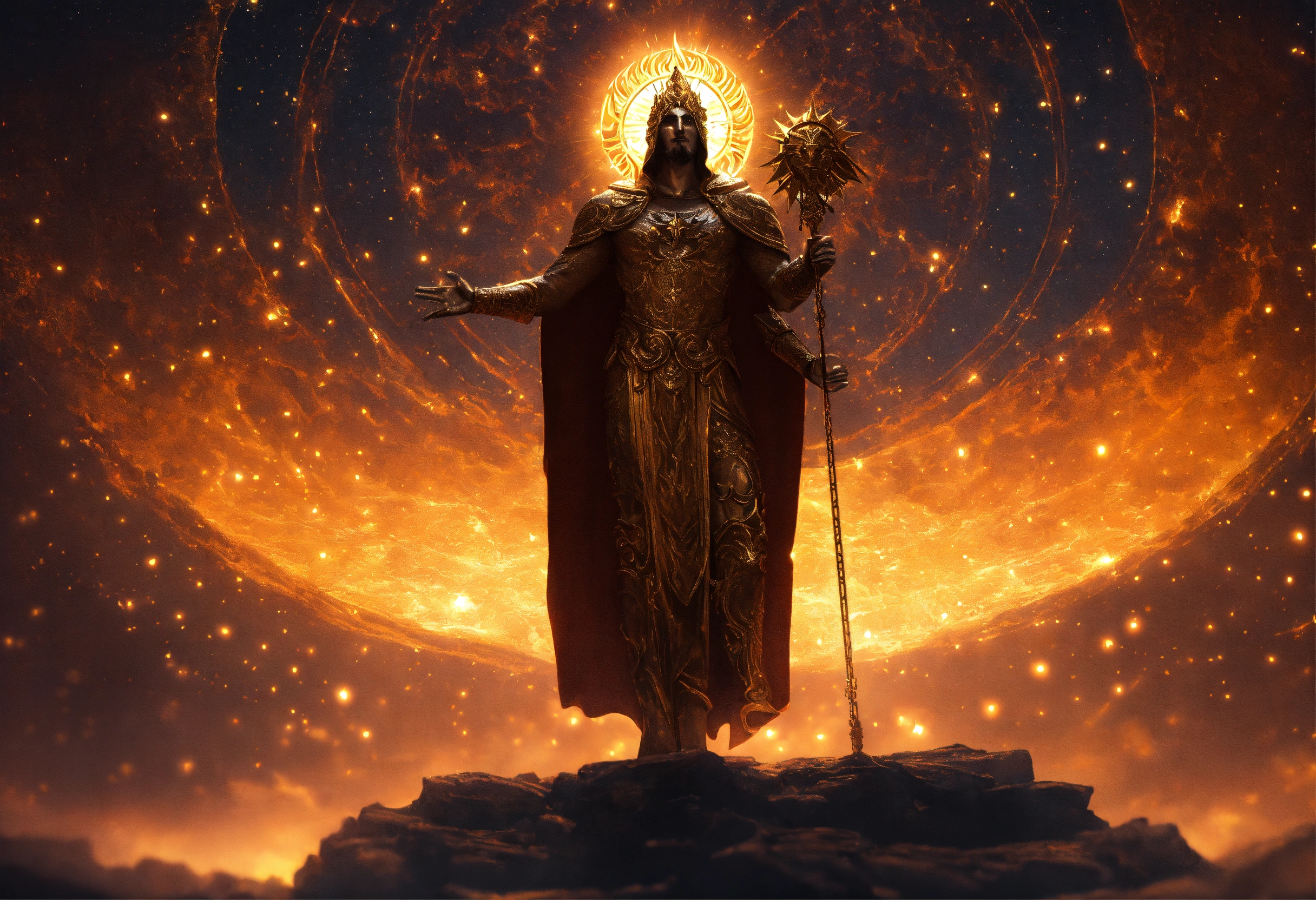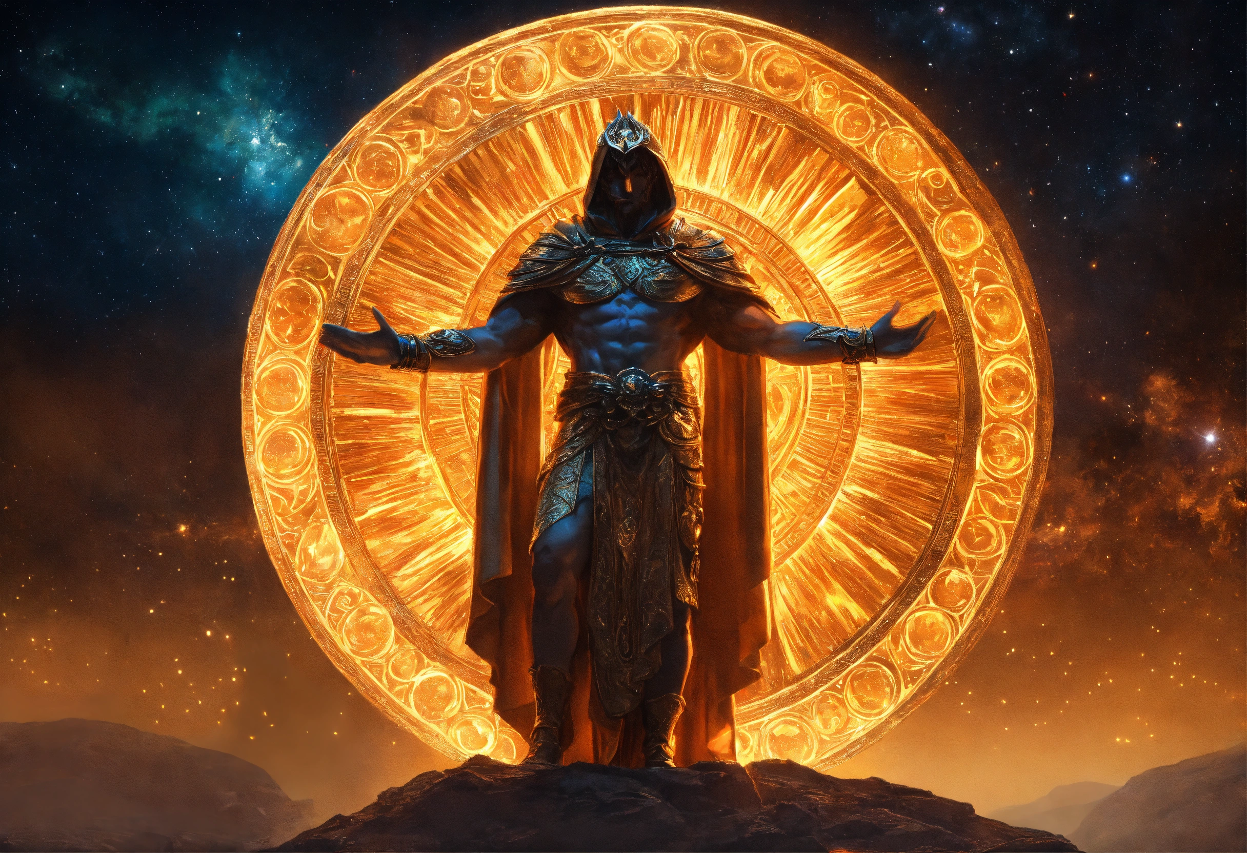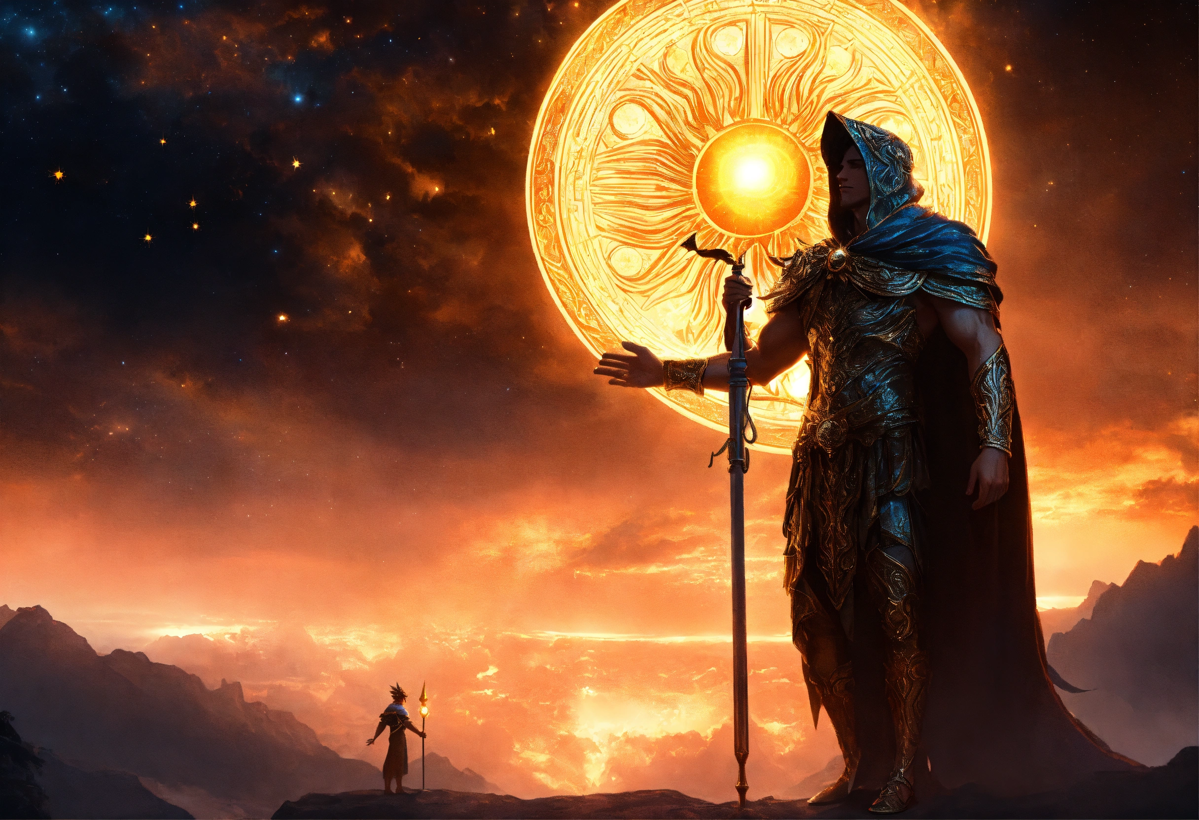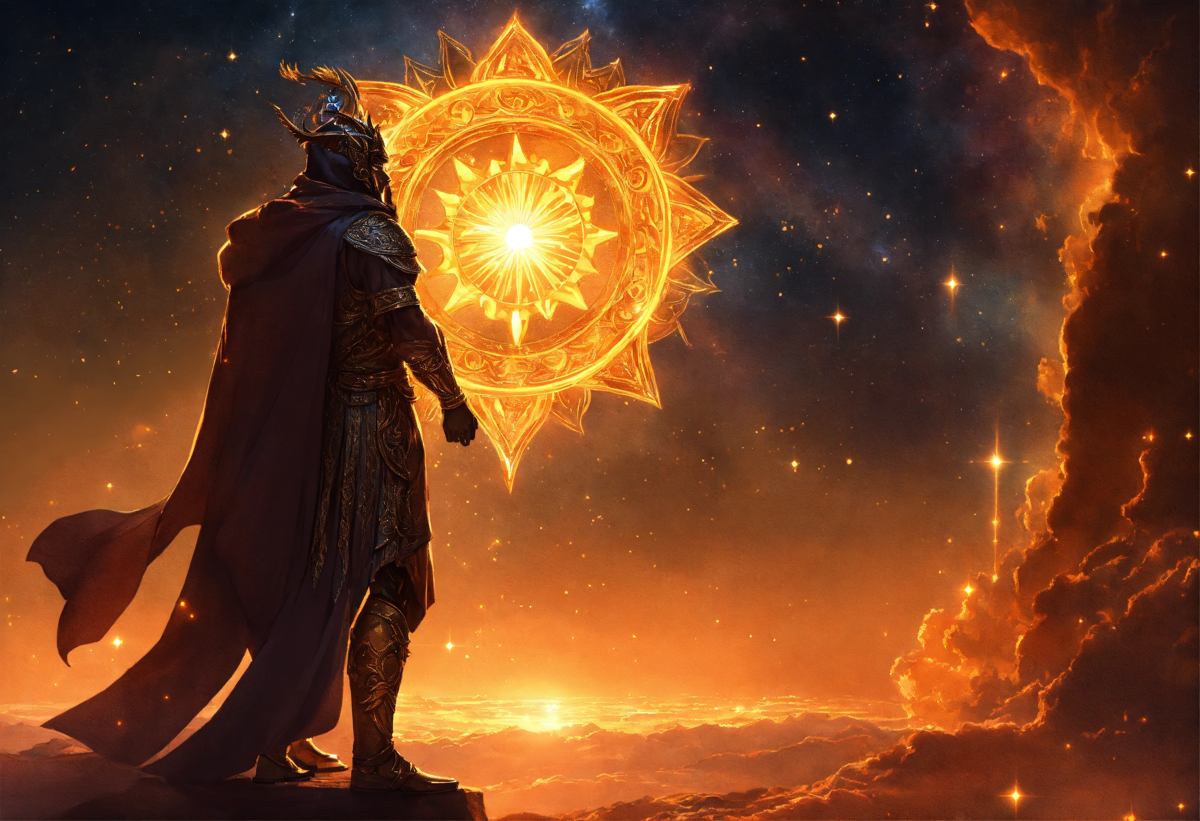 In a background of stars, a hooded hades (god of darkness), shakes hands with the brilliant figure of helios (god of the sun) who illuminates the scene