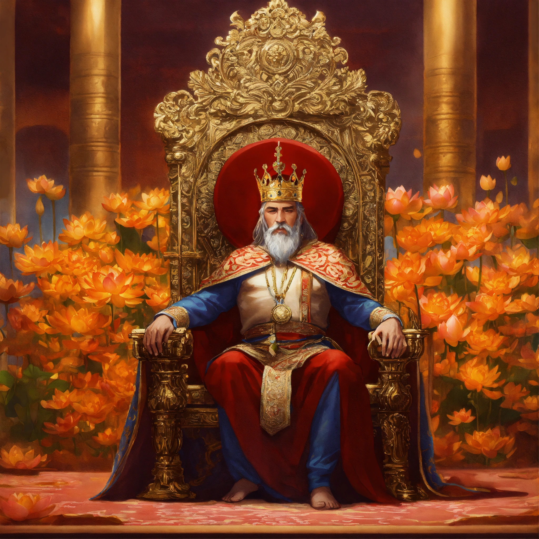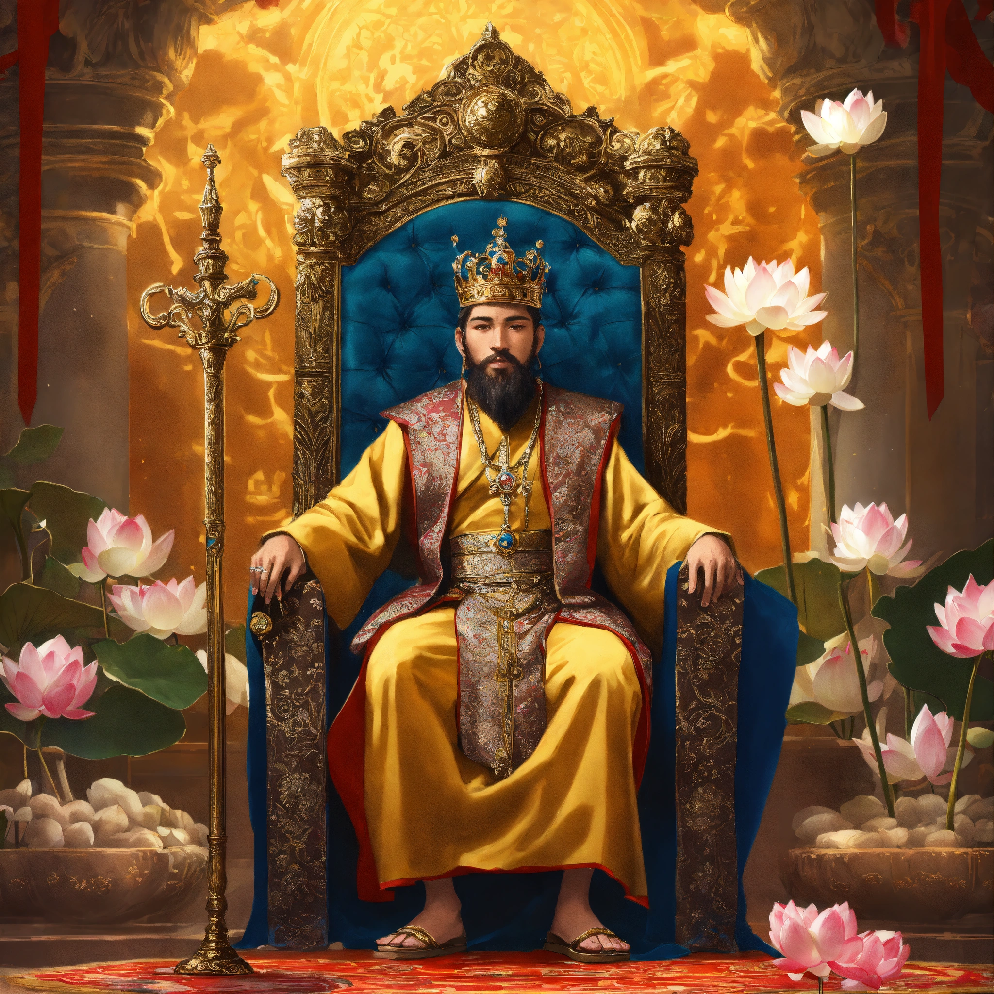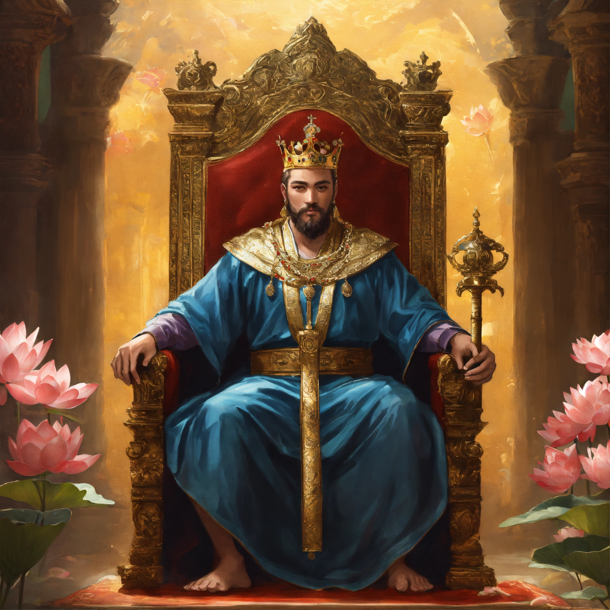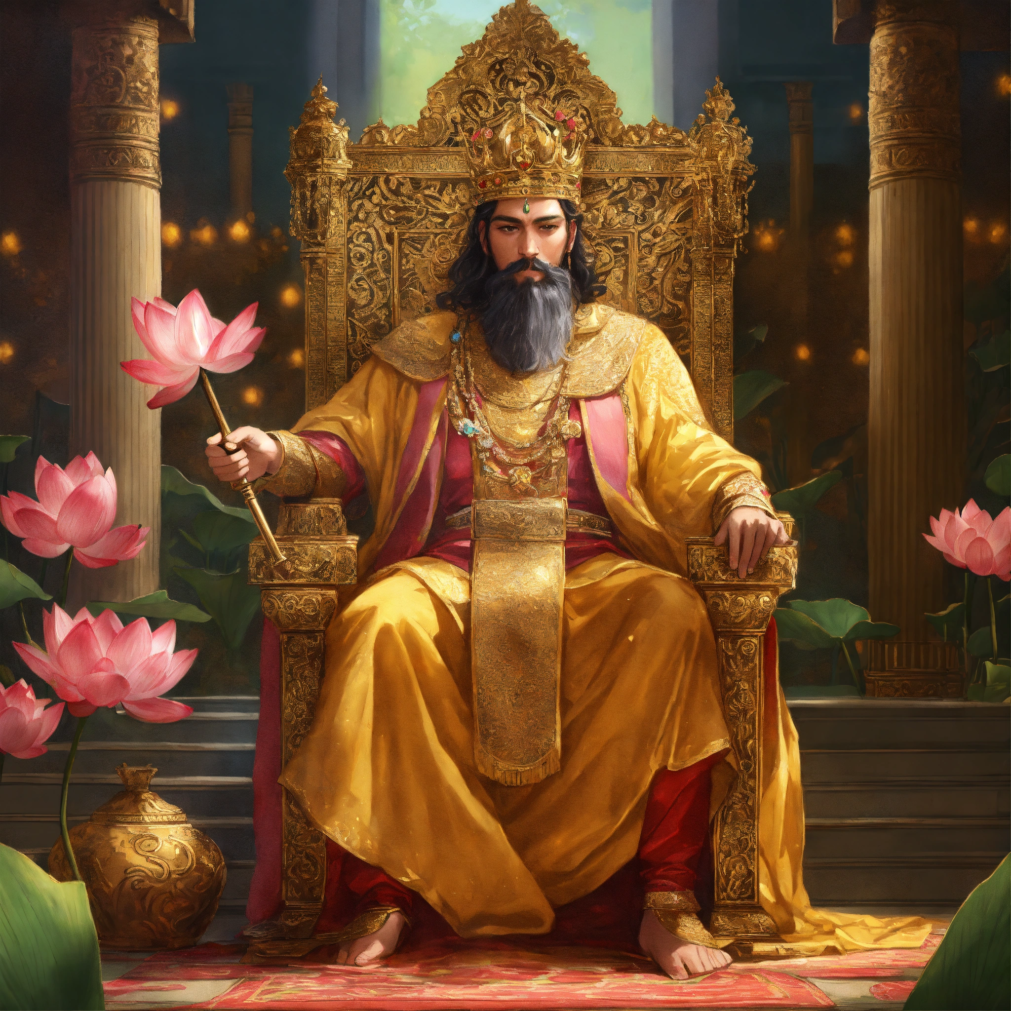 Realistic drawing, king sitting on his throne with a magnificence scepter in his hand, lotus flowers in the background
