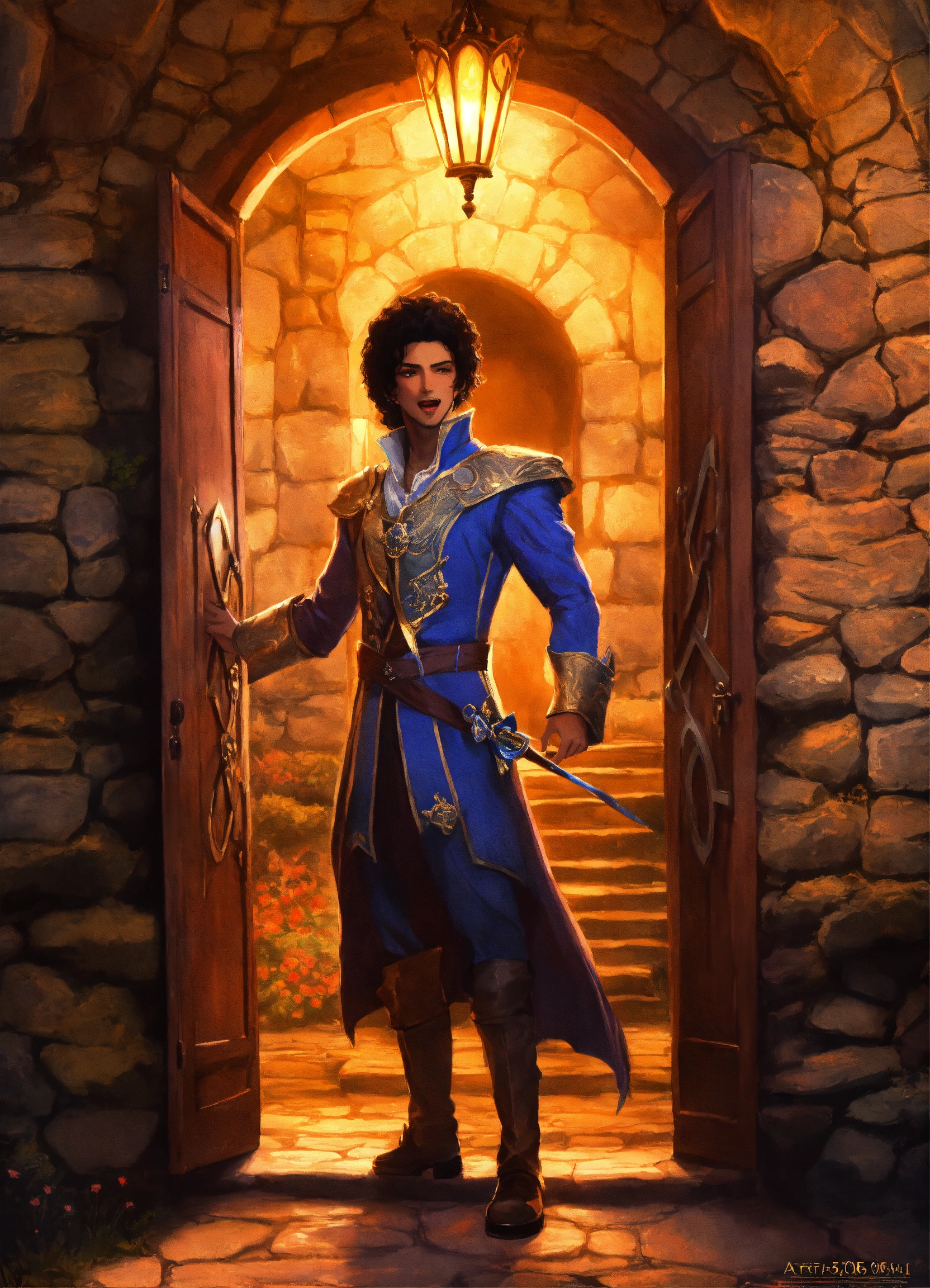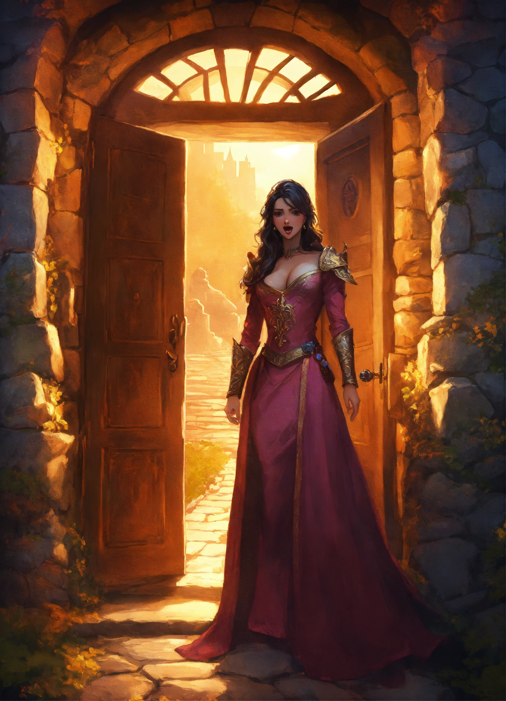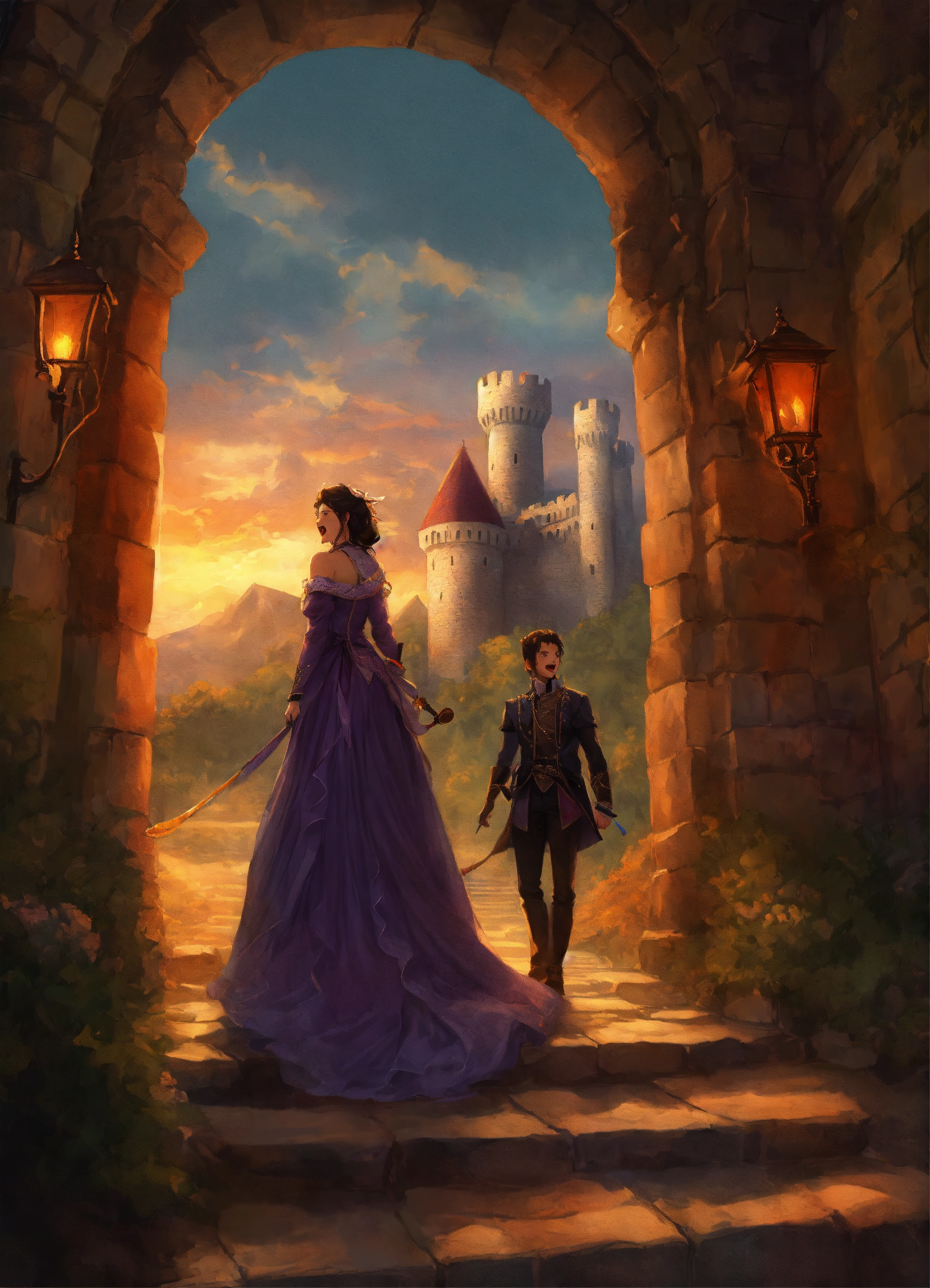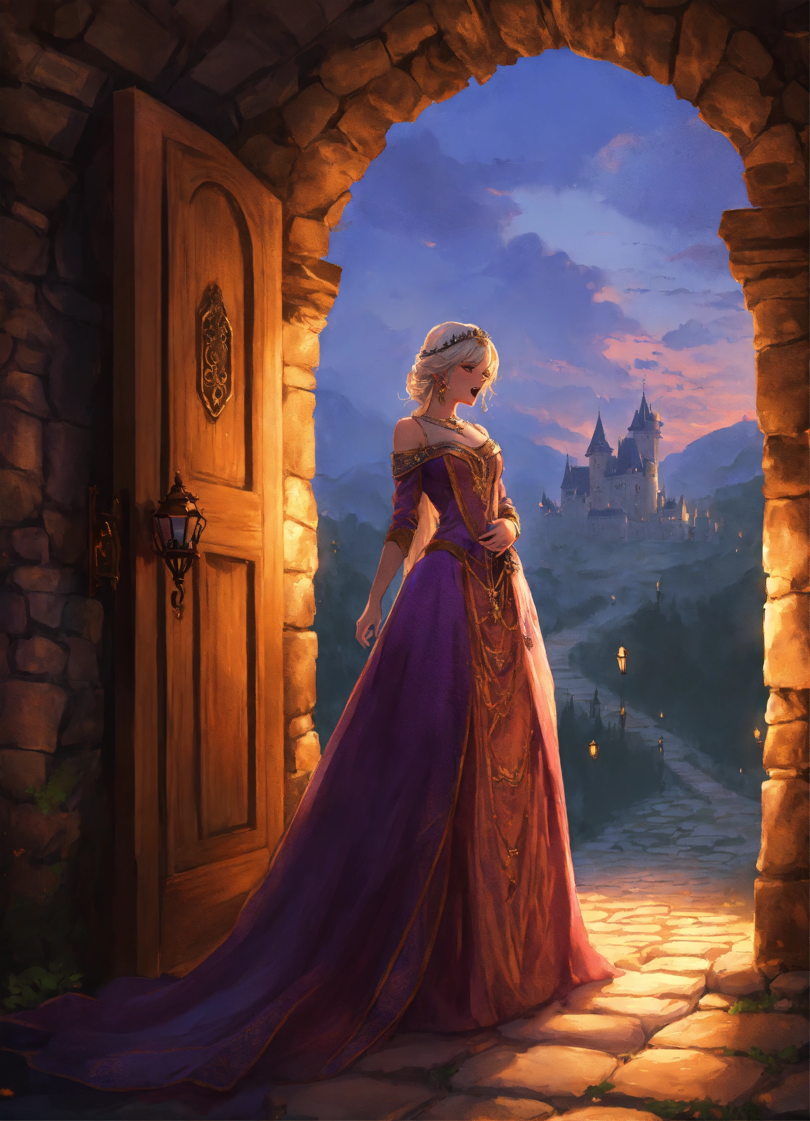 Epic view, wide angle, fantasy, dusk, (prince4.0) carrying a (maiden3.0) on his shoulder, lord is 6.5ft tall, lady is screaming and being dramatic, he is being smug, lamp flickered on, (stone wall in castle0.5), wooden door leading to chamber by artgerm, kathe butcher art style