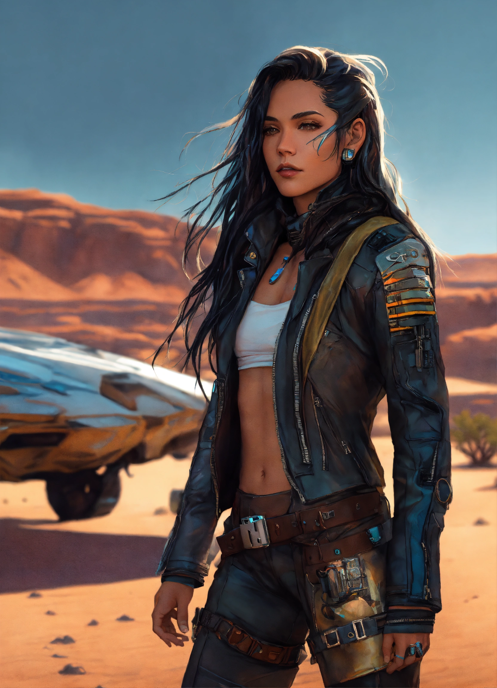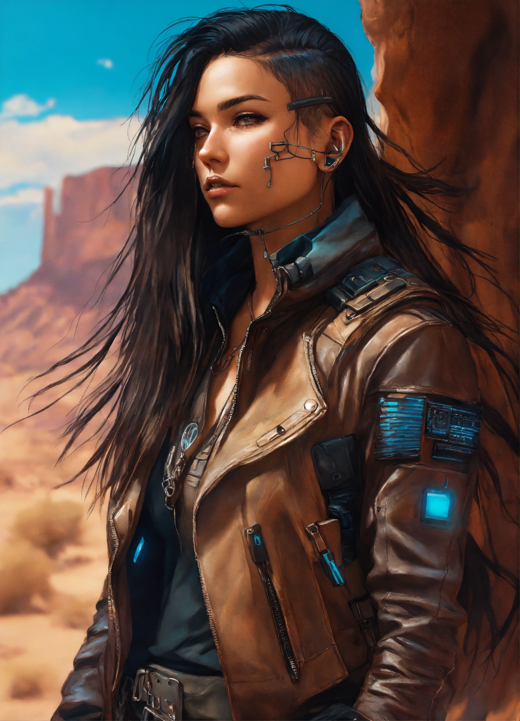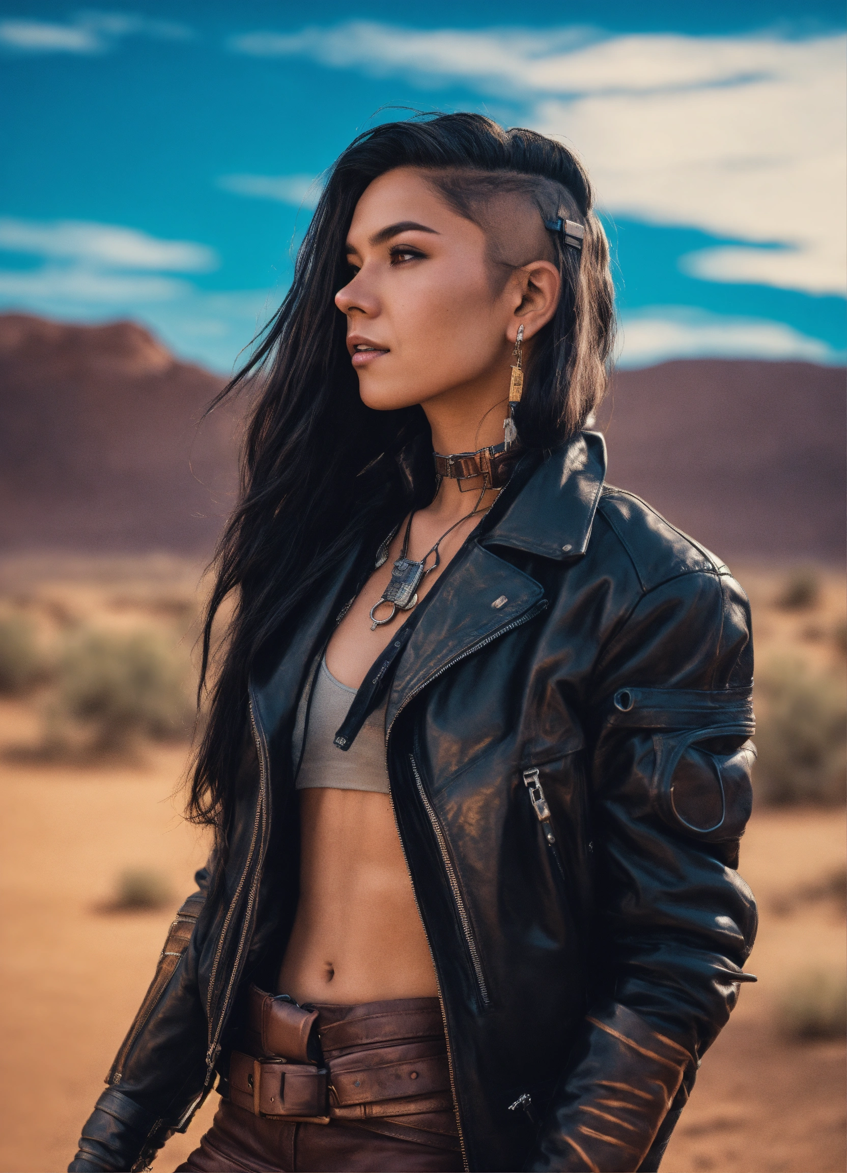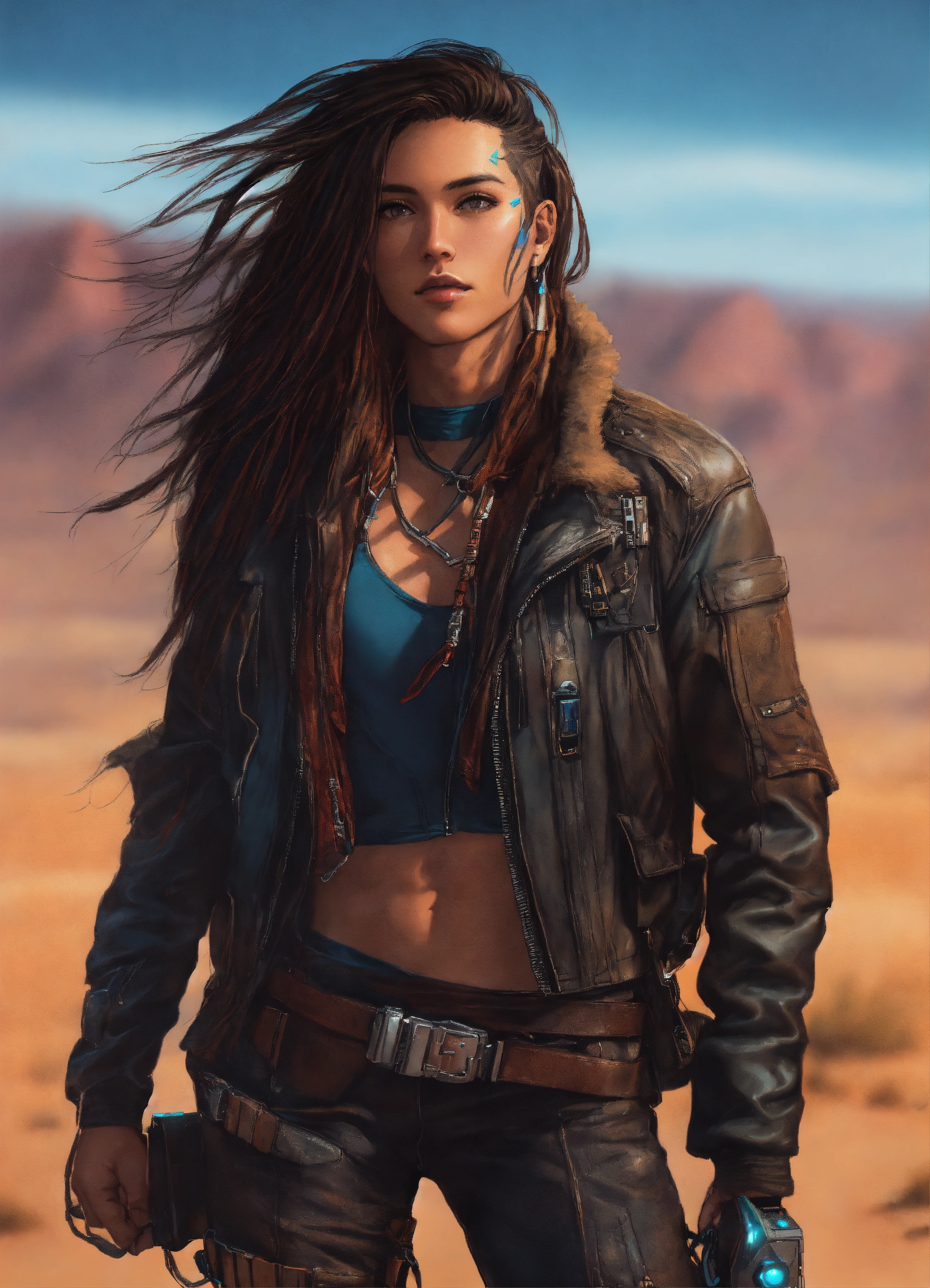 Cyberpunk navajo androgenous nonbinary high tech nomad long hair, leather jacket in a desert cyberpunk comic book hyper realistic comic book art style
