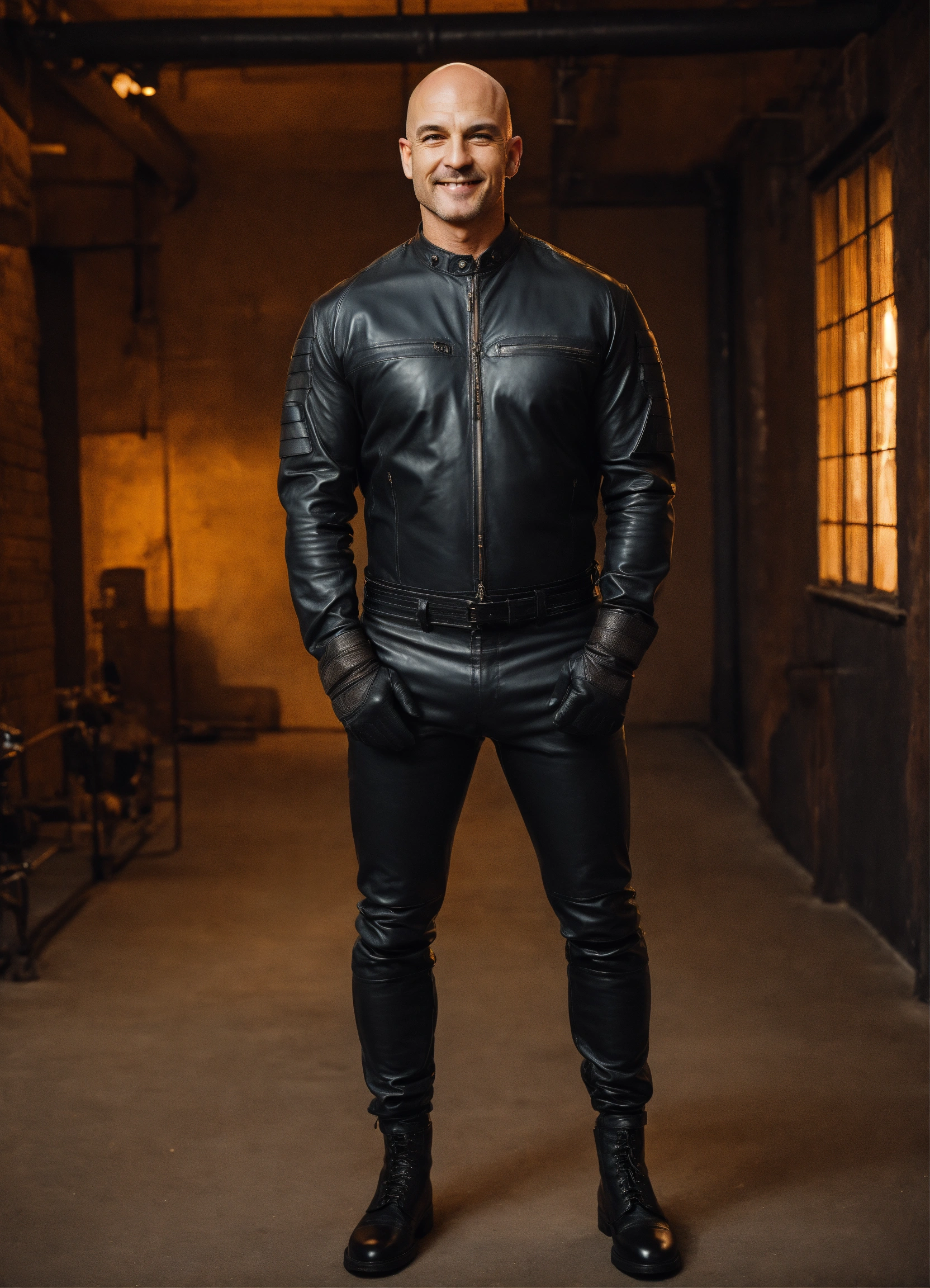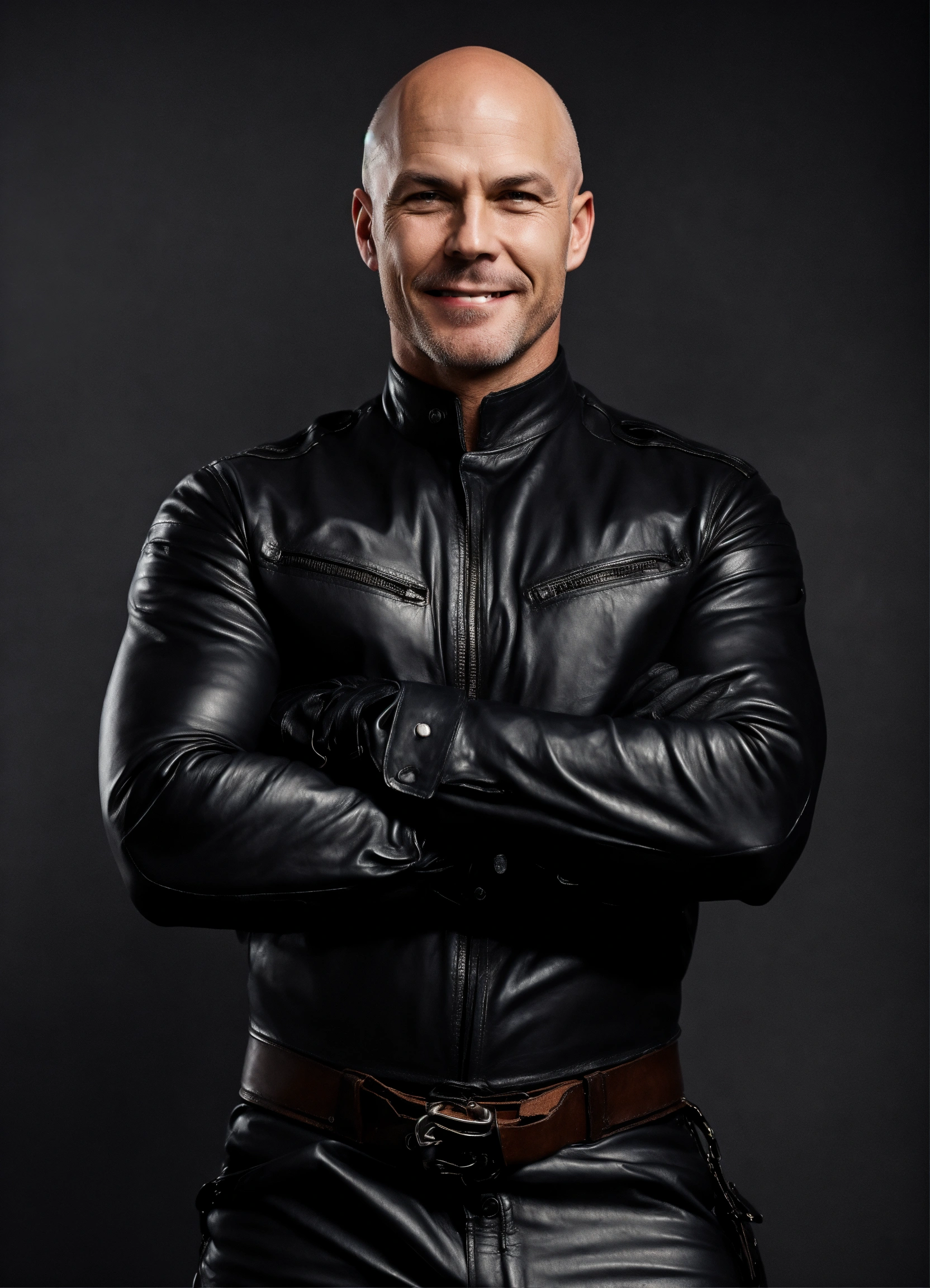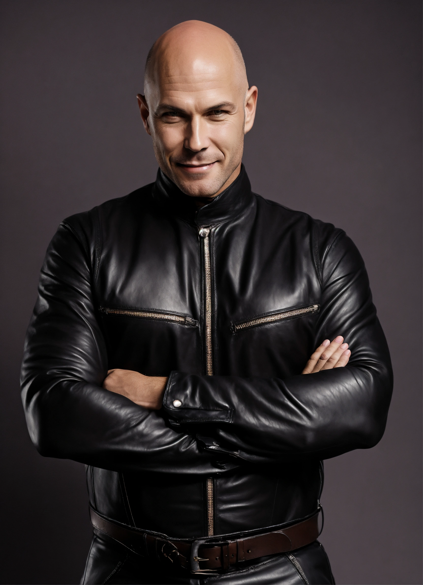 A bald man in ultratight leather shirt and trousers, evil grin, crossed arms, gloves, simple background