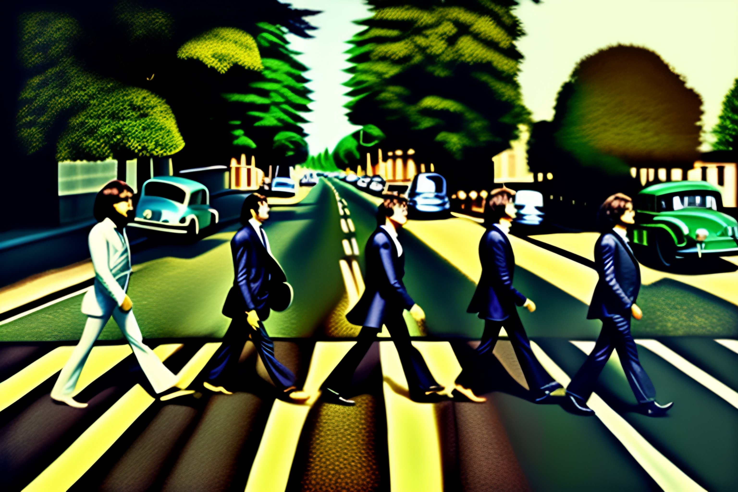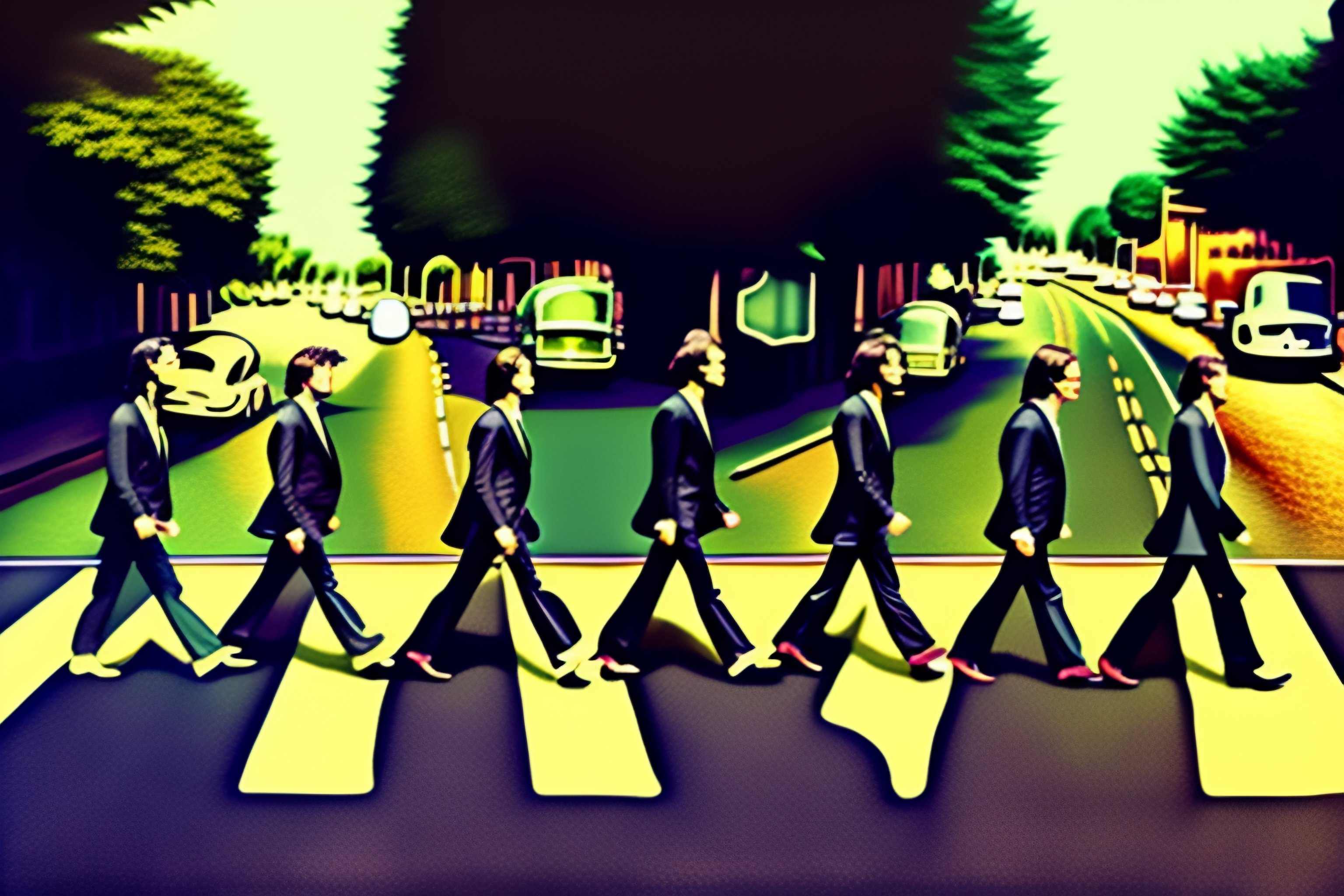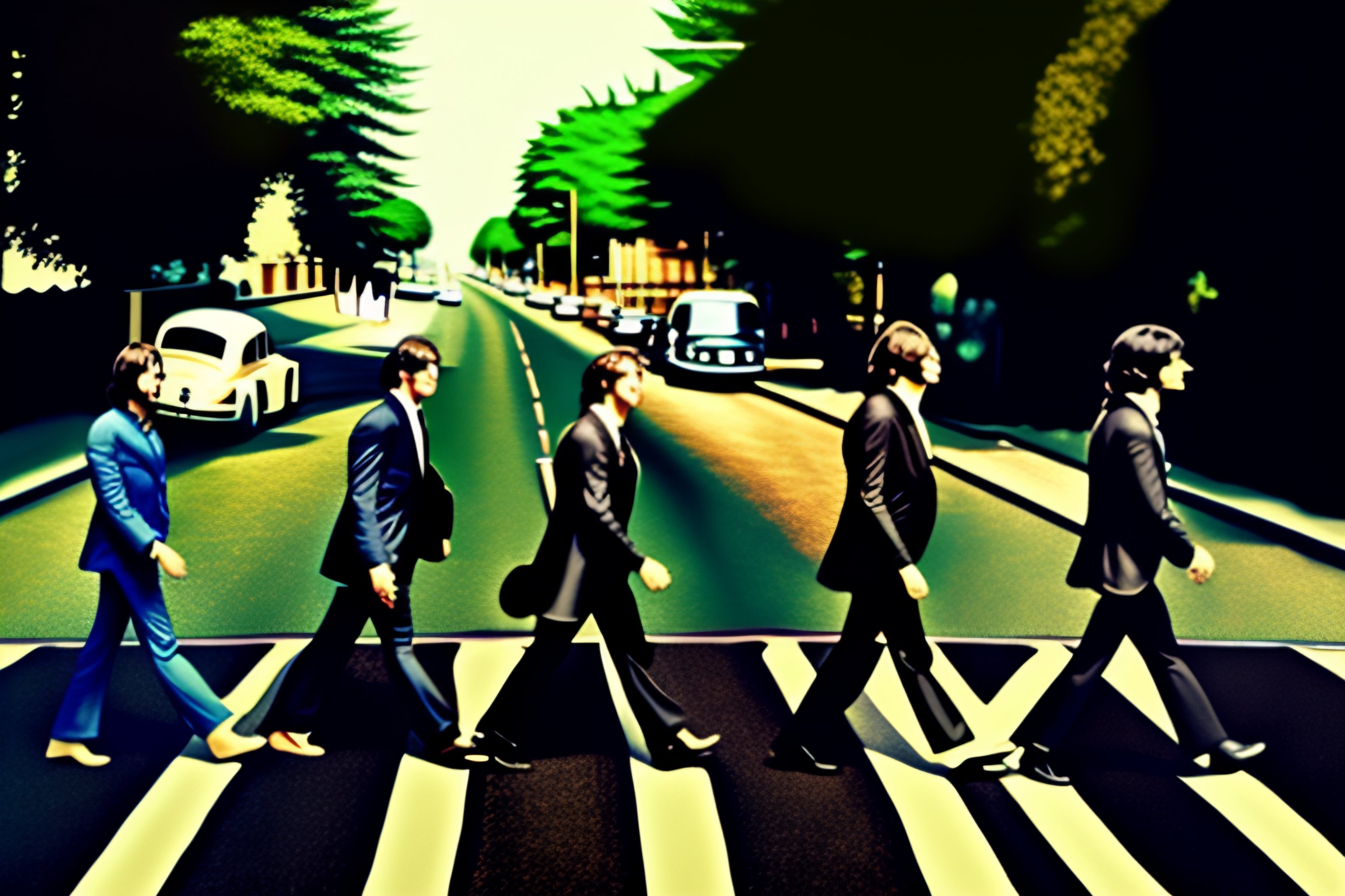Abbey road, the classic album by the beatles, is known for its iconic cover featuring the band walking across a zebra crossing. but imagine if instead of the fab four, the image featured four green frog heads peering out from the famous white collars and black suits. the scene would be both amusing and surreal, a playful nod to the enduring popularity of the album. whether you're a beatles fan or just a lover of frog-themed art, this would be a unique and eye-catching image to display in your home or office.