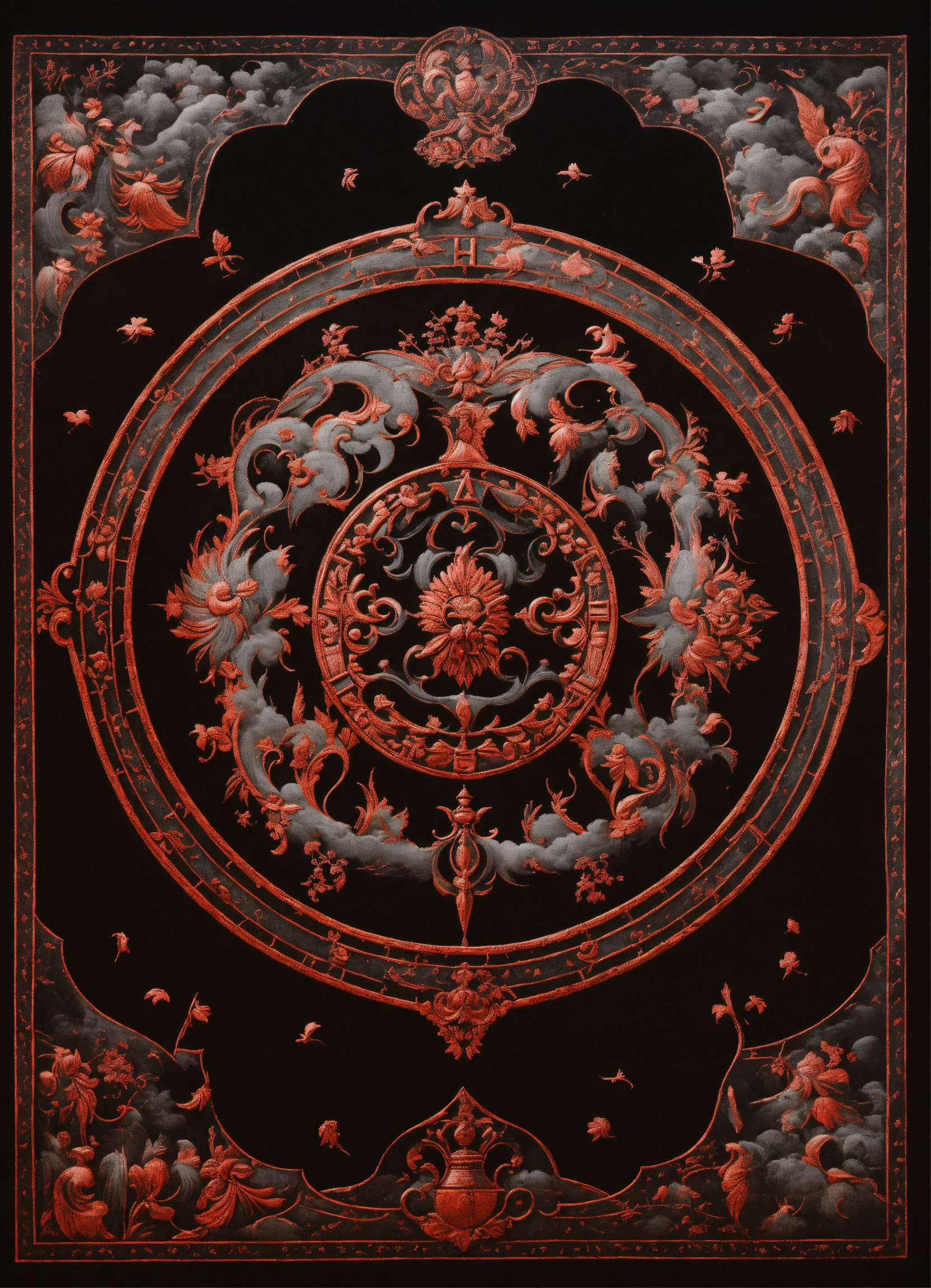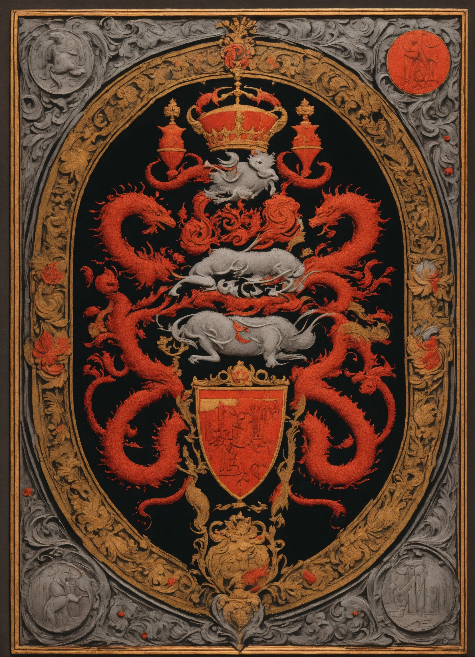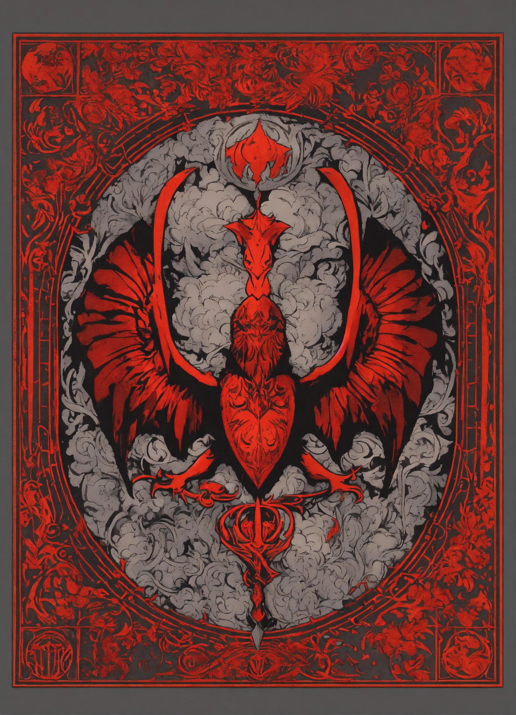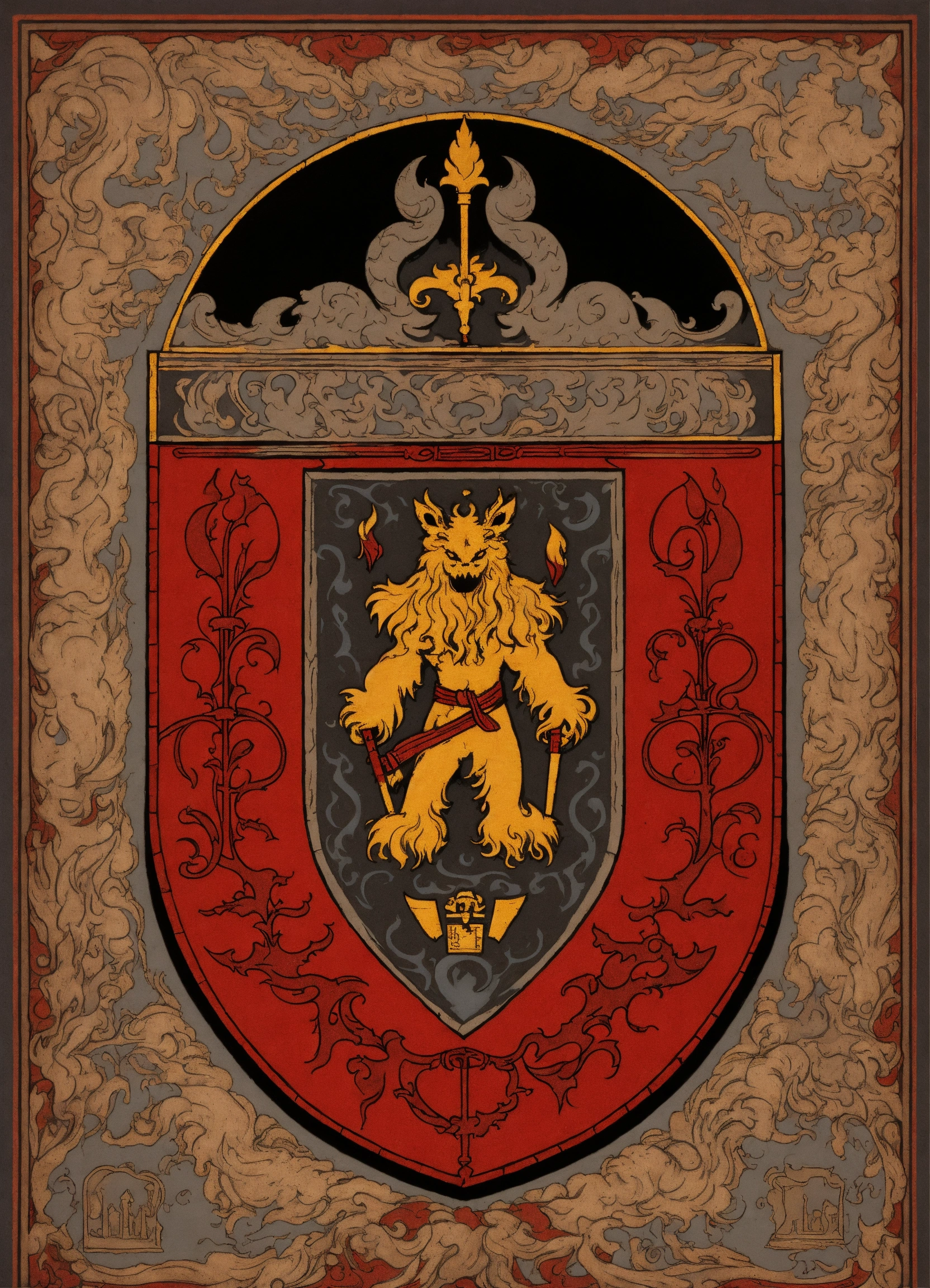 Blason avec au centre silhouette de monstre aux contours indistincts. autour de la silhouette il y a des représentations stylisées d'égouts, de caves et d'endroits sombres. beaucoup de teintes sombres noires, gris, marron et rouge. en bas du blason il est écrit "dans l'ombre, nous veillons", en lettres gothiques.