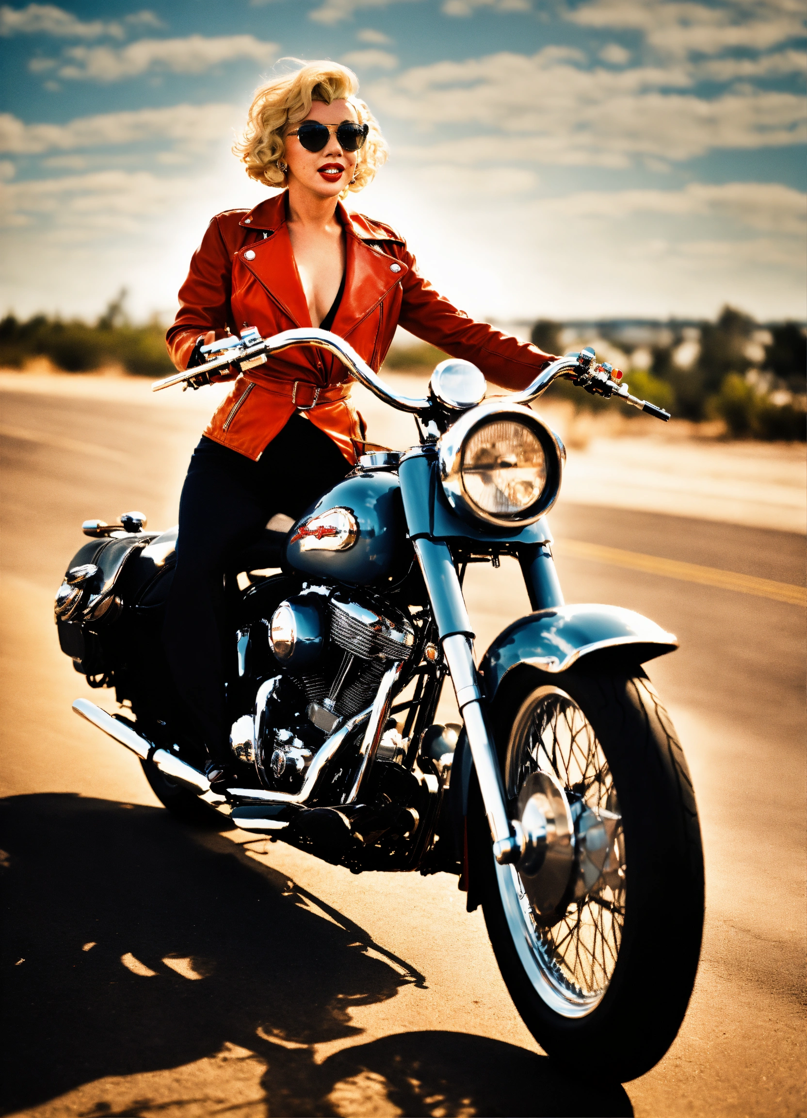 White background, a photo of 1950's marilyn monroe riding a harley davidson motorcycle. wide angle shot, greg rutowskii, dan mumford