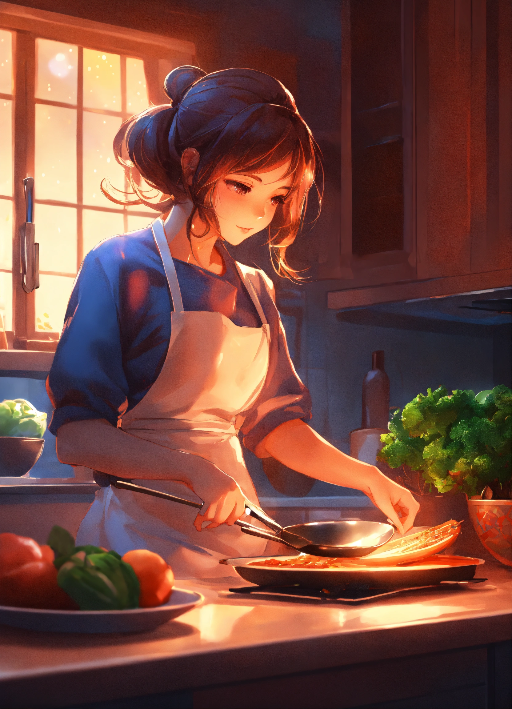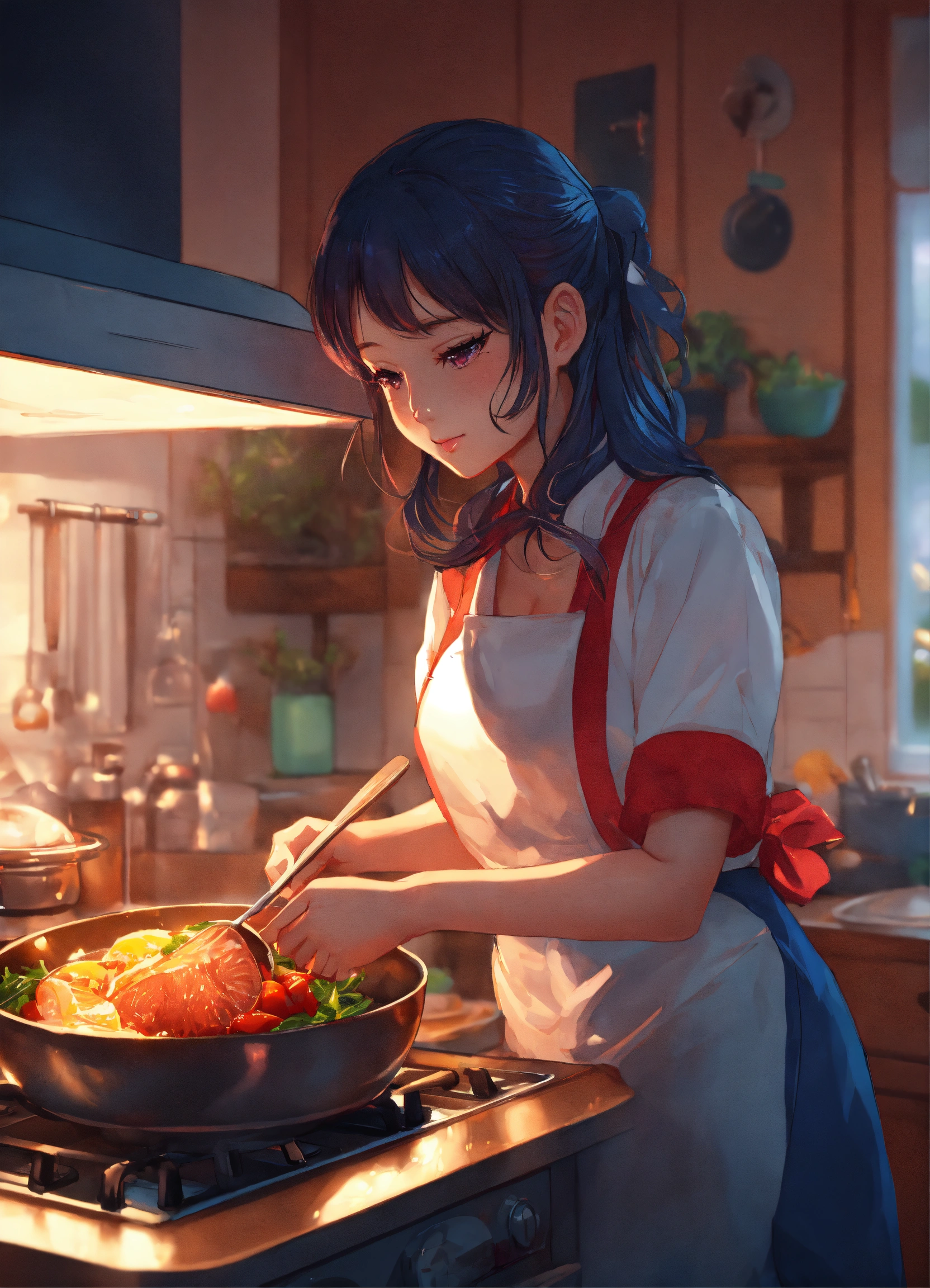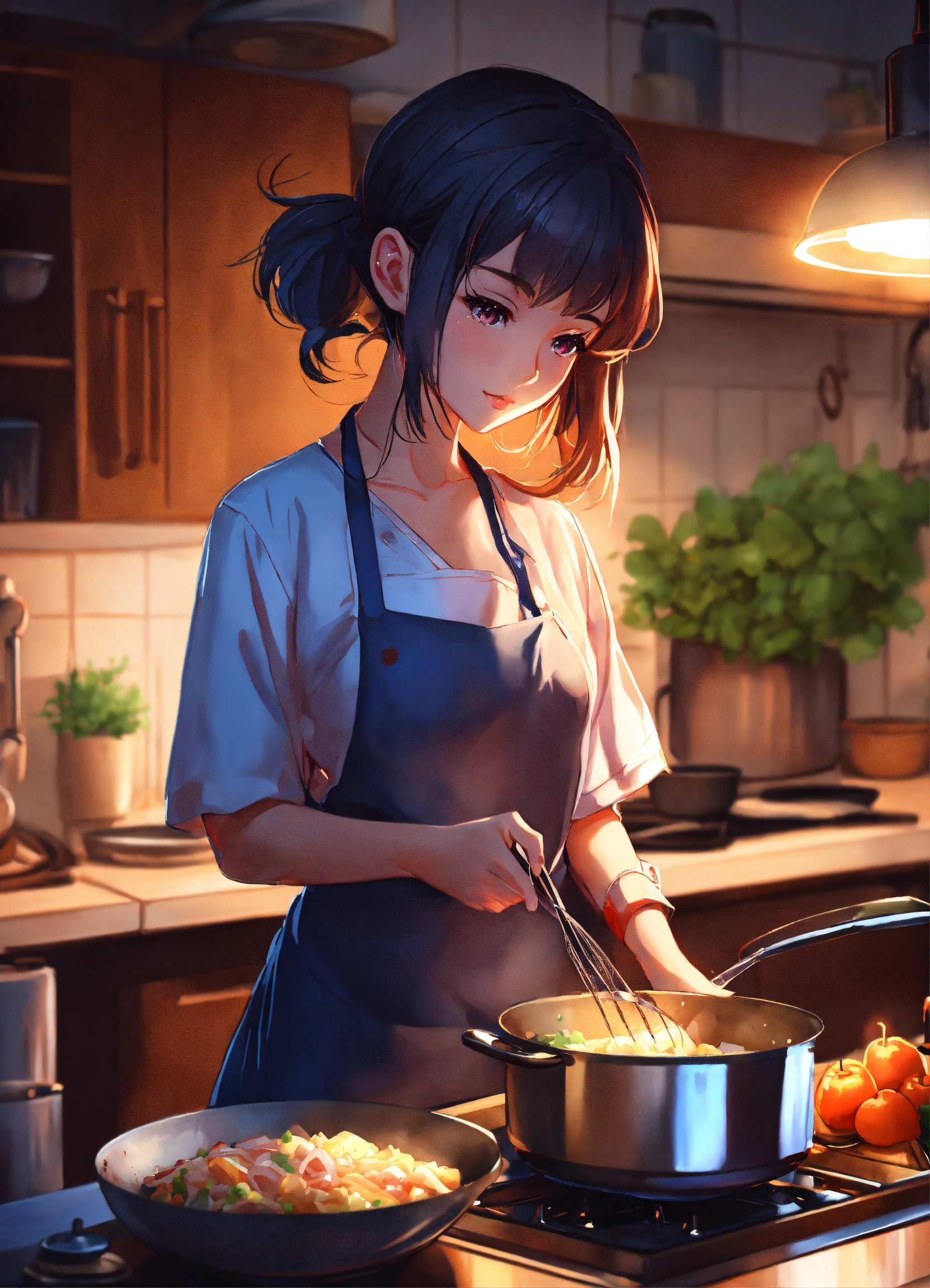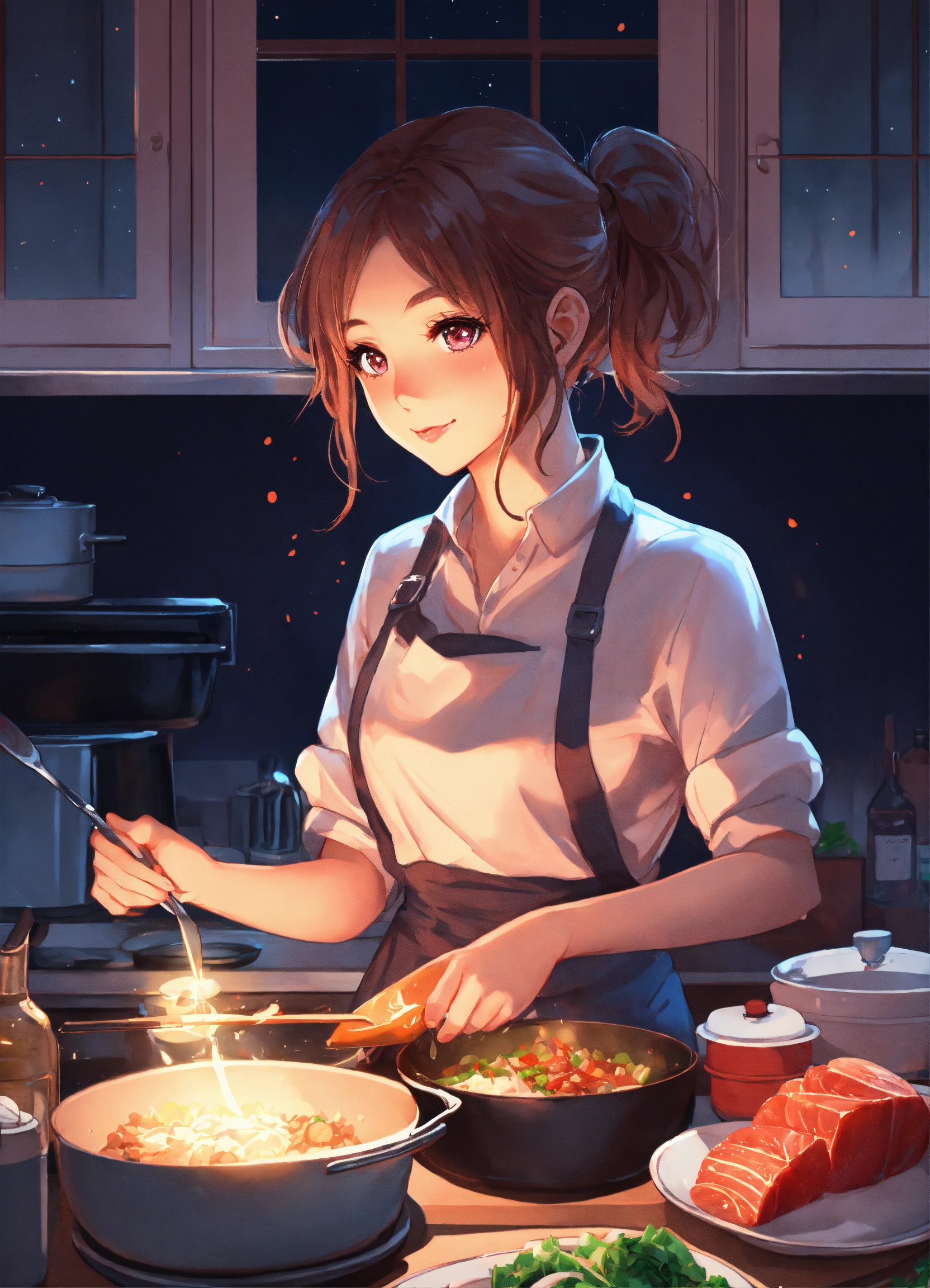 A cute anime lofi girl cooking dinner at home during the night, stunning anime art by artgerm, 8k, award-winner
