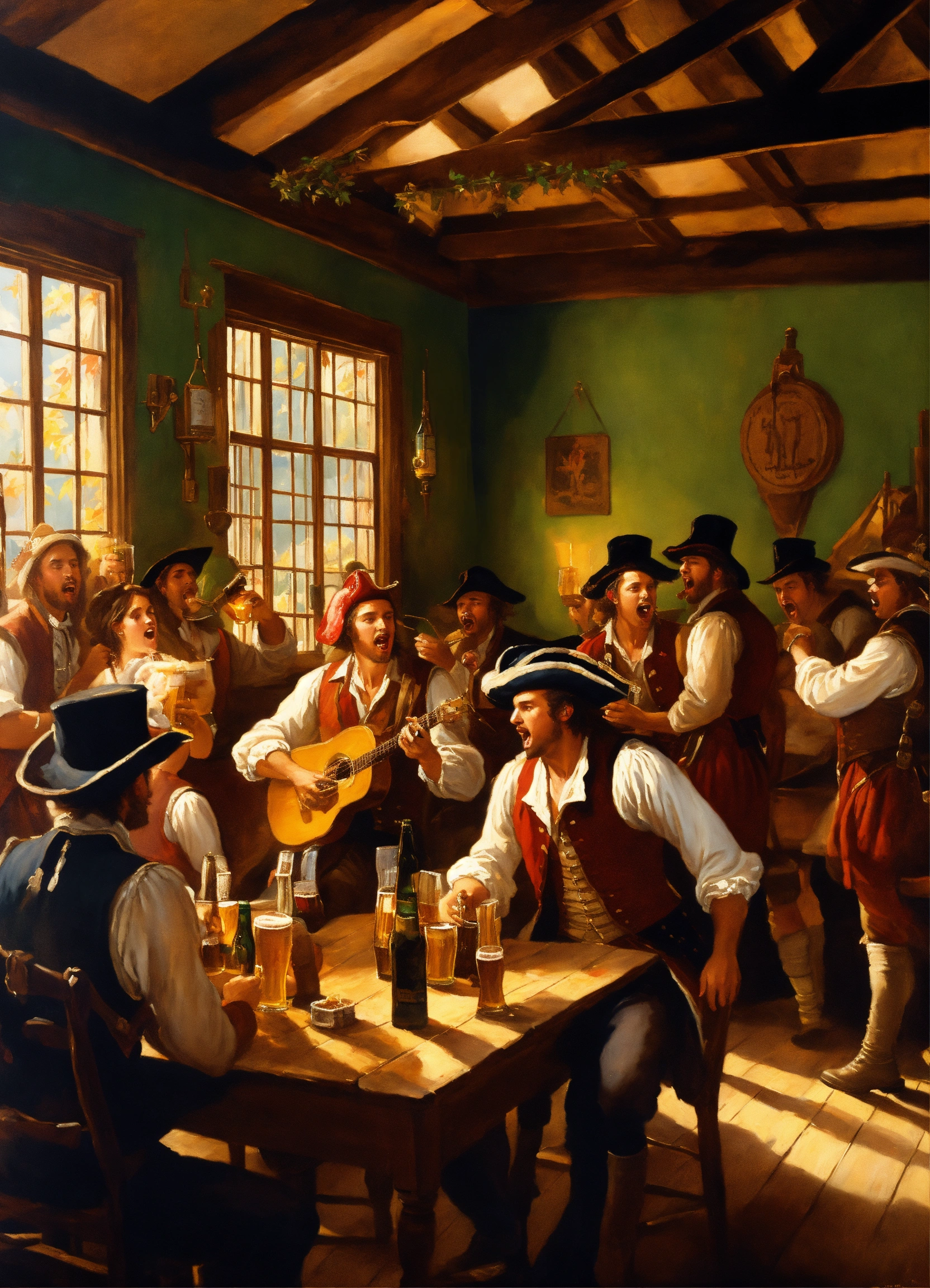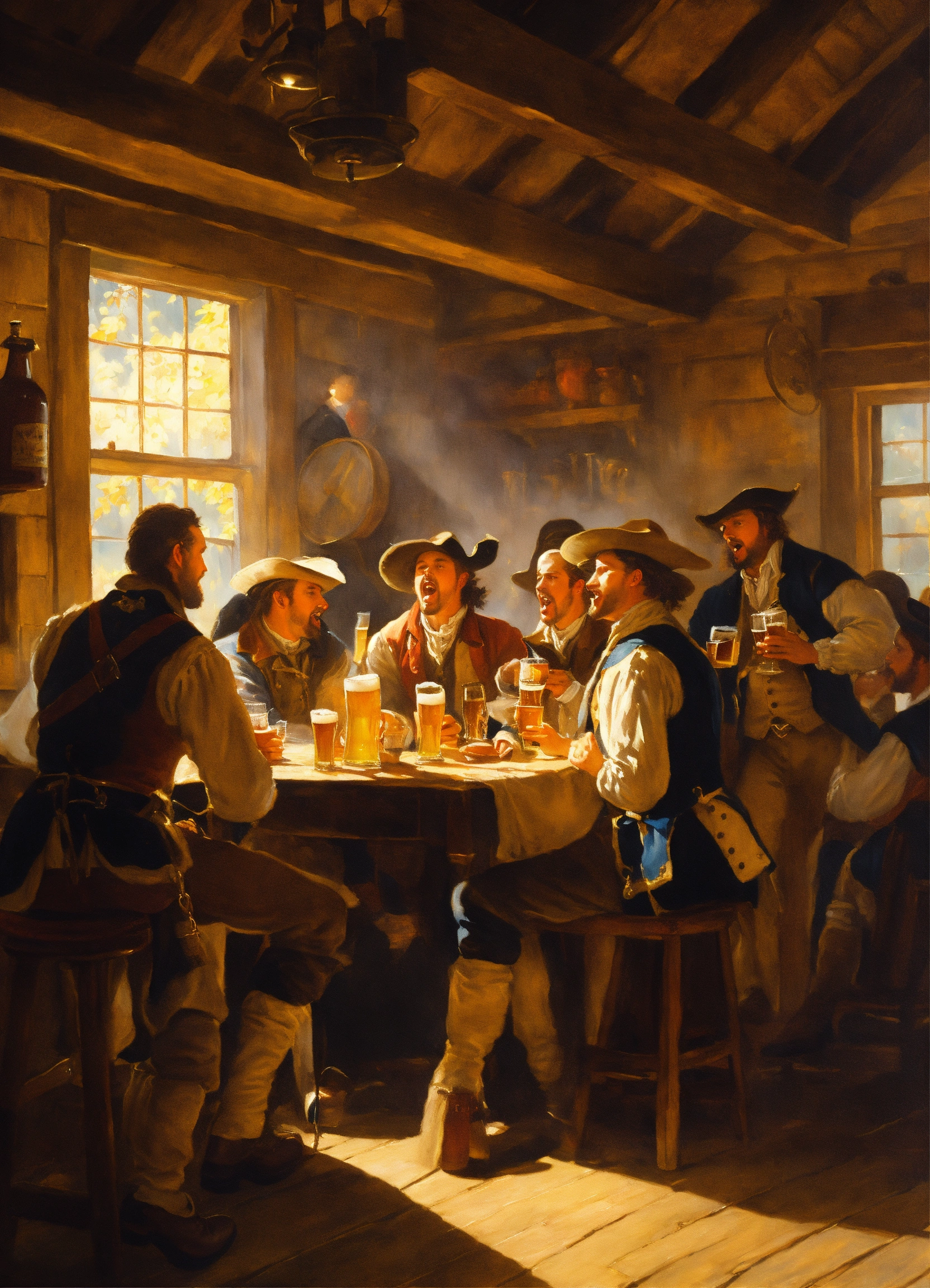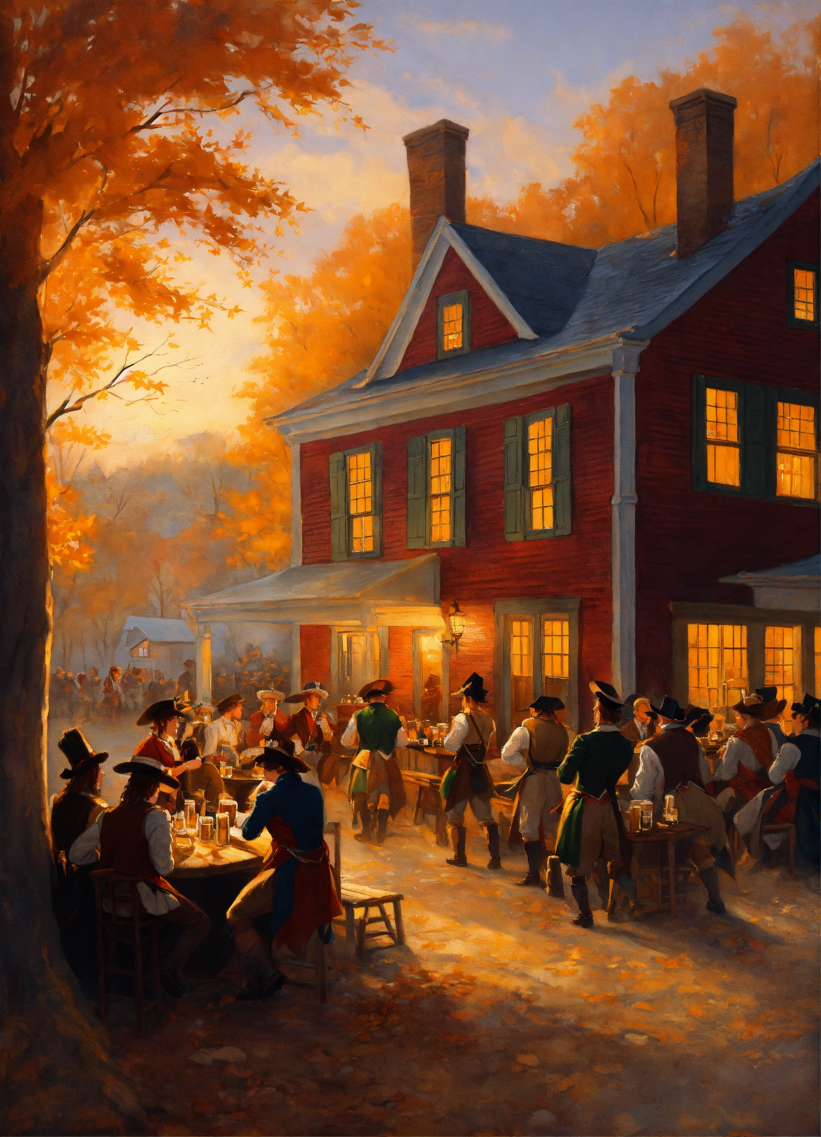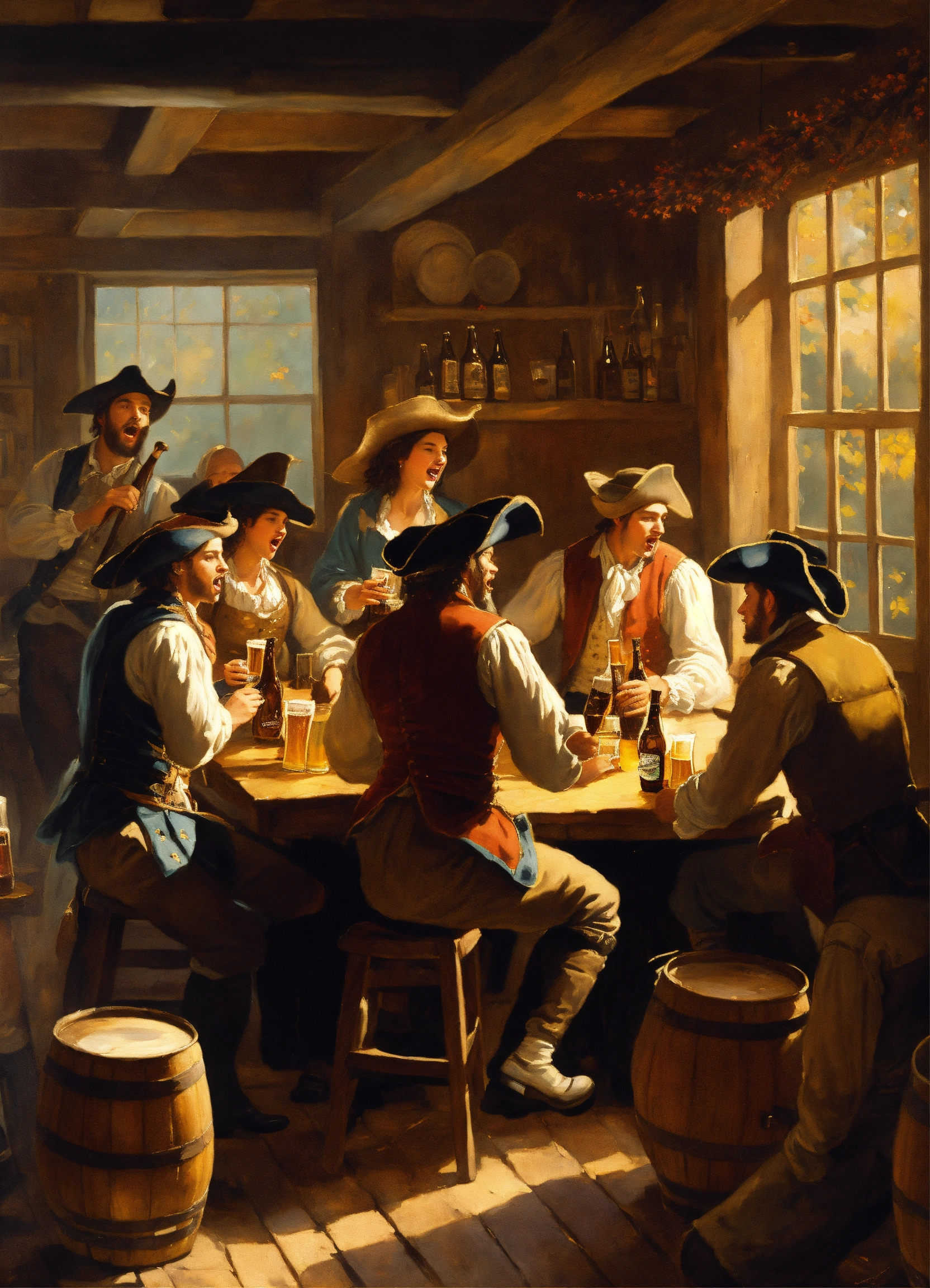 A painting of a colonial tavern with people drinking beer and singing. greg rutkowski, autumn, american revolution, brewery, beer, music