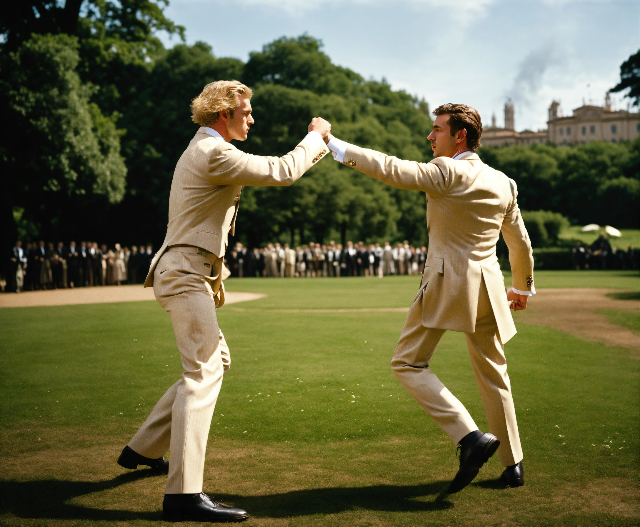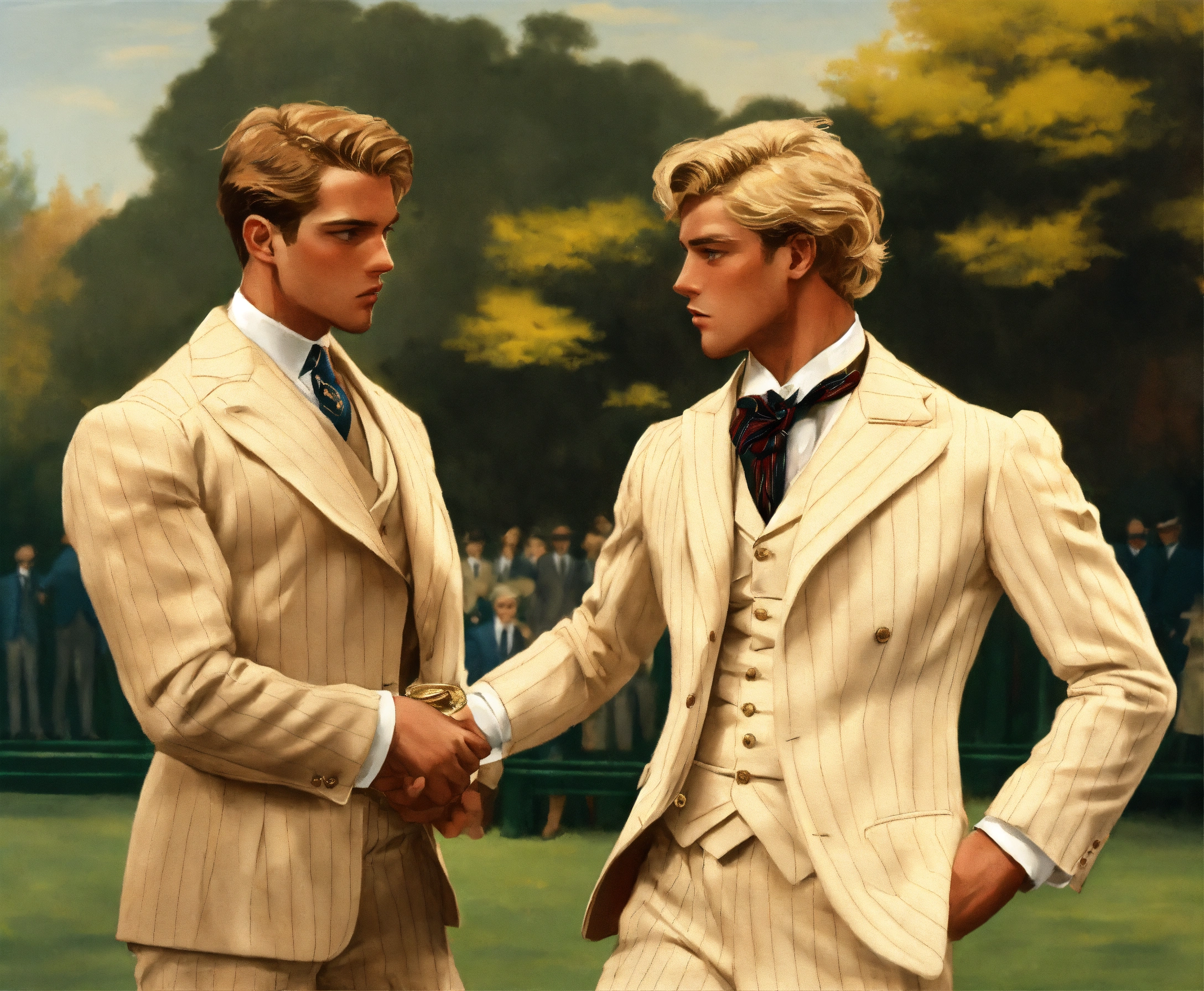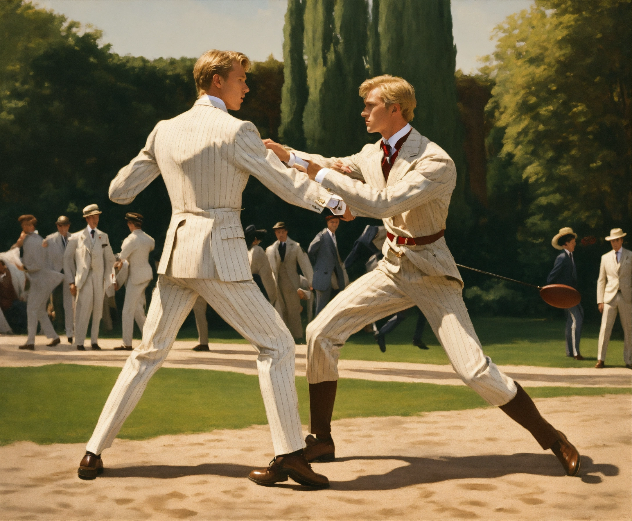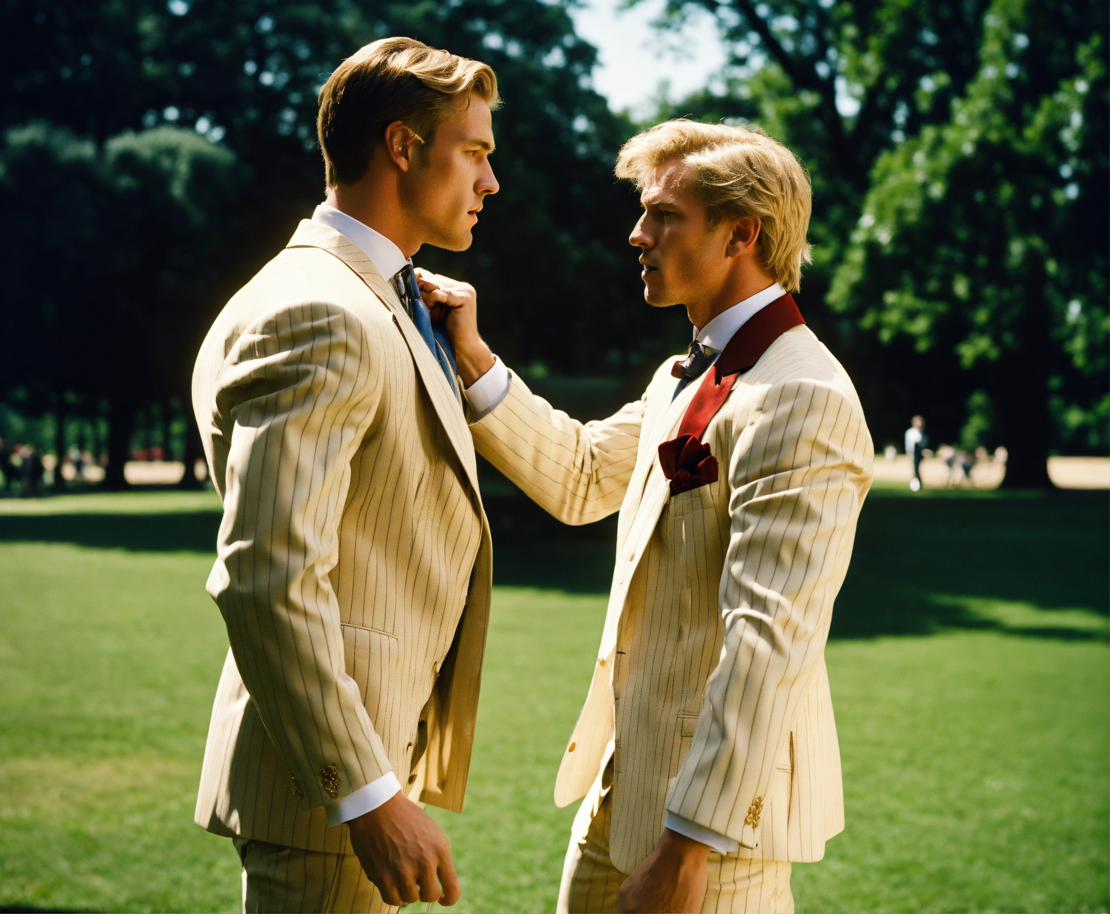 A blonde young gentleman in cream pinstripe vested suit, large shoulders, fighting with an italian male sportsman in a park