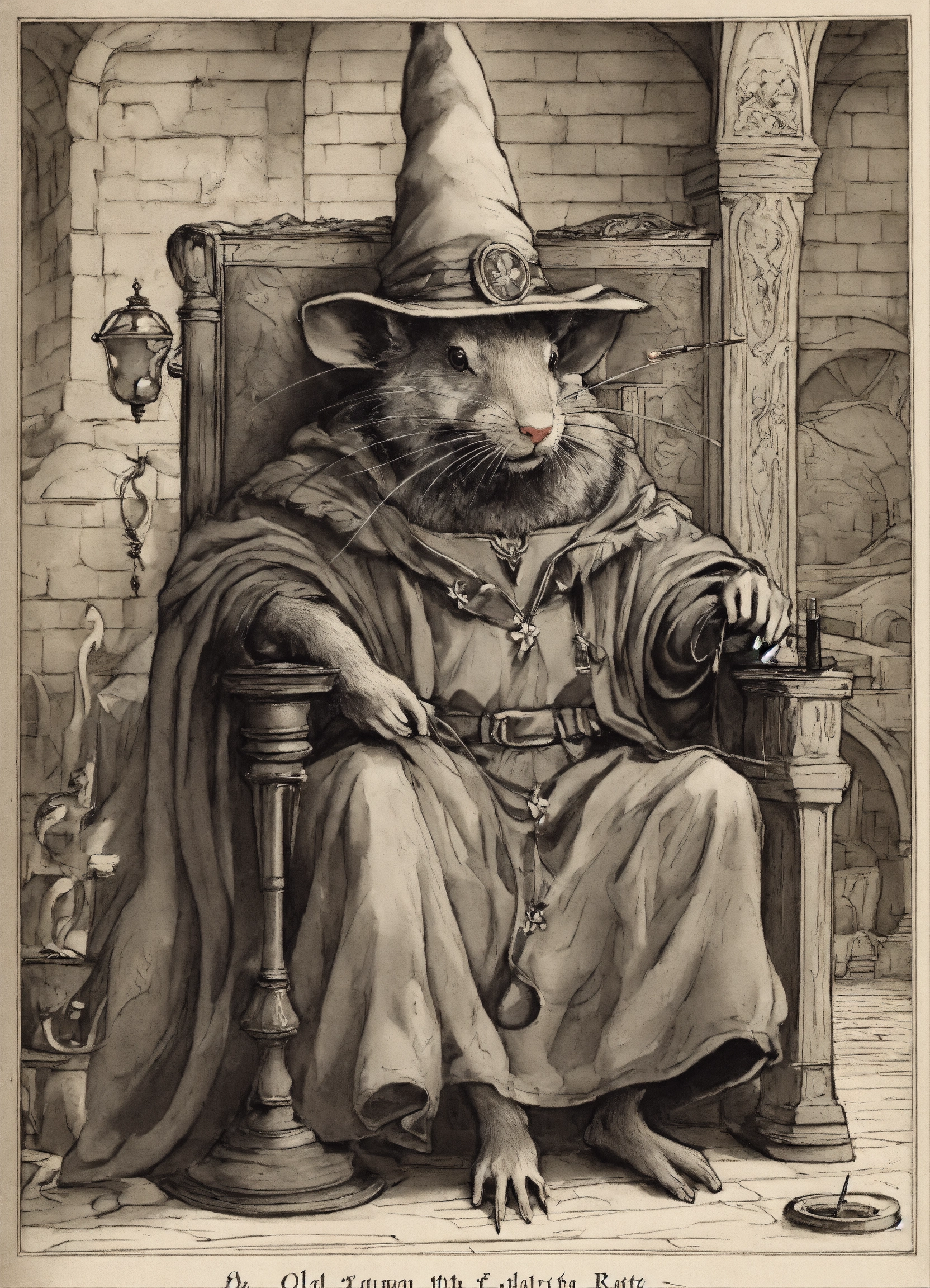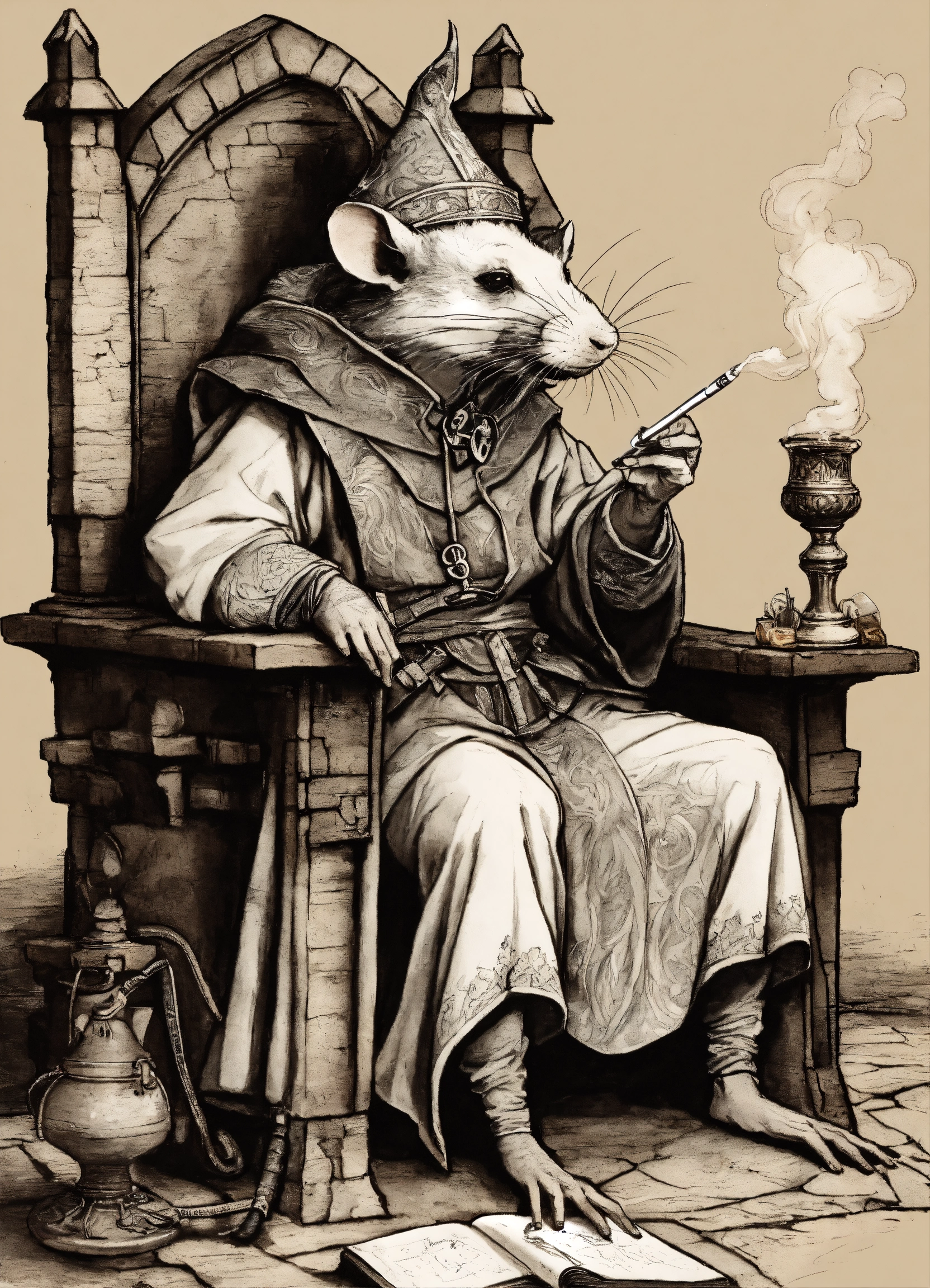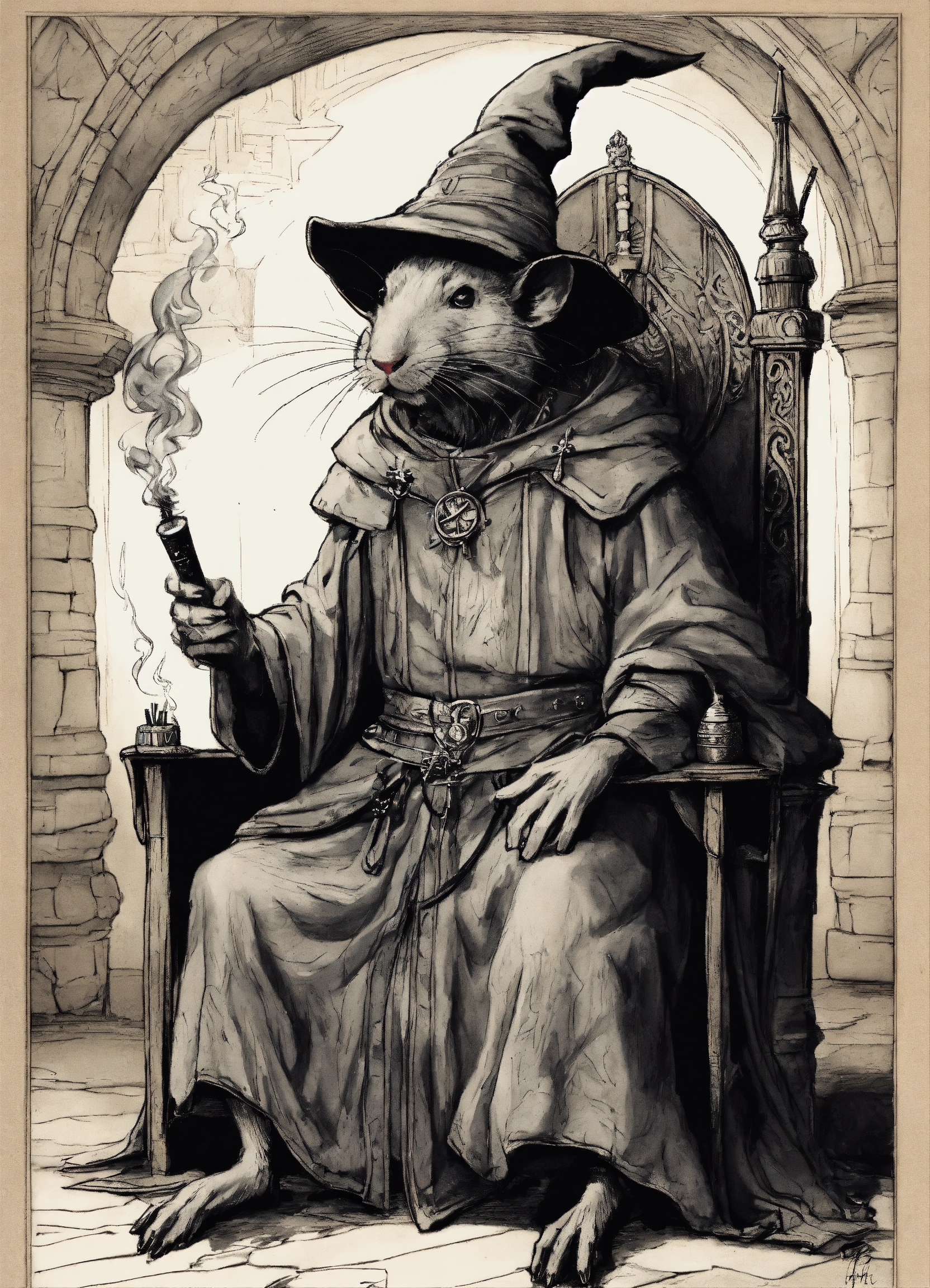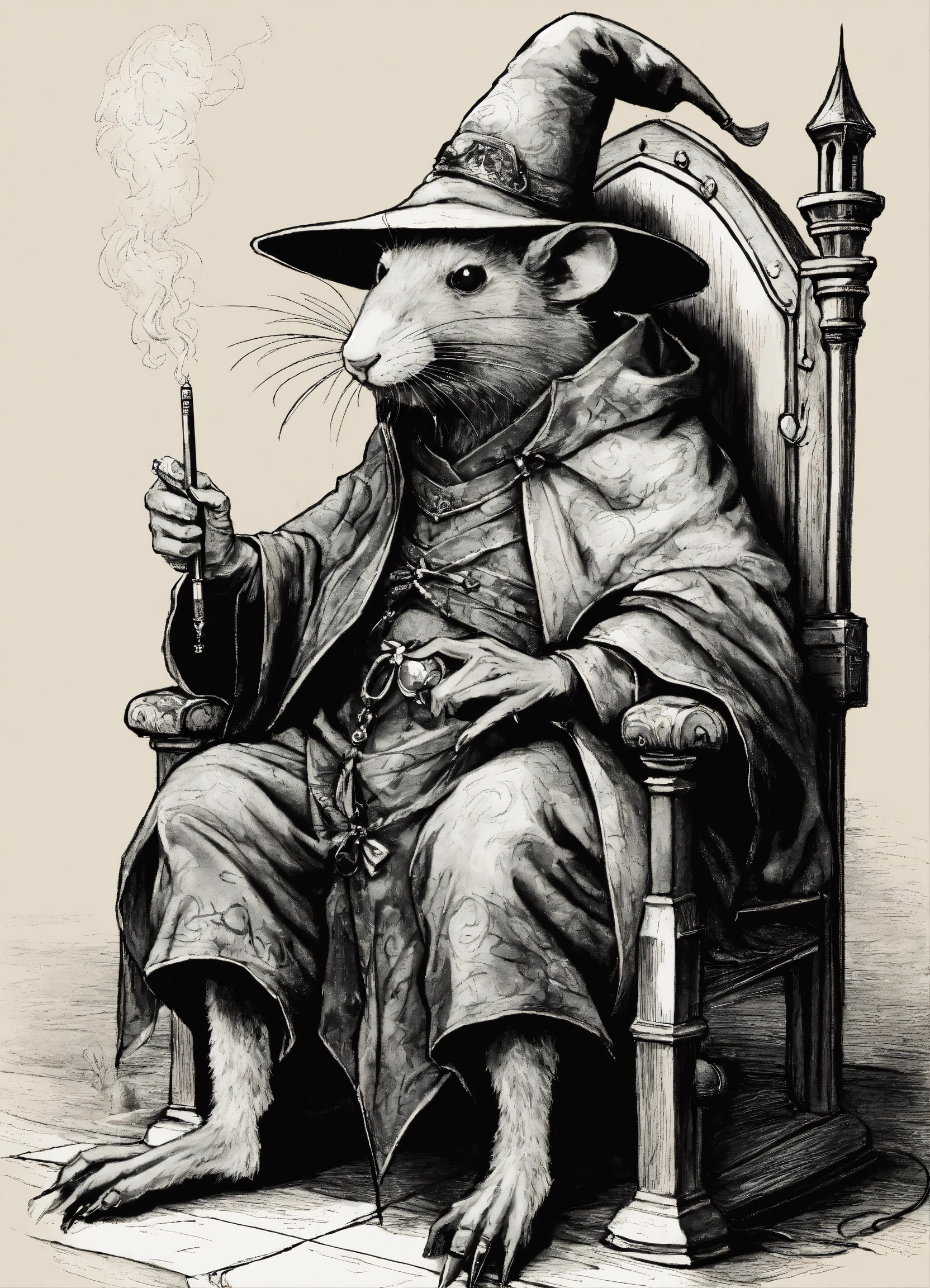 An old humanoid rat, sitting on a throne, smoking a joint, dressed as a wizard, medieval setting, pen drawing art