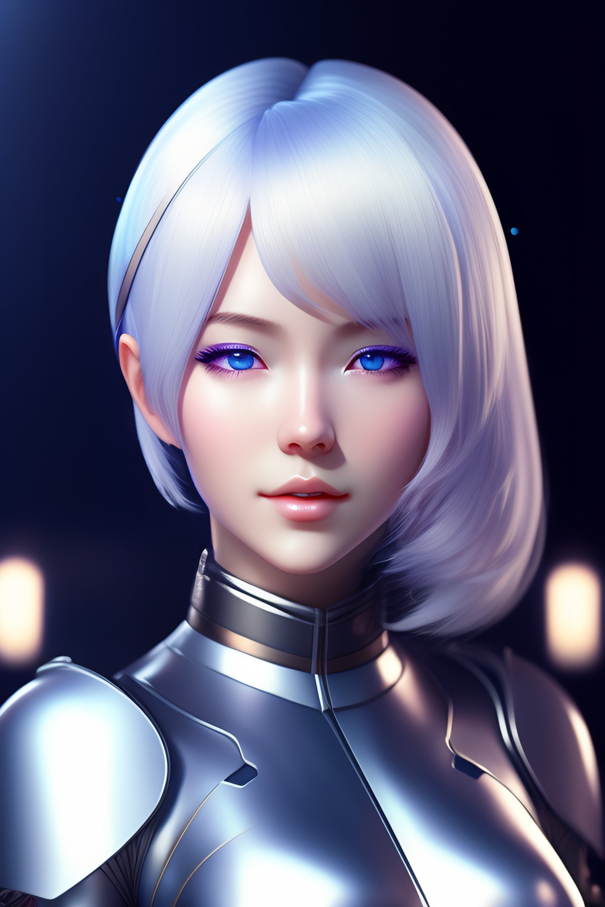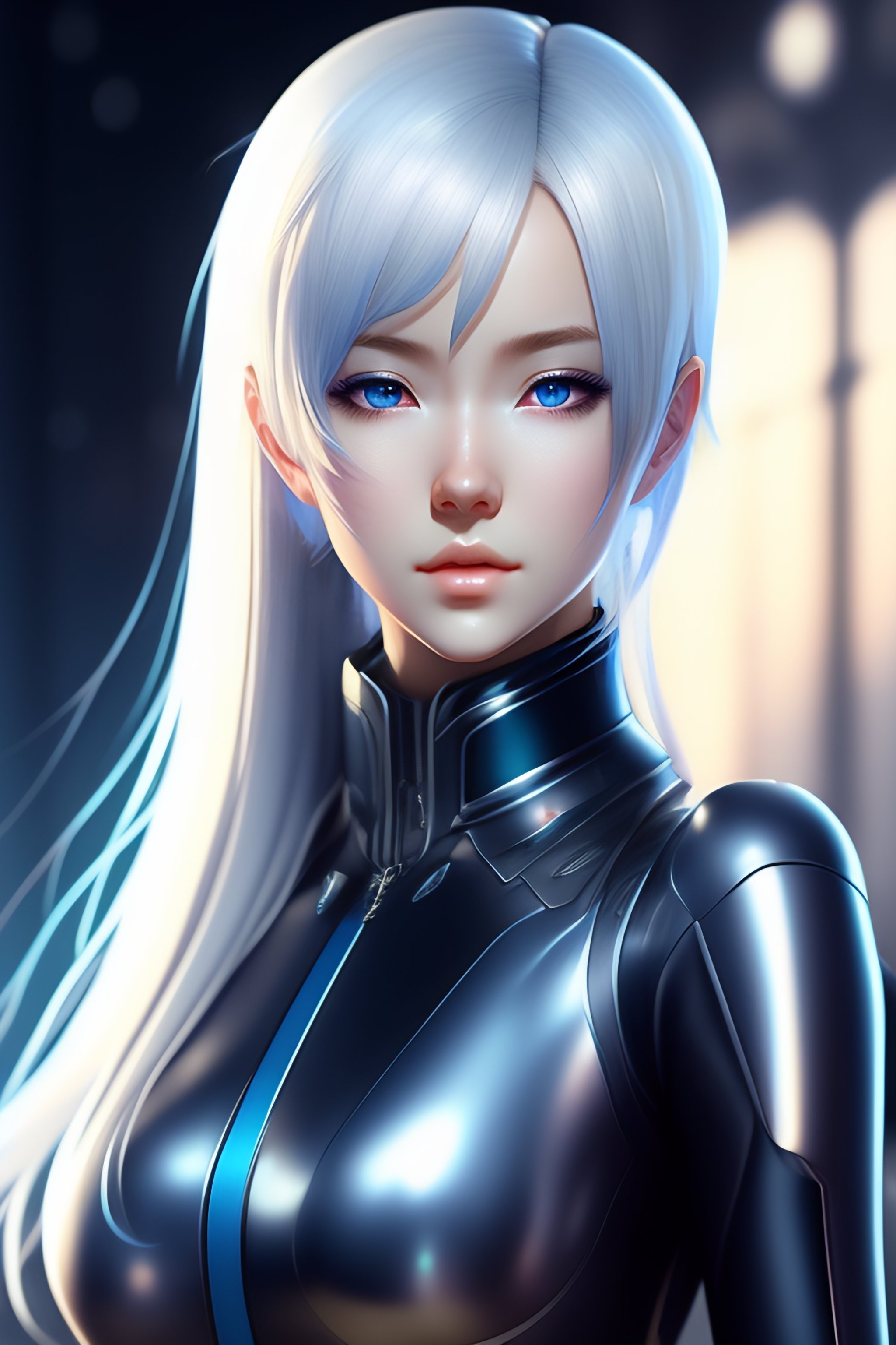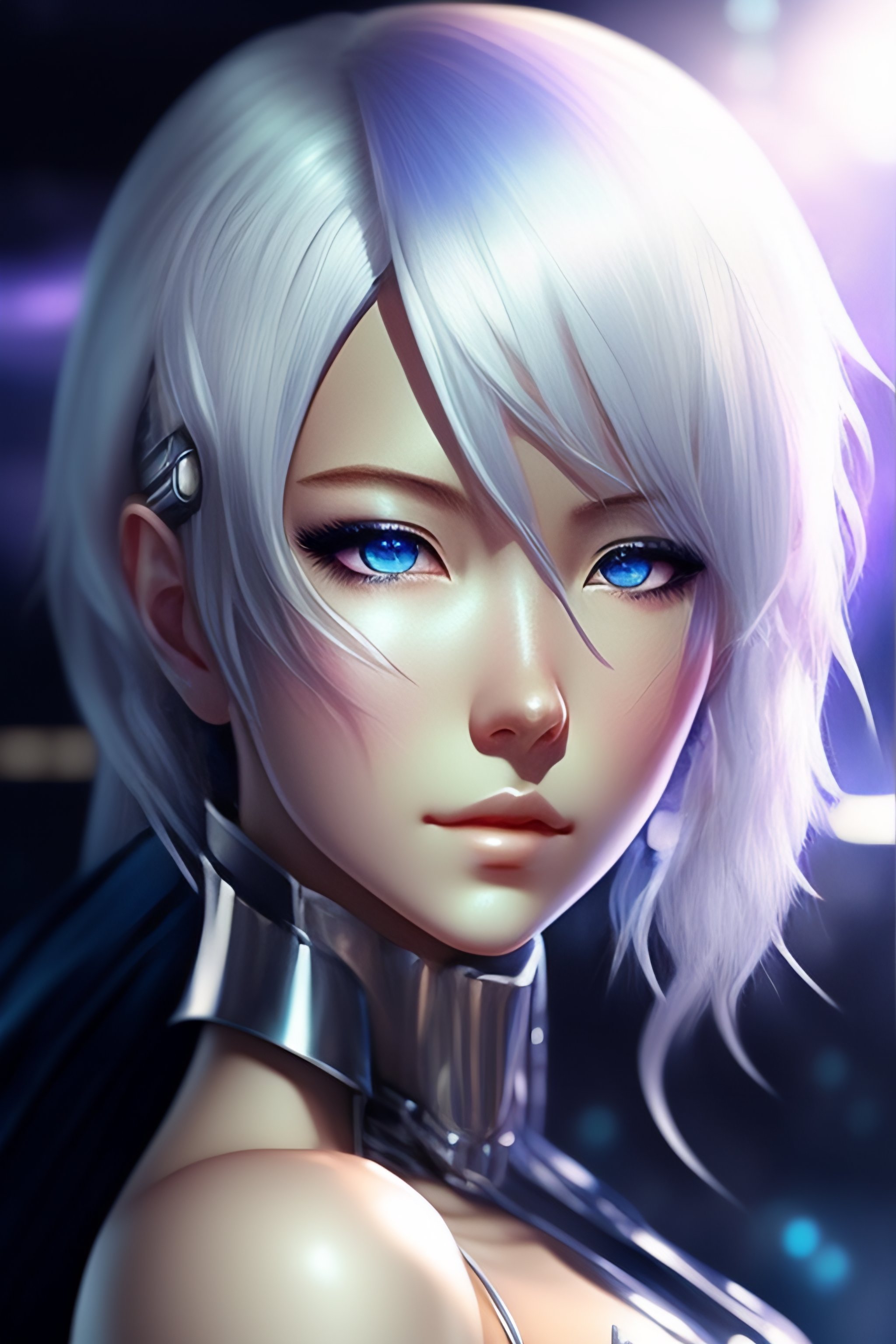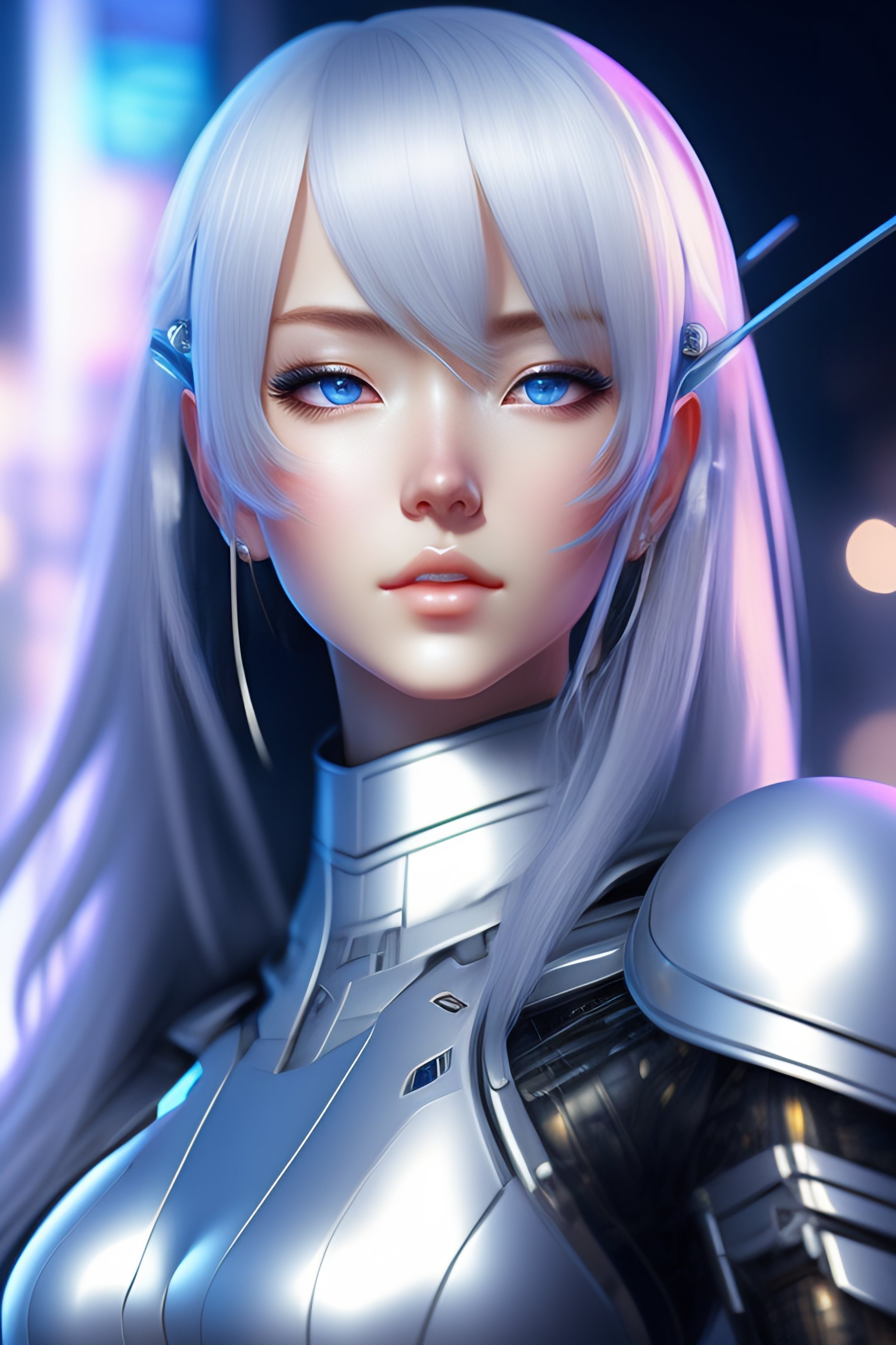 Young adult anime android girl with silver hair, blue eyes, robotic seam lines on face, mamoru oshii artsyle, realistic lighting, realistic shaded, full body portrait