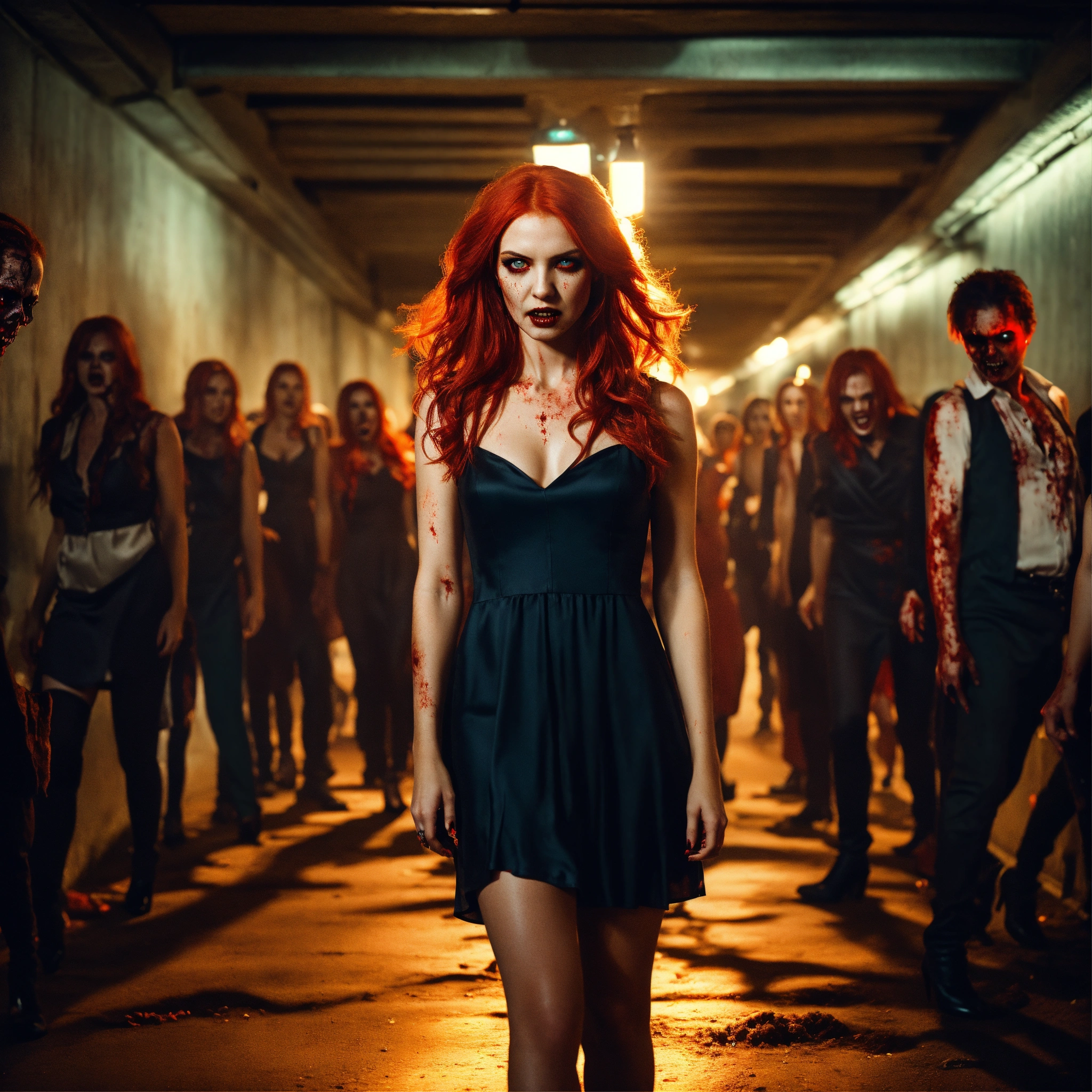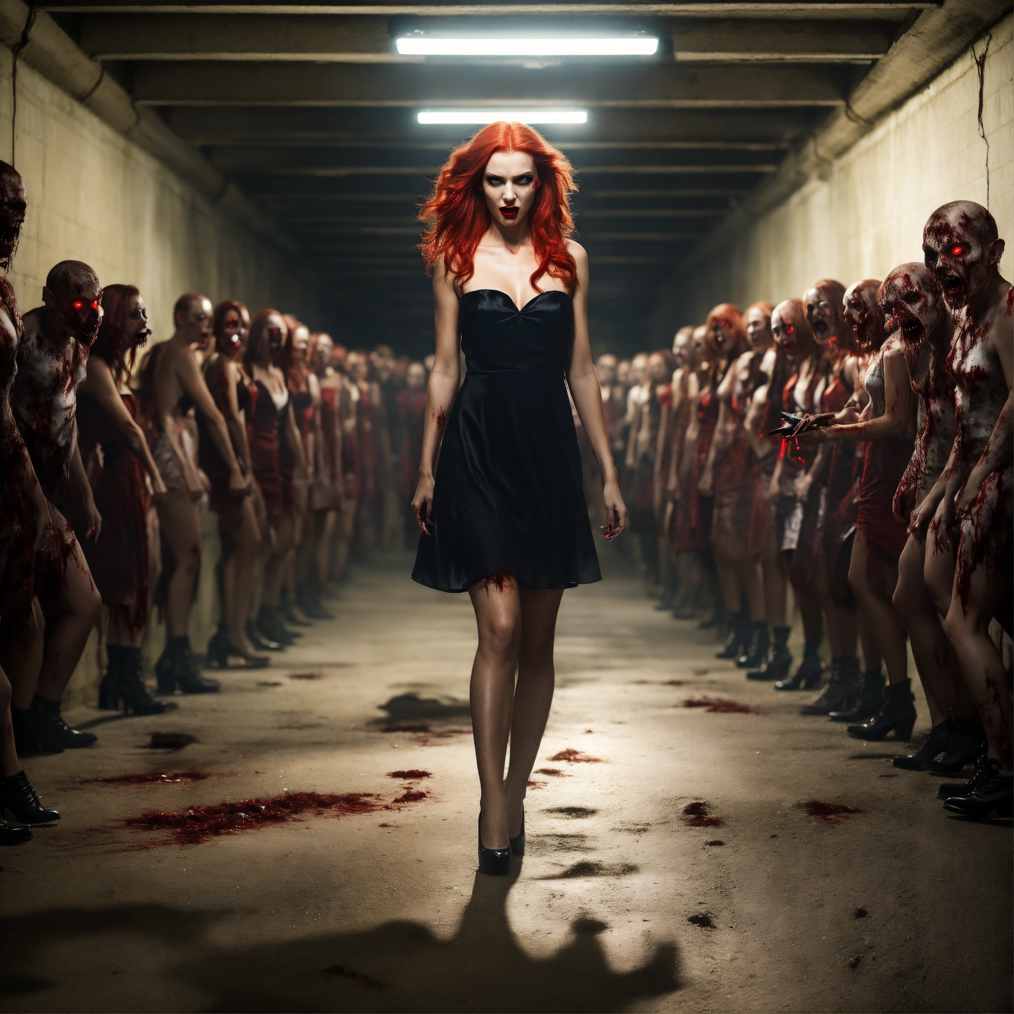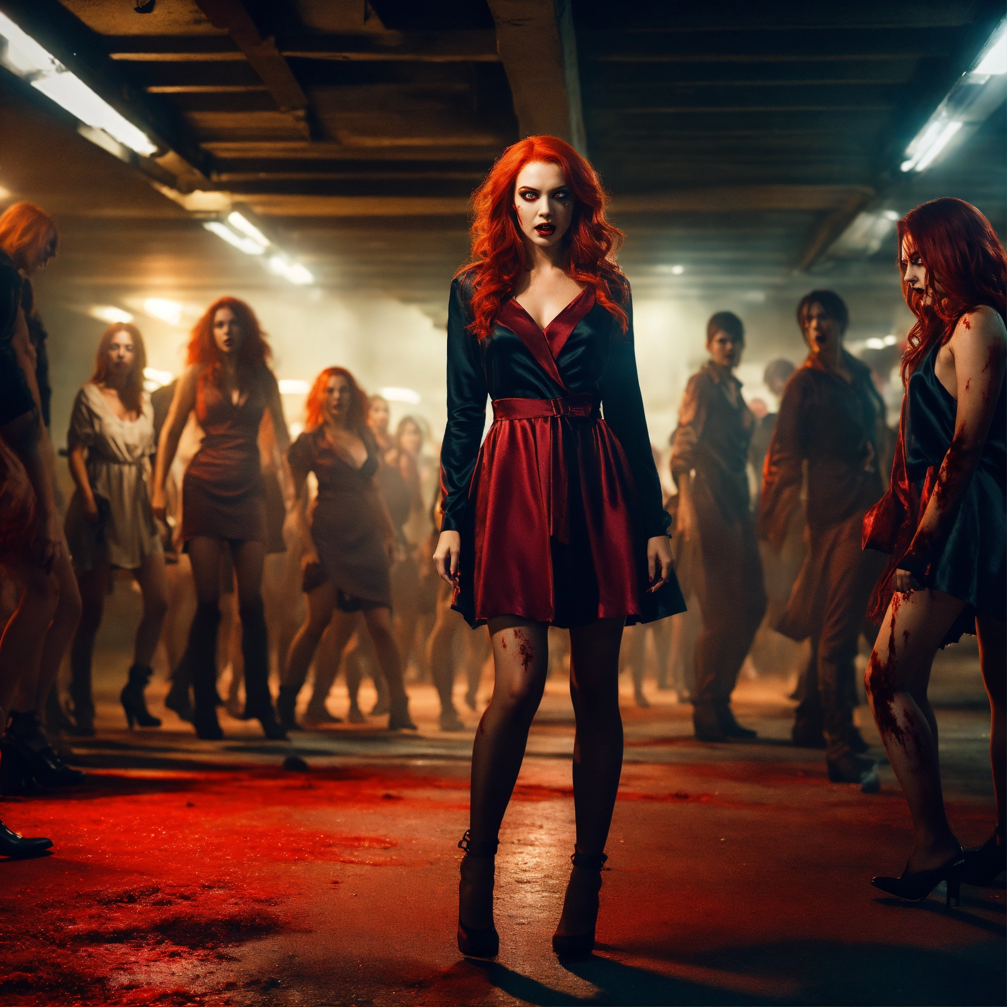 A beautiful red haired vampire woman, in a short silk dress and wearing high heels, leading a horde of zombie-vampires wearing normal clothes, with red glowing eyes, in an underground parking garage, highly realistic, dramatic lighting