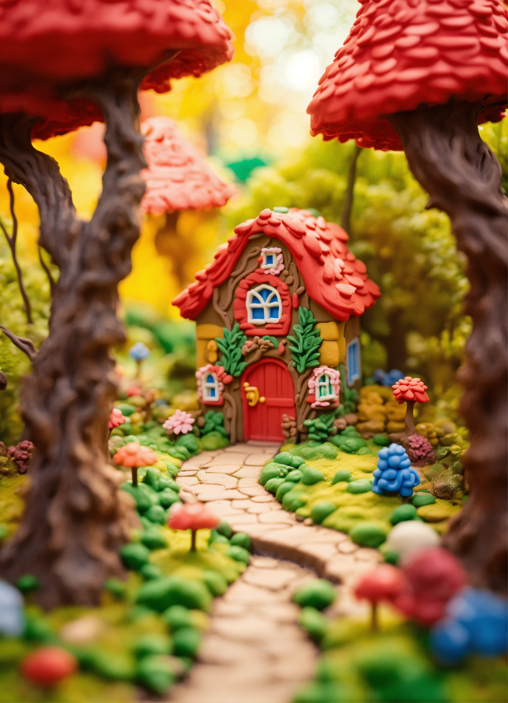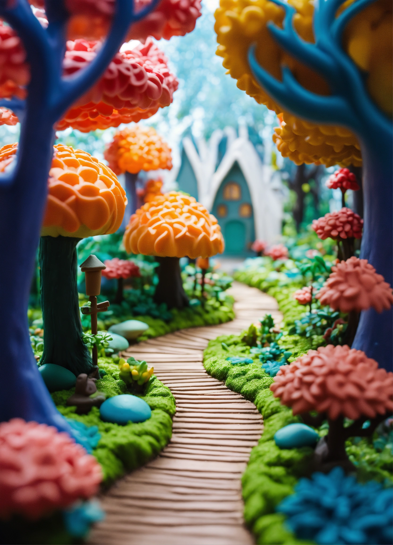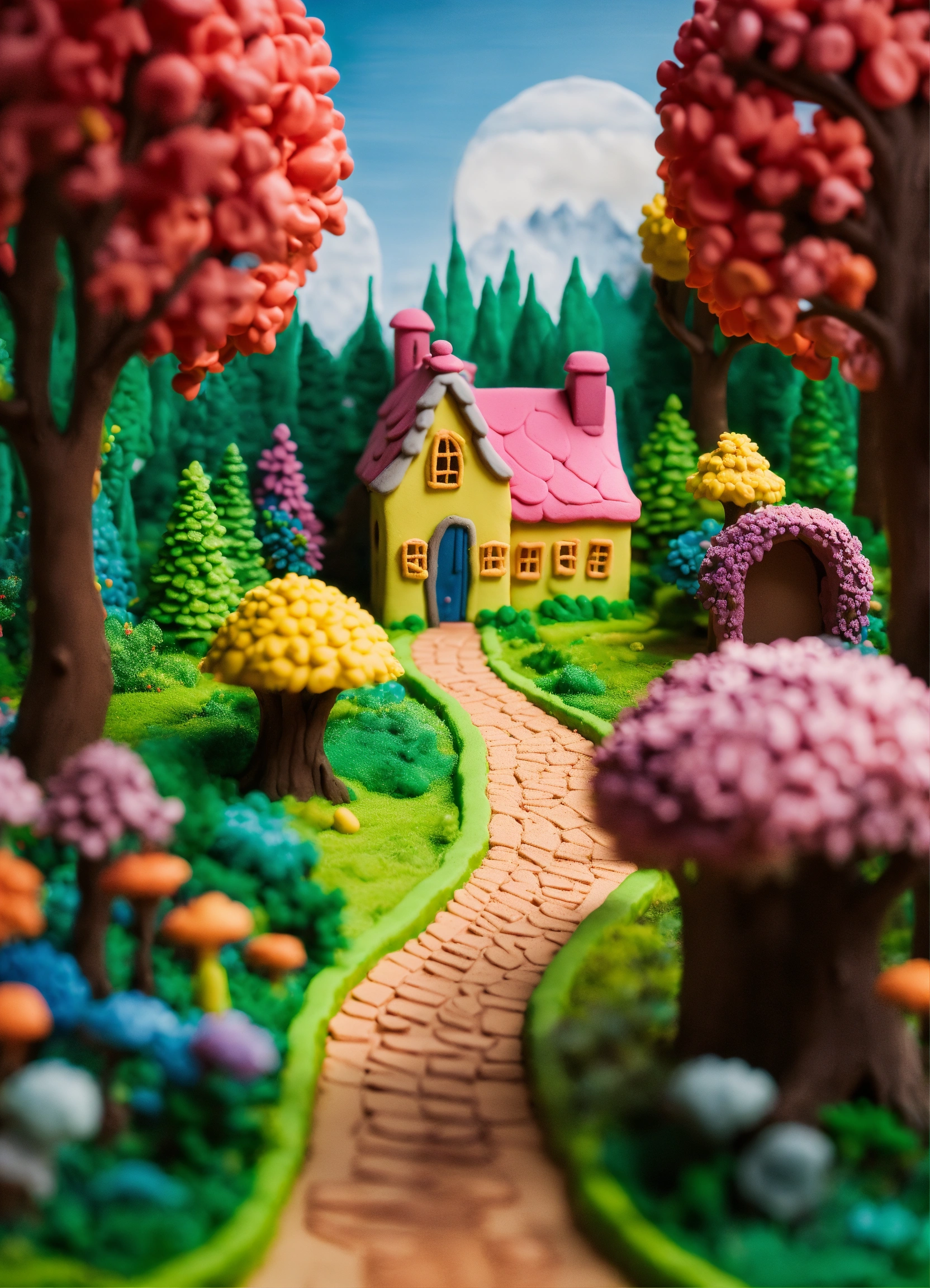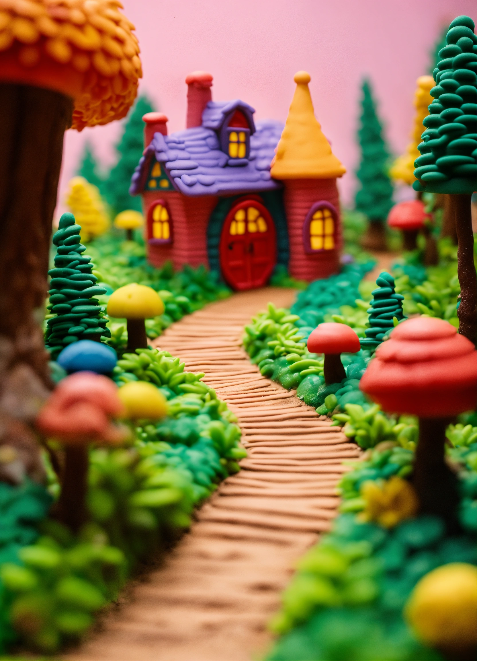 Path leading to the house through a beautiful fairy-tale forest made of plasticine