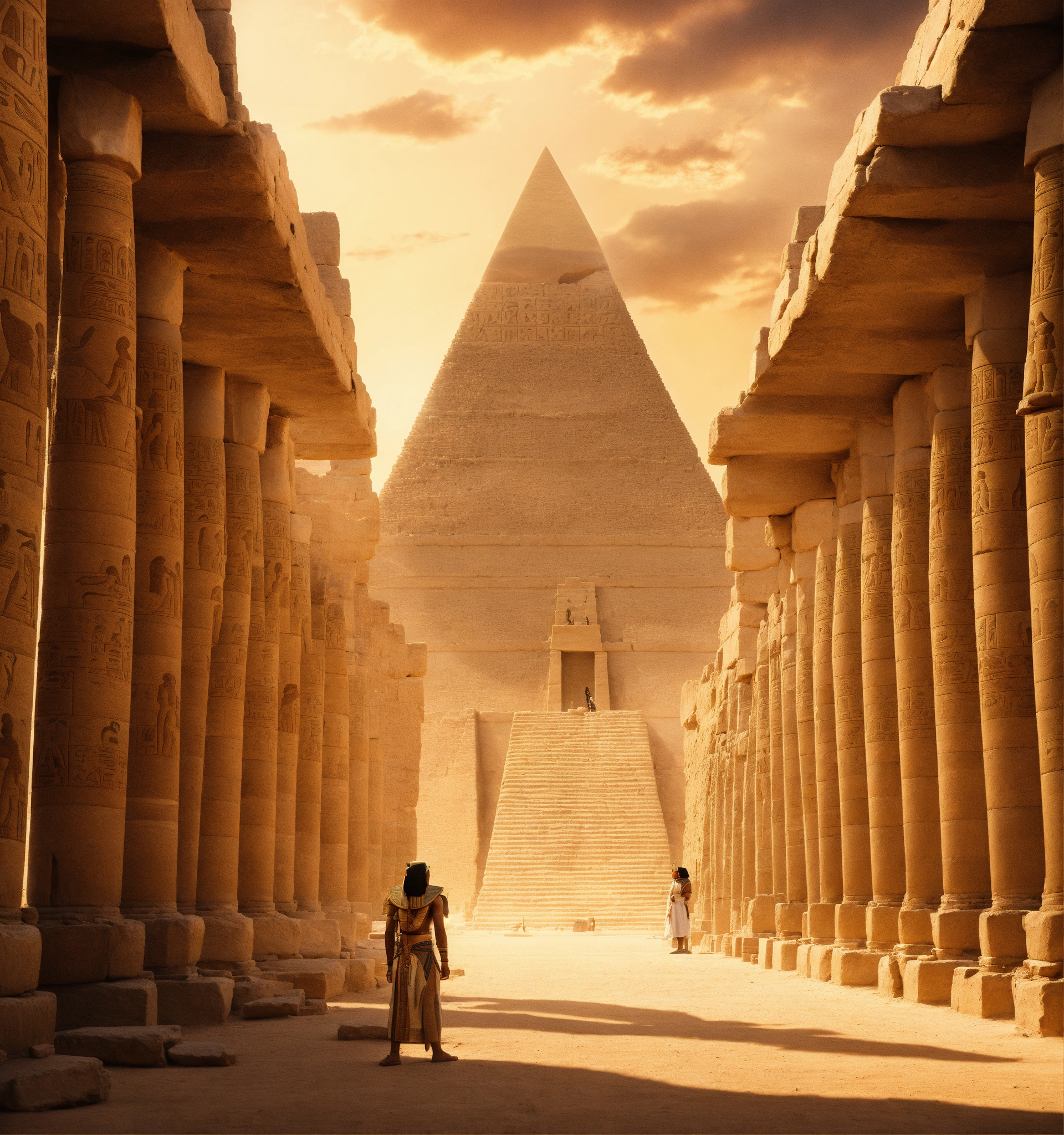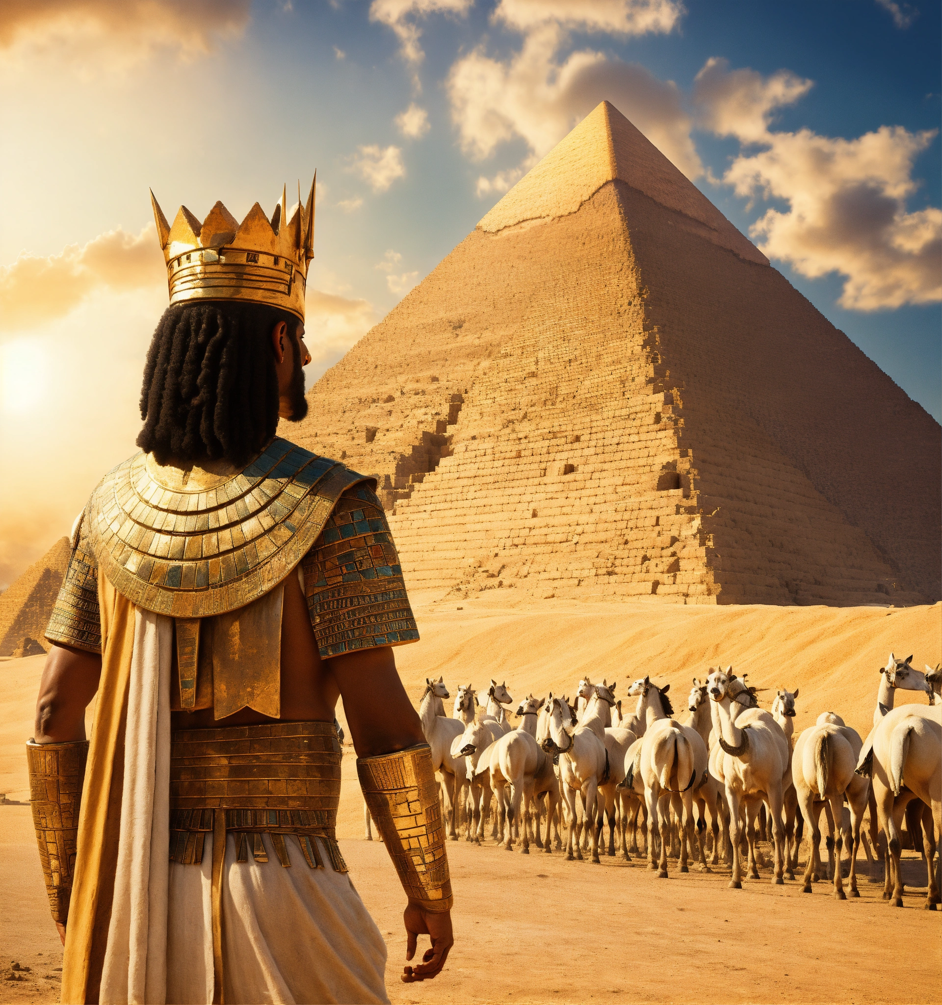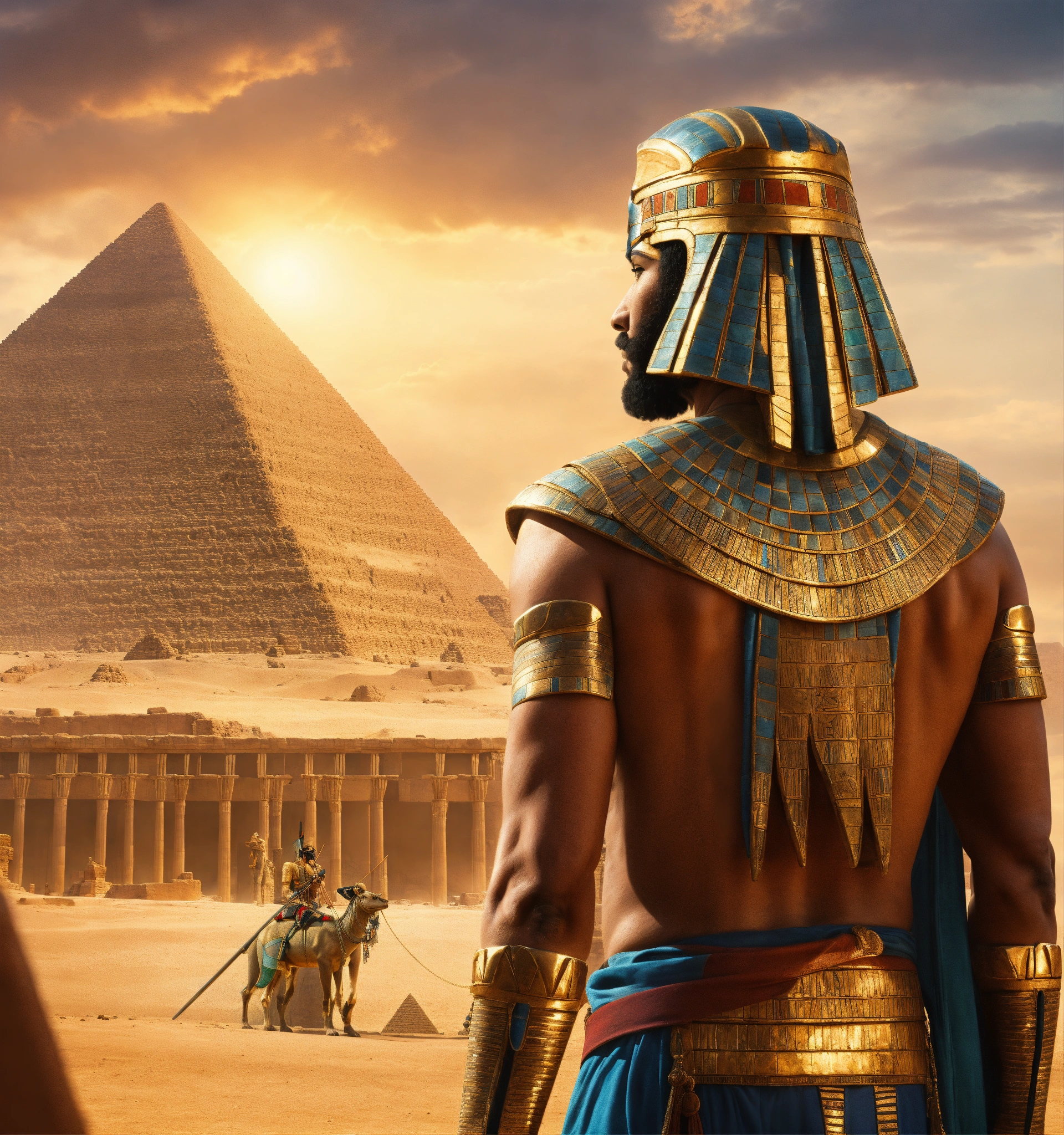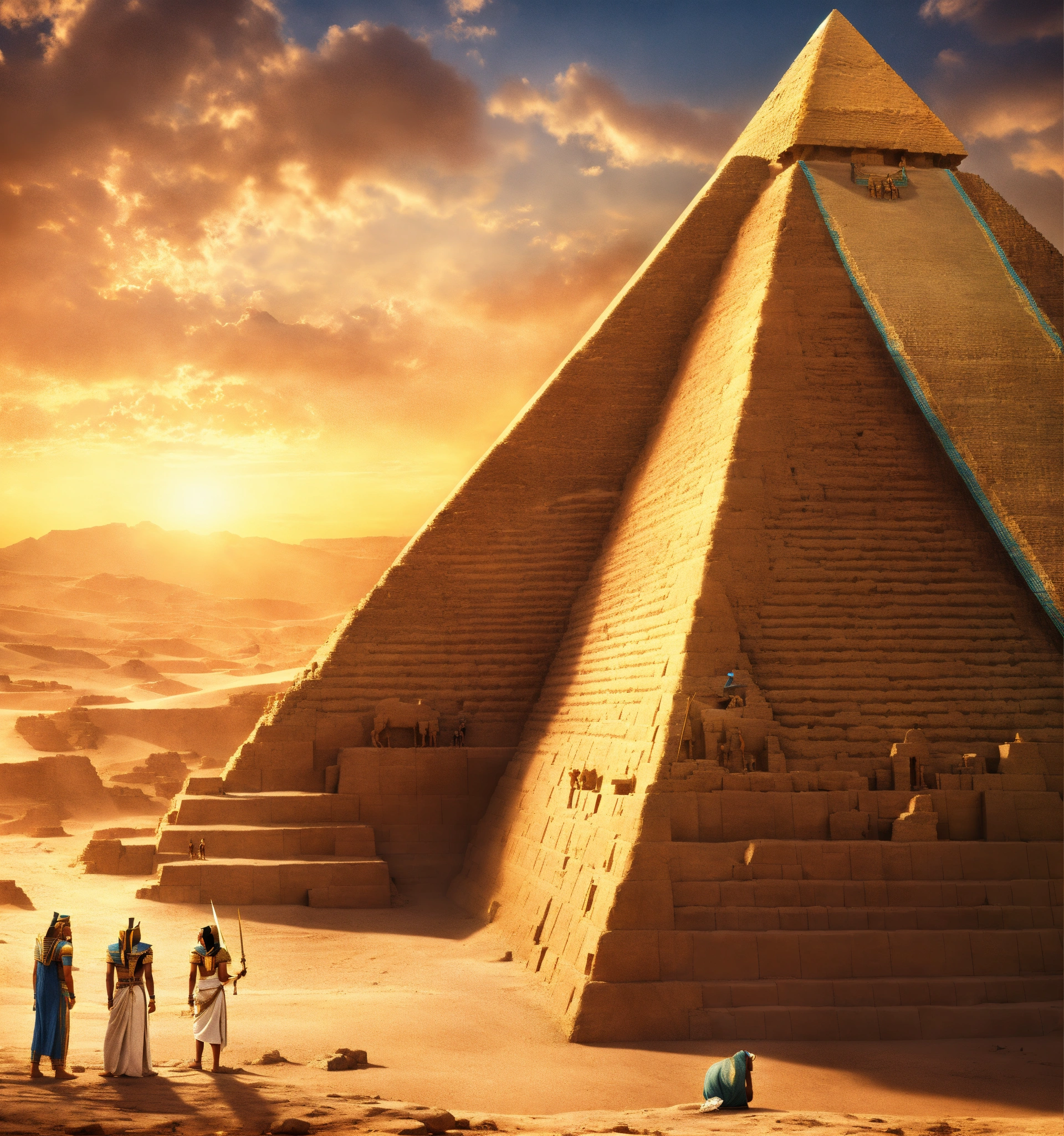 An epic fantasy scene outdoor in ancient egypt featuring the king of egypt watching the building of the pyramid. tail end view, sharp detail.