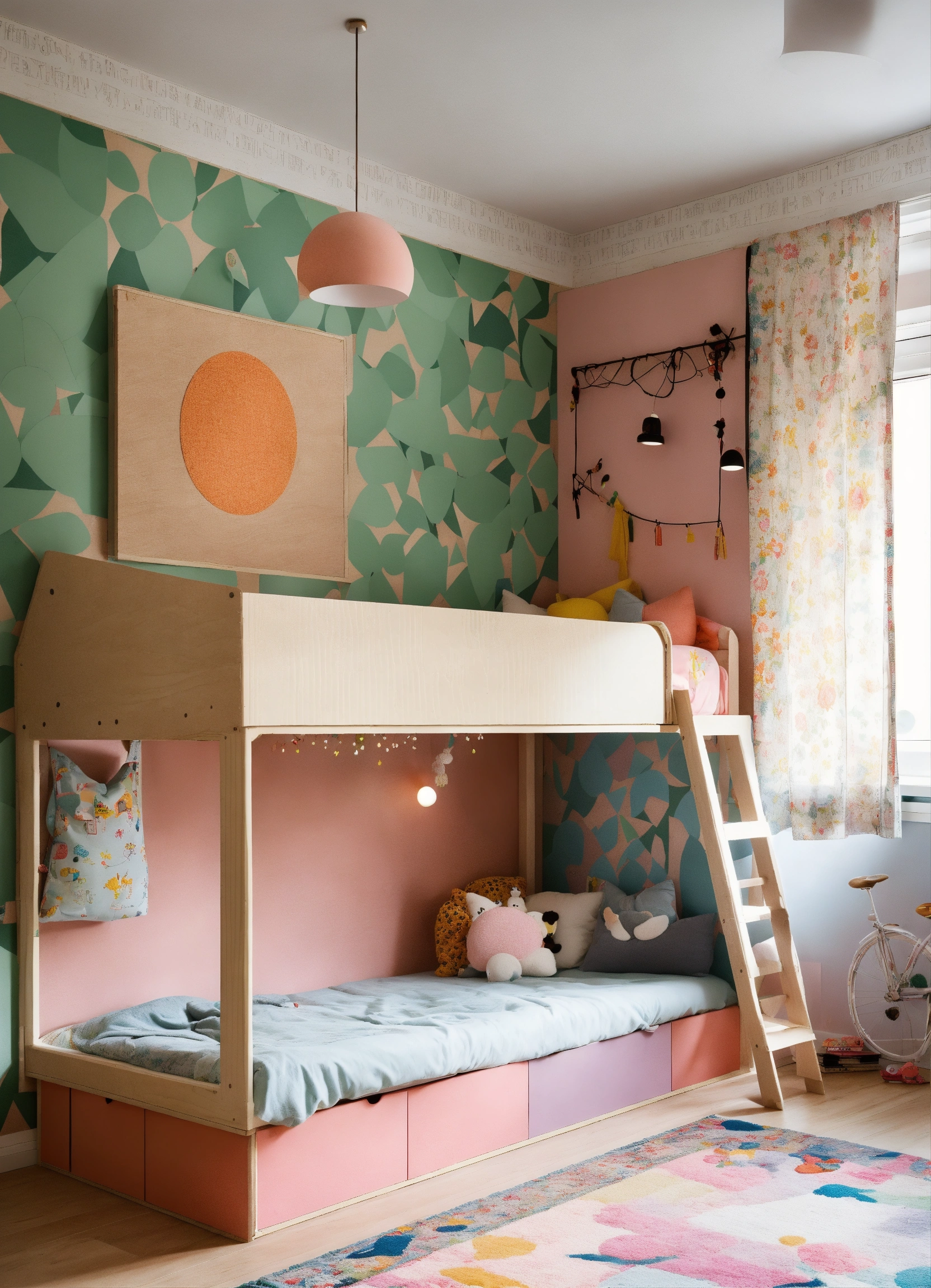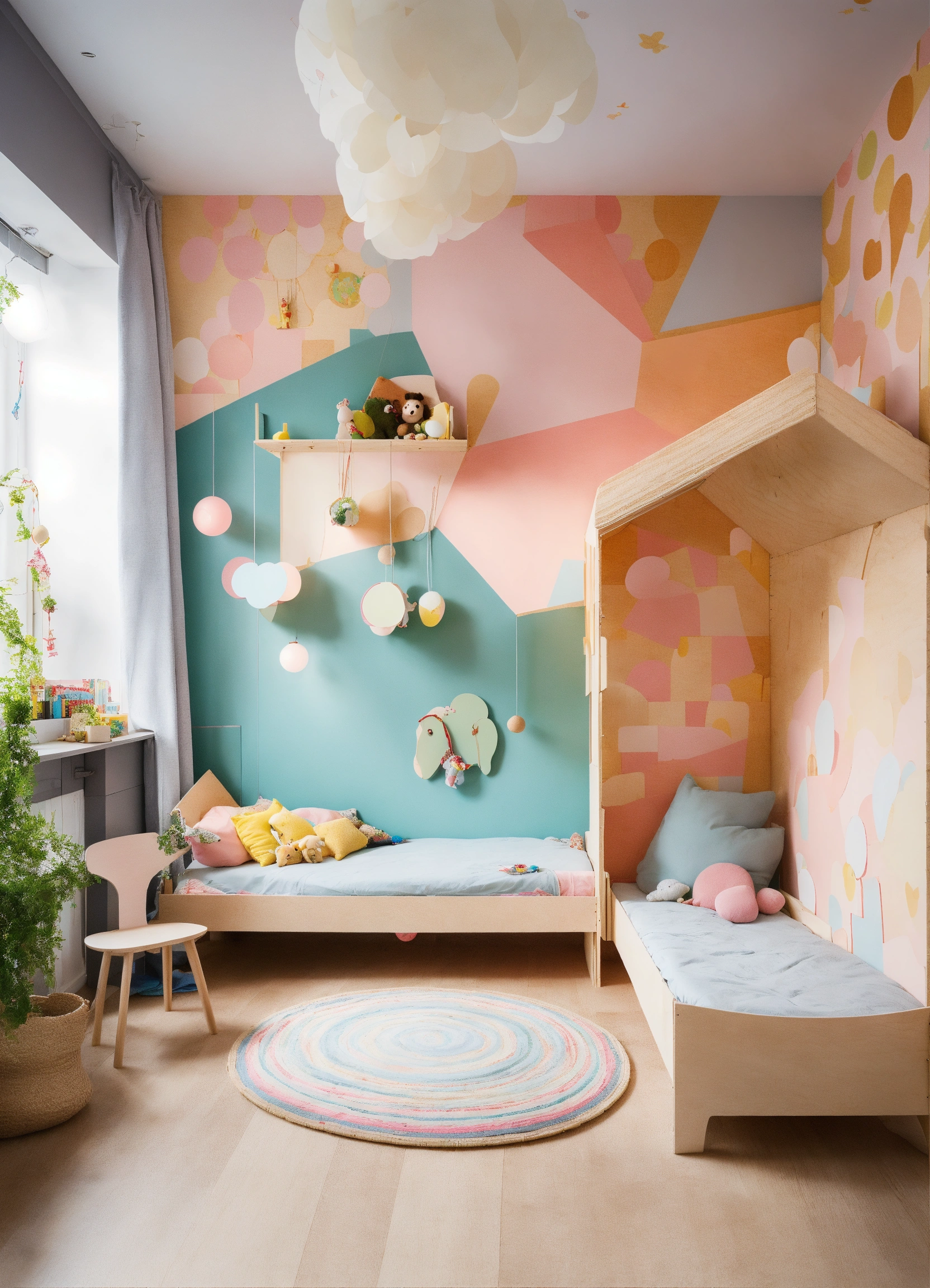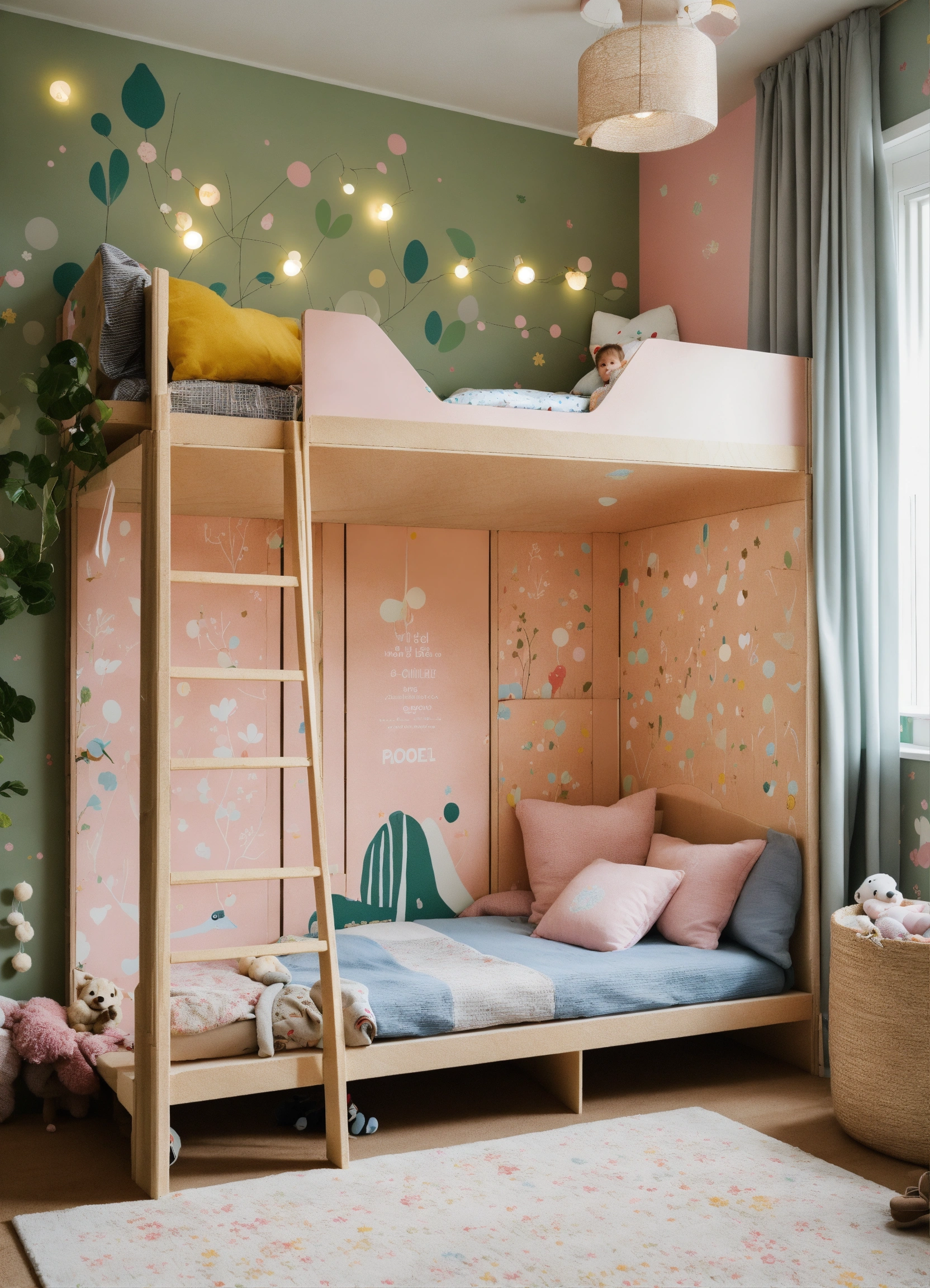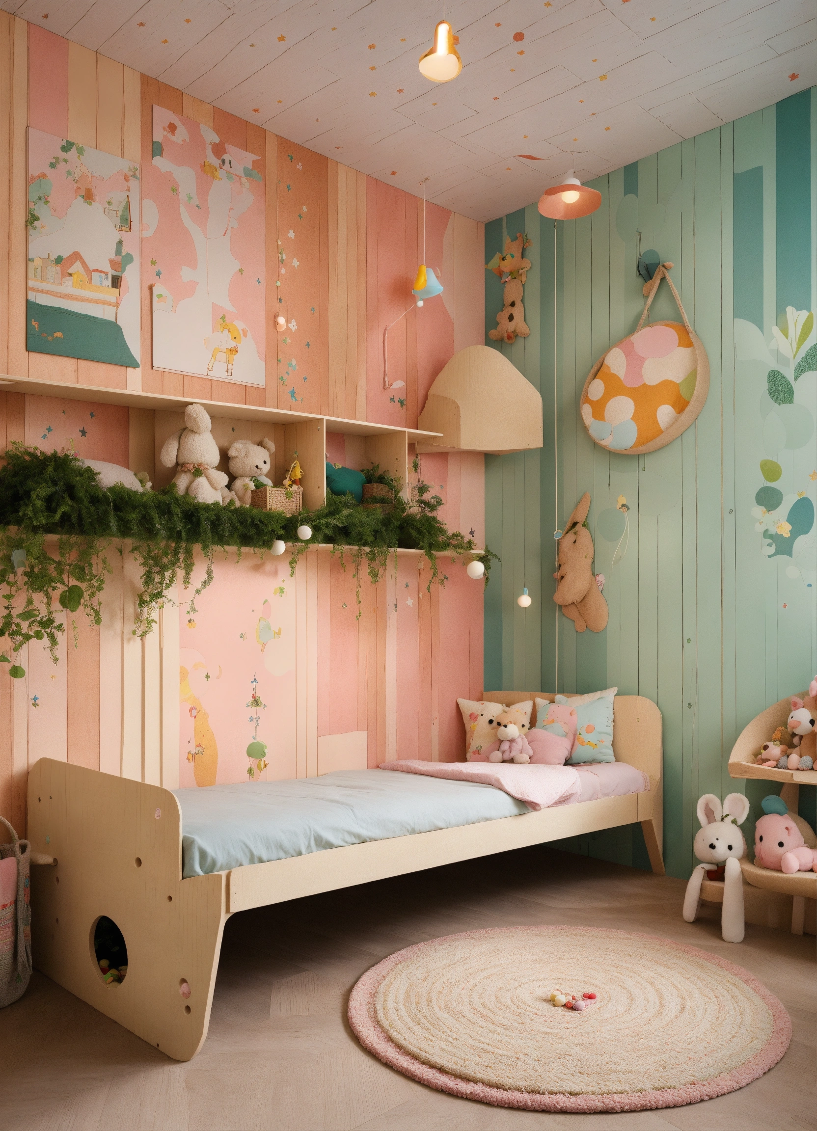 Children's bed made of plywood, it grows with the child and expands to suit his growth, stylish and eco-friendly, like ikea furniture make the walls in pastel colors, use magical children's wallpaper and children's wall decor