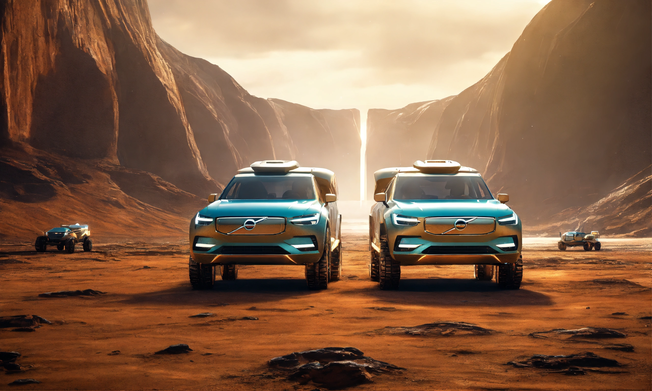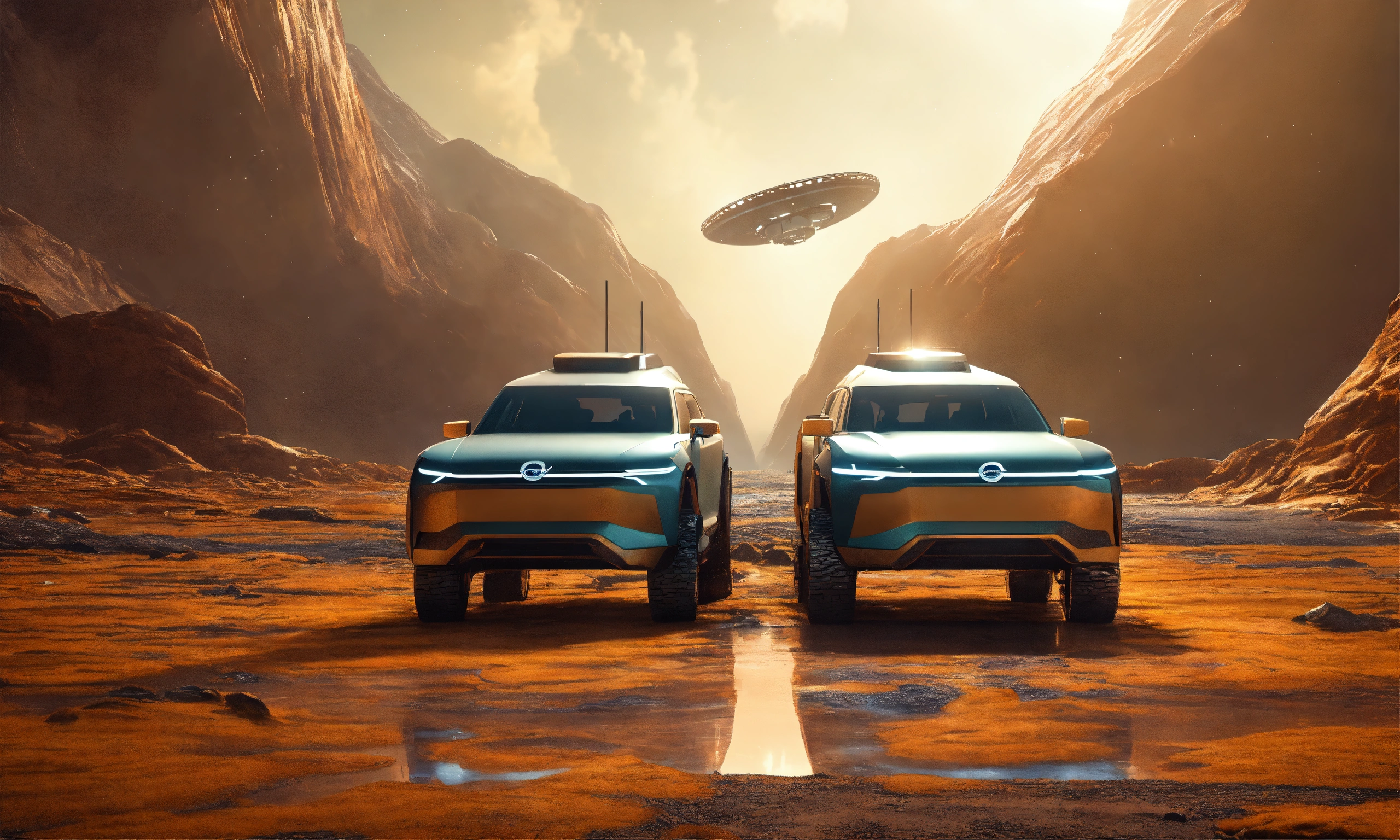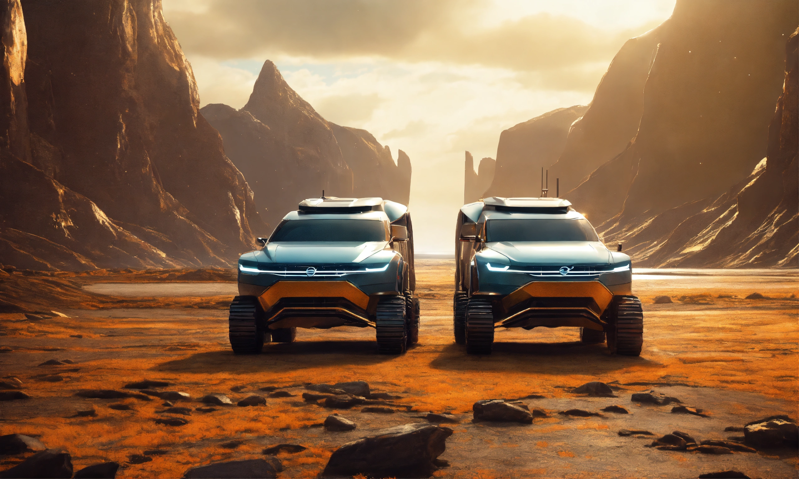 two volvo spaceships that's inspired by volvo trucks floating side by side. frontal view. volvo truck spaceships. two. front view of 2 volvo articulated trucks in a futuristic alien landscape, photorealistic light. floating beside each other and insync, frontal-flat view. a cinematic image. sci-fi.