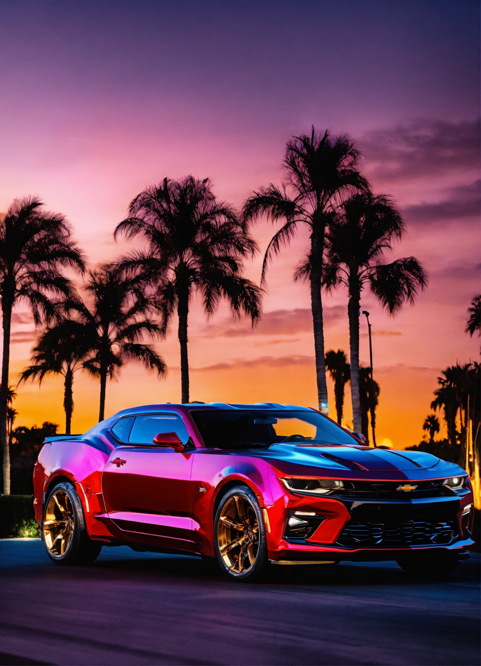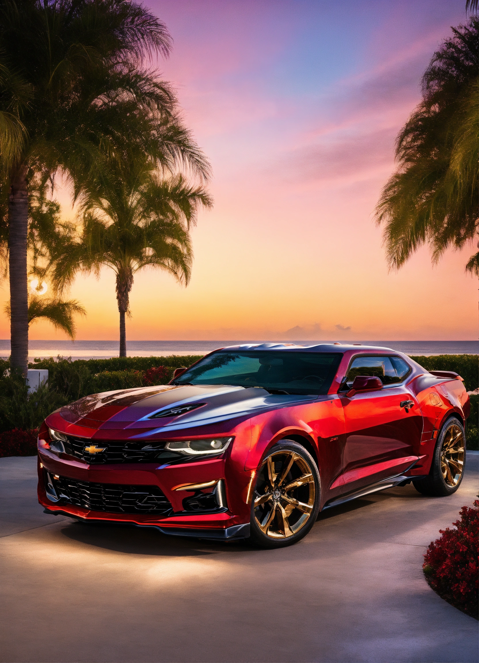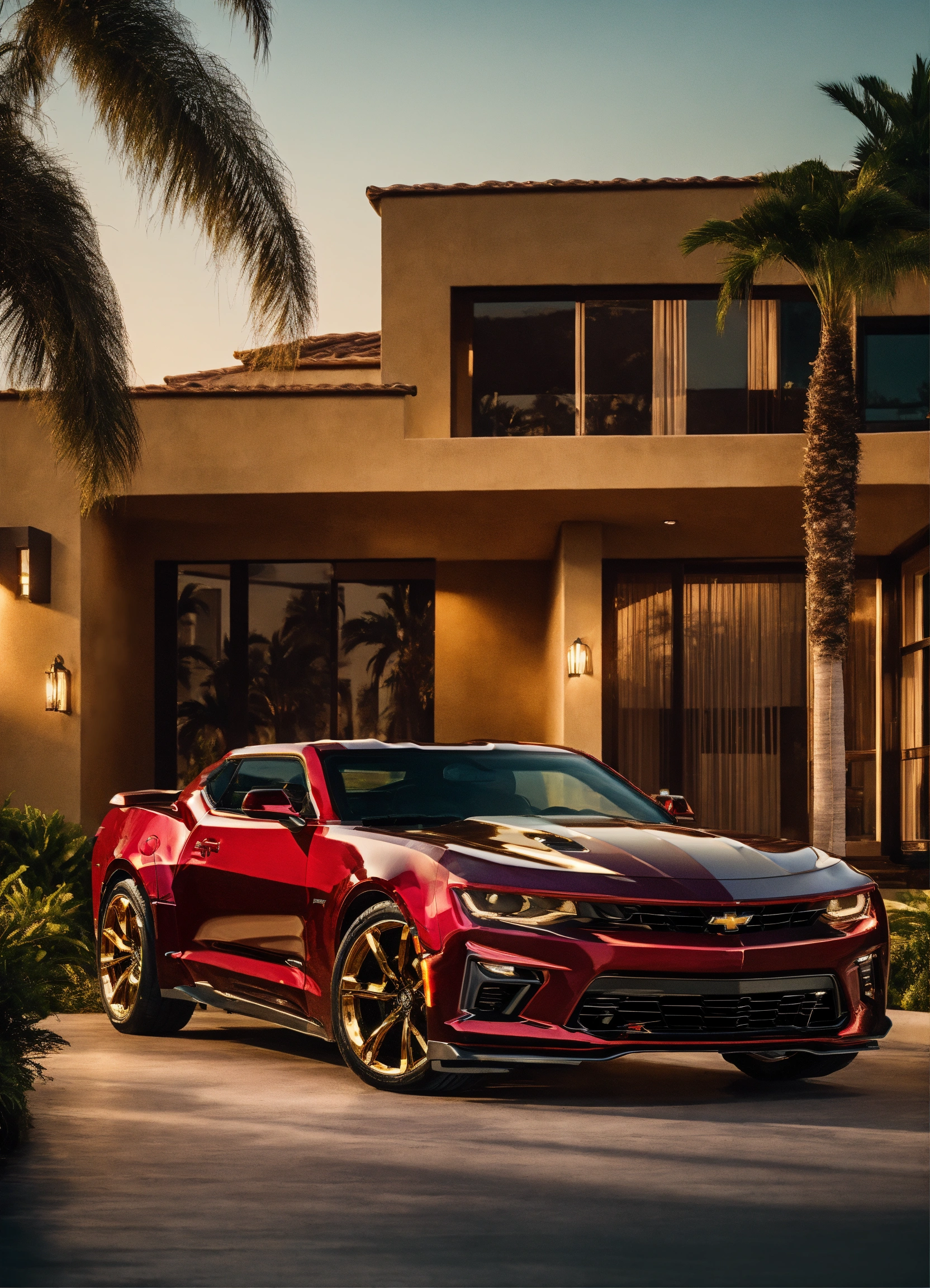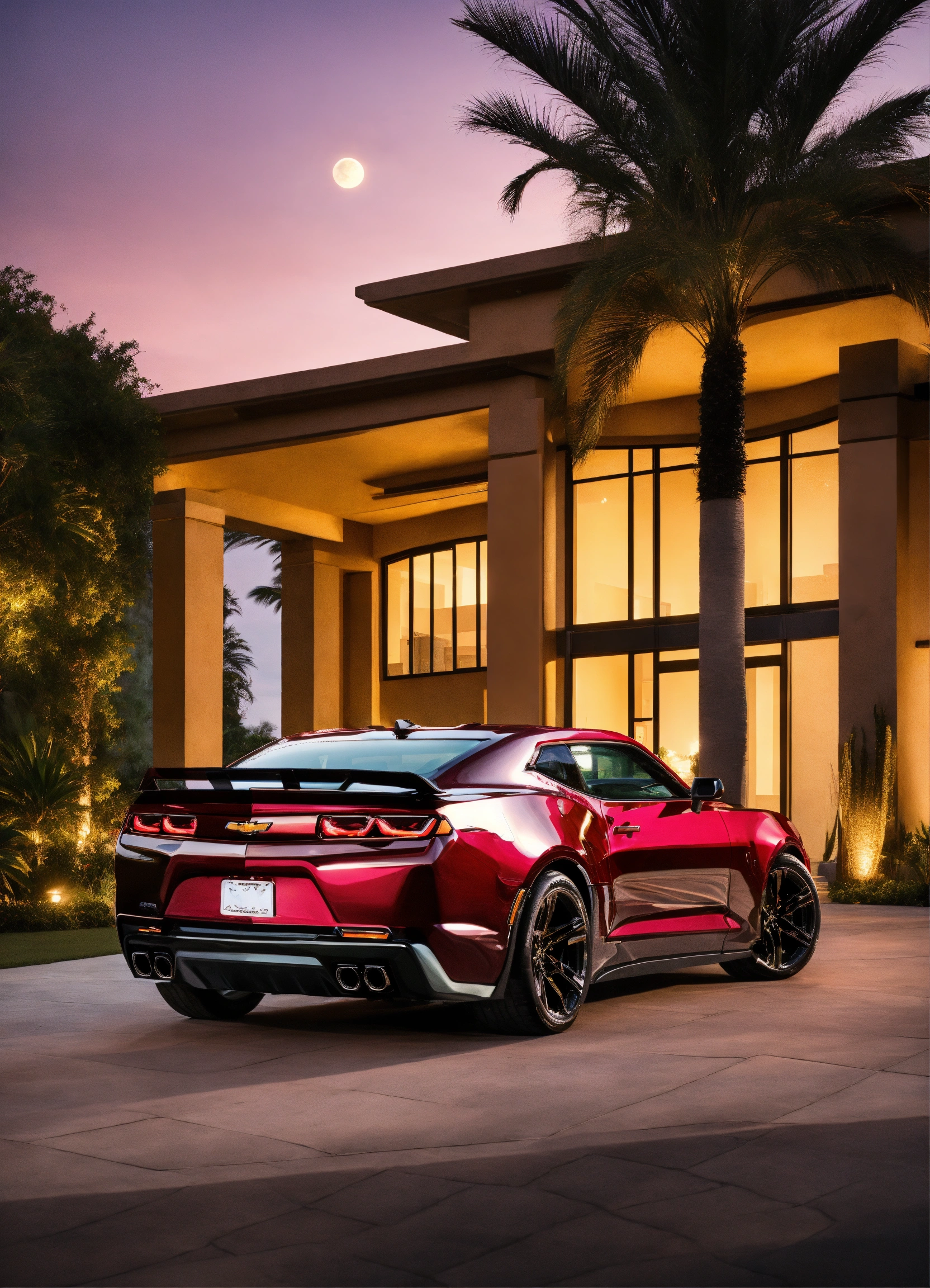 2023 chevy camaro burgundy and gold trim with modern contemporary mansion with palm trees landscape and golden moonlight background