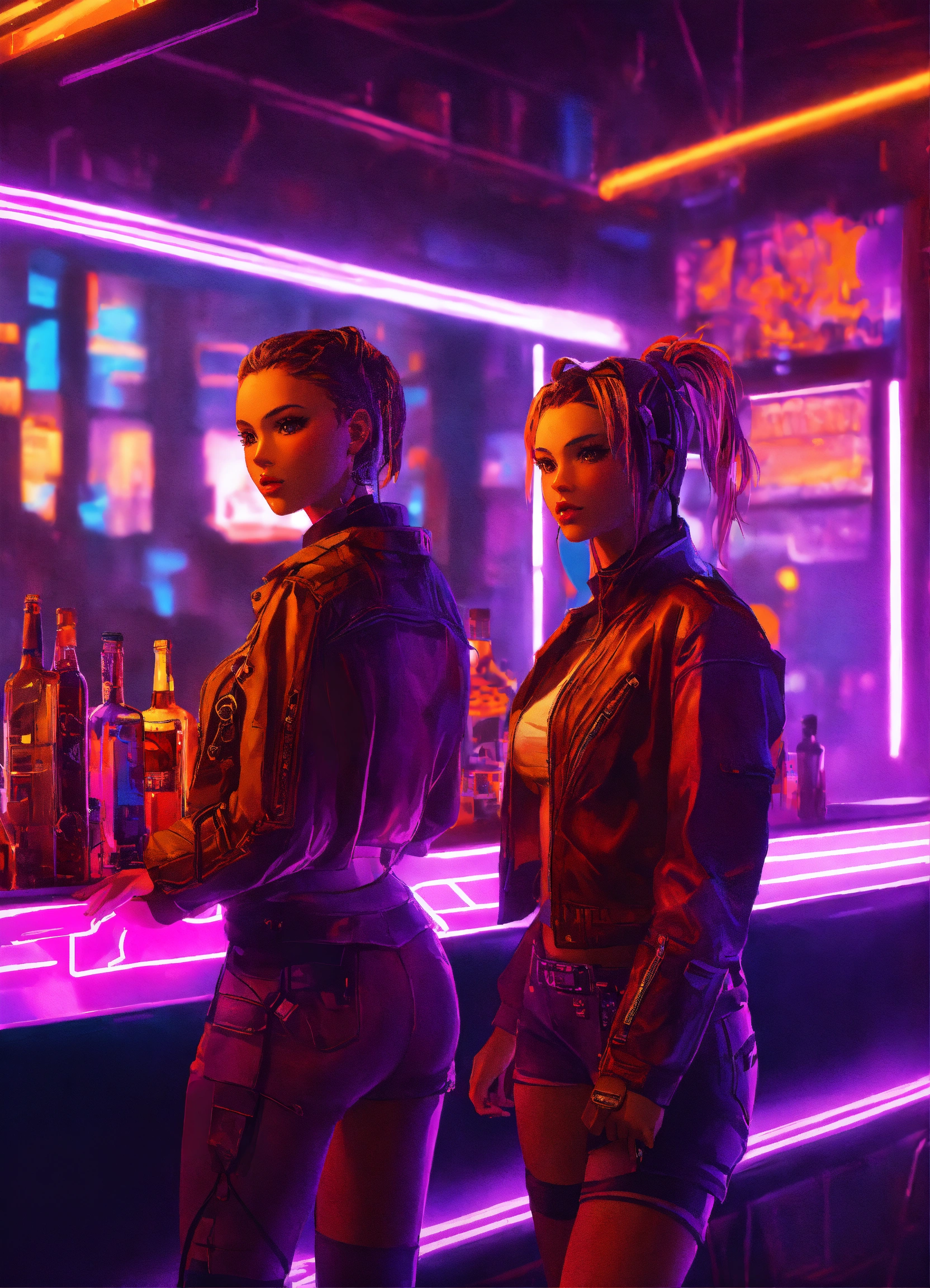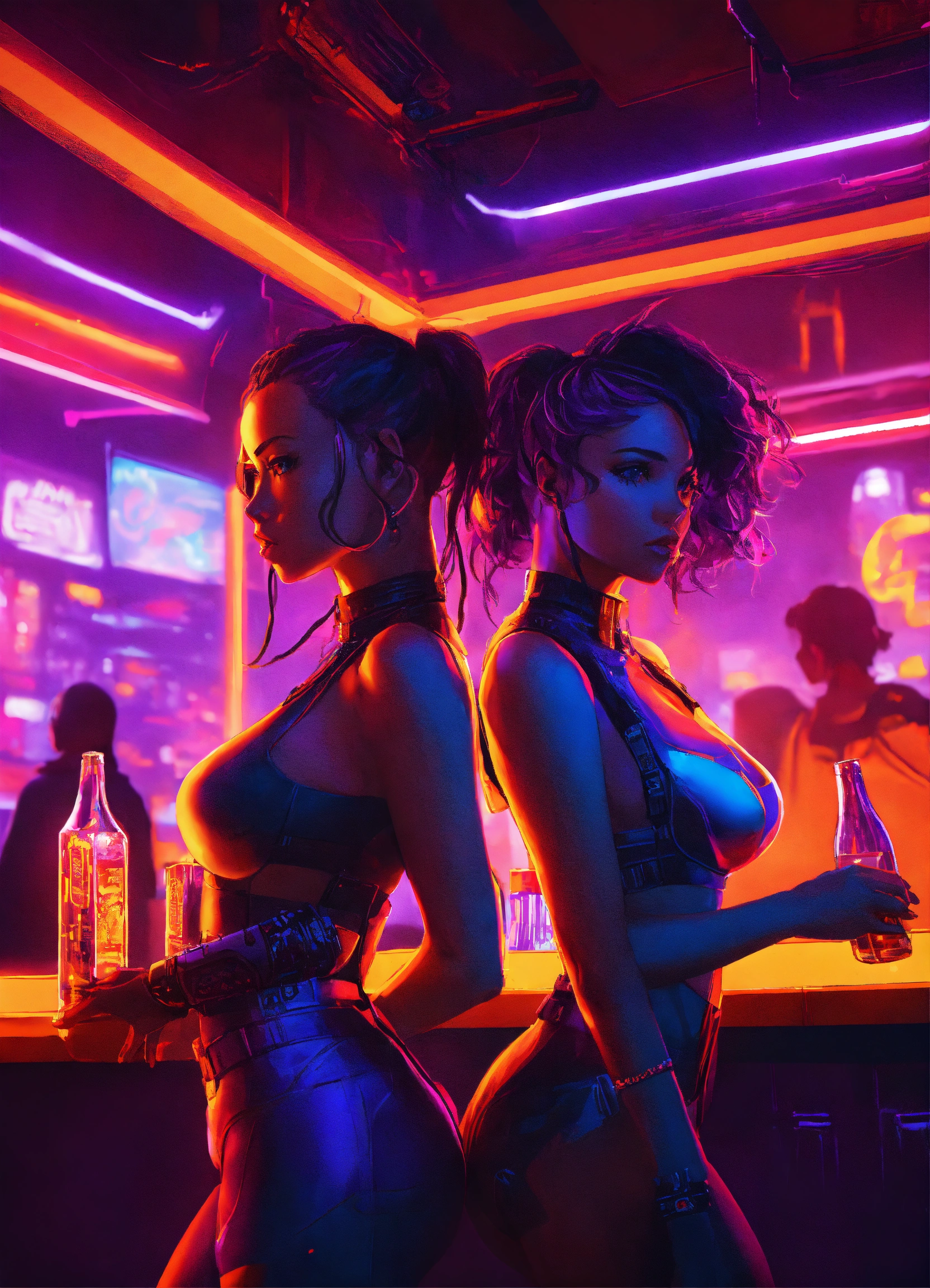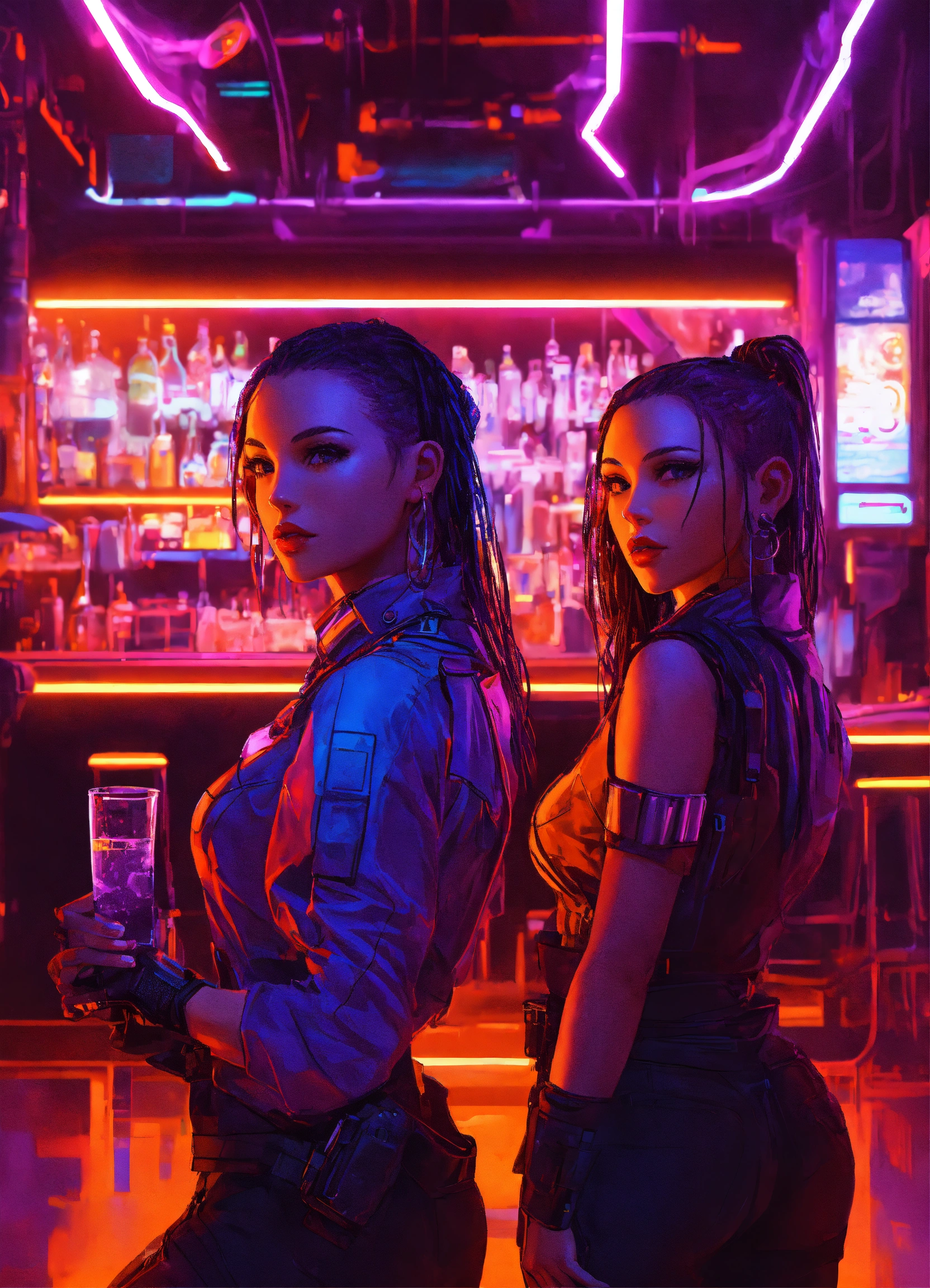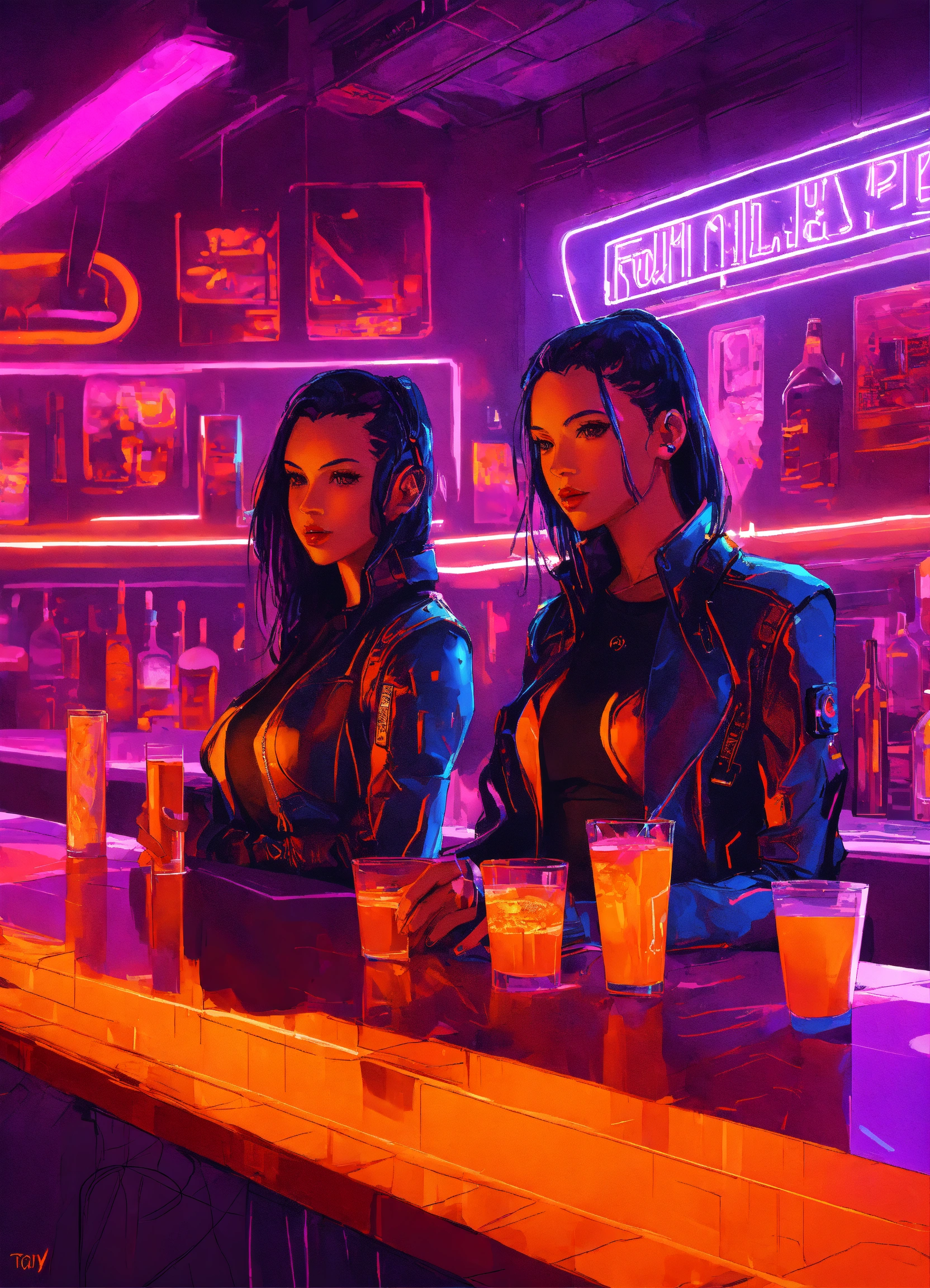Digital art of cyberpunk twin sisters at a futuristic purple and orange neon bar
