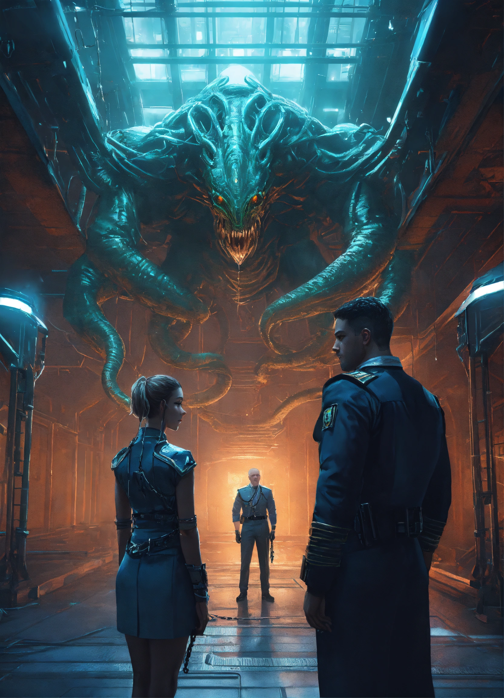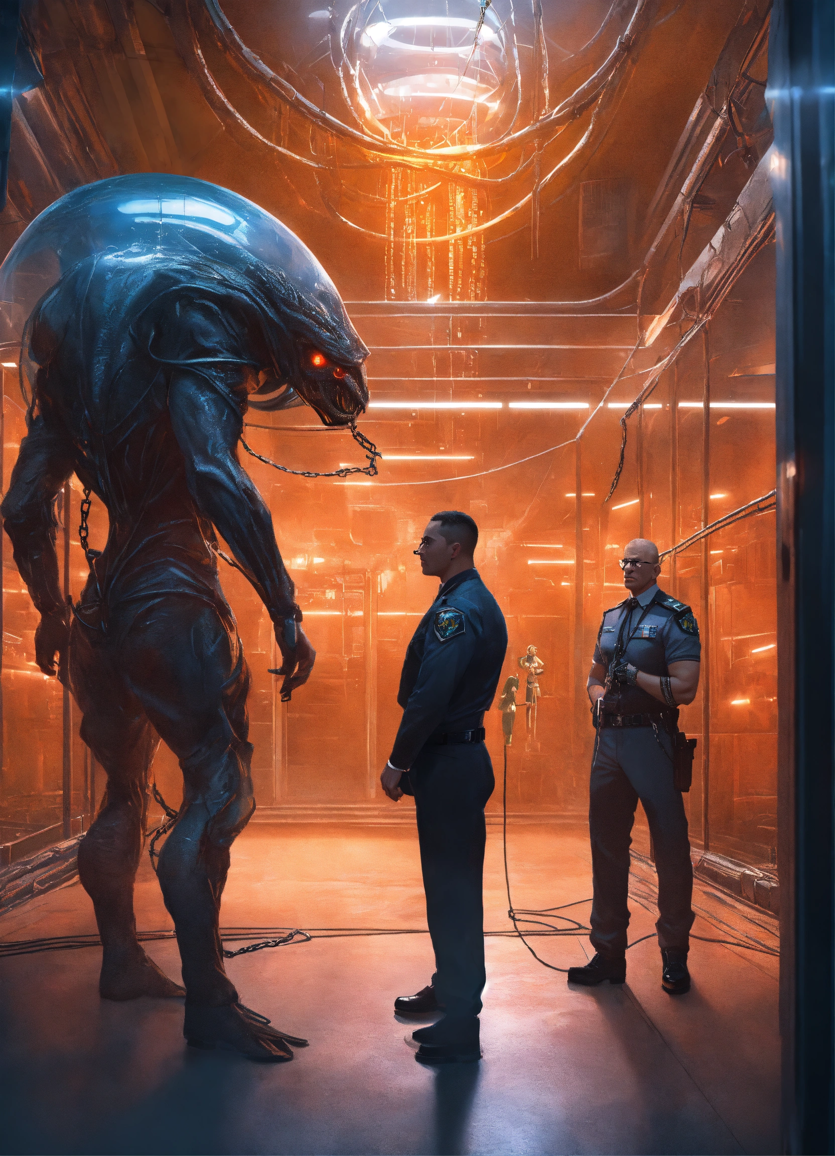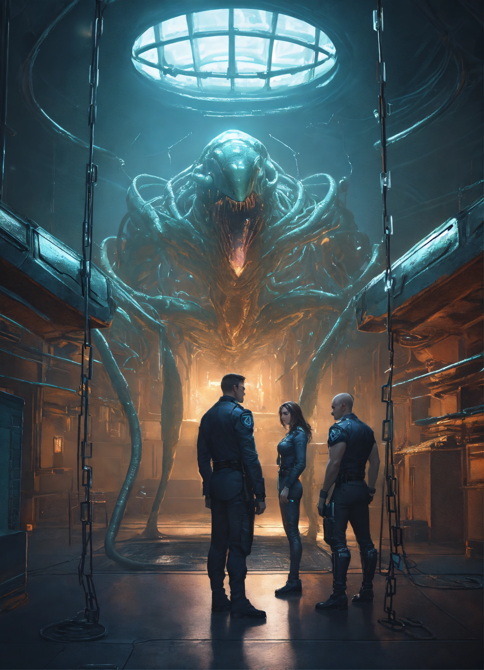 Male and female captives chained inside a futuristic alien prison with glass cells and a huge strong male alien monstrous prison warden watching, fantasy, high detail, realistic photo, high detail, digital painting, cinematic, stunning, hyper-realistic, sharp focus, high resolution 8k, insanely detailed