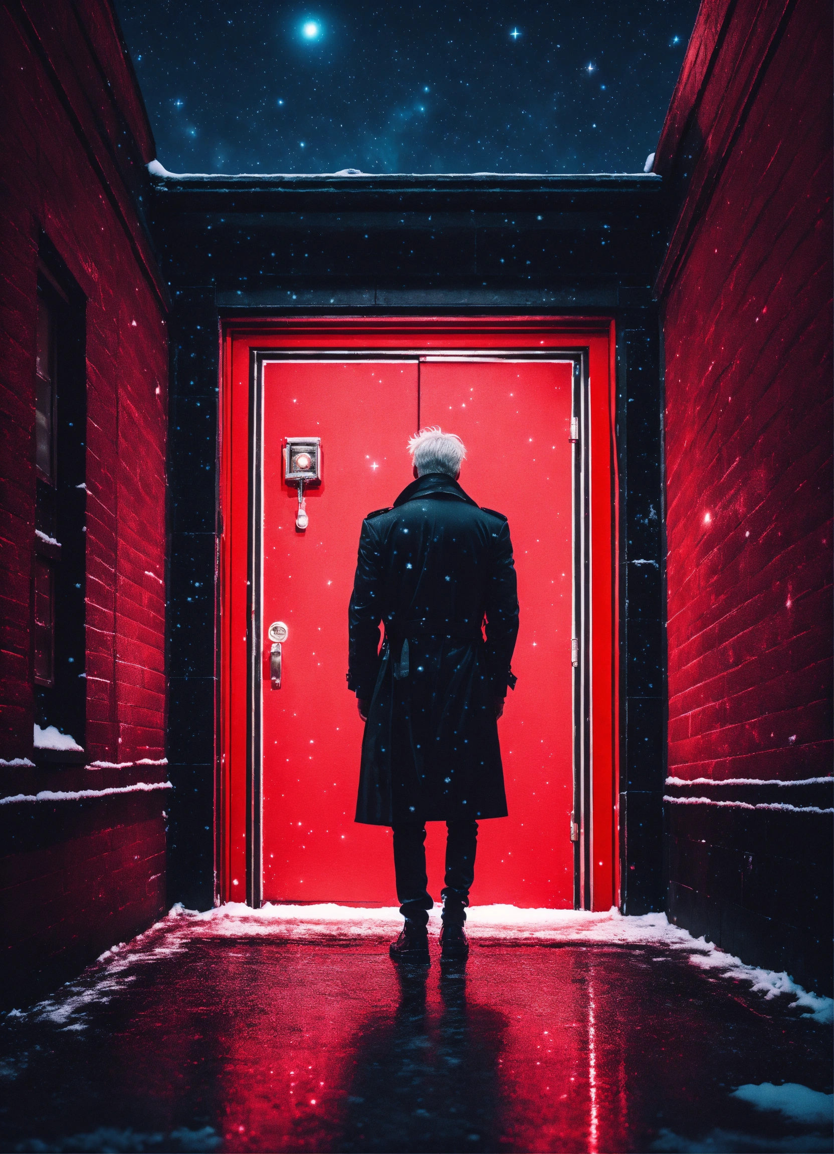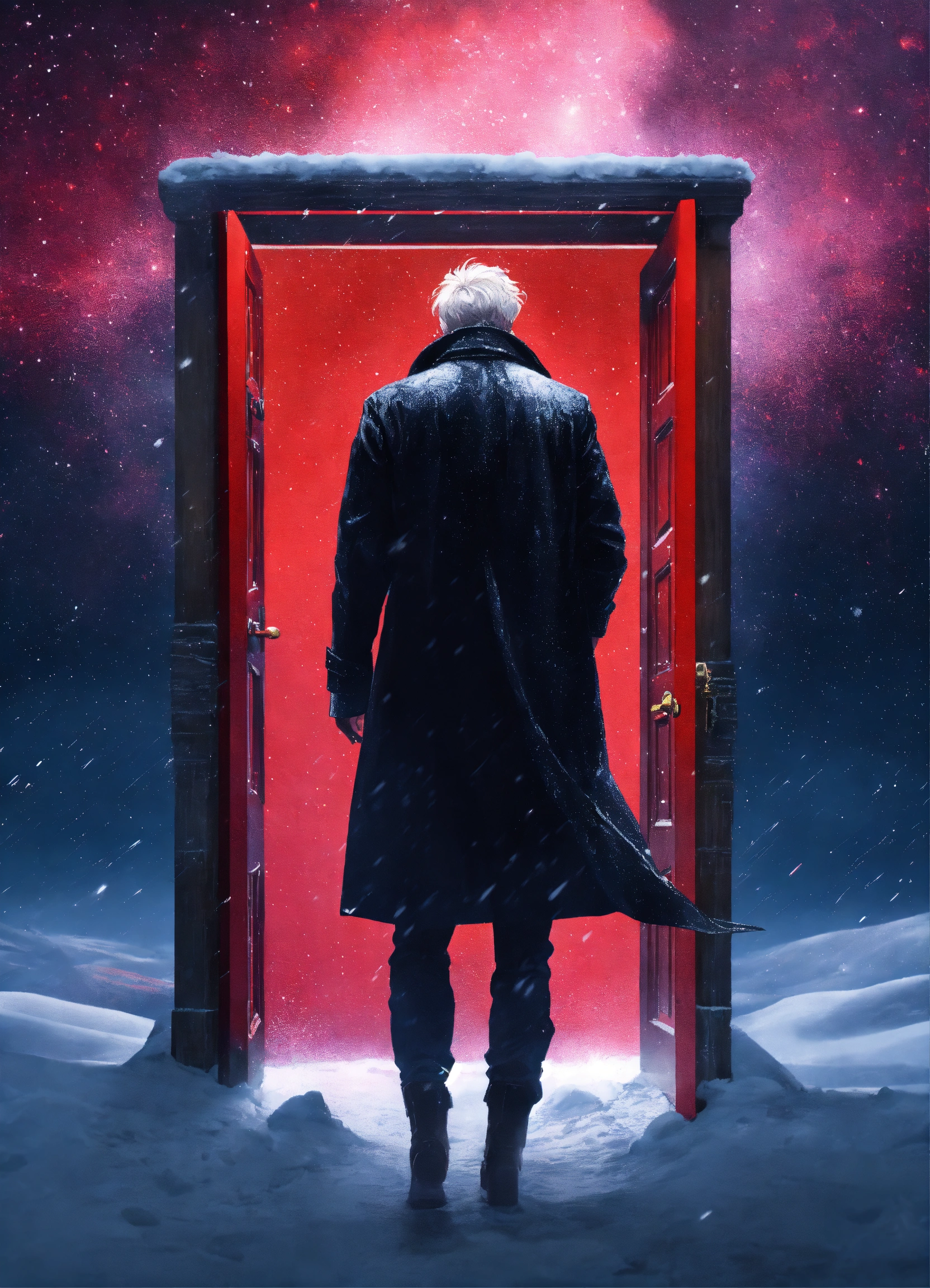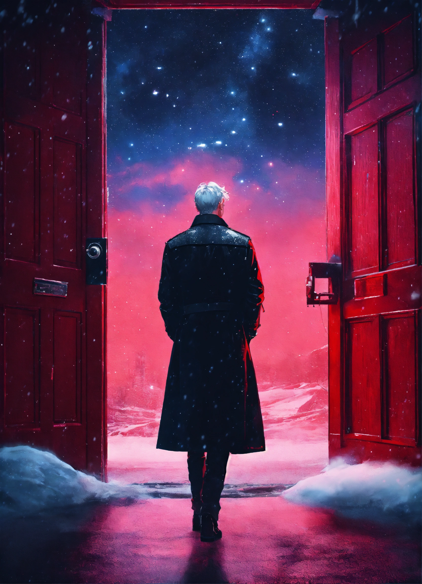 Red door in in the middle of a snowstorm, platinum haired man in black trenchcoat, sky full of stars at night, icepunk, retrowave, distance shot, wallpaper
