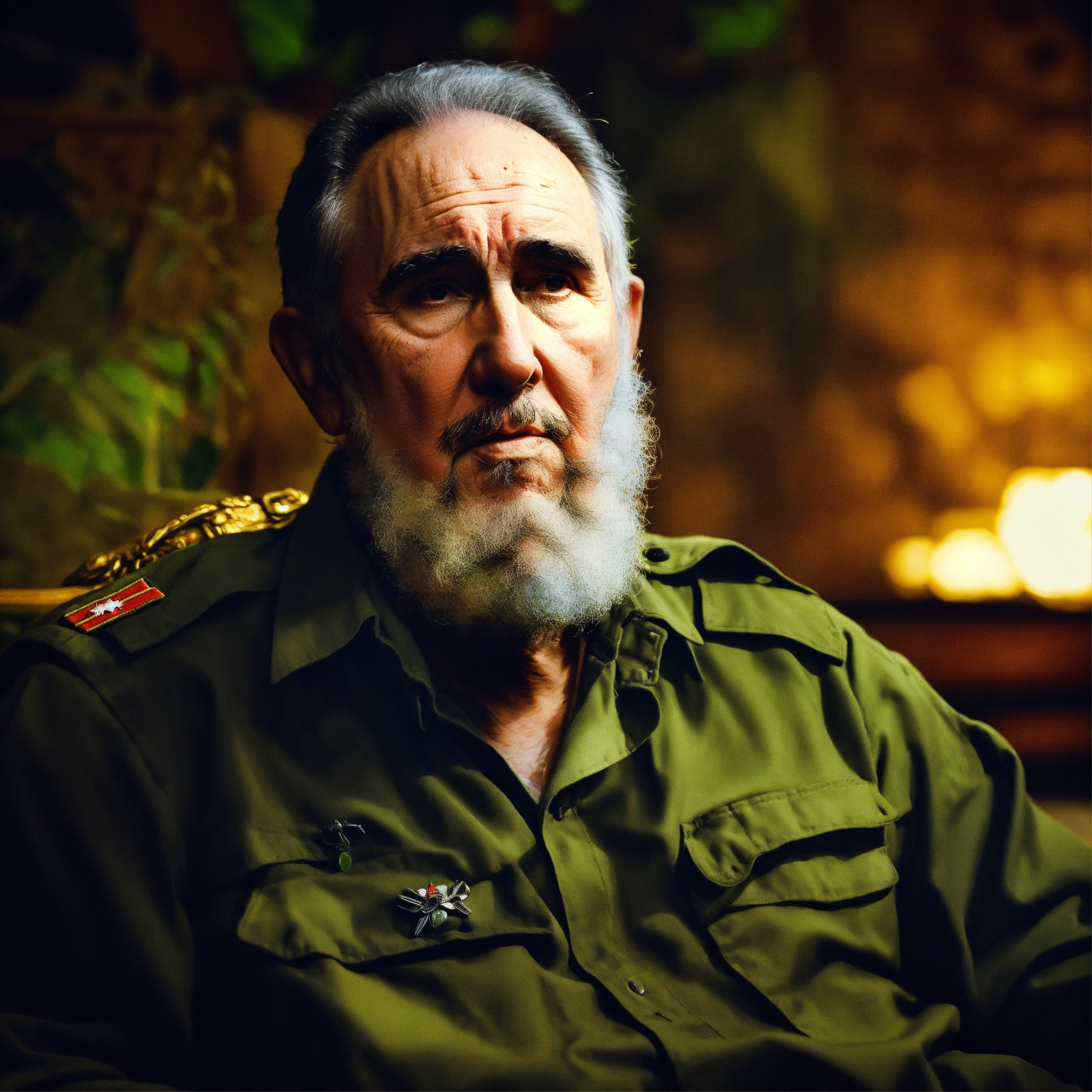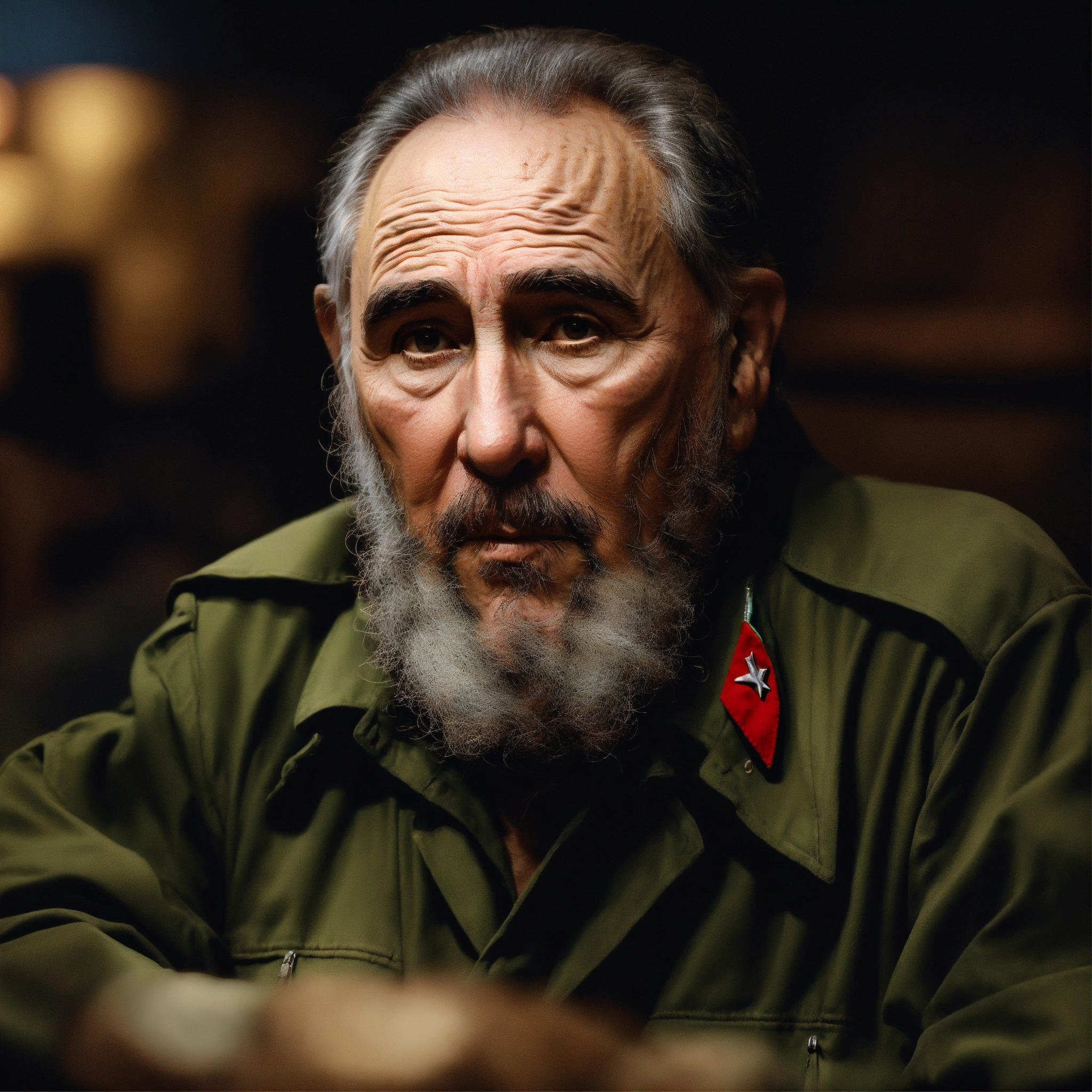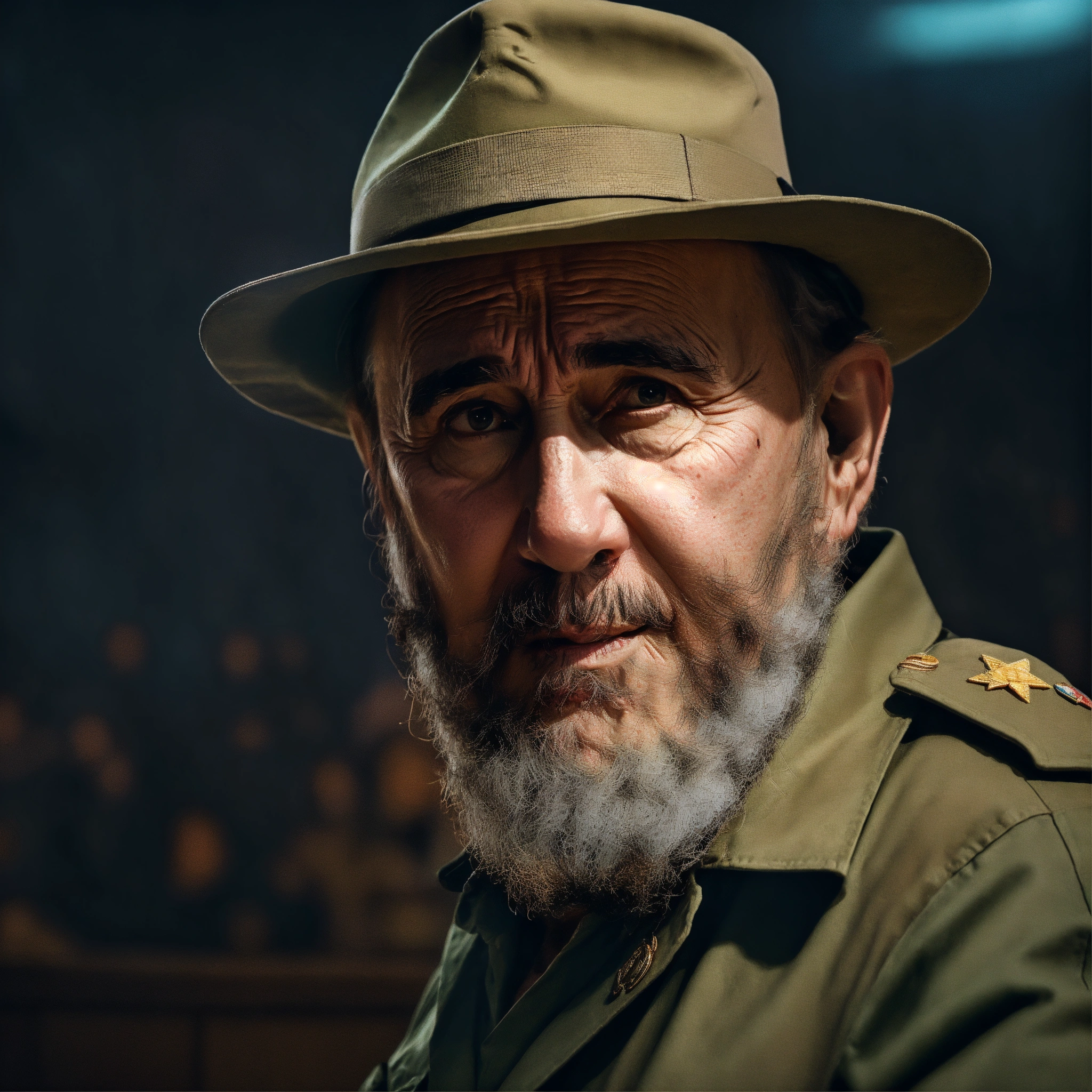 Cara de fidel castro, mirando a la cámara, gesto serio, contraluz intenso, y el fondo totalmente oscuro, 4k, hiperrealismo