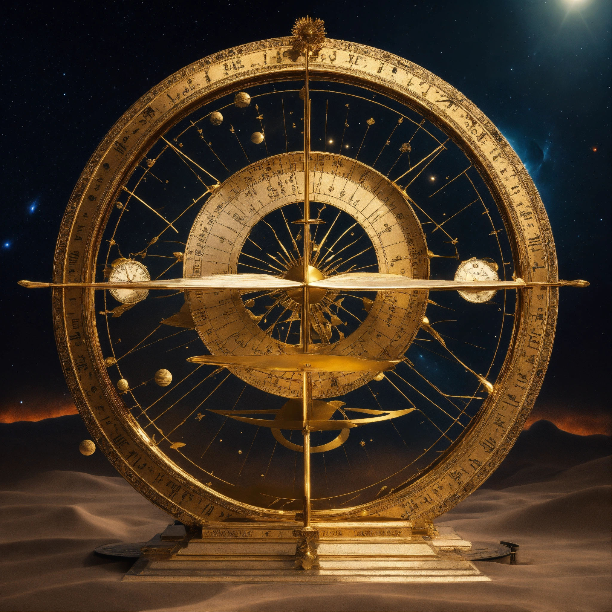 An old fashioned sun dial in space, surreal, artistic, mesmerizing, proportional, centered, floating, gilded, old