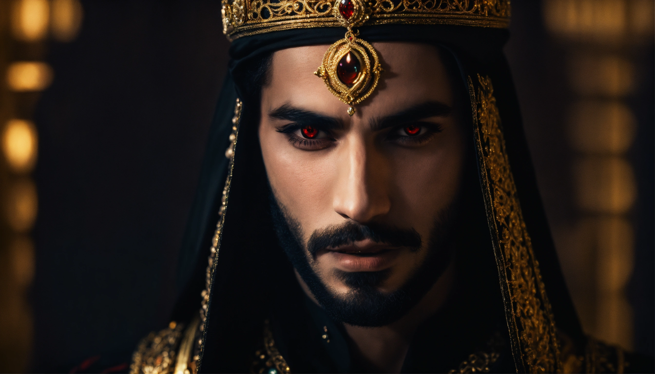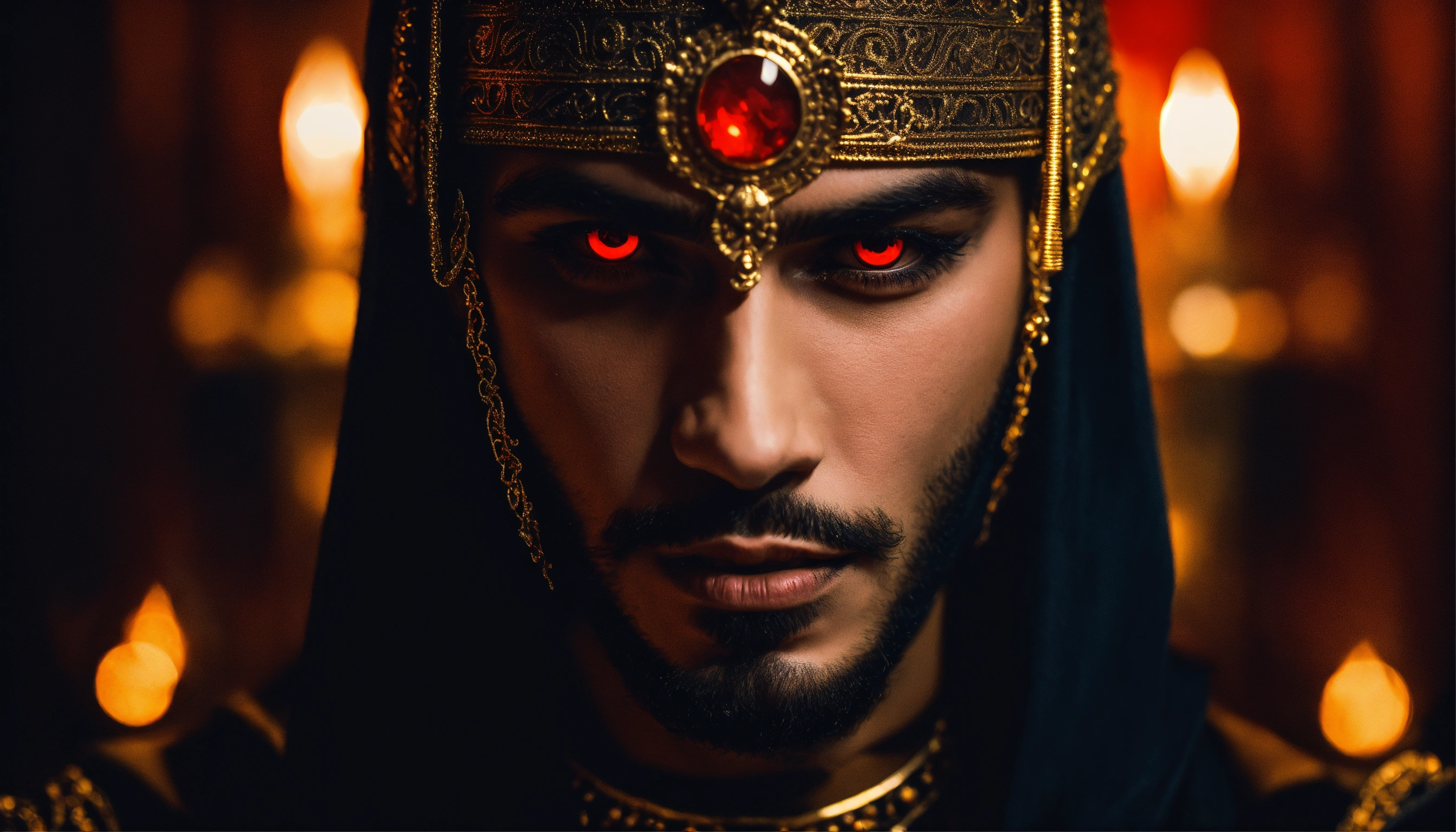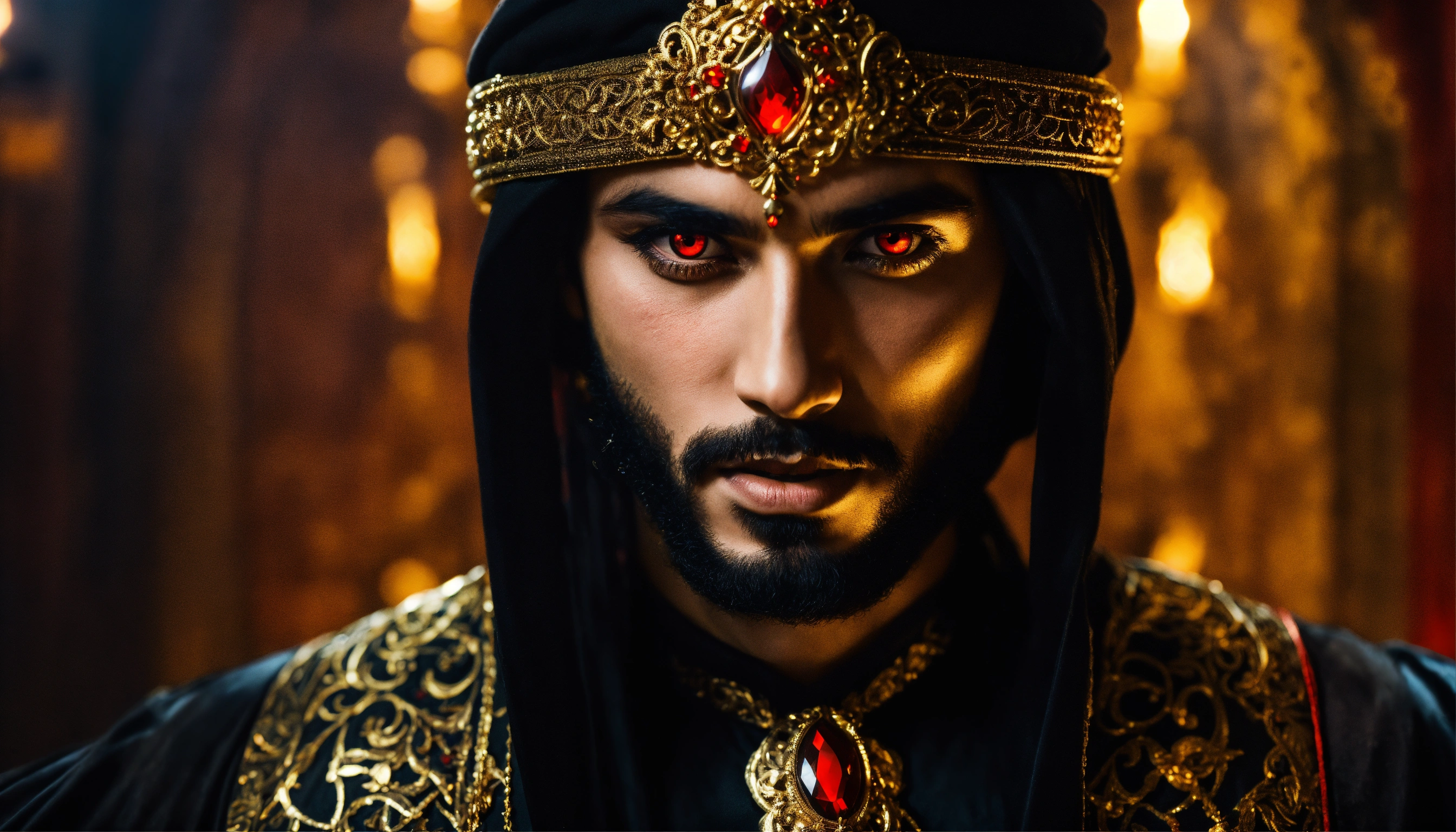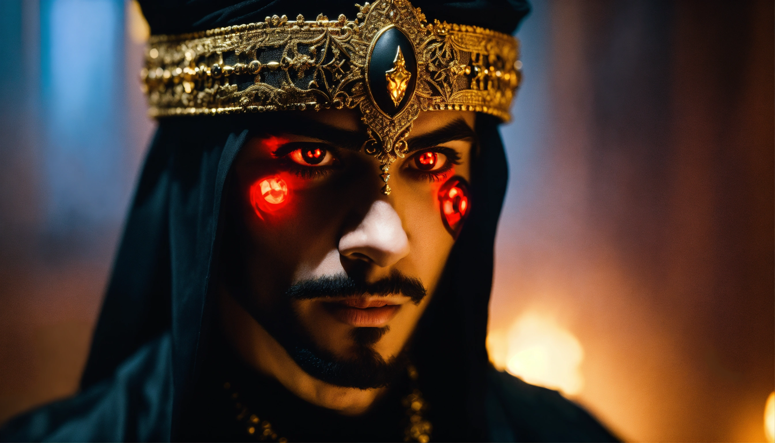 Sinister and dramatic headshot of a young handsome arabic evil sorcerer with hypnotically glowing red eyes wearing black elaborate mystical clothes and gold enchanted jewellery, mesmerising the viewer in a hidden dimly lit chamber.