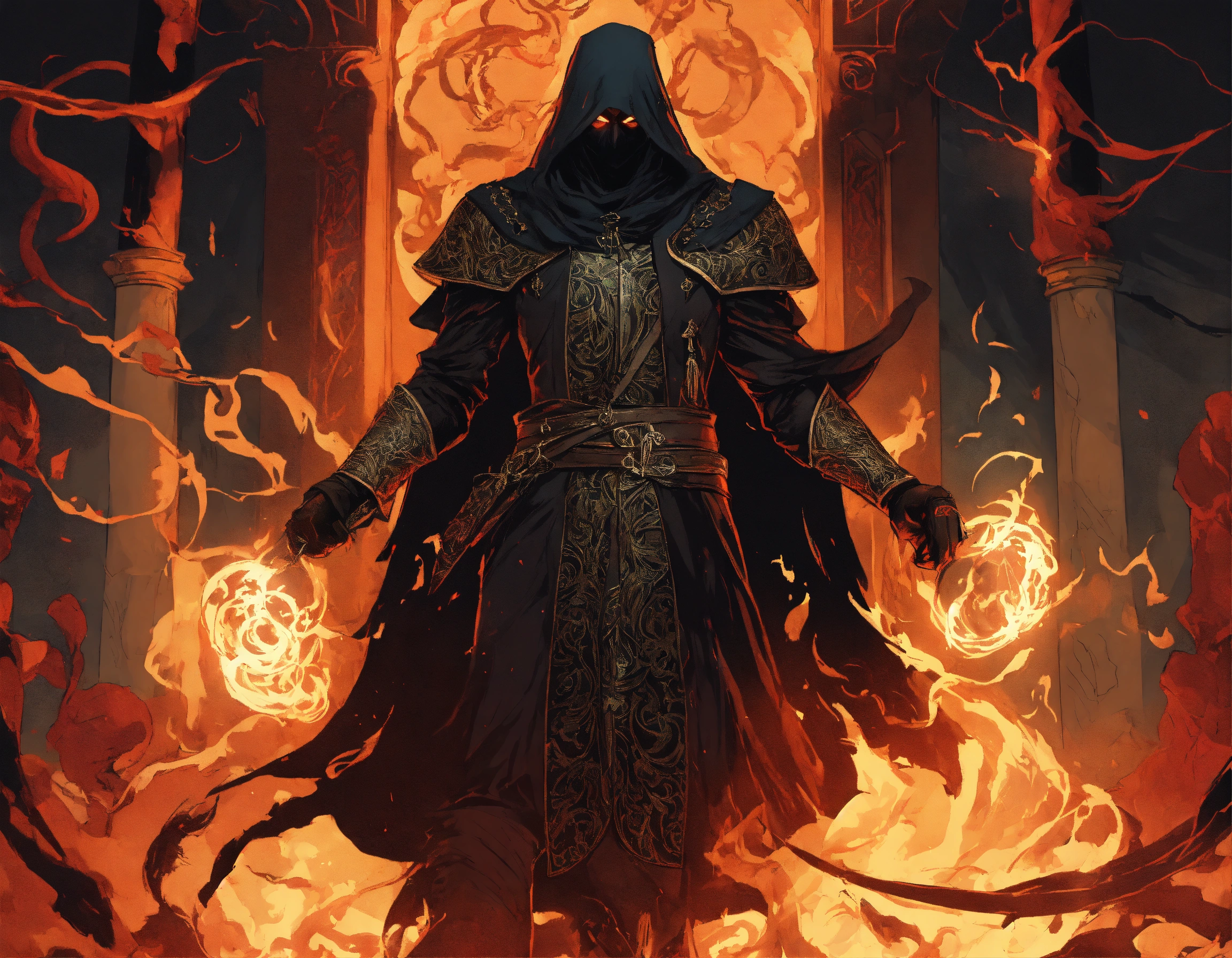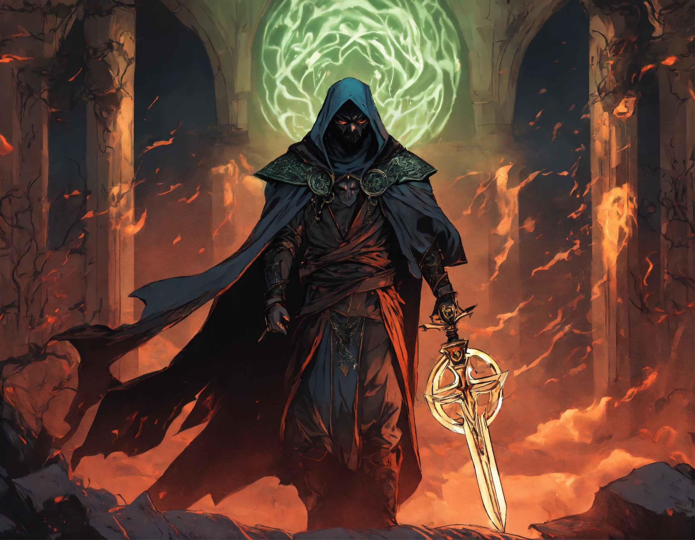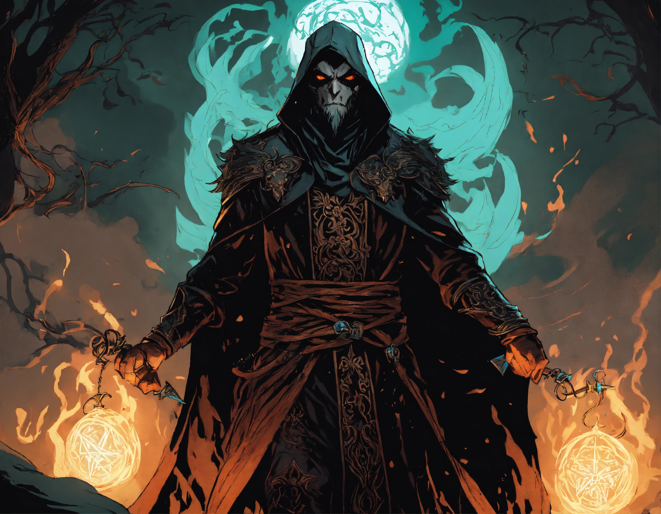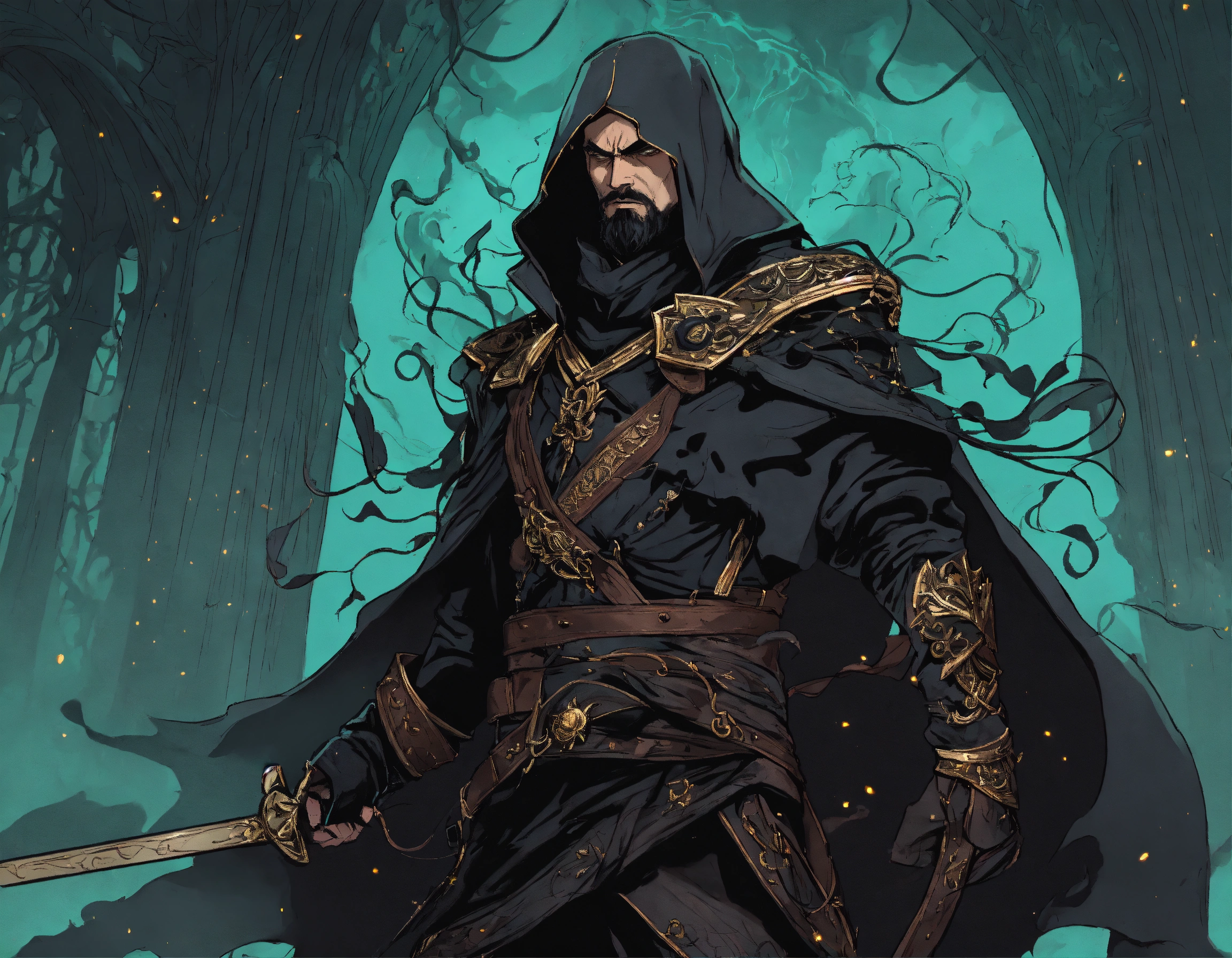 A persian necromancer, enraged, shrouded in dark magic, wearing leather, commanding presence, floating black tendrils, graphic novel art style