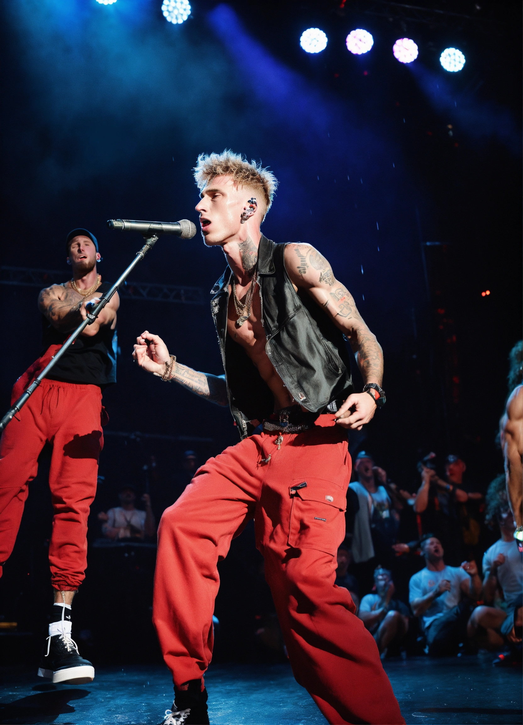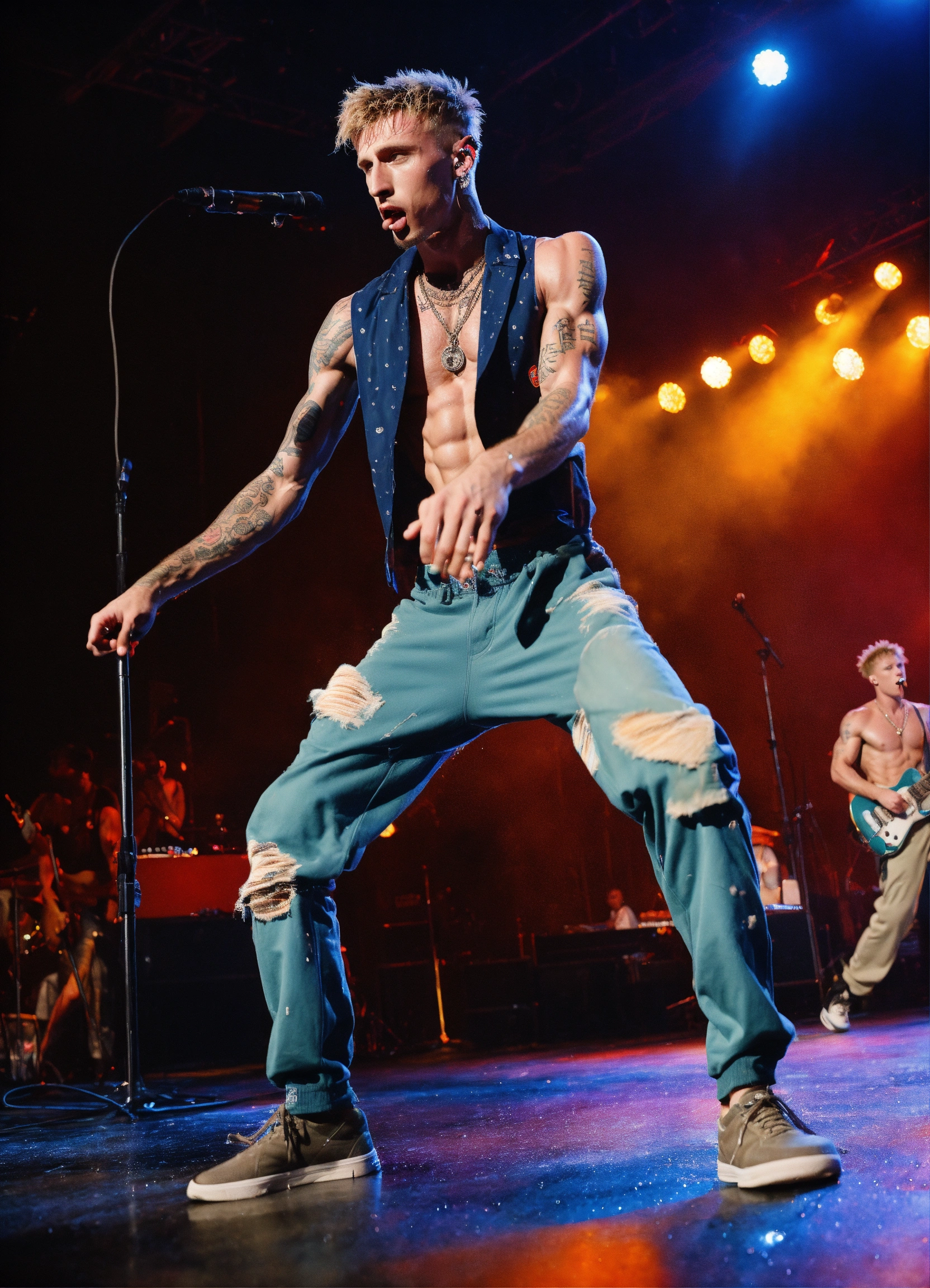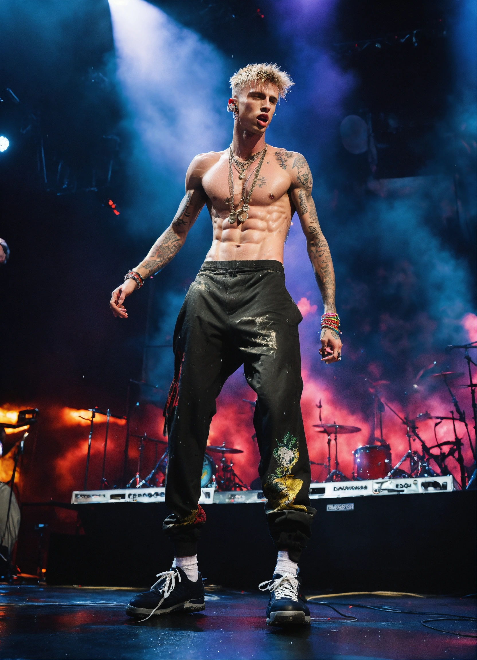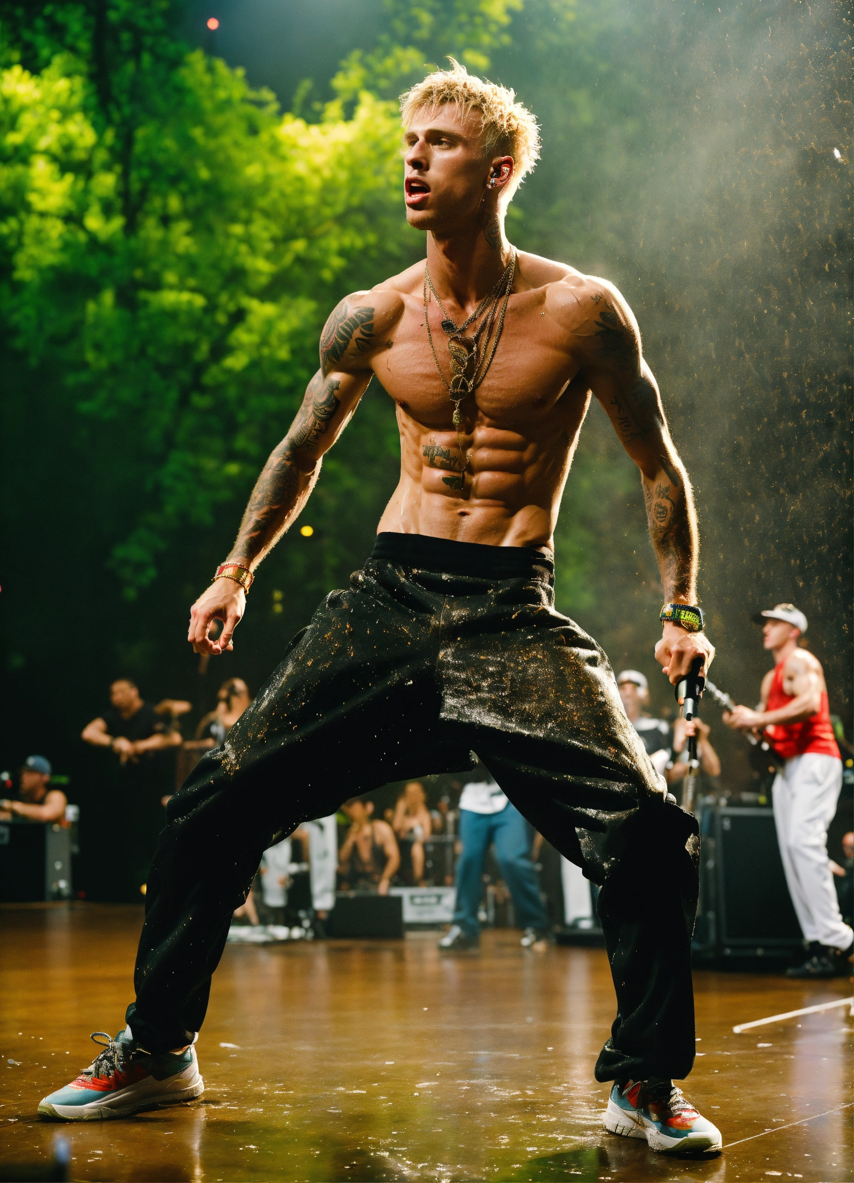 An impressive realistic photo of machine gun kelly performing on stage in baggy pants, muscular physique, sweating, raining, warm day, photographed by bruce weber