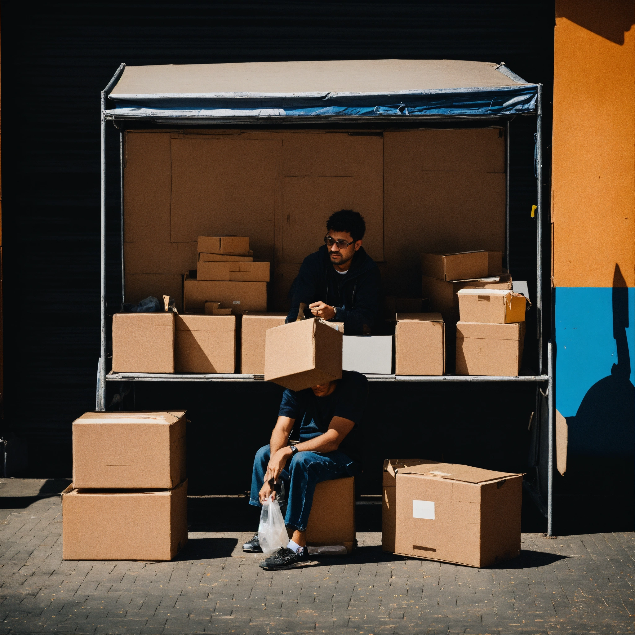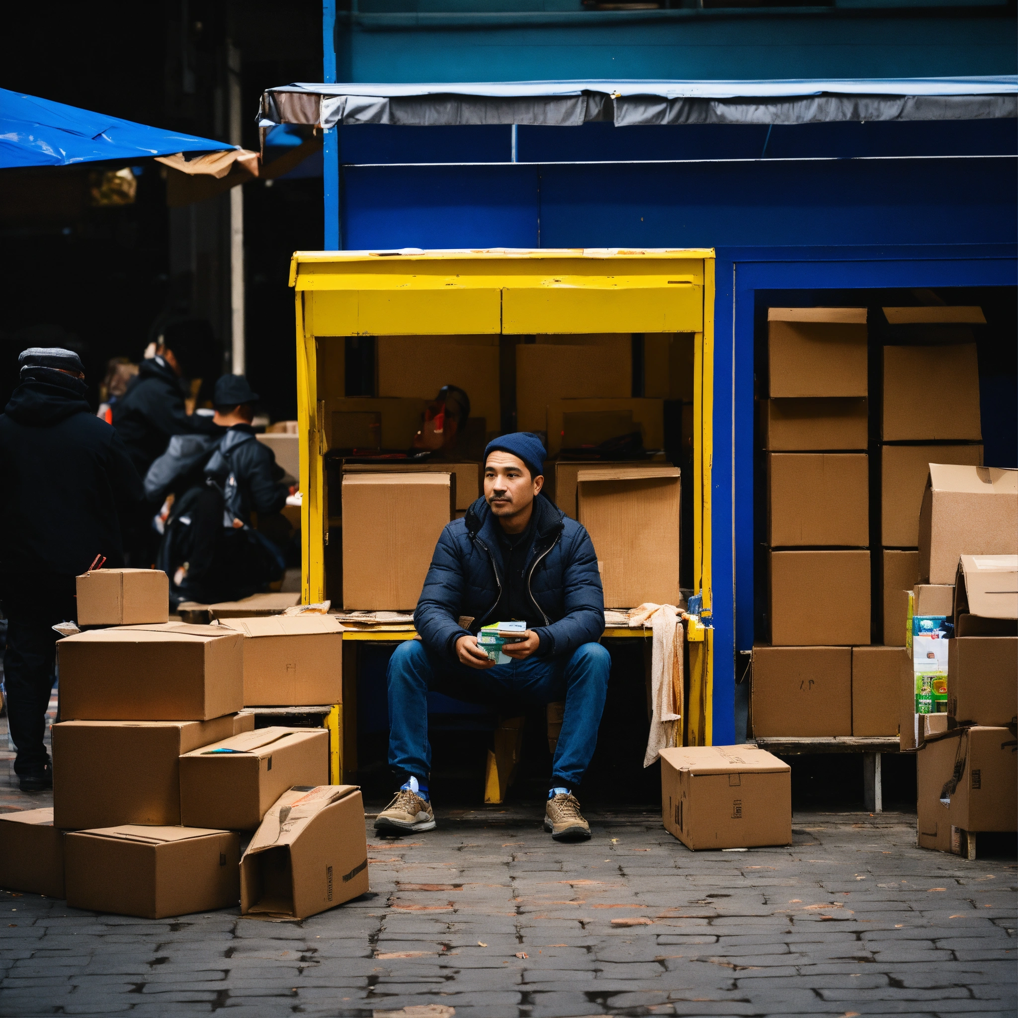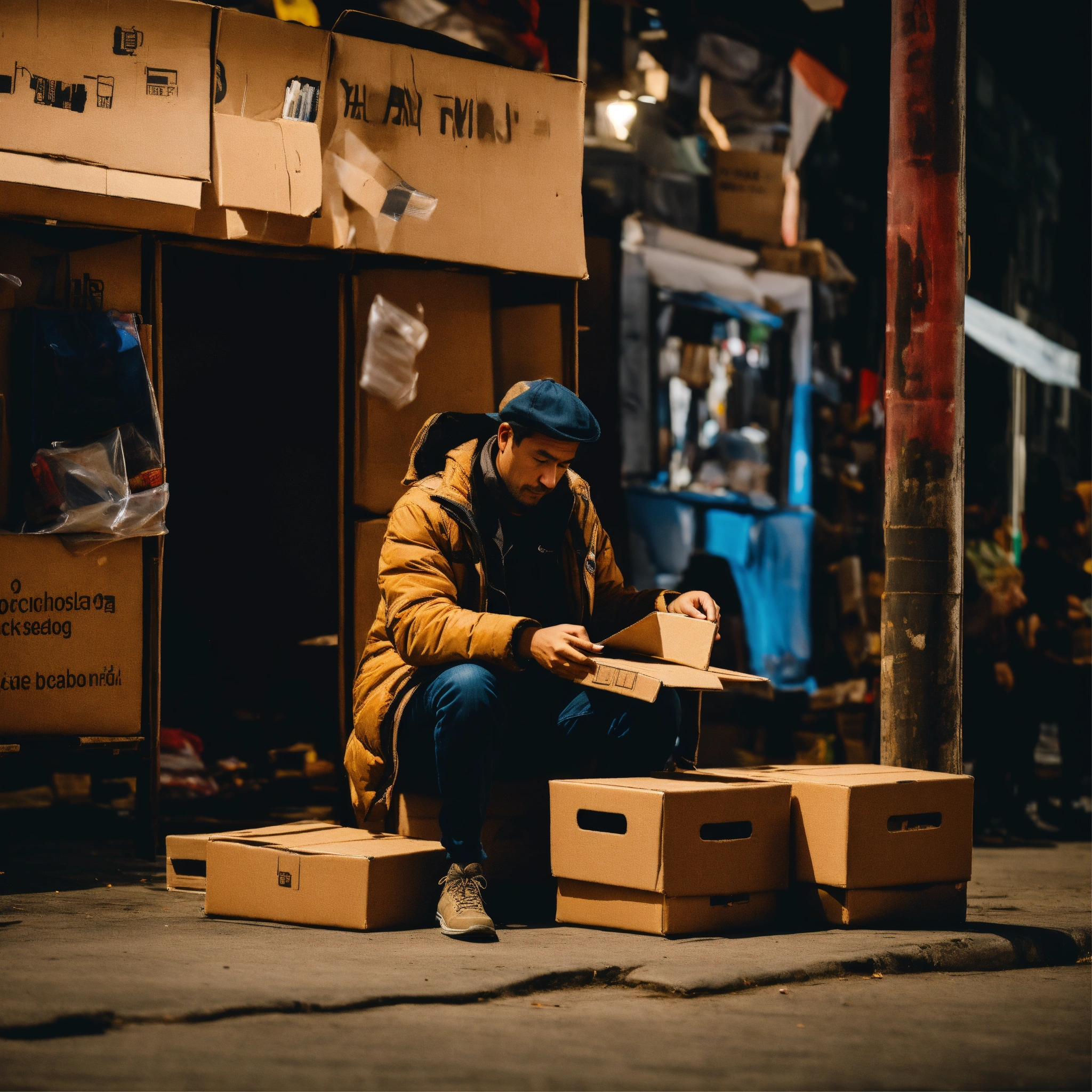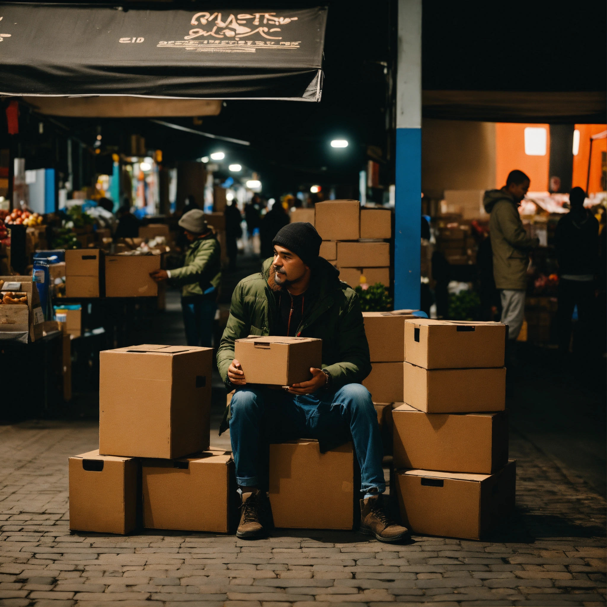 A guy sits at the market and sells various cardboard boxes to people passing by on the black background