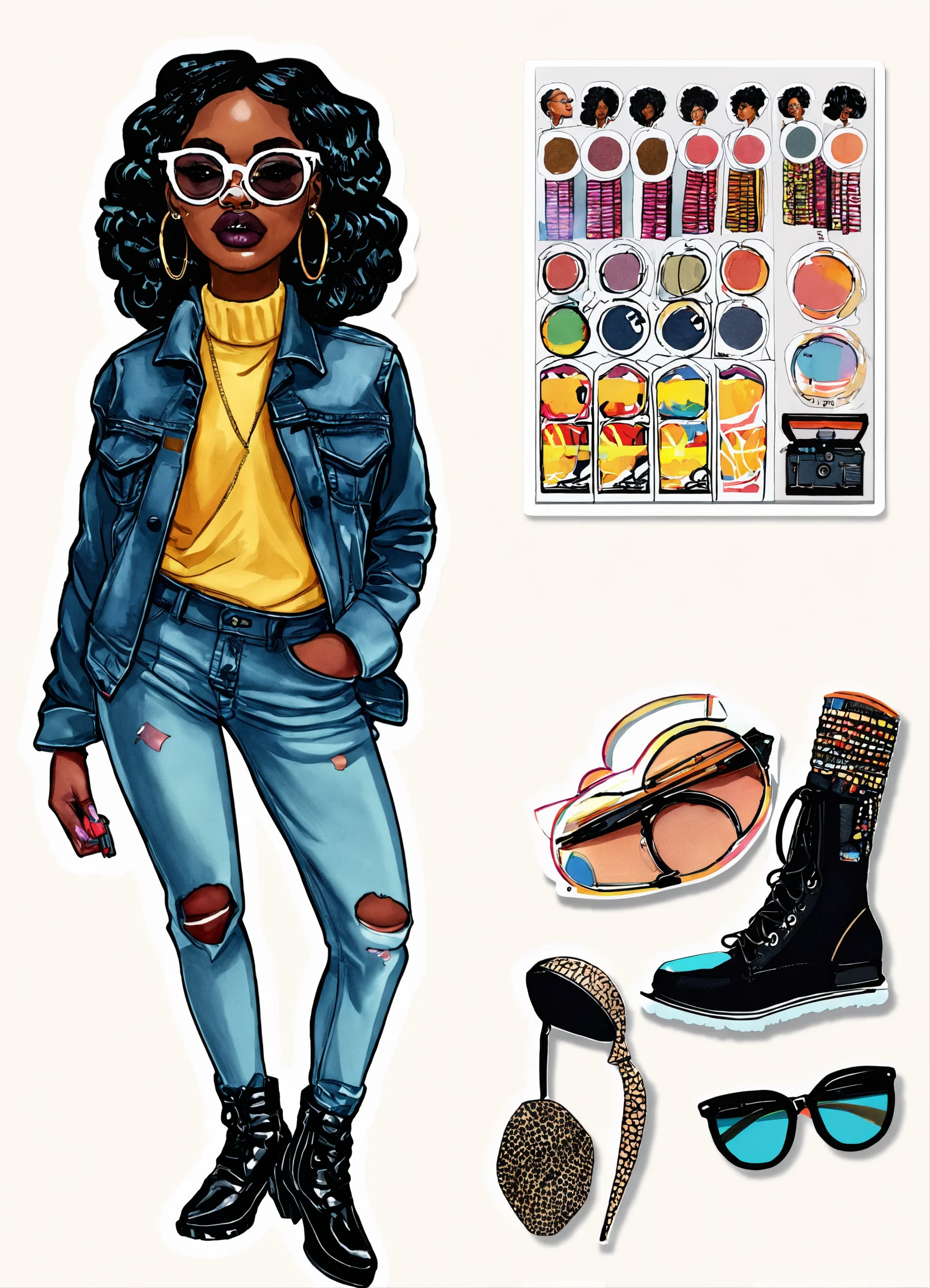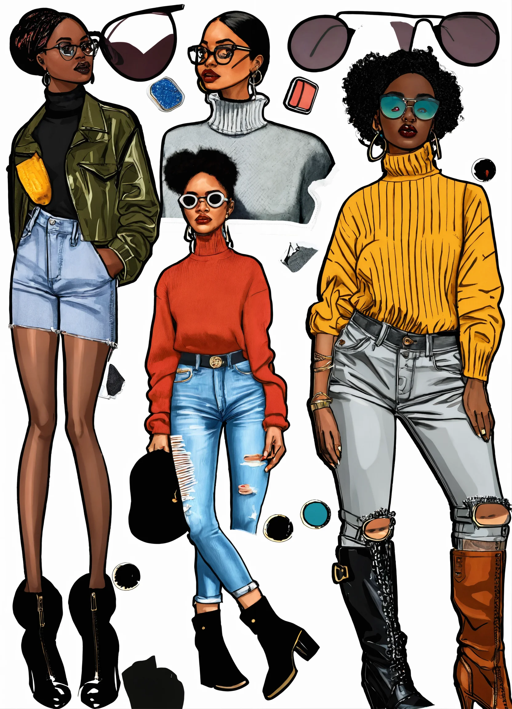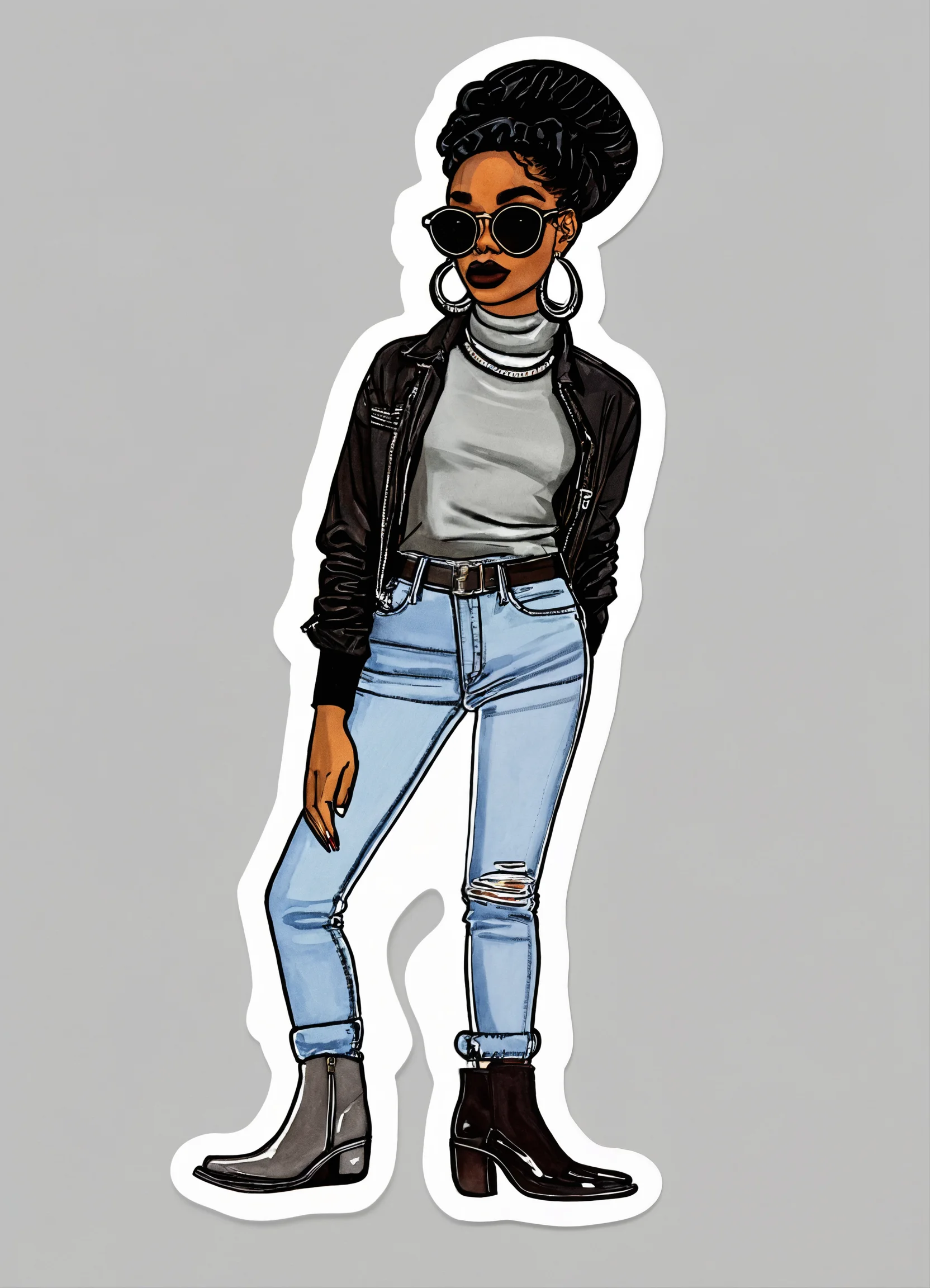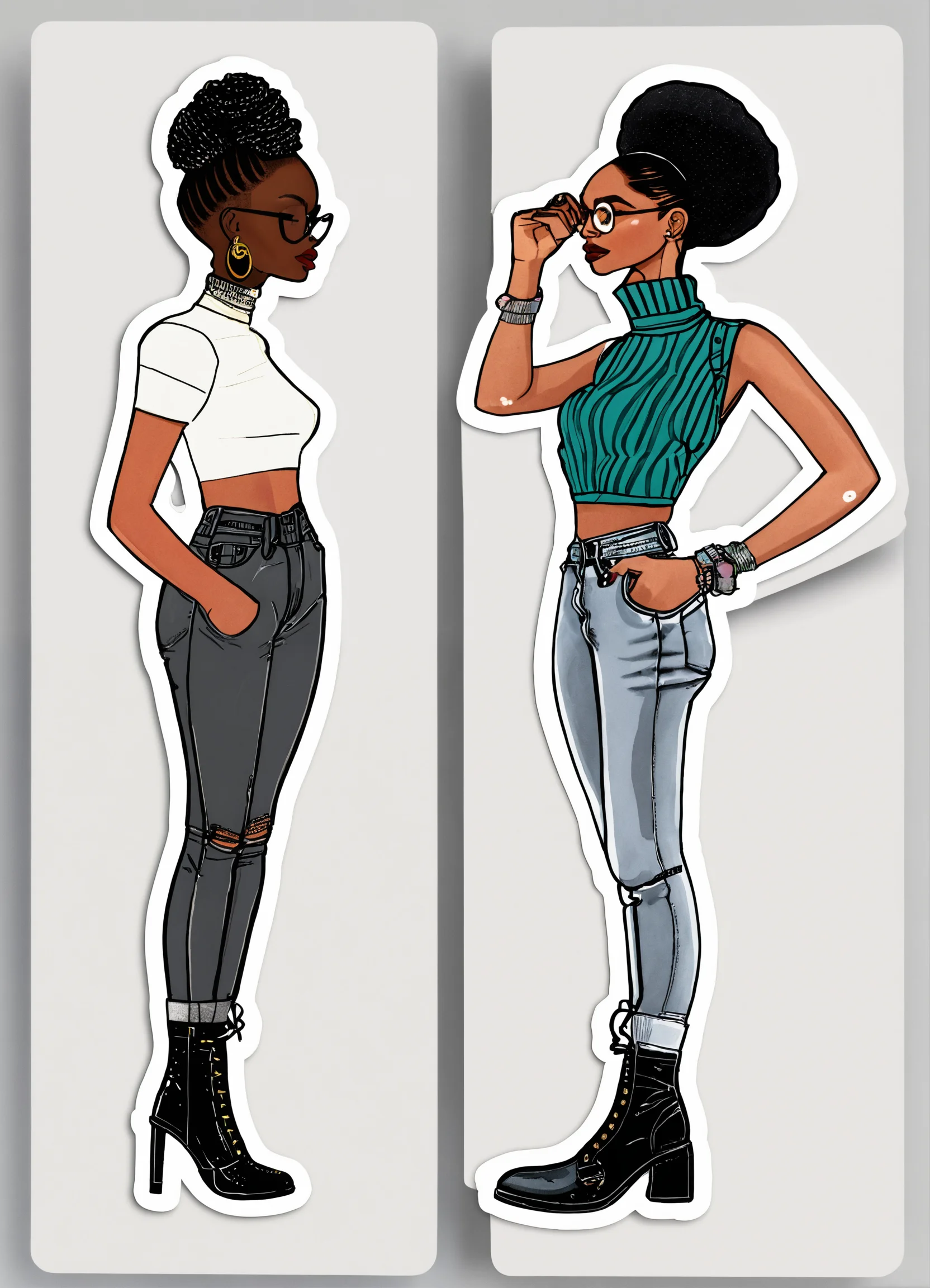 Here is the prompt. i want to see what you get 👇🏾. design a sticker sheet with four stickers, each featuring a full-body portrait of a stylish african american woman with sleek black hair and a confident pose. she should be wearing chic round glasses, various trendy outfits with vibrant turtleneck sweaters, high-waisted trousers, and different styles of fashionable boots. each sticker should be detailed with contemporary makeup and large hoop earrings. surround each sticker with a distinct light gray border and set them against a white background to create a clean and cohesive collection of stickers.