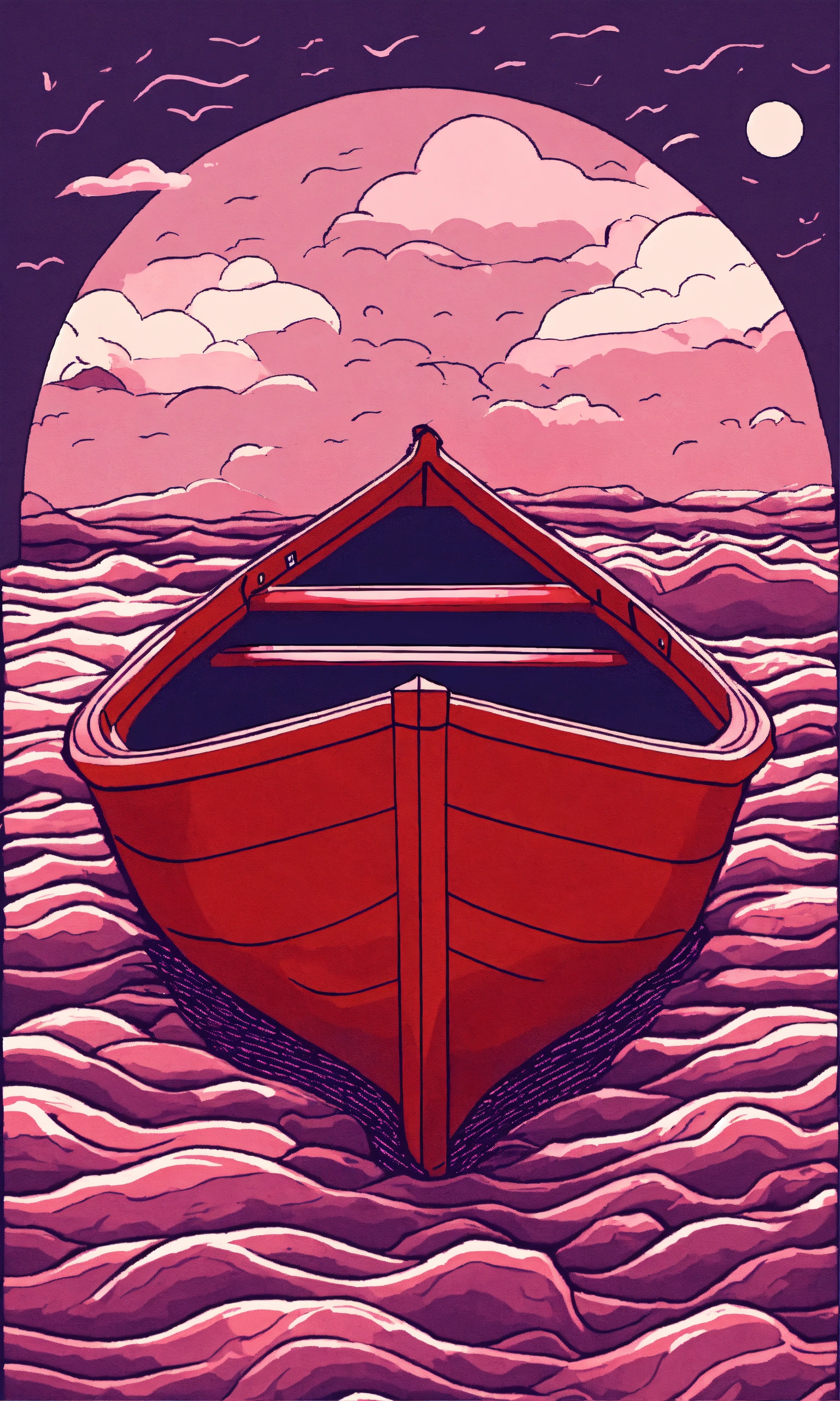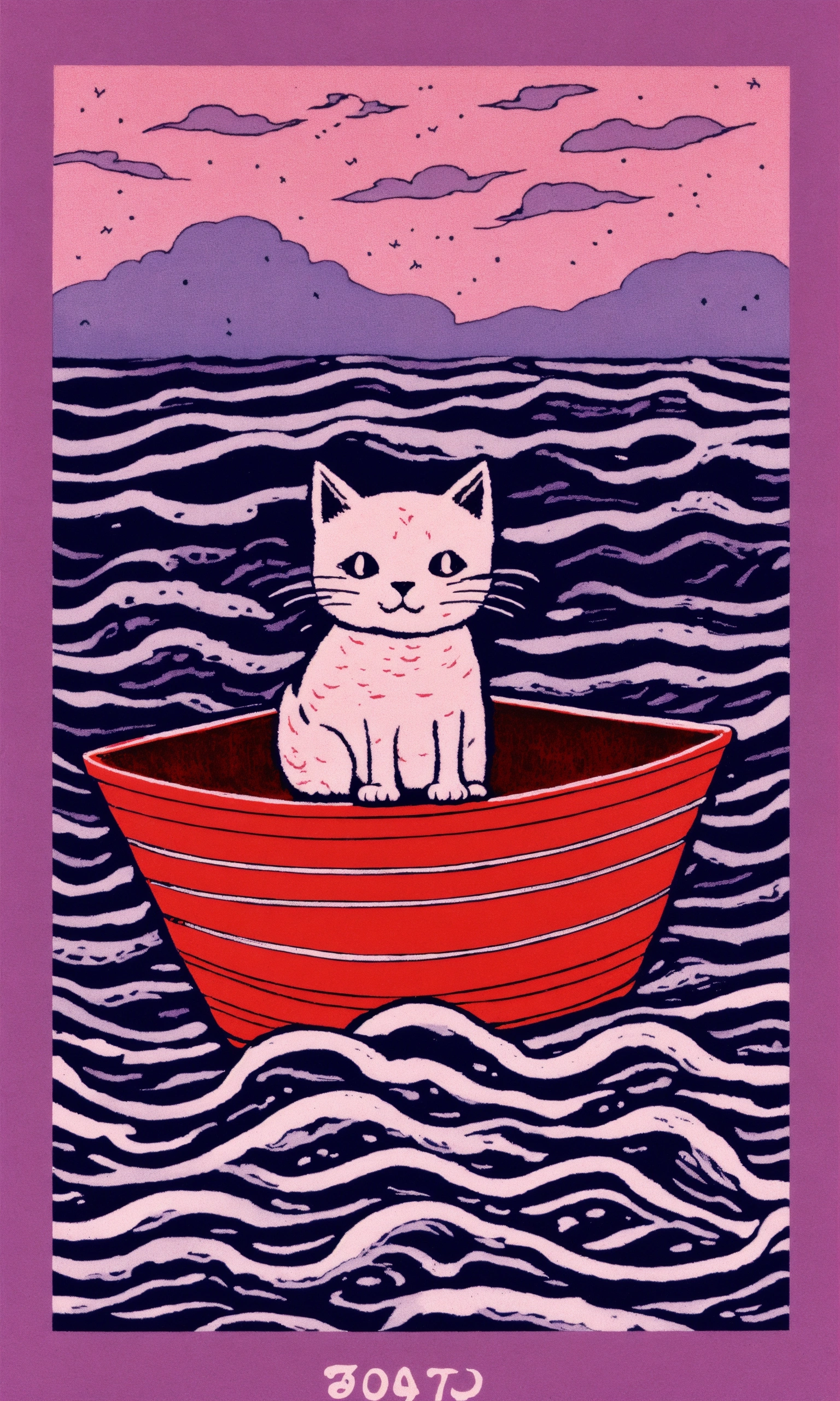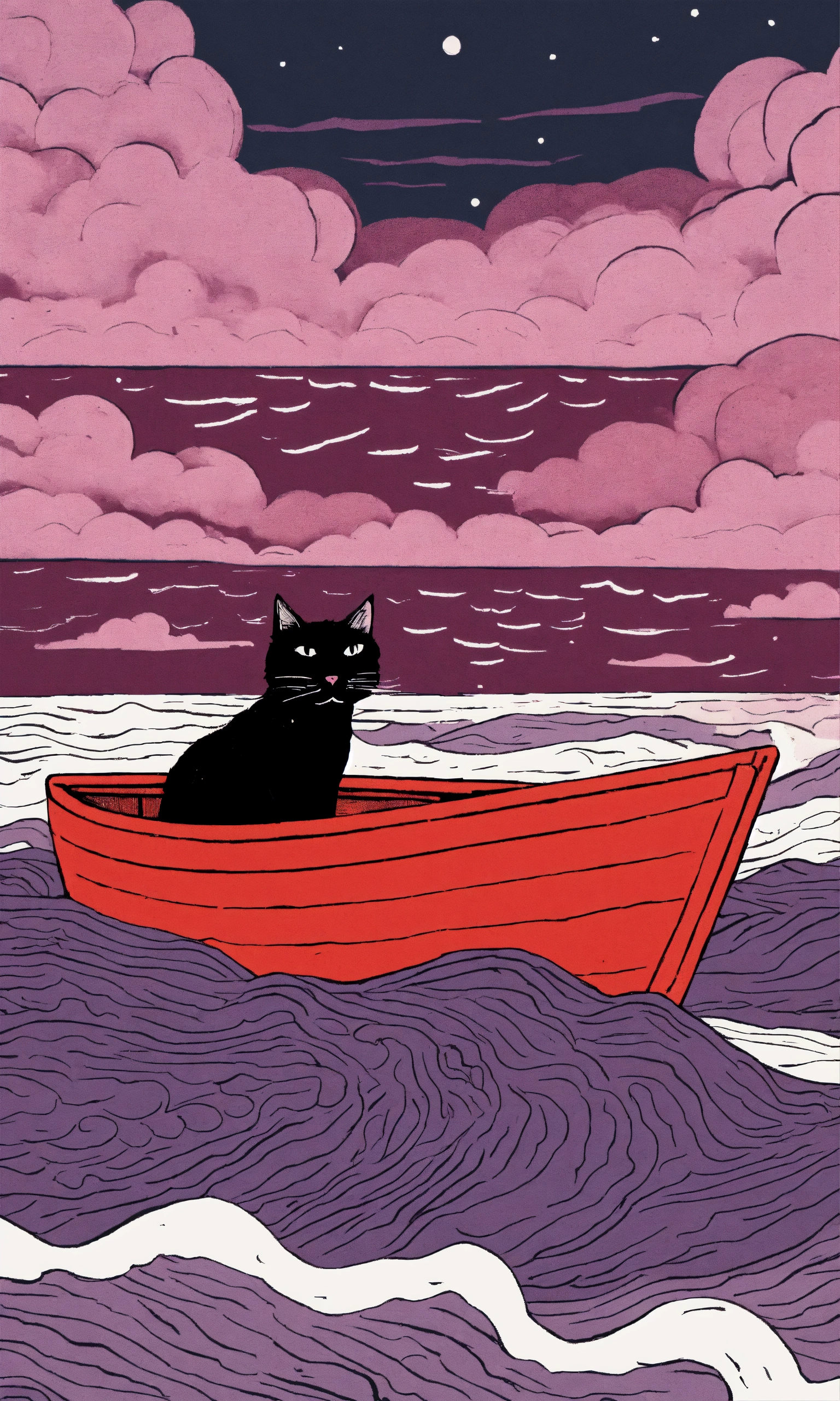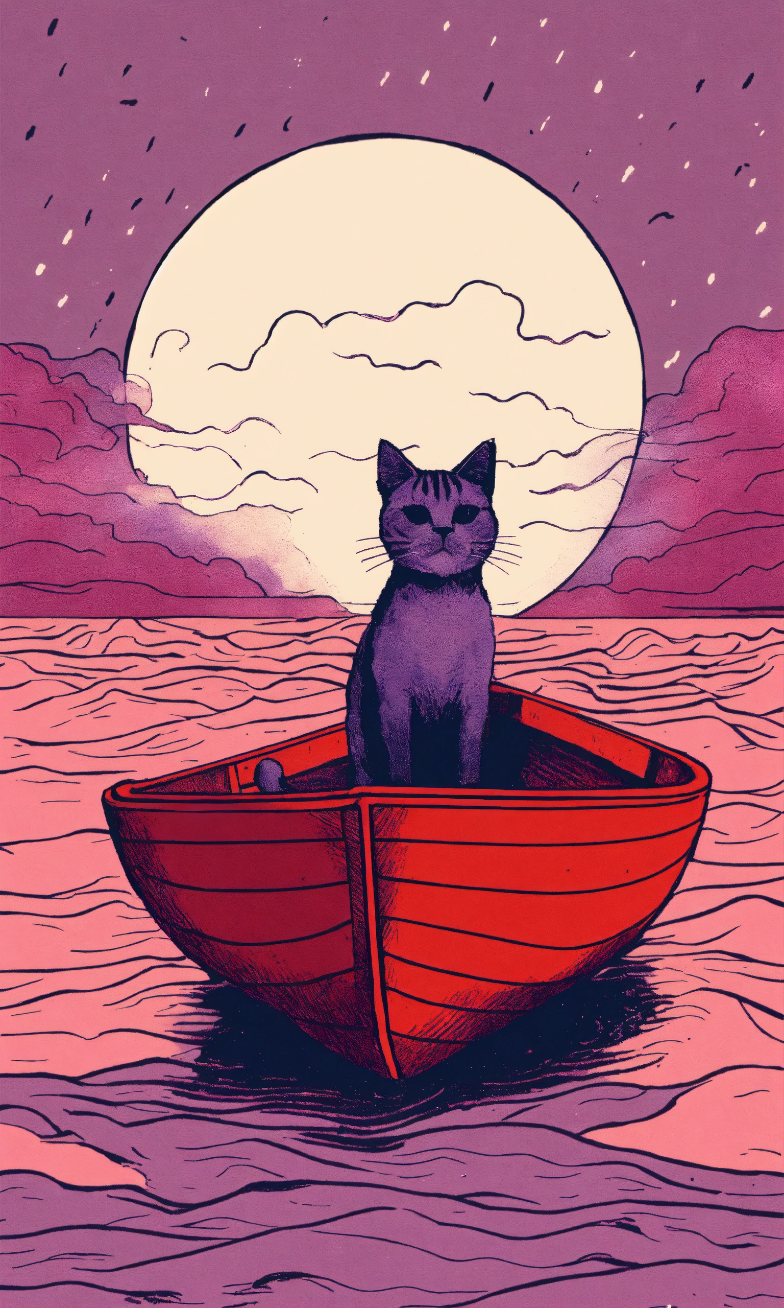 Cat in small red boat in stormy sea muted purple and maroon tints risograph