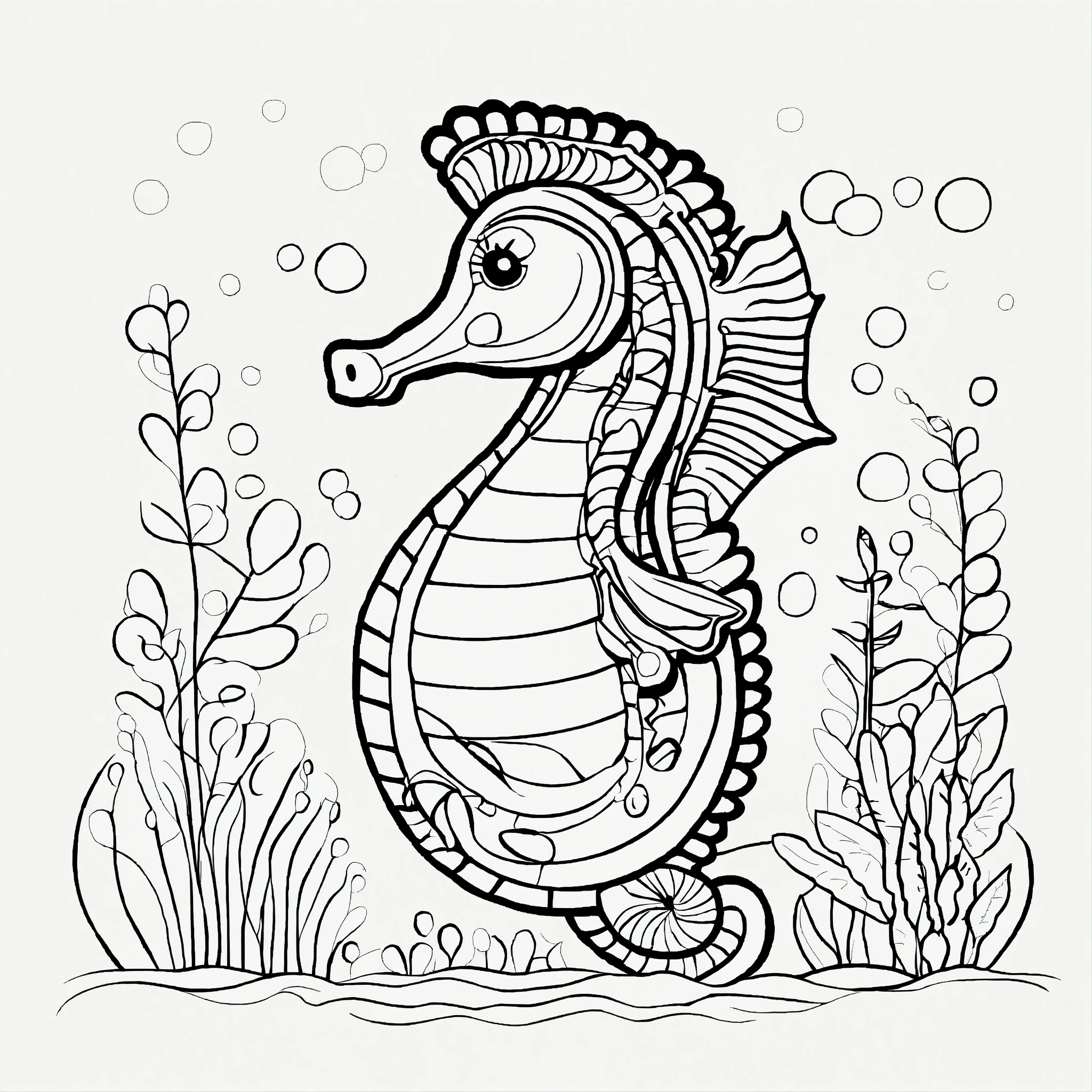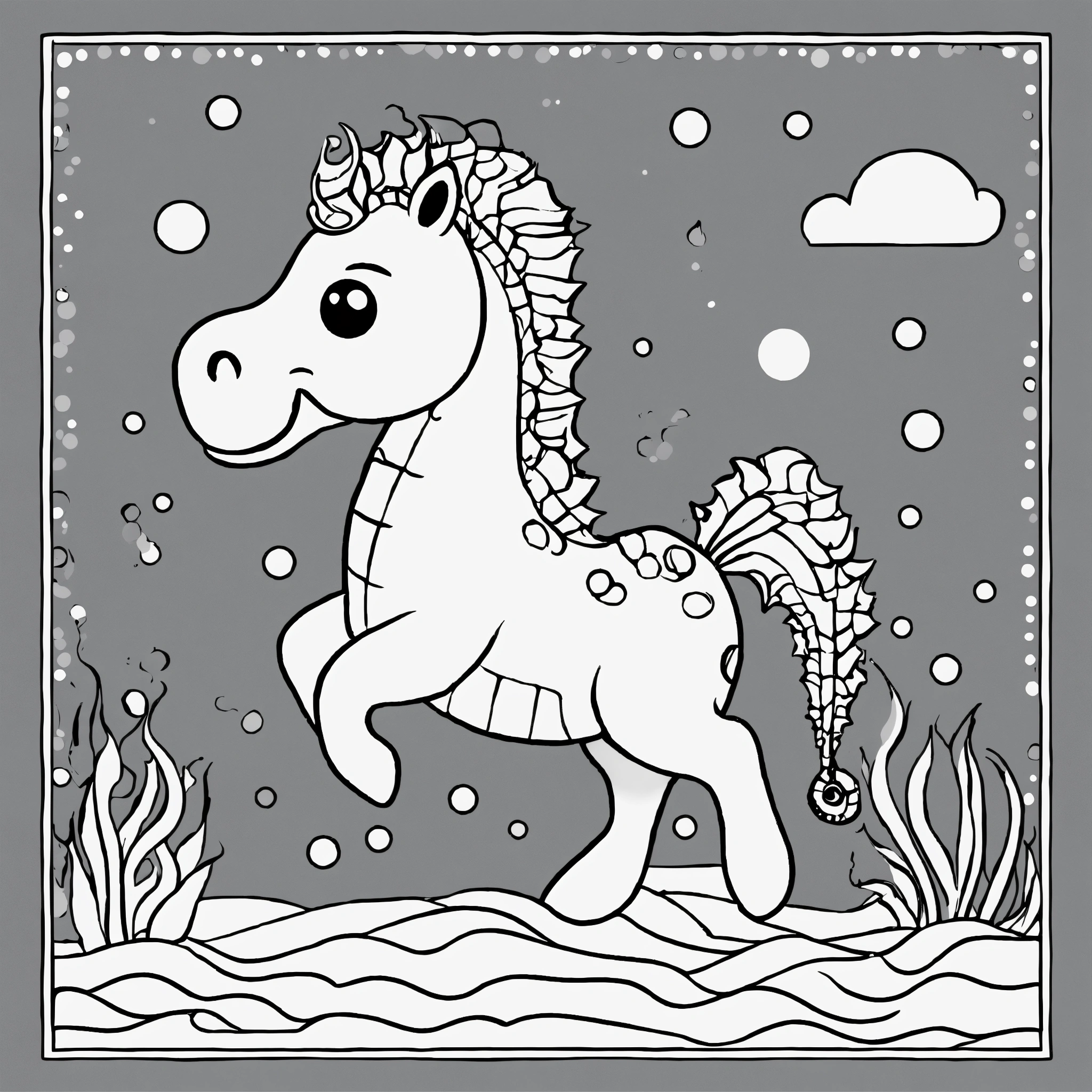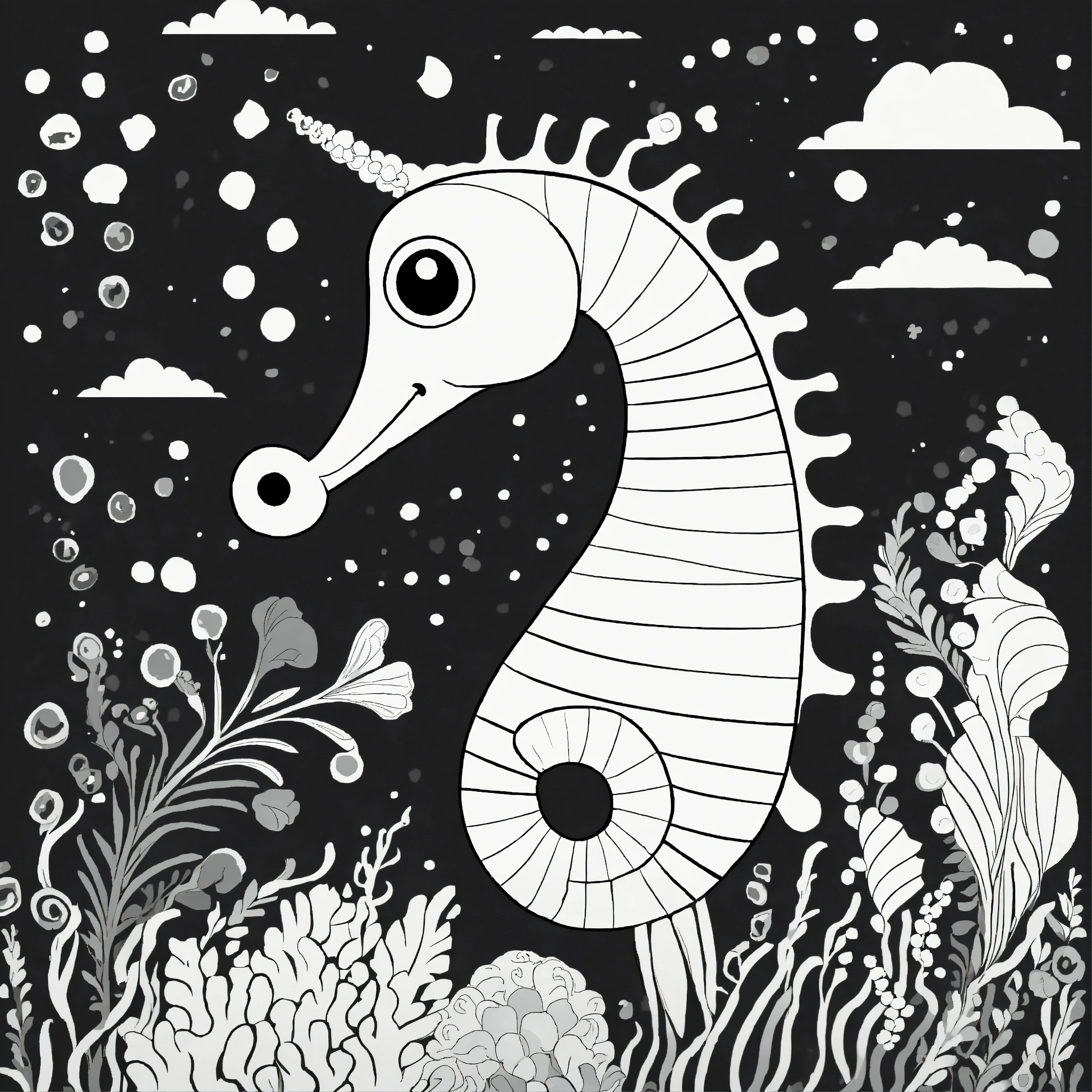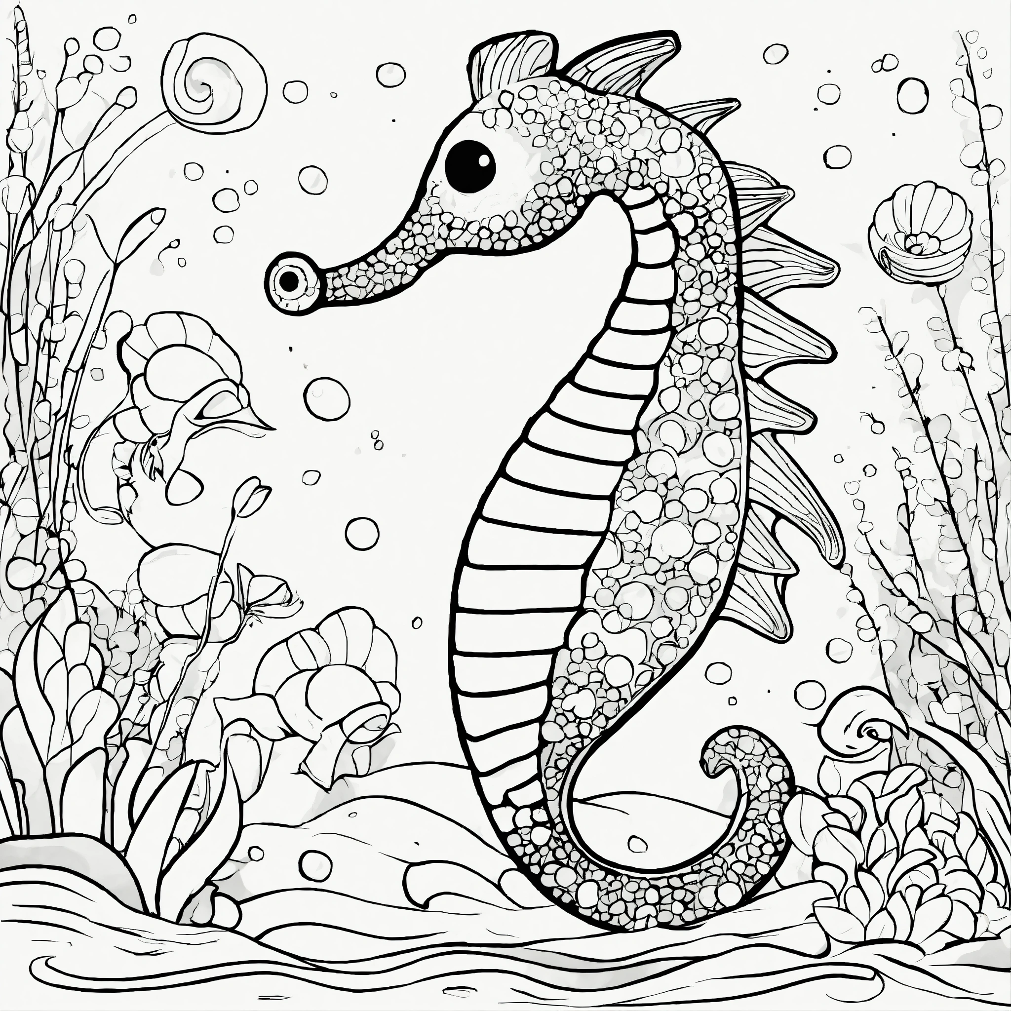 Cute sea horse for a toddler's, pixar style, simple outline and shapes, black and white coloring book, flat vector, white background, clean line art, studio ghibli studio, visual stimulation black and white patterns, single charakter, monochrome