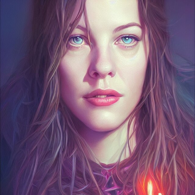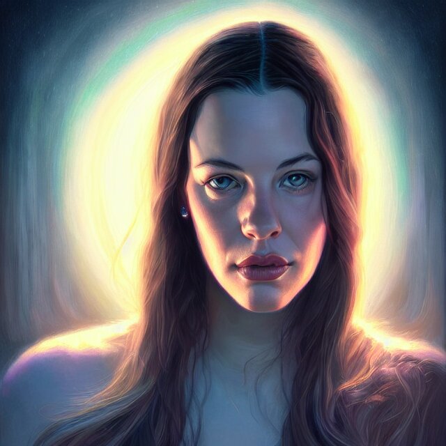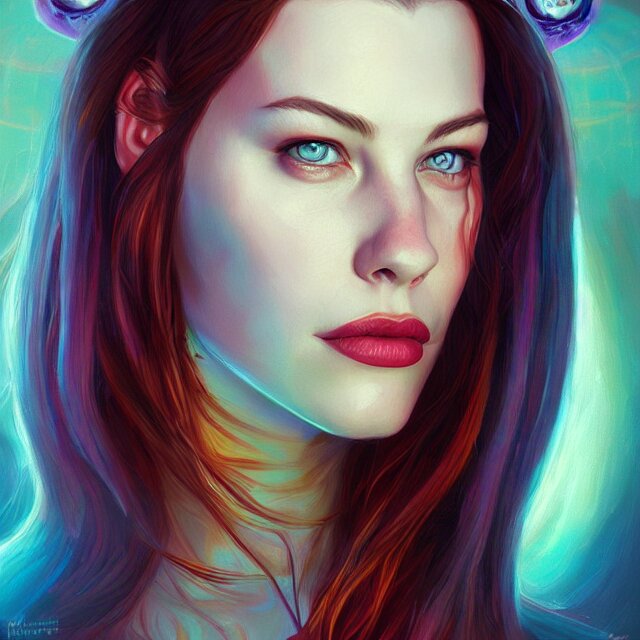 Portrait of young liv tyler by mandy jurgens, cartoon, visionary art, symmetric, magic symbols, holy halo, dramatic ambient lighting, high detail, vibrant colors