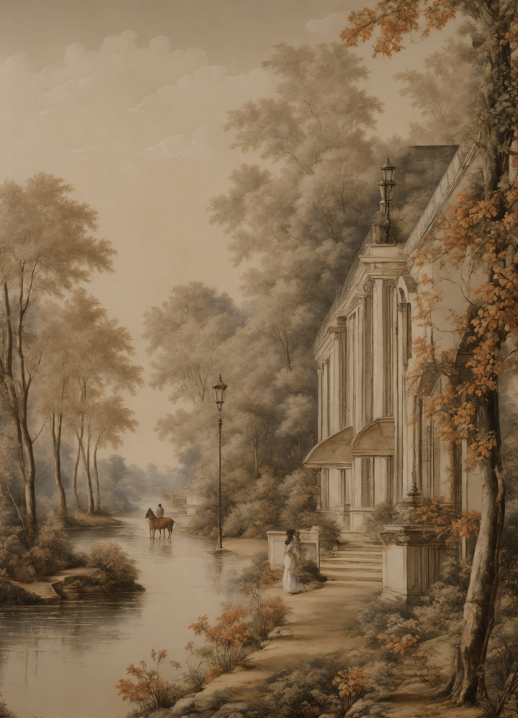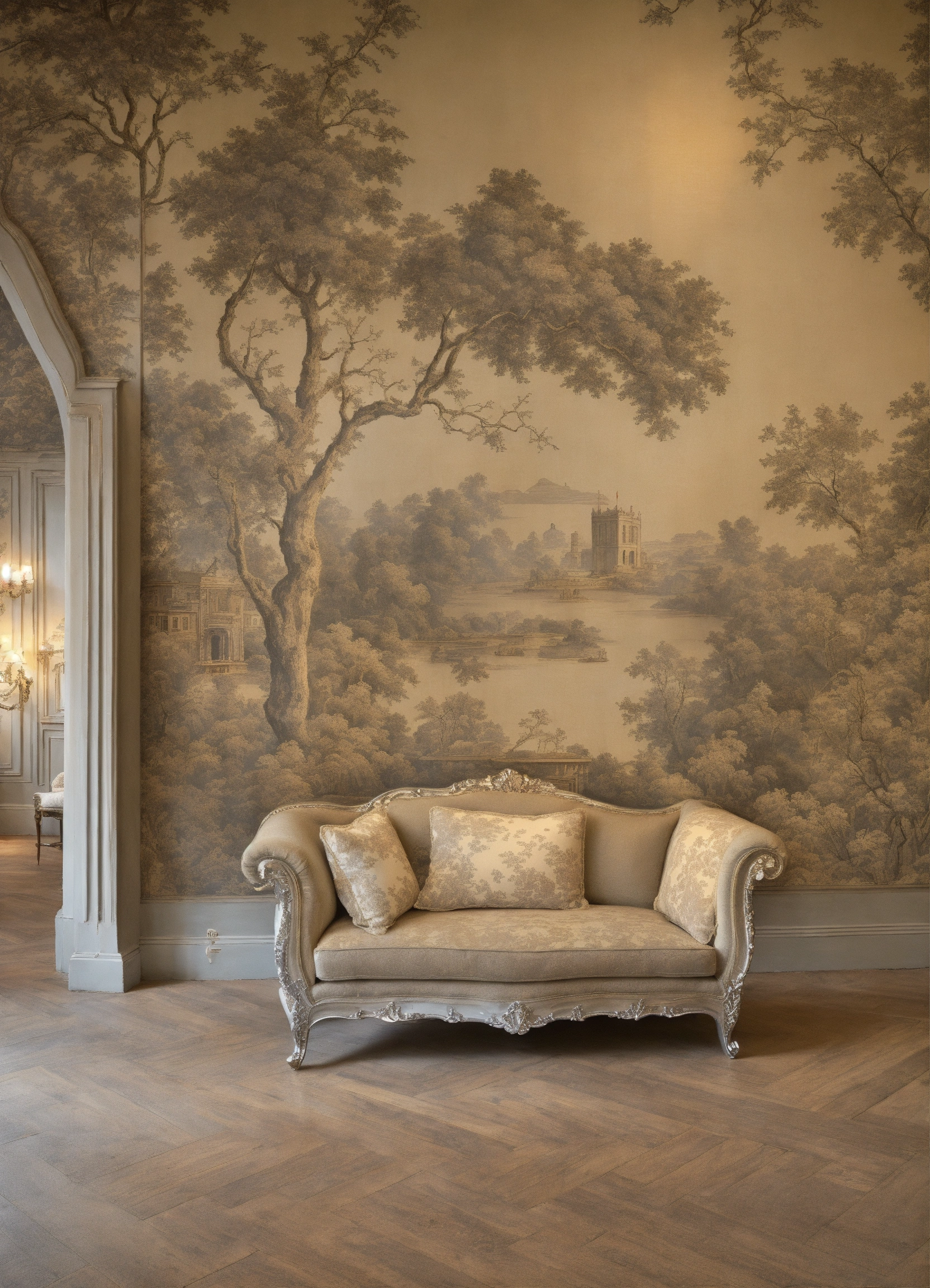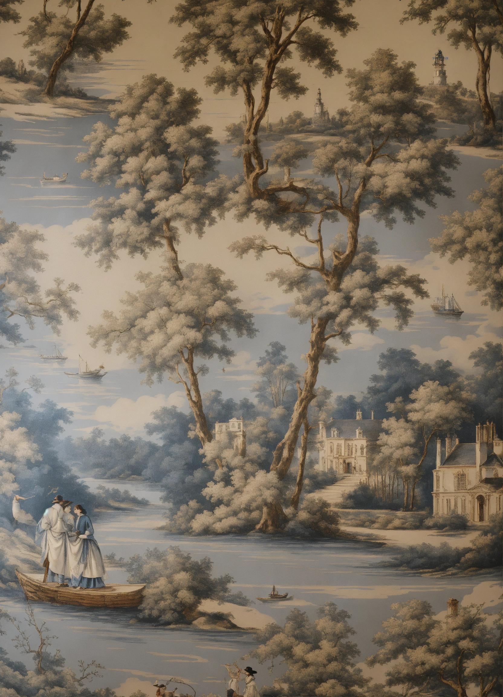 Toile de jouy smoke nouveau art deco silver flash sparkle salon interior regency chemine