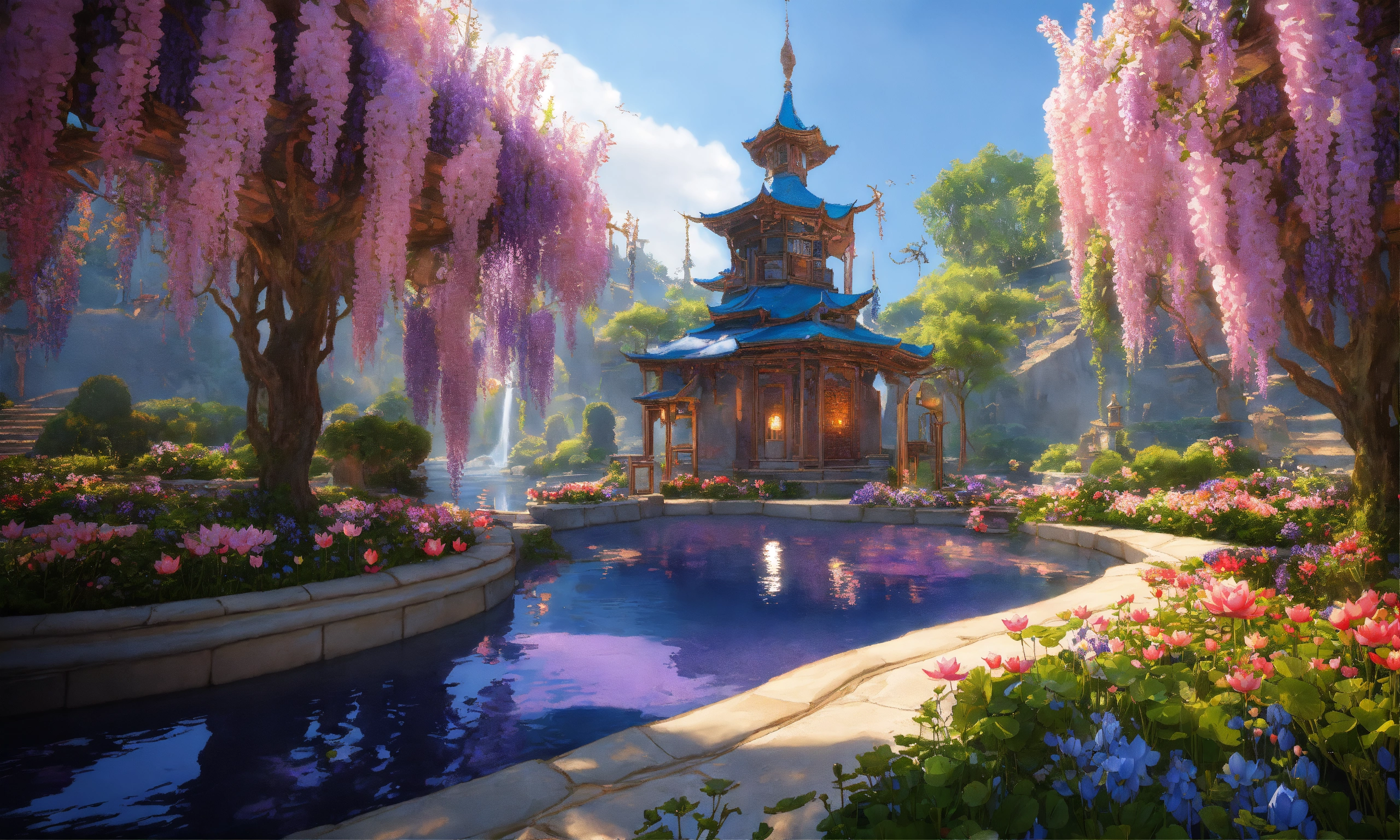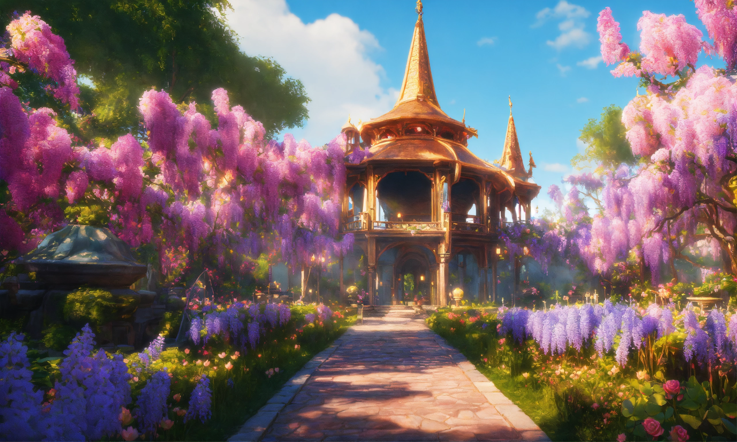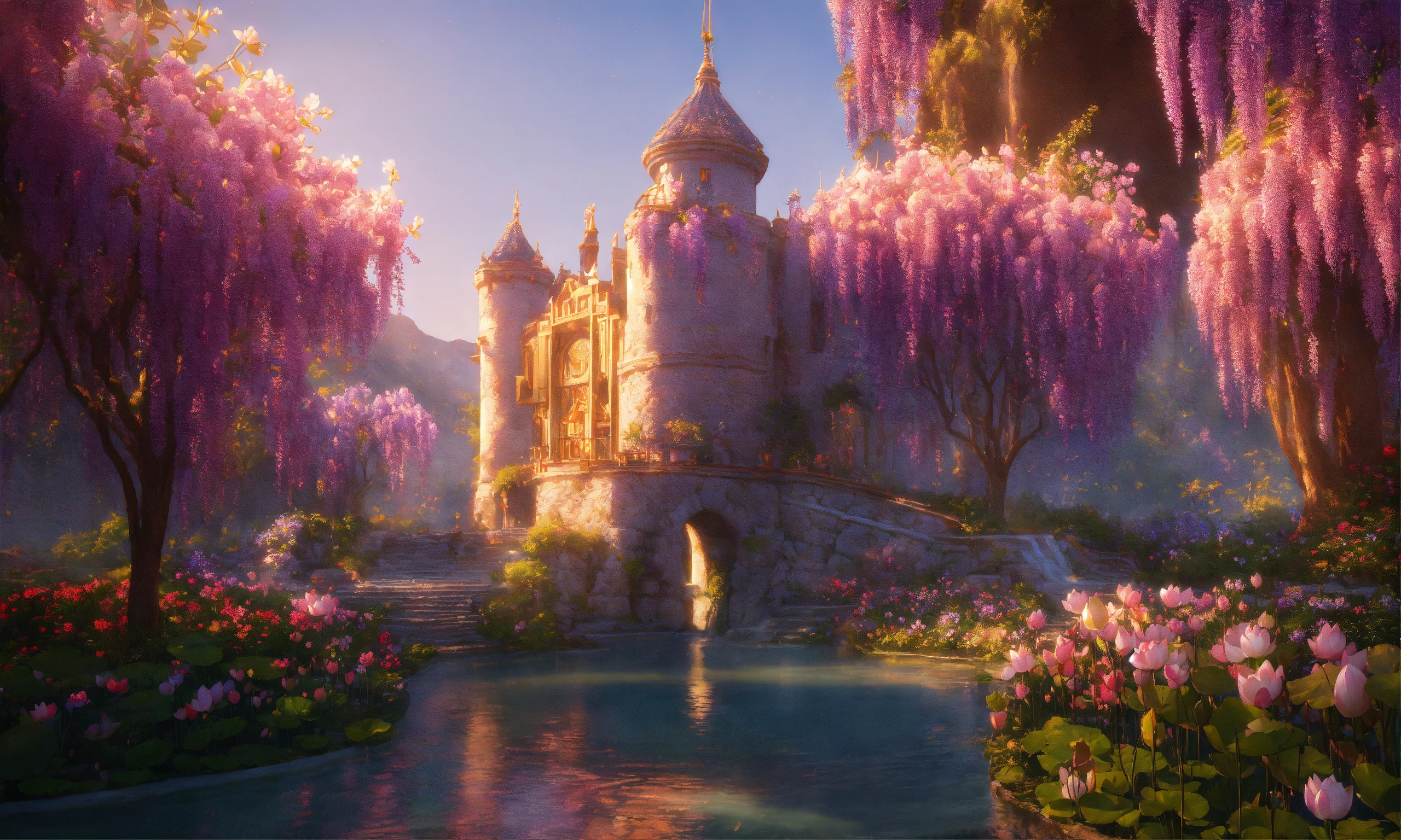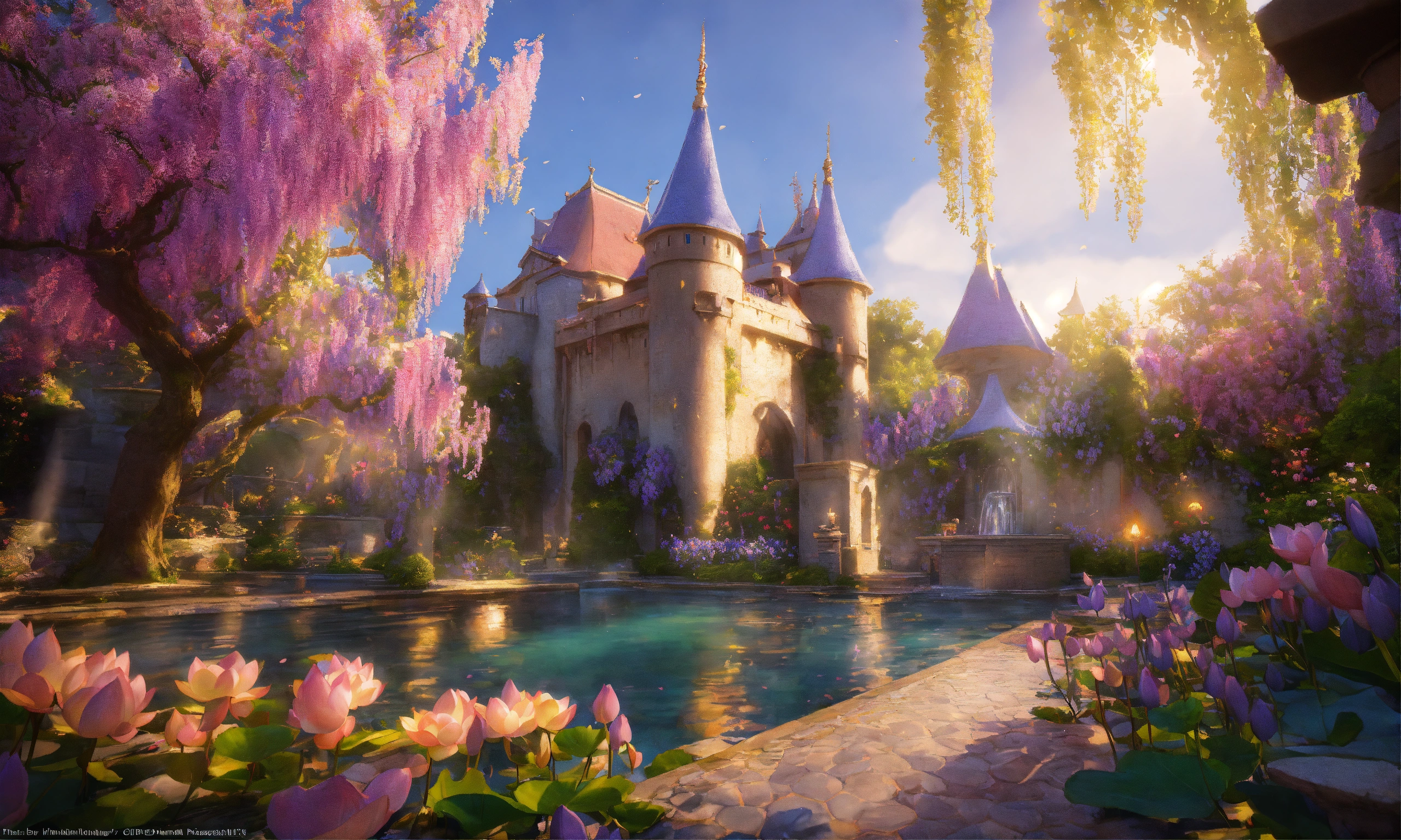 Disneland castle, bucolic campanules flowers, eastern ogives gold flowered rose and gold, blue, parma, waterfal, very fine chiseled with basins covered with beautiful pink lotus and paths colored with bright reflections, create a heavenly world with pastel landscapes covered with flowers and trees covered with realistic wisteria, photorealists colorful vintage pastel, sunlight by candlelight natural light, oriental, ogive, flowery, wisteria, complex sharp image fine octane details unreal engine ultra realistic 16k cinema