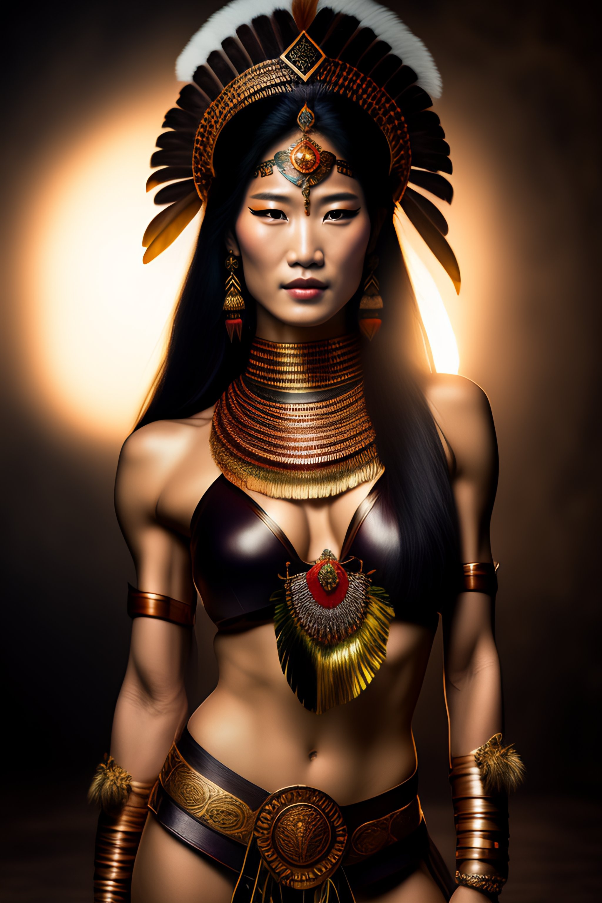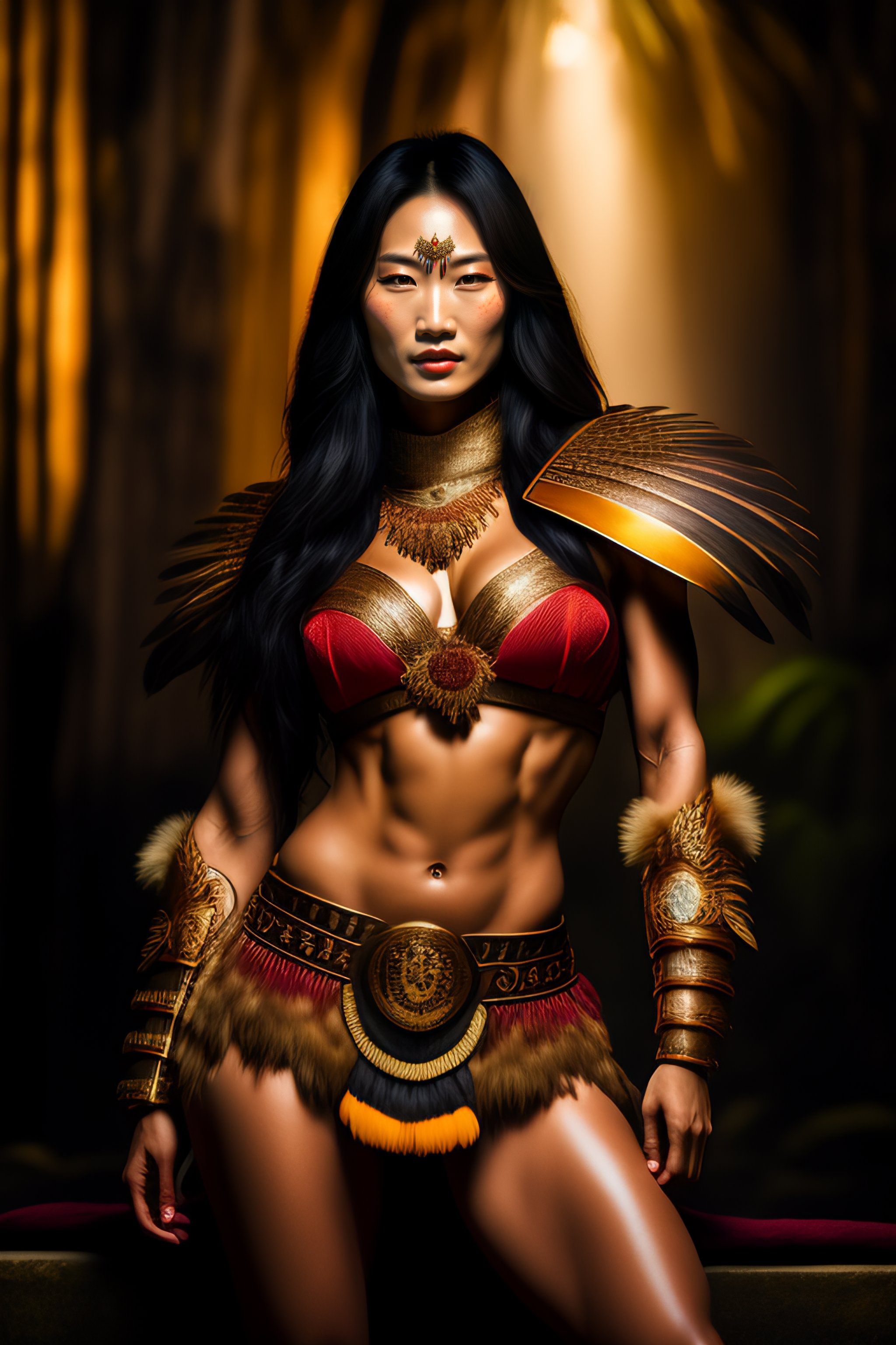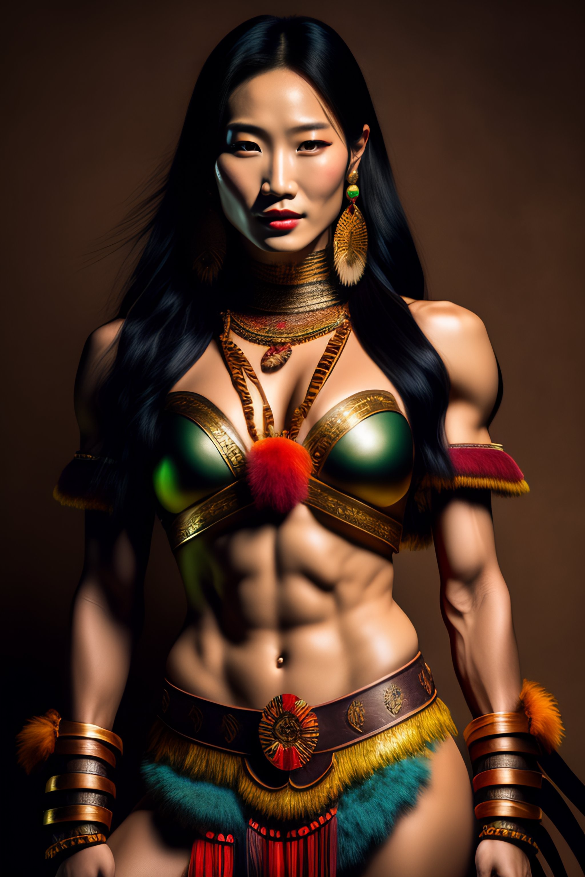 Beautiful portrait of claudia kim dressed as an amazon warrior, indigenous, brazilian indigenous, (abdomen muscles), (six packs), abs, muscular, strong, dramatic lighting, intricate, wild, highly detailed, professional photography, fashion photography, sharp focus, digital camera, raw photo quality, uncompressed image file