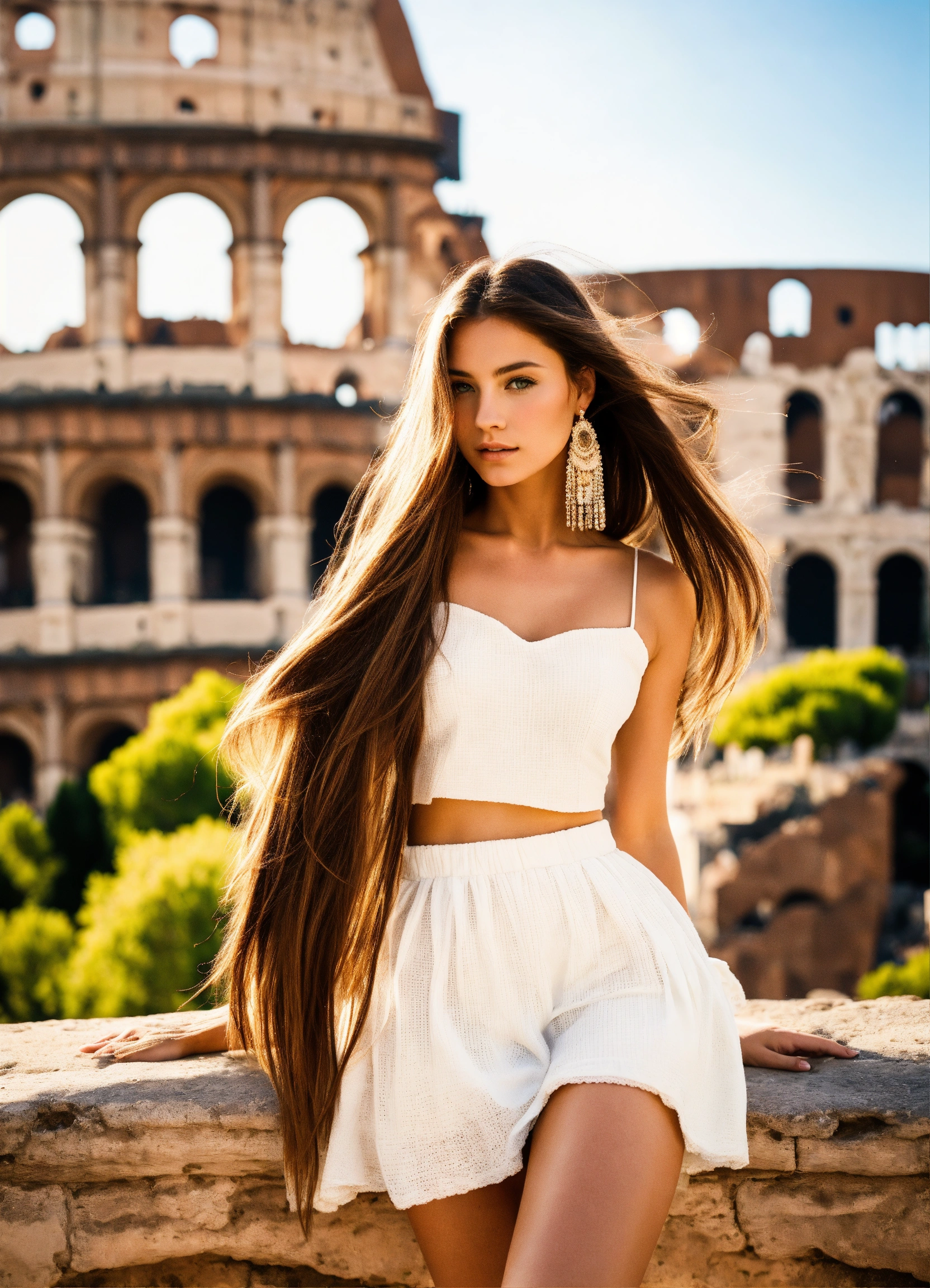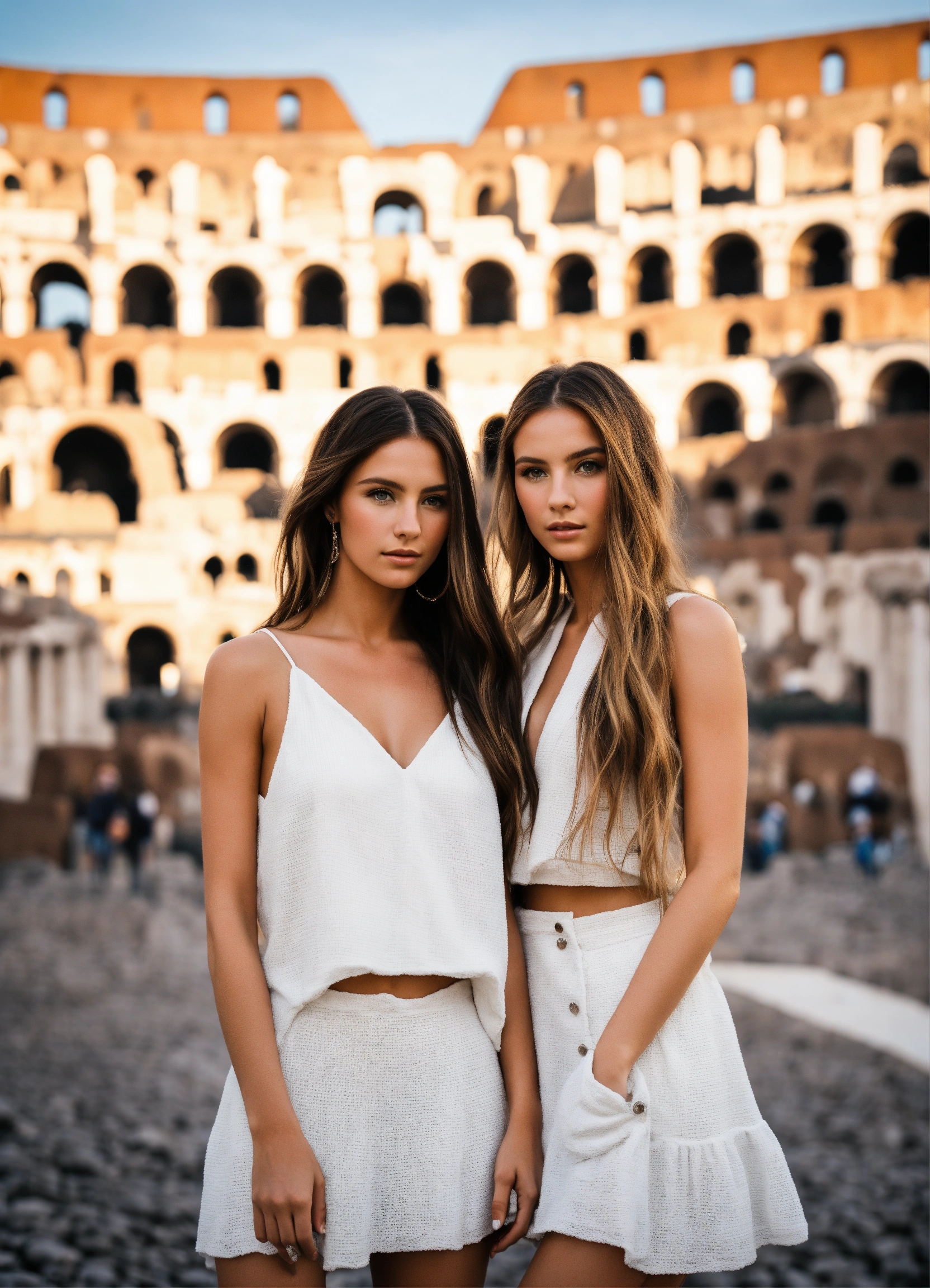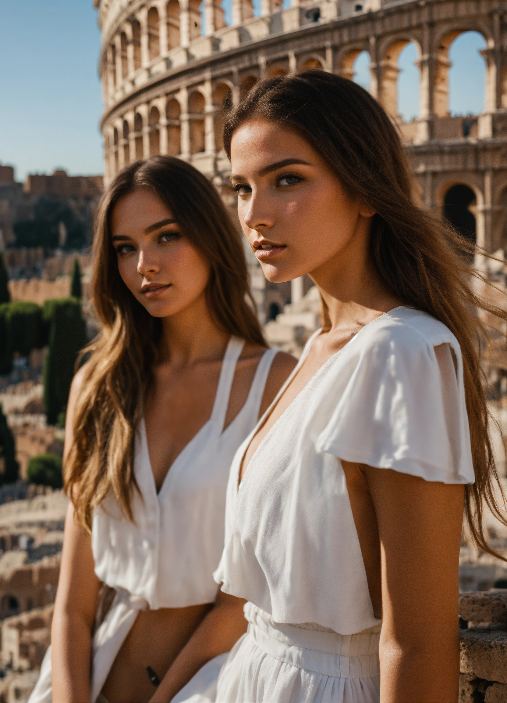Photo of skyline of rome at day with two female models and the colosseum, looking into the the camera; long hair, clothes in white color, photo in white color, innocence, perfect hands