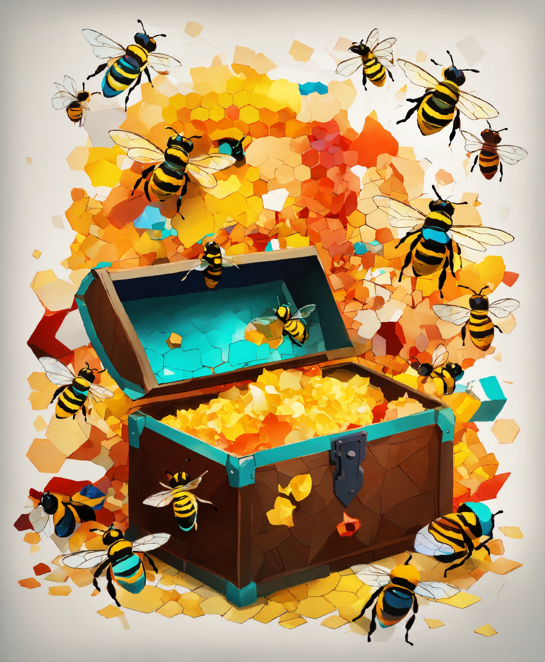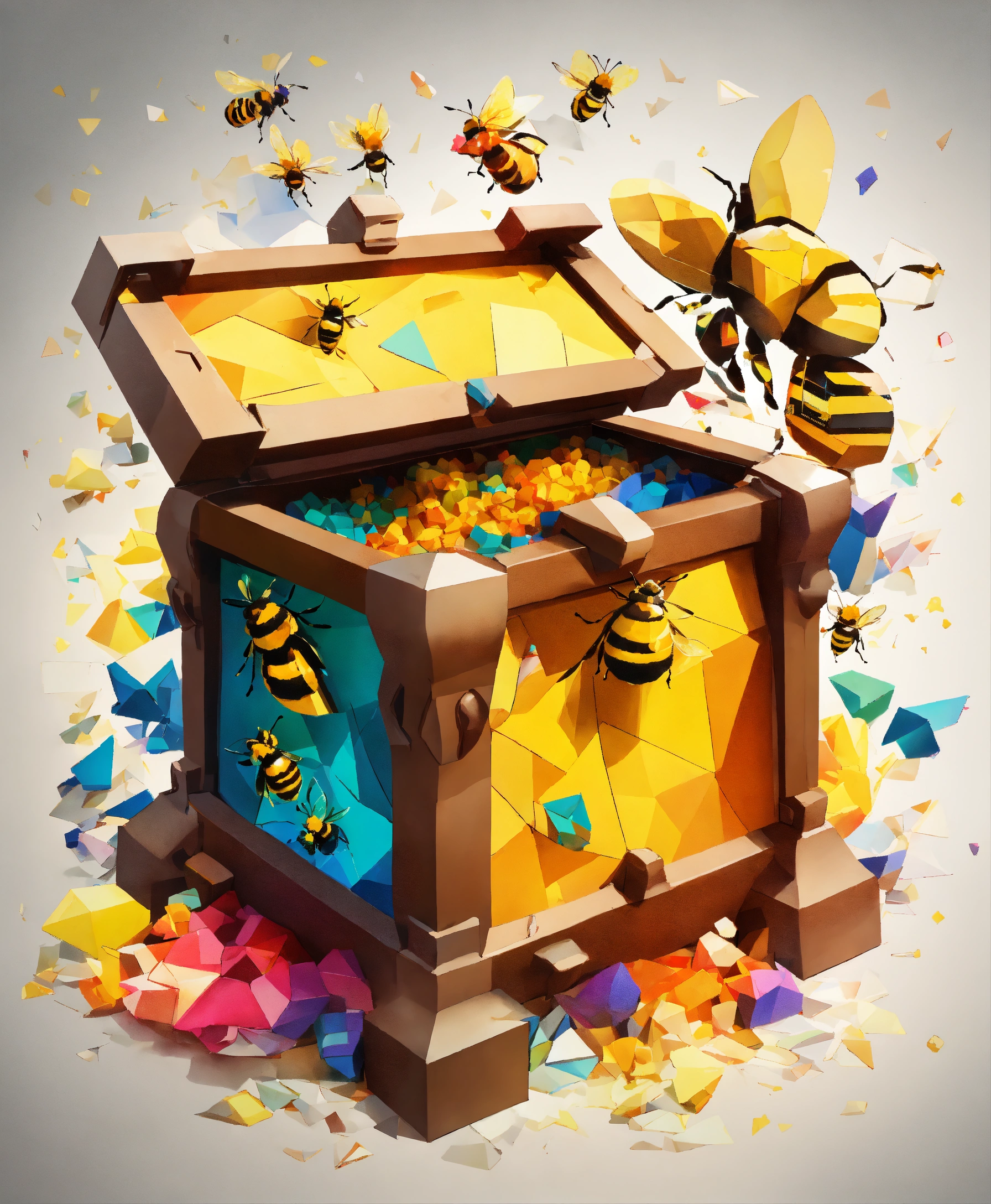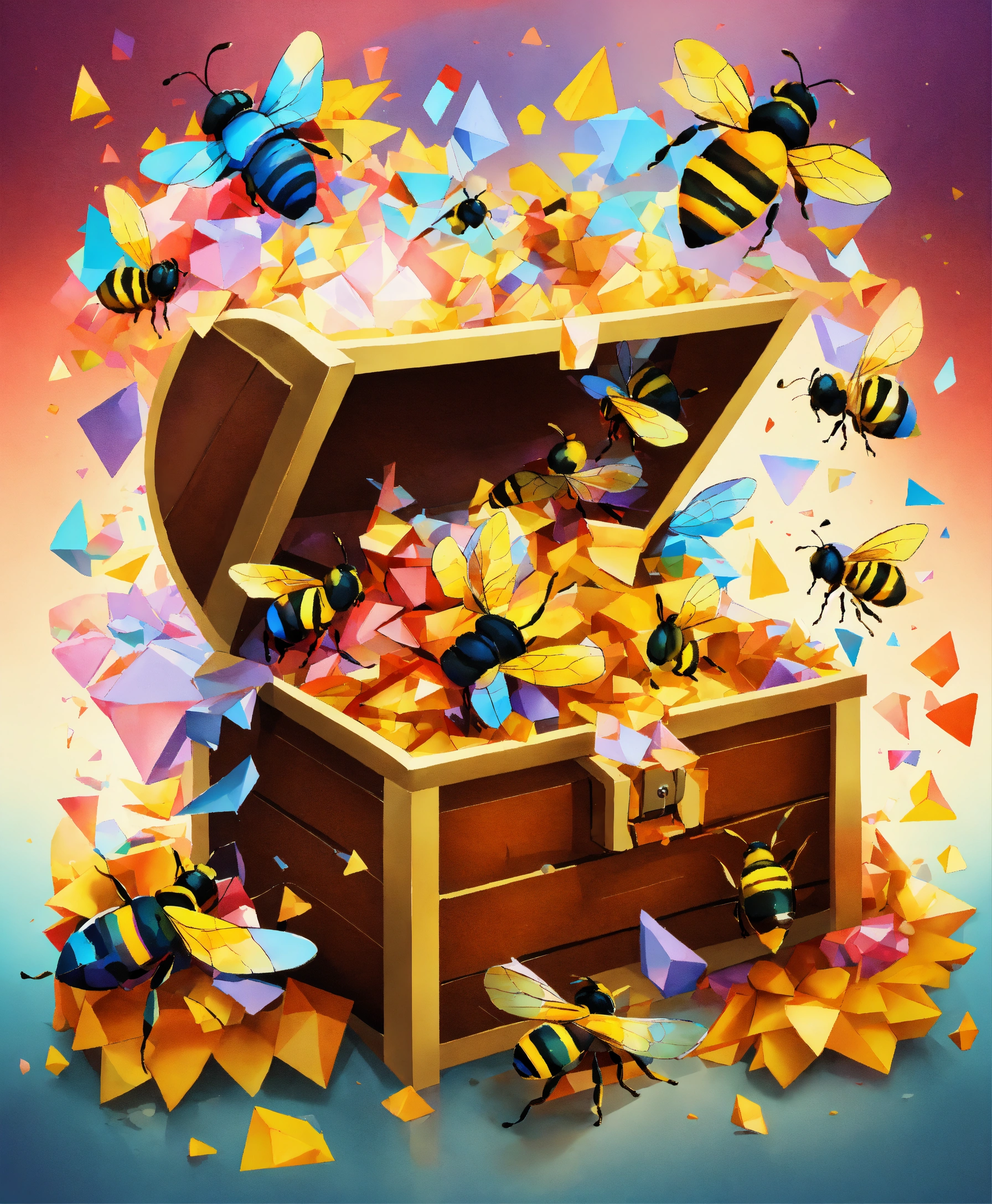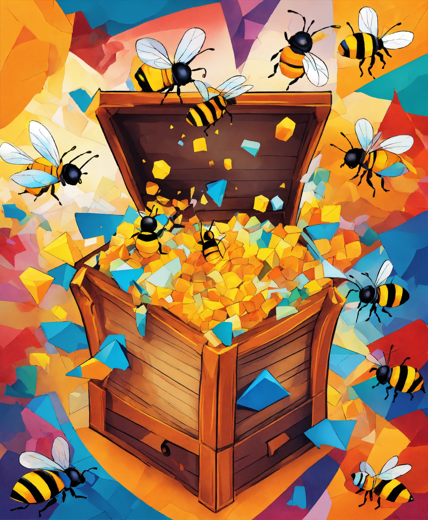Create a drawing of an explosion of colorful bees from a treasure chest isolated on a white background, inspired by the unique cubism. it should have fragmented features, with elements that reflect the abstract and geometric shapes of cubism.