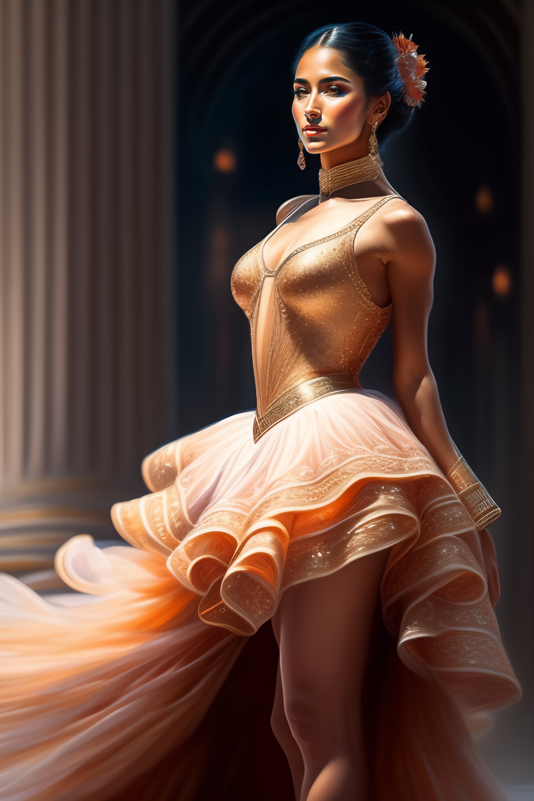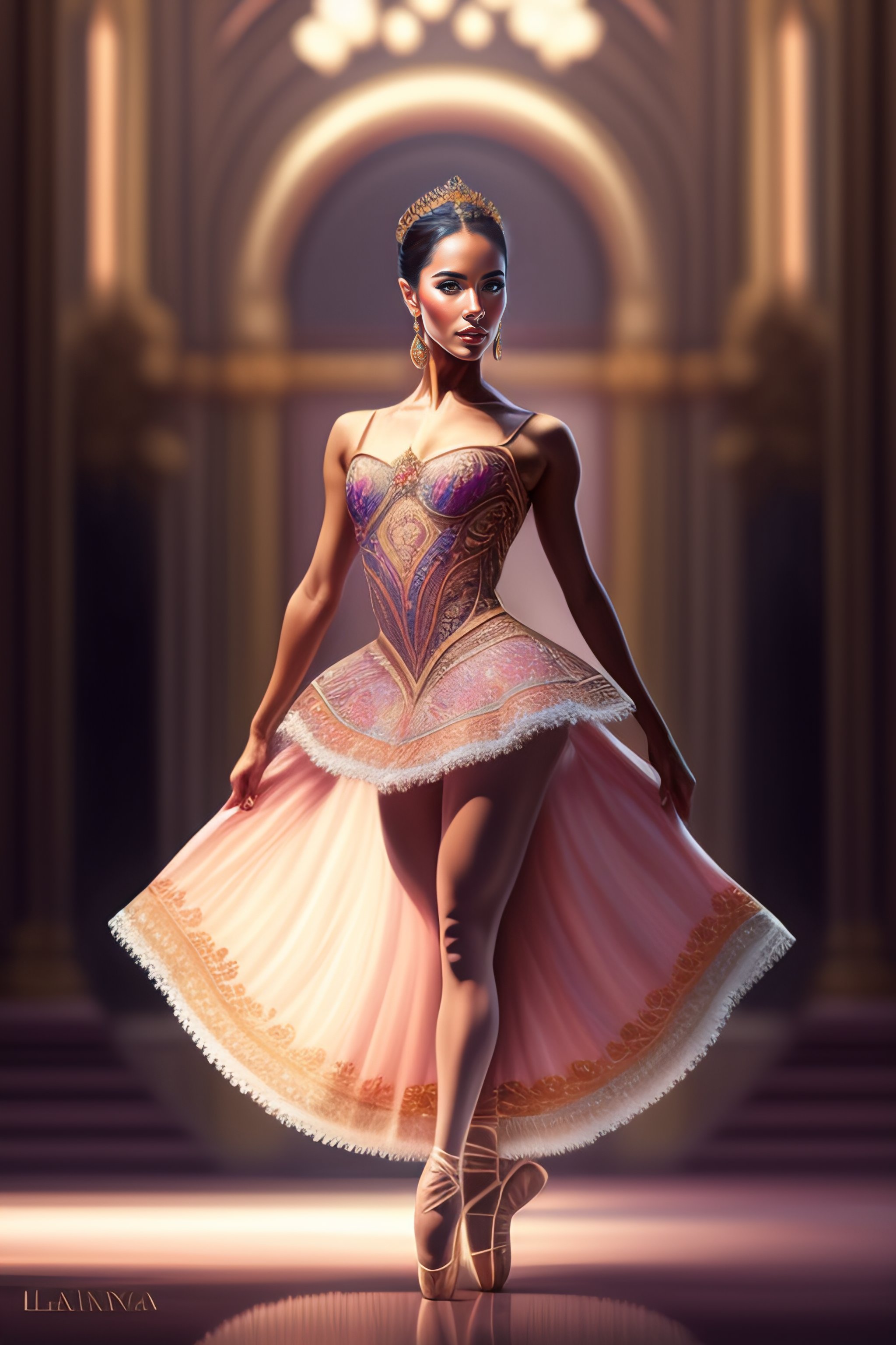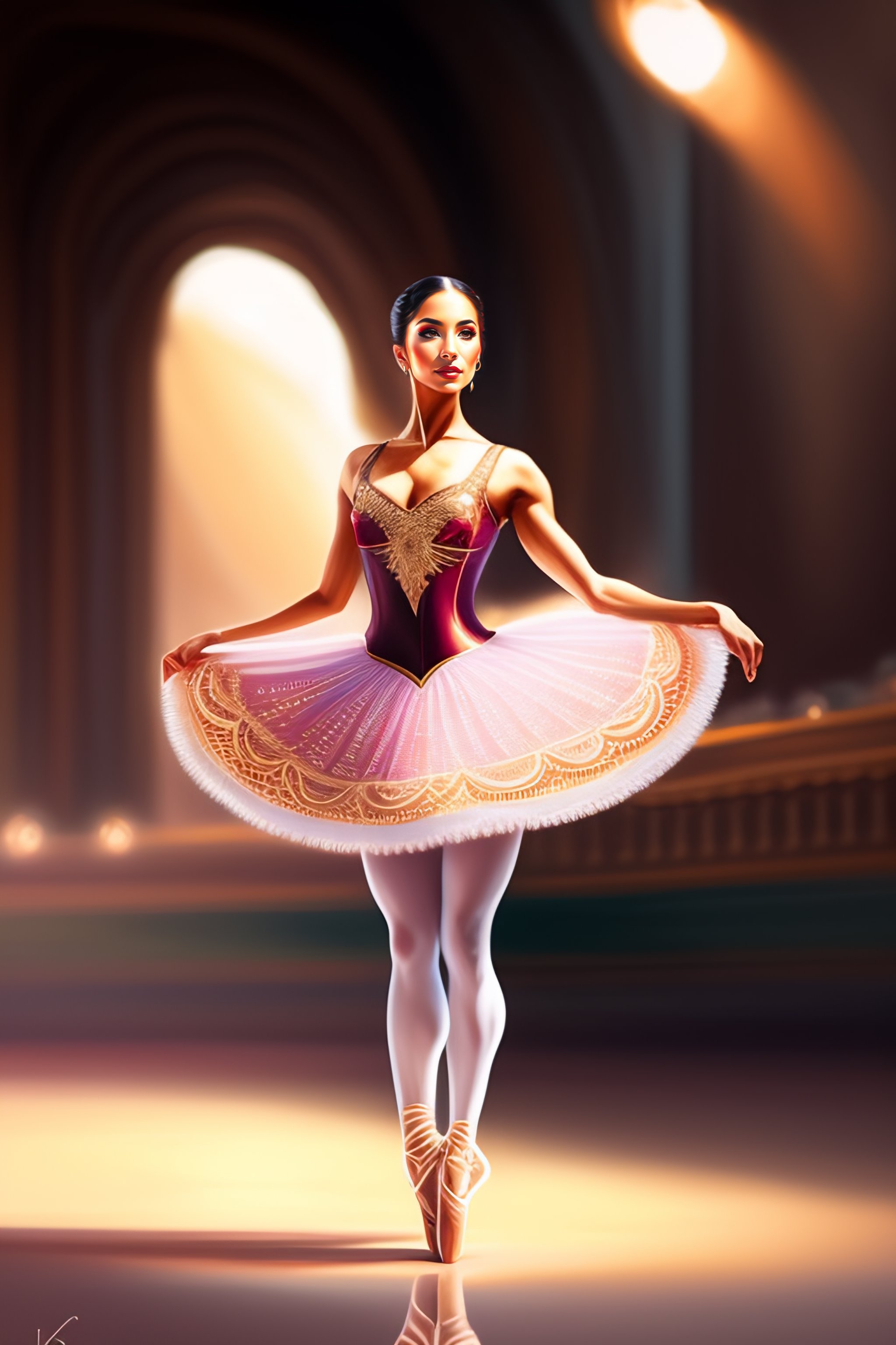 Latina ballet dancer woman alone on a big stage, full body, intricate, elegant, highly detailed, digital painting, concept art, art station, smooth, sharp focus