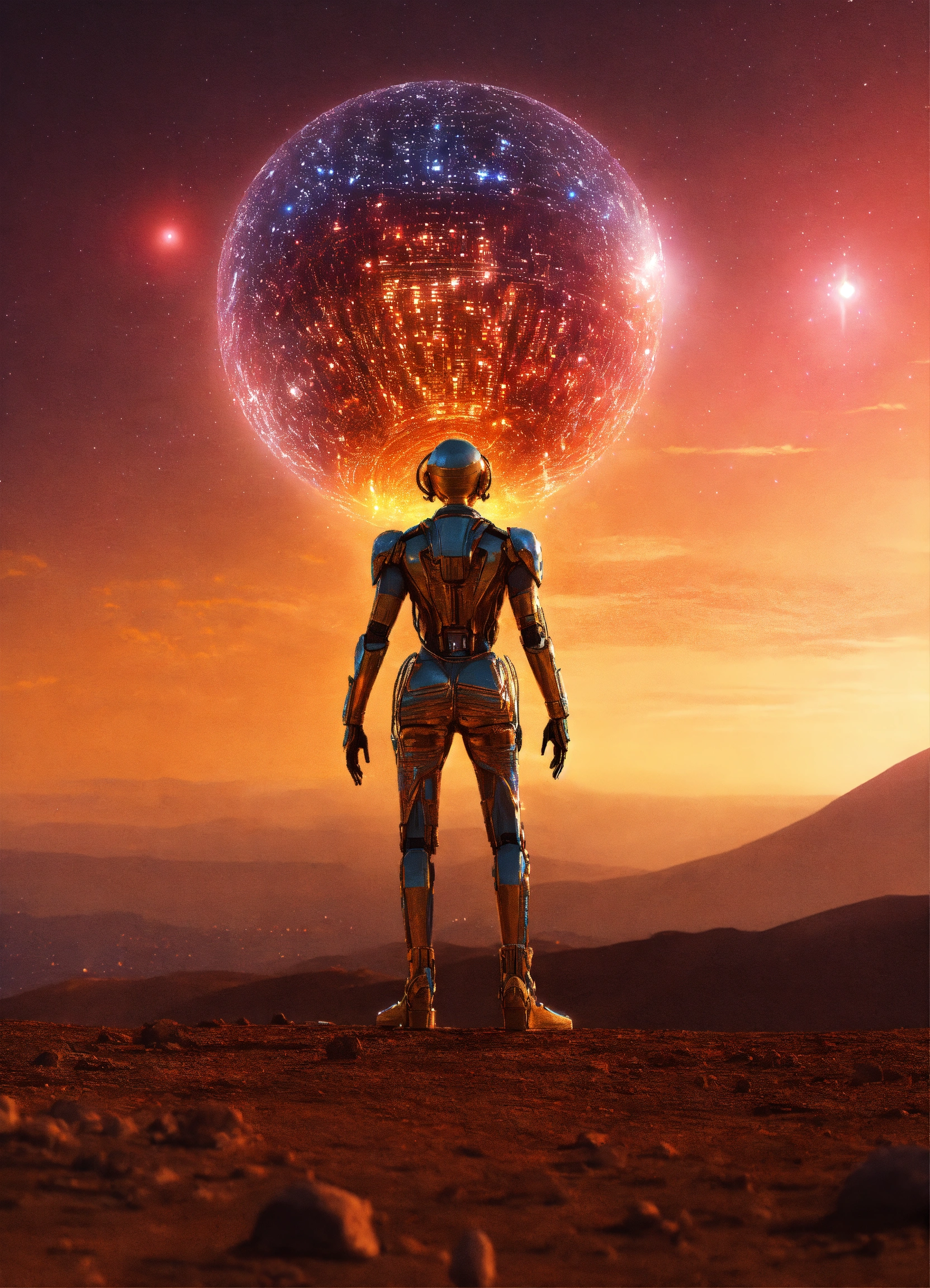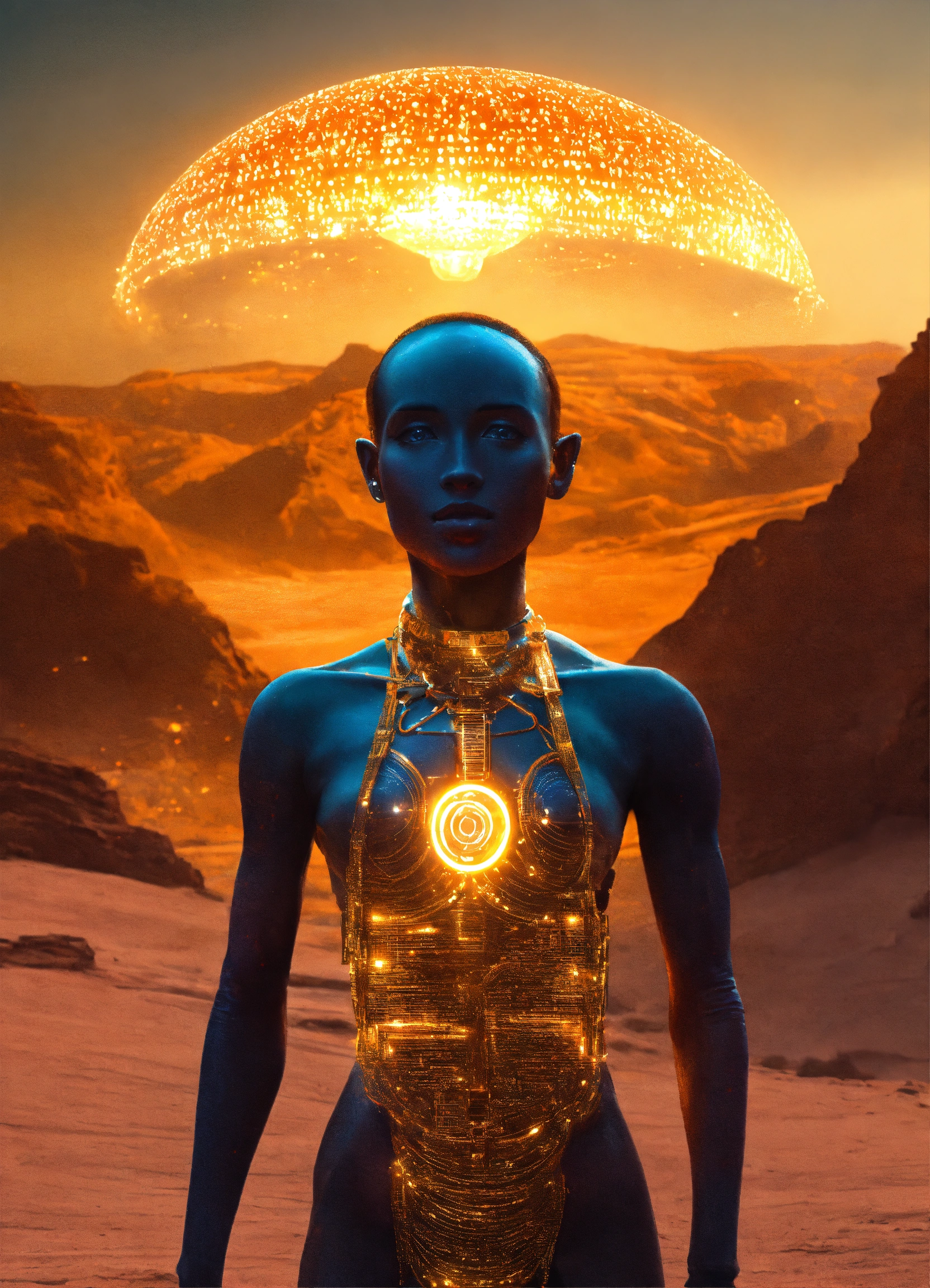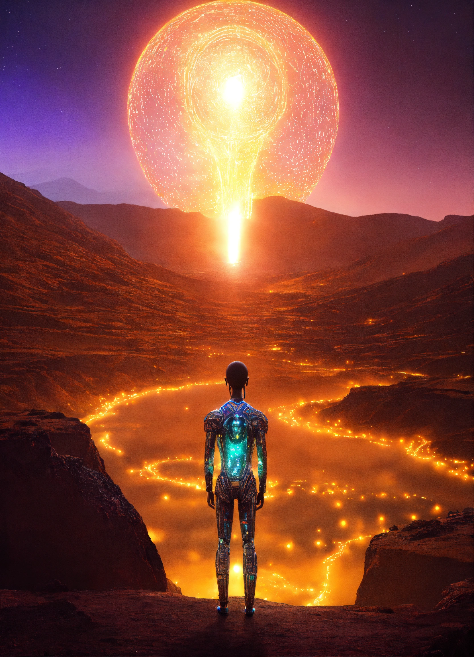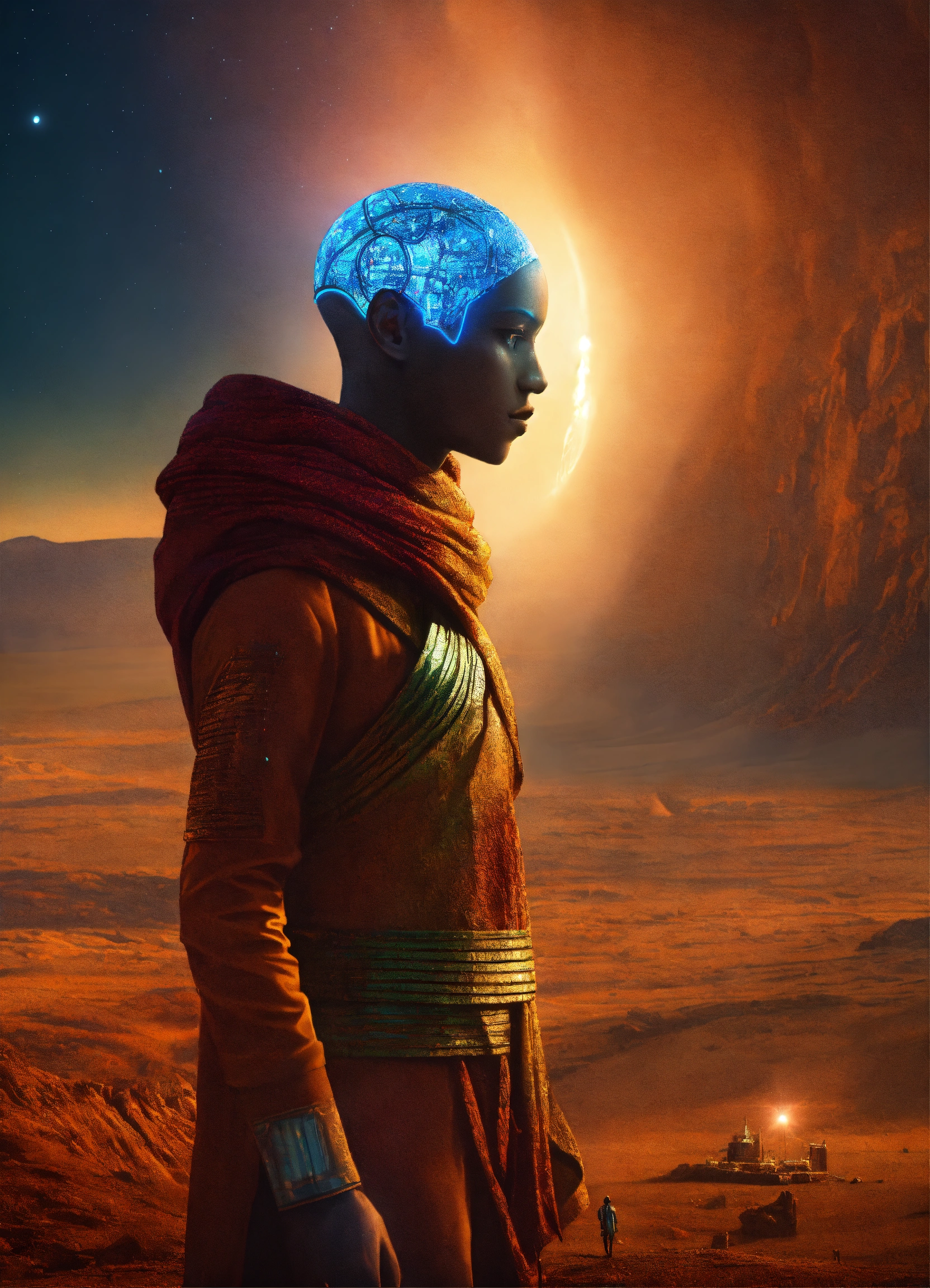 A humanoid ethiopian shape made of light looking at a futuristic alien world