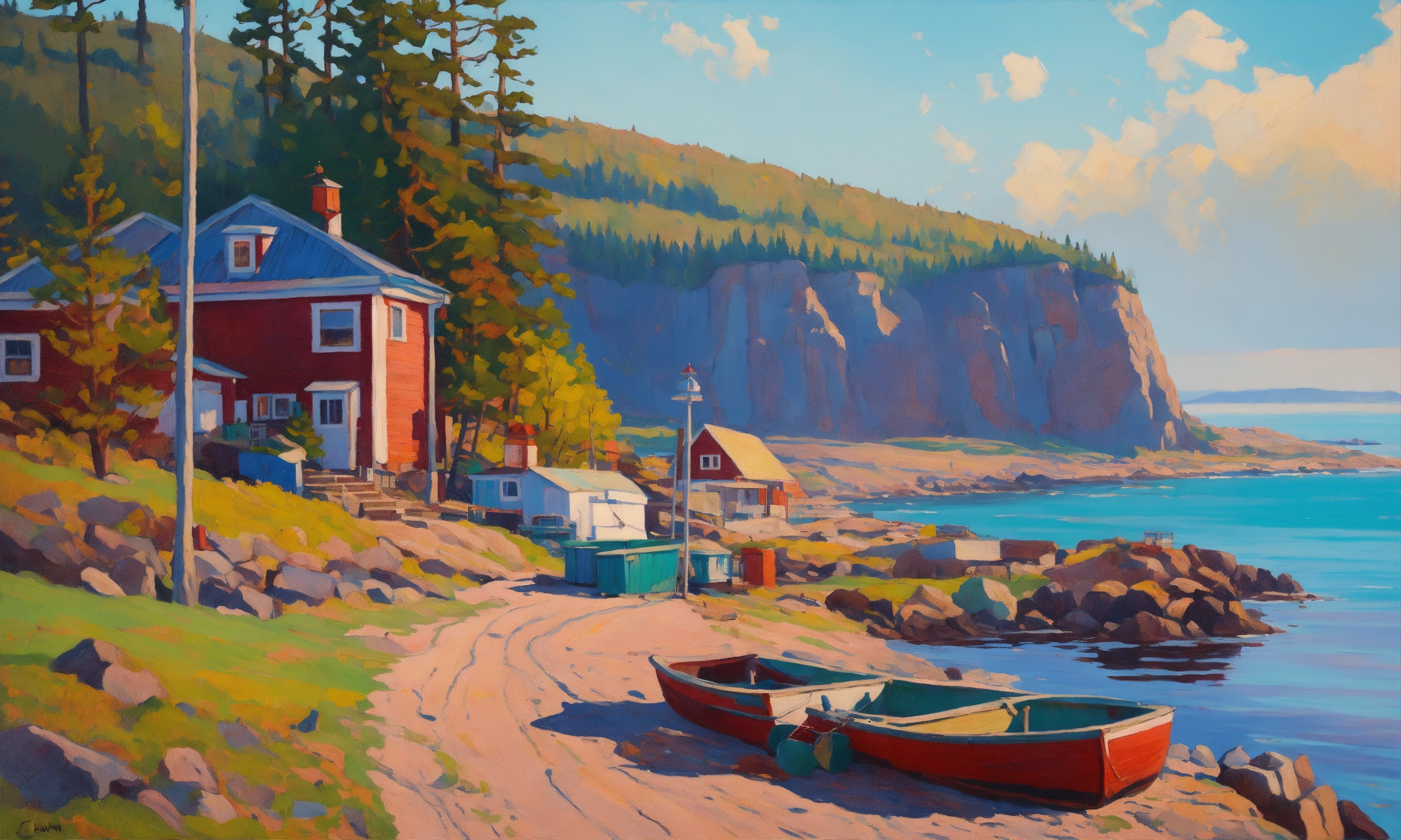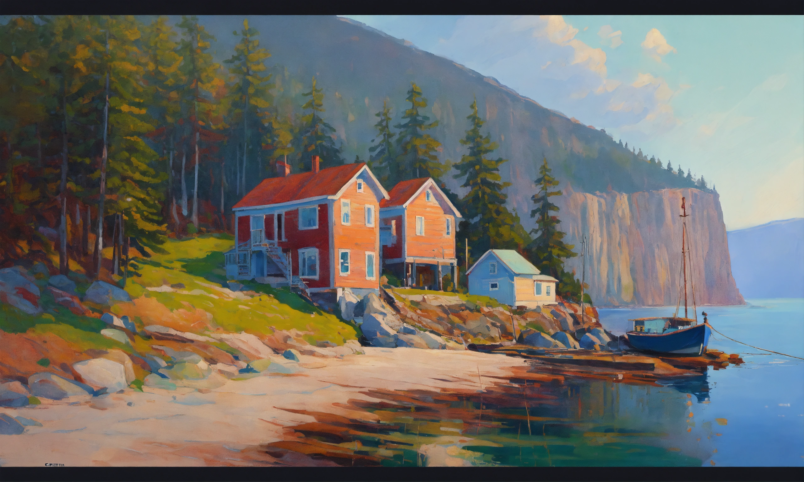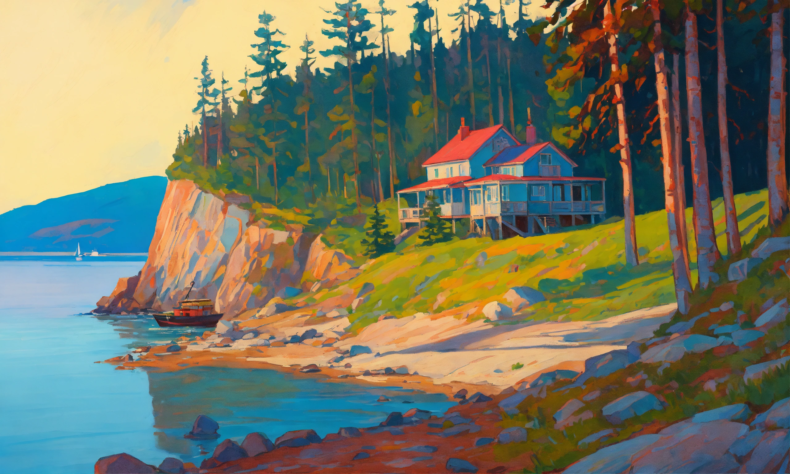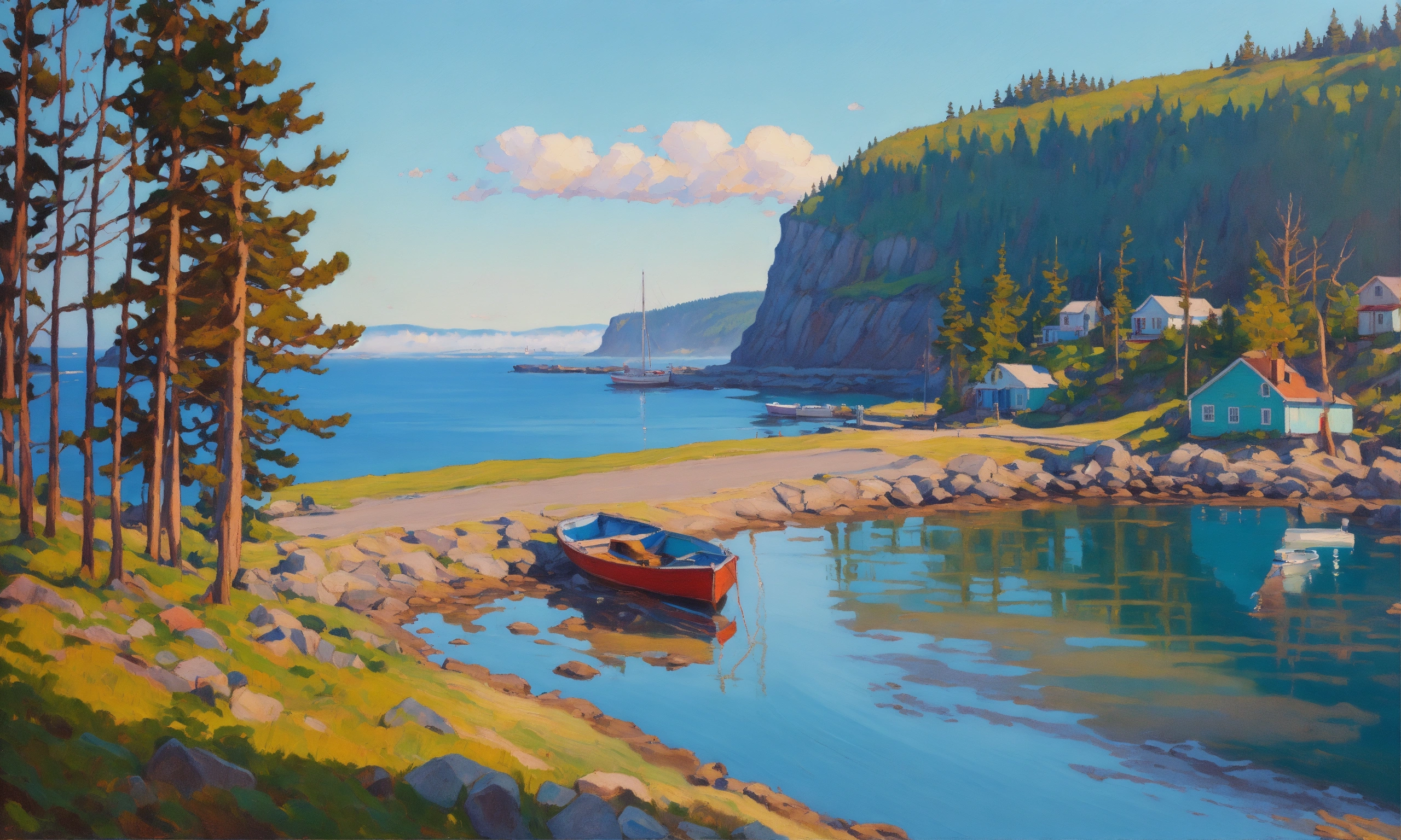Ocean, seashore, some gaspé cliffs, labrador landscape, rpg style, erin hanson, trees, boat, quay, wharf, morning light with long shadows and mist, some fog, house, painting, hill, spruce tree, some sand