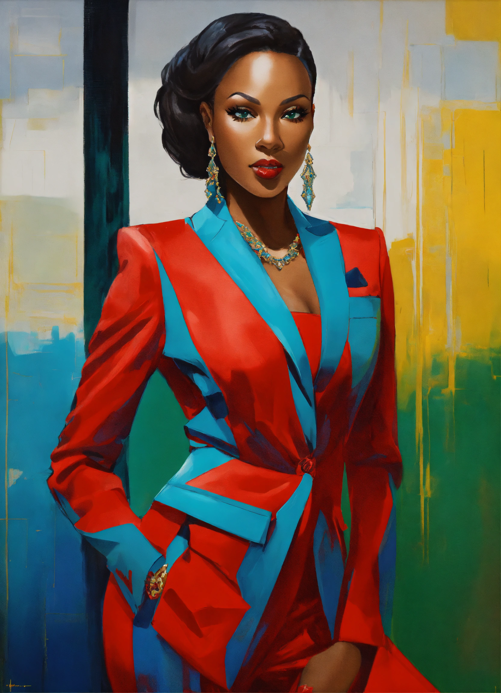 Beautiful black businesswoman gorgeous "dark face skin, " wearing stylish haute couture conservative haute couture business suit jacket and pants outfit, in colors, "bright red, bright blue, "dark green, " bright yellow and stark white, " stiletto heels, detailed line art, fine details, no background full body view, head to toe, clear white background, center, greg rutkowski