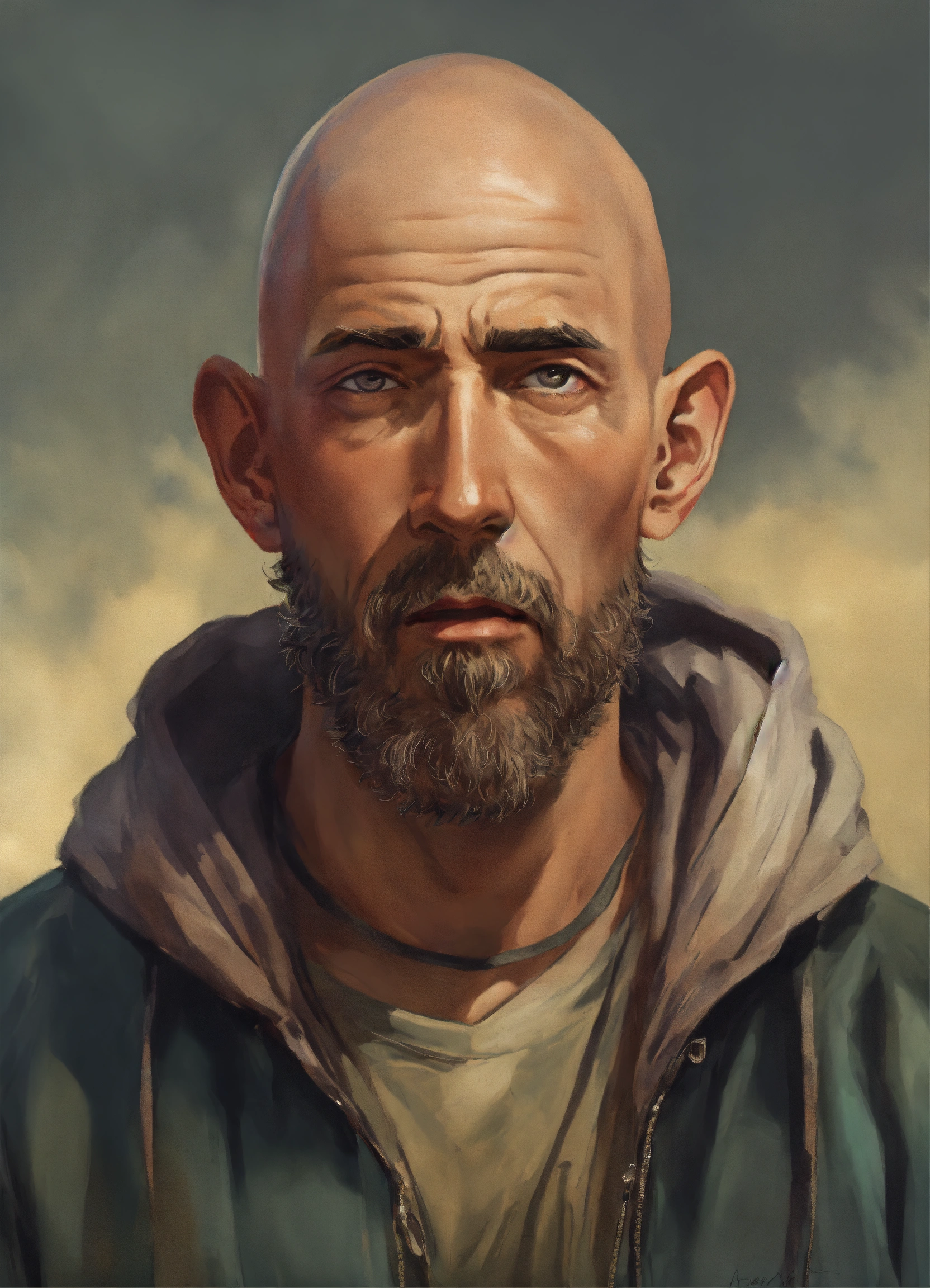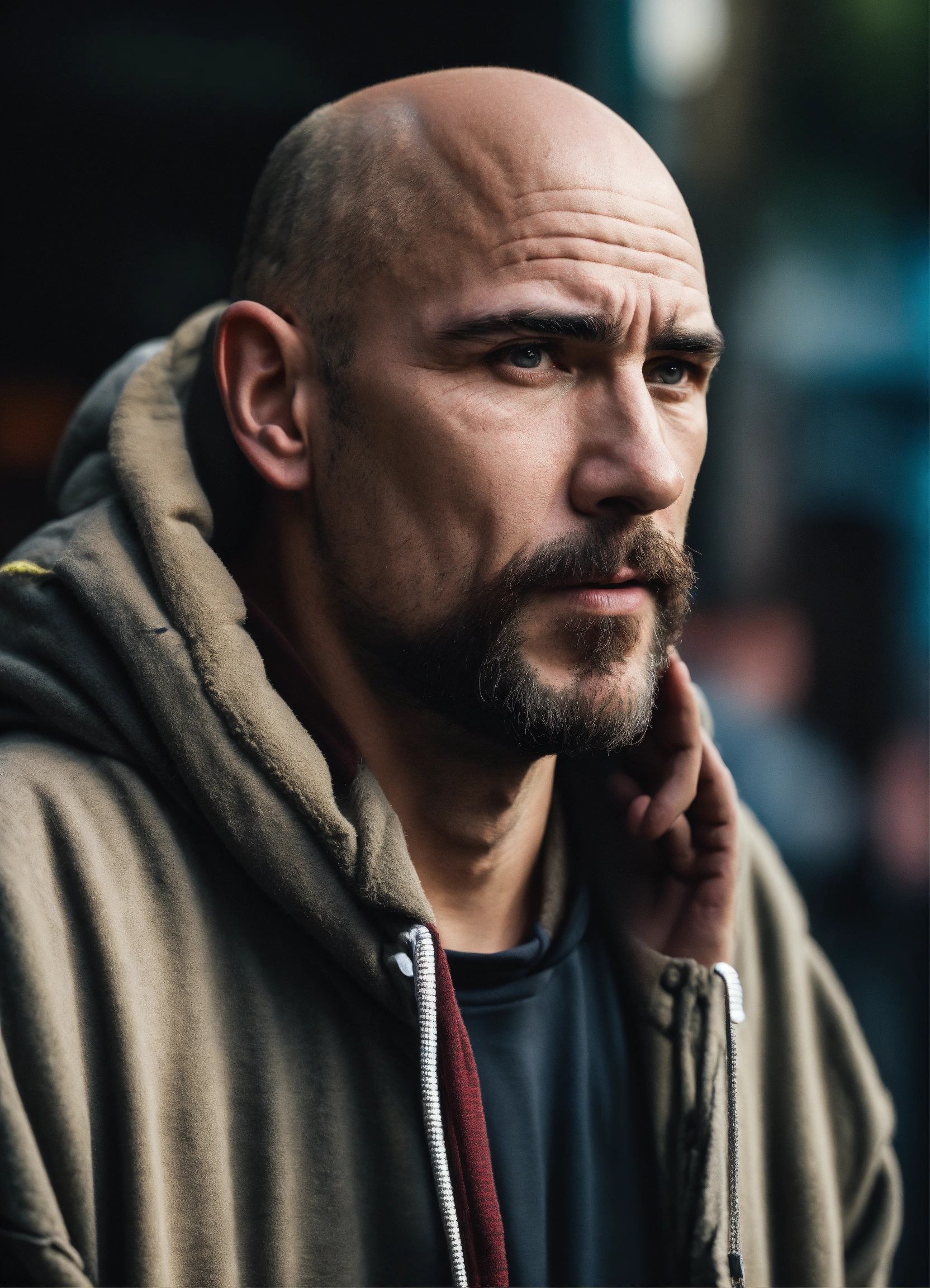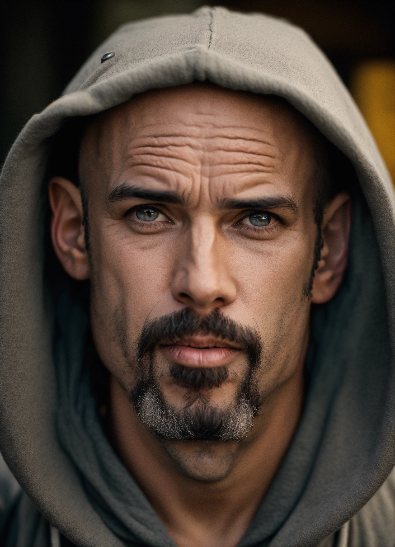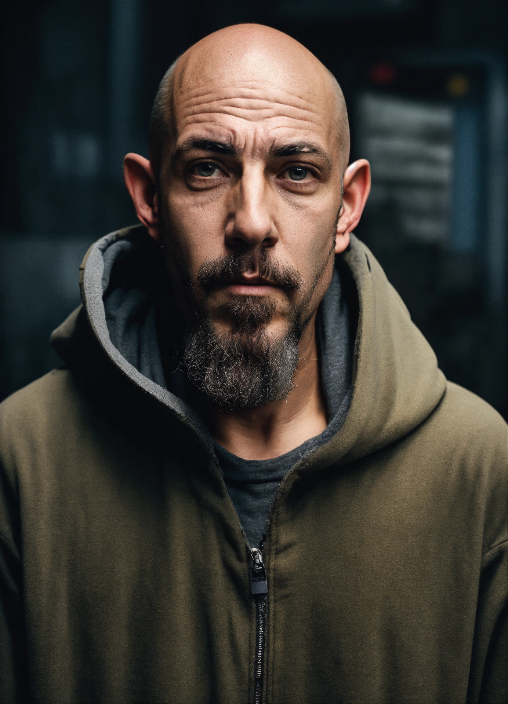 A huge bald strange looking homeless man with a goatee, extended protruding brow forehead, grey eyes, crooked mouth, large ears, wearing a hoodie up over his head