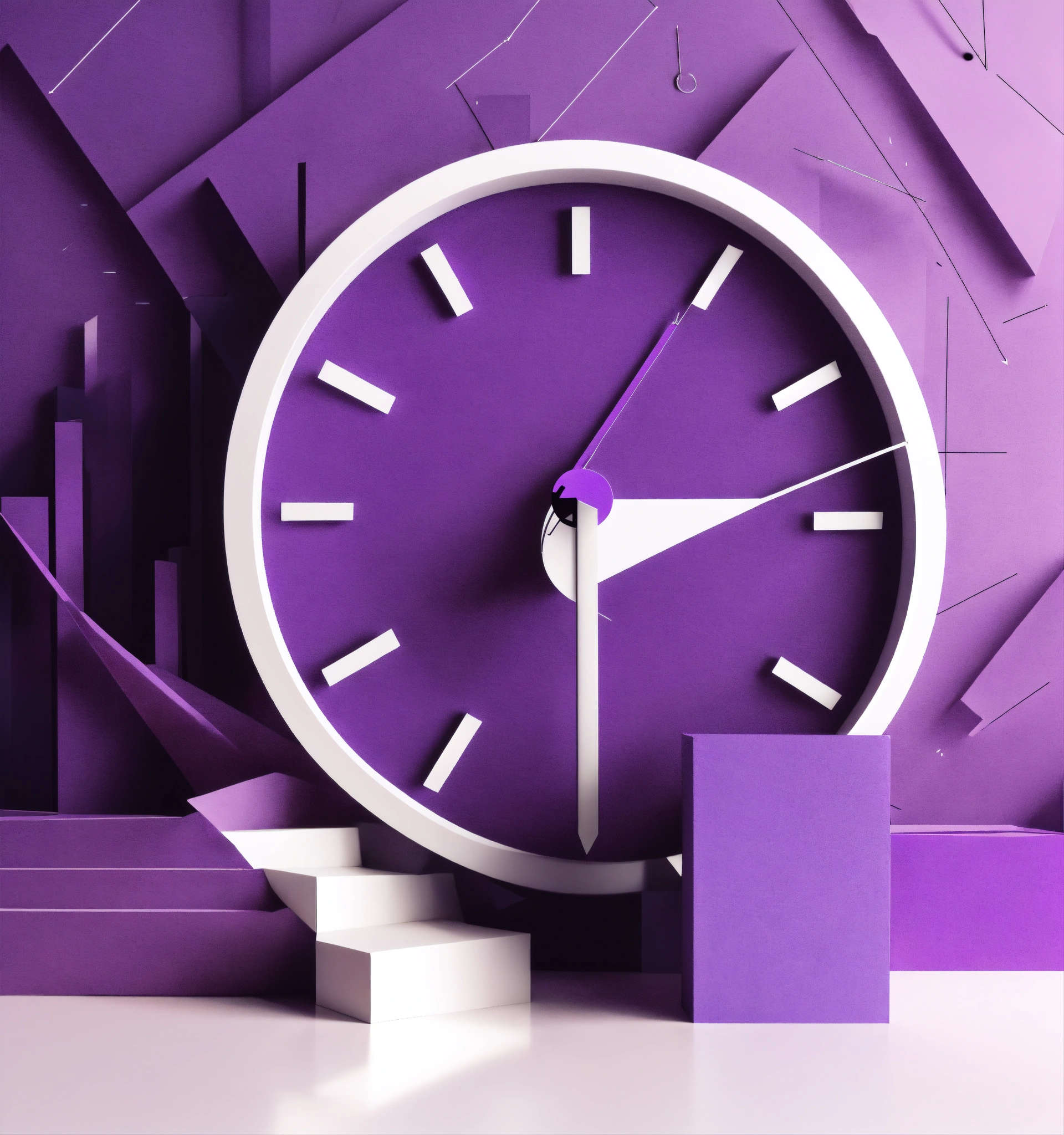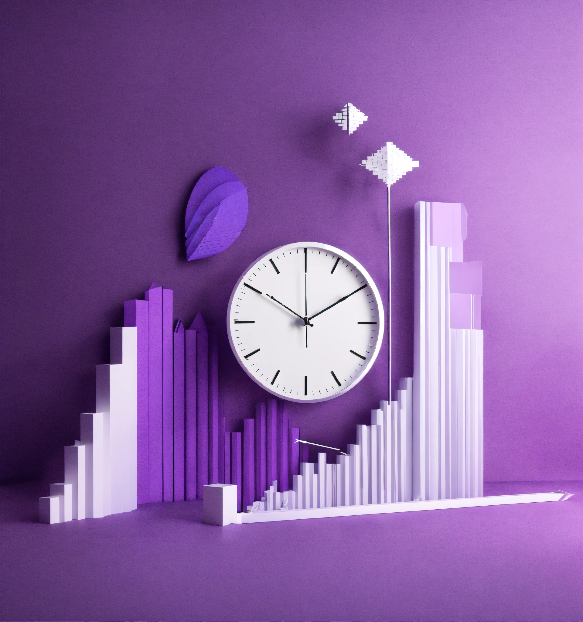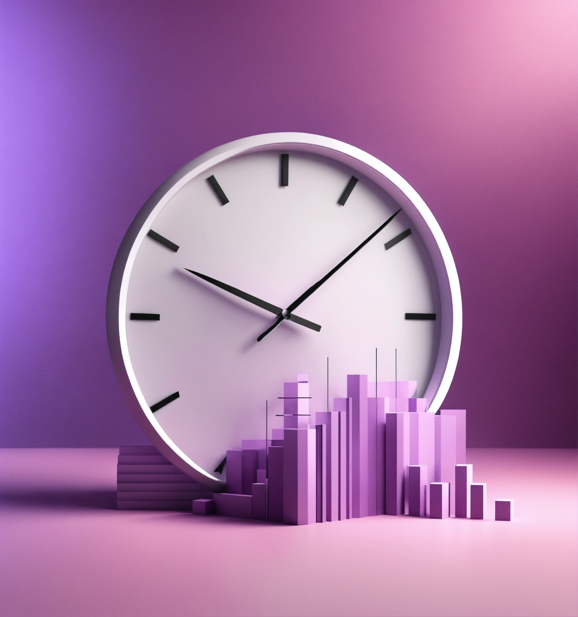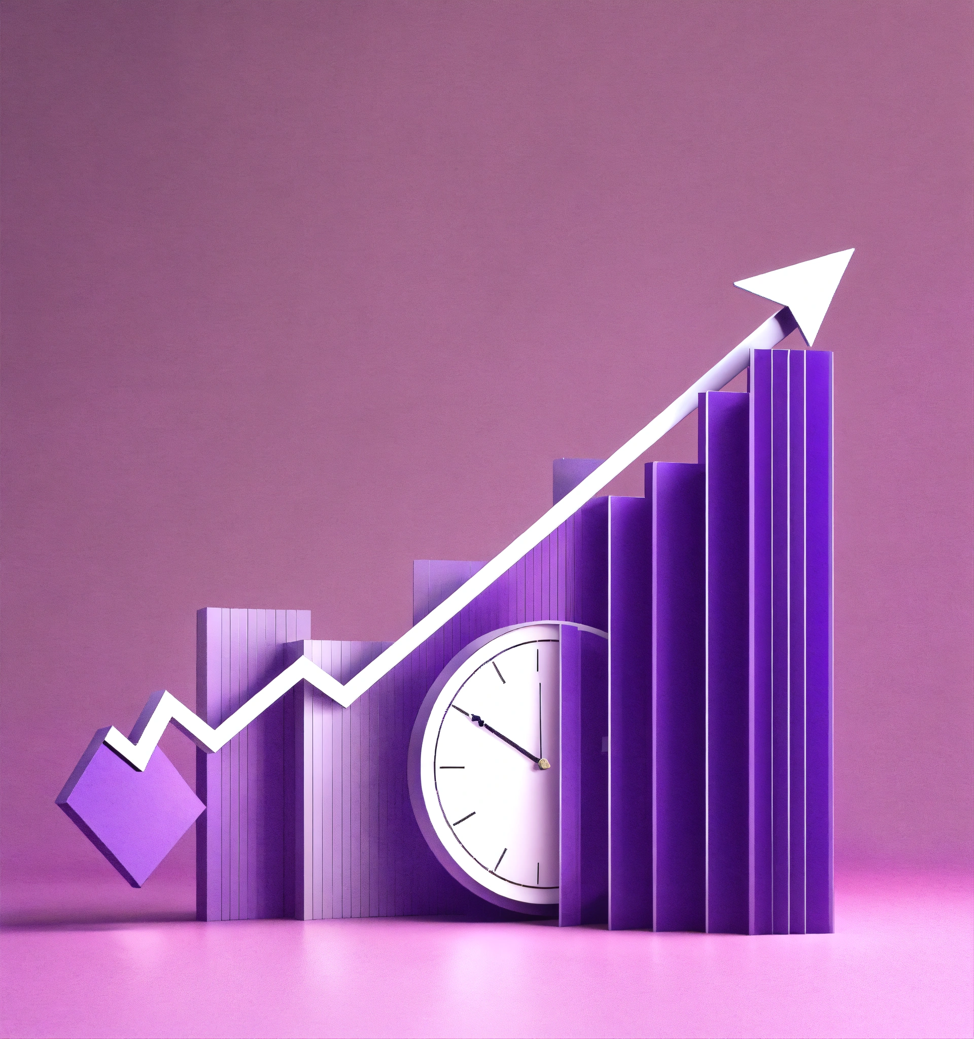 3d illustration of an arrow going up, increasing graph, and a round clock, minimalist elegant, purple and white tones