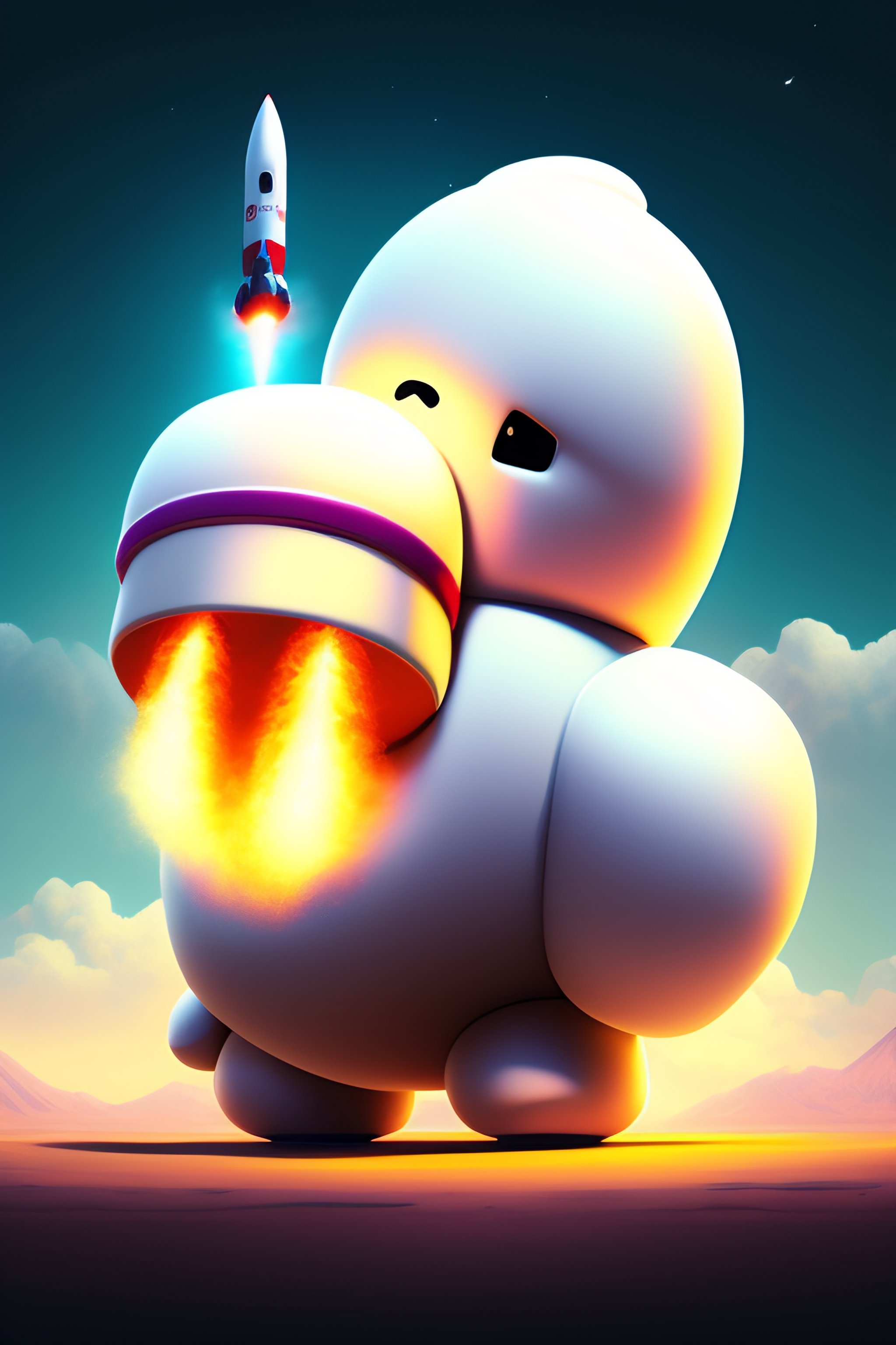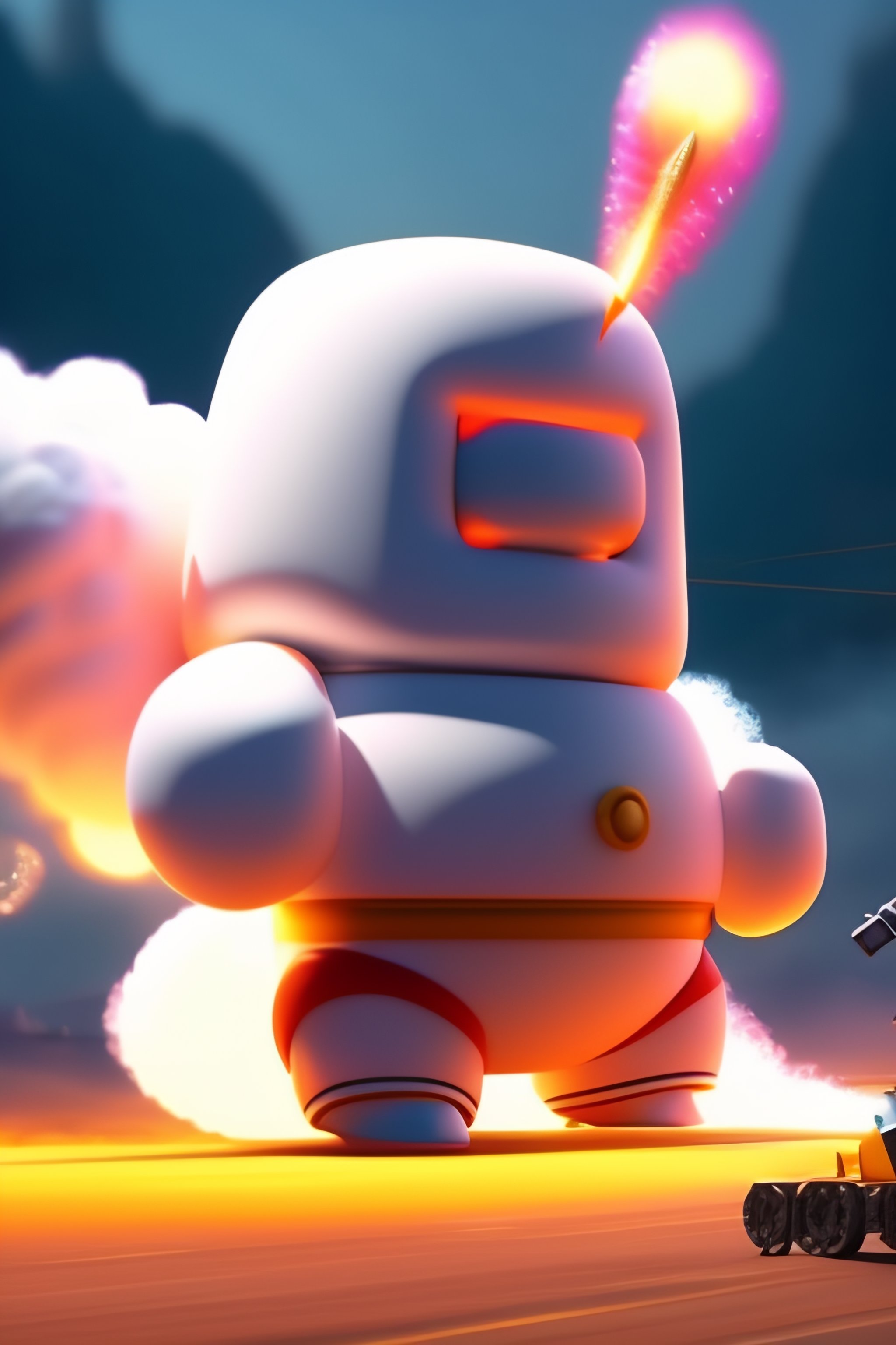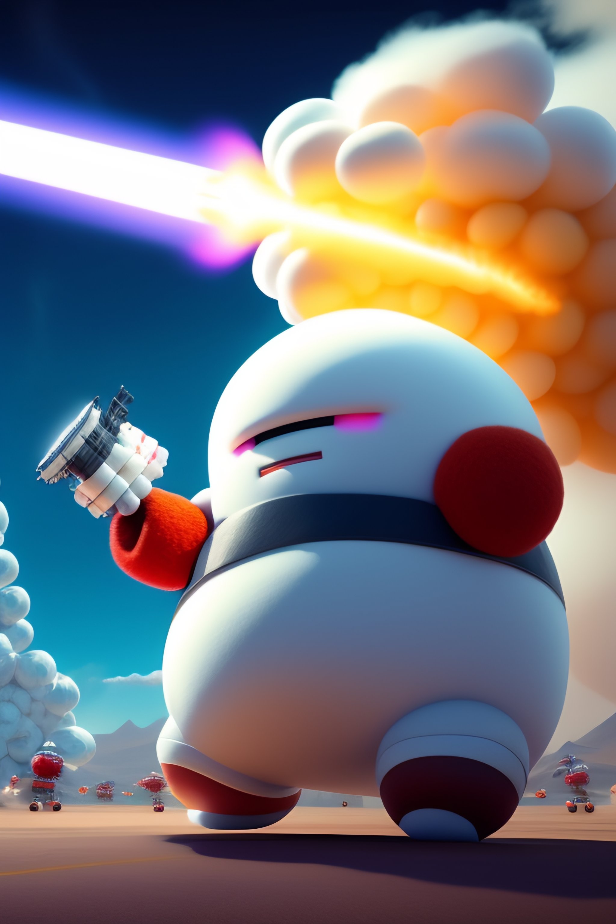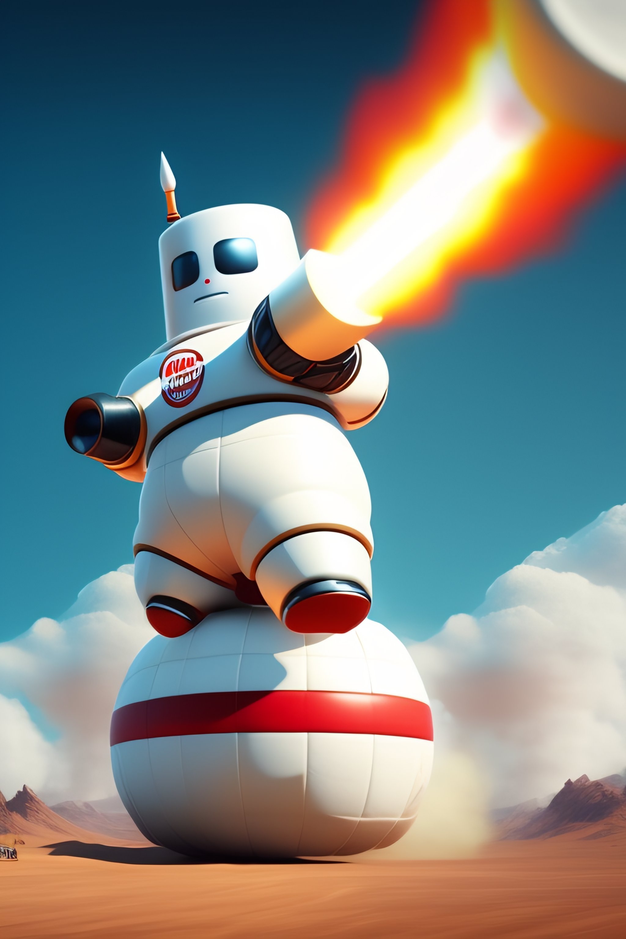 A giant marshmallow-man wielding a rocket-launcher from a video game